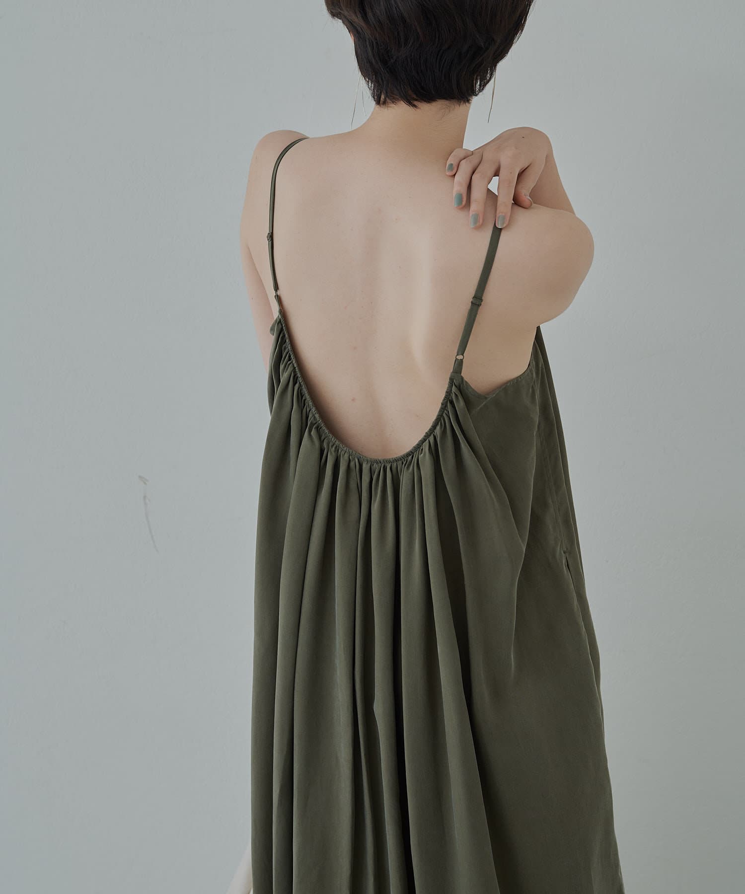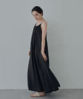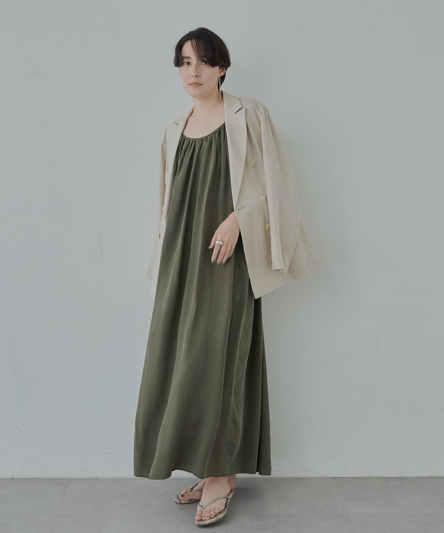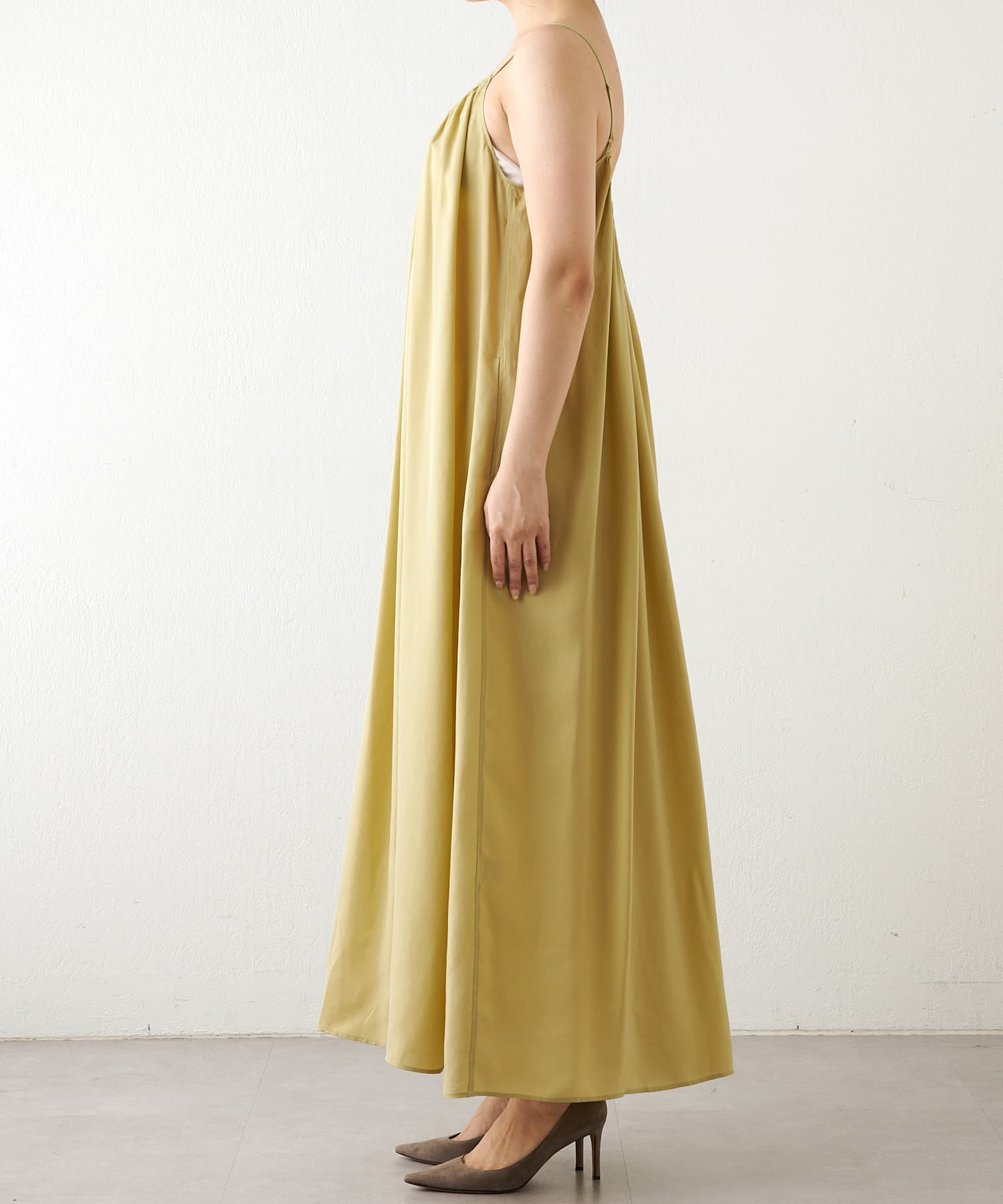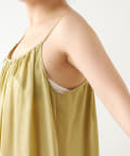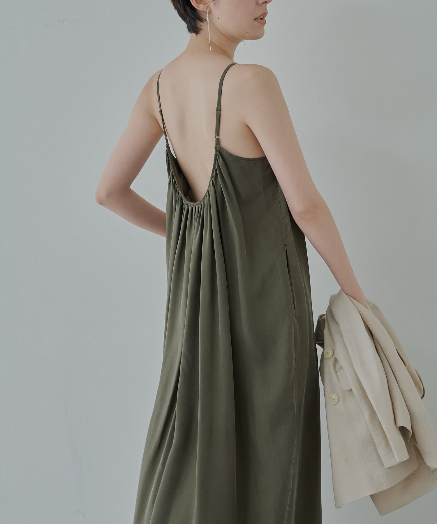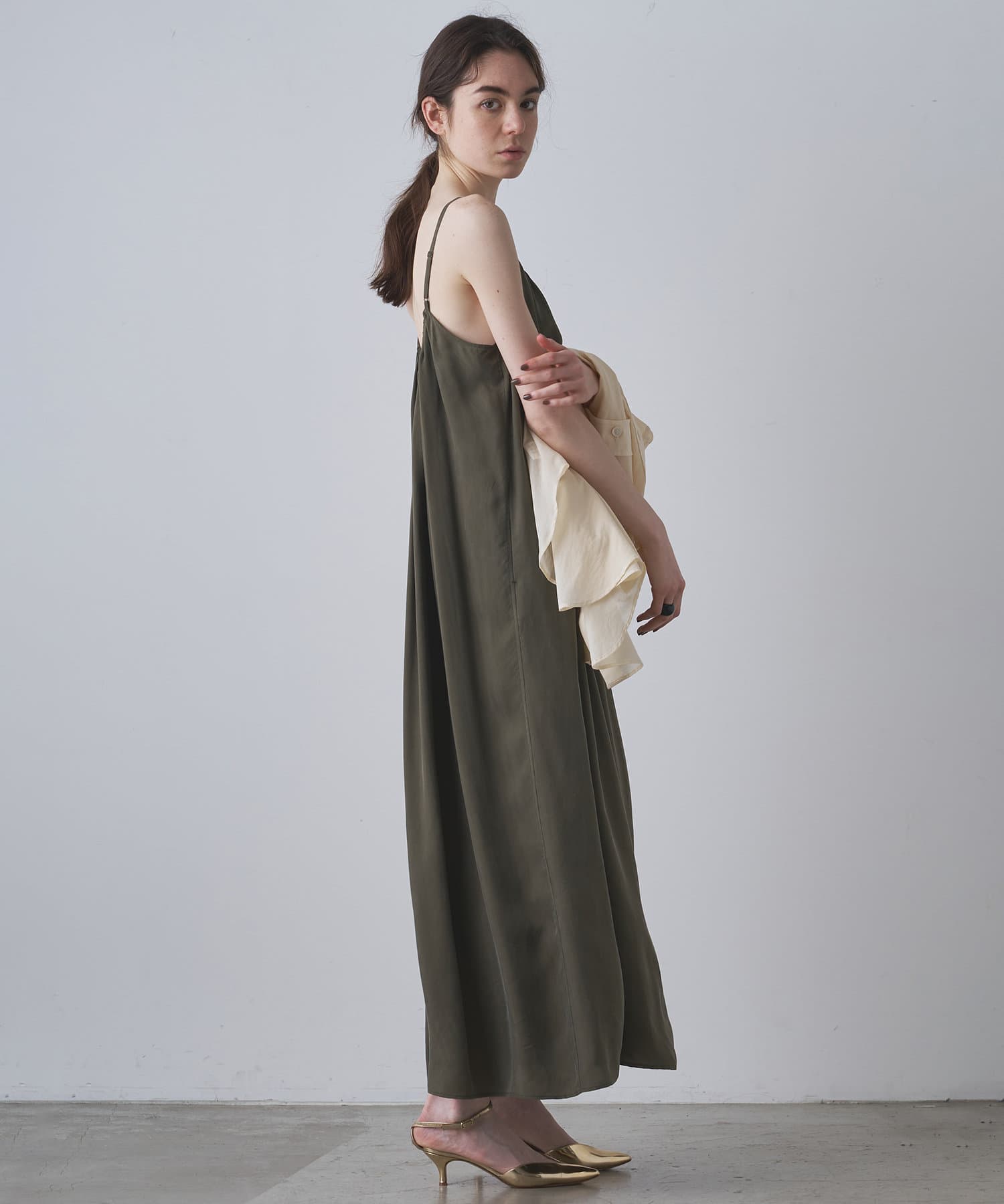 ■衿ぐりのたっぷりとしたタックギャザーが目を惹くキャミワンピース。