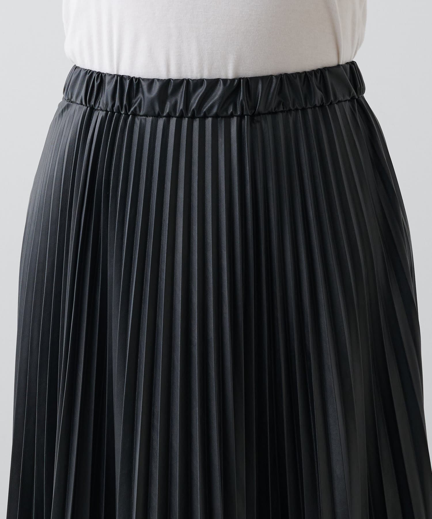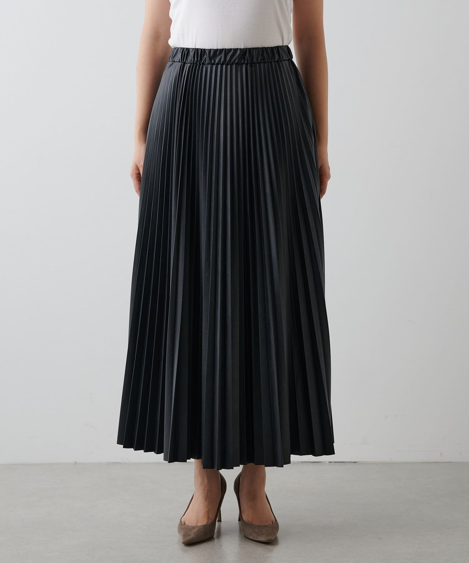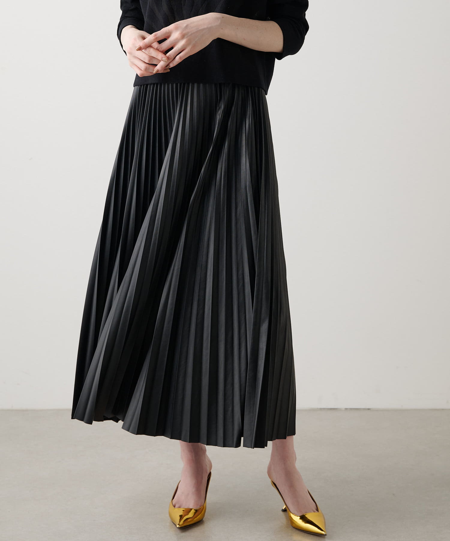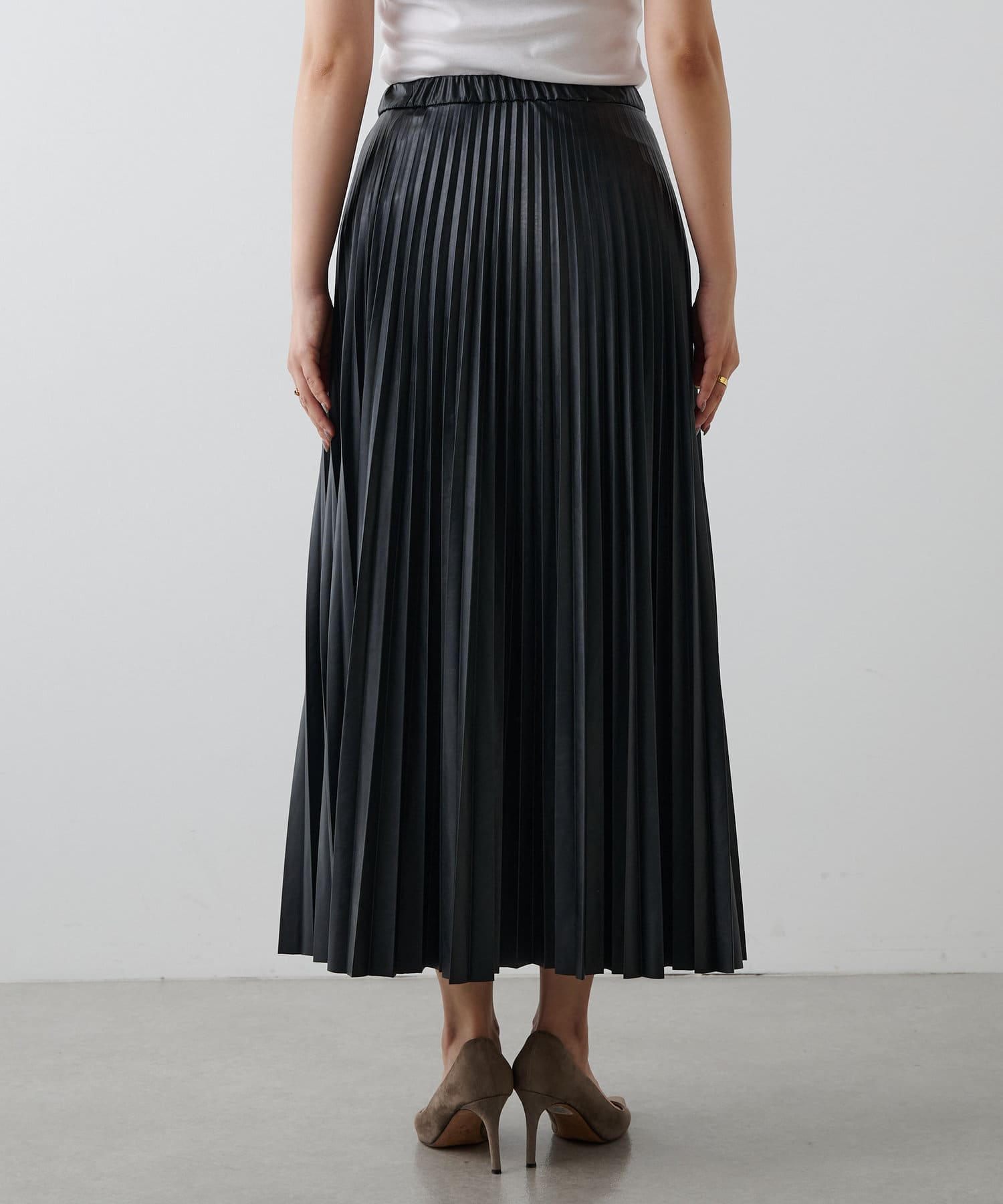 コーデのポイントになる、エコレザー素材のプリーツスカート