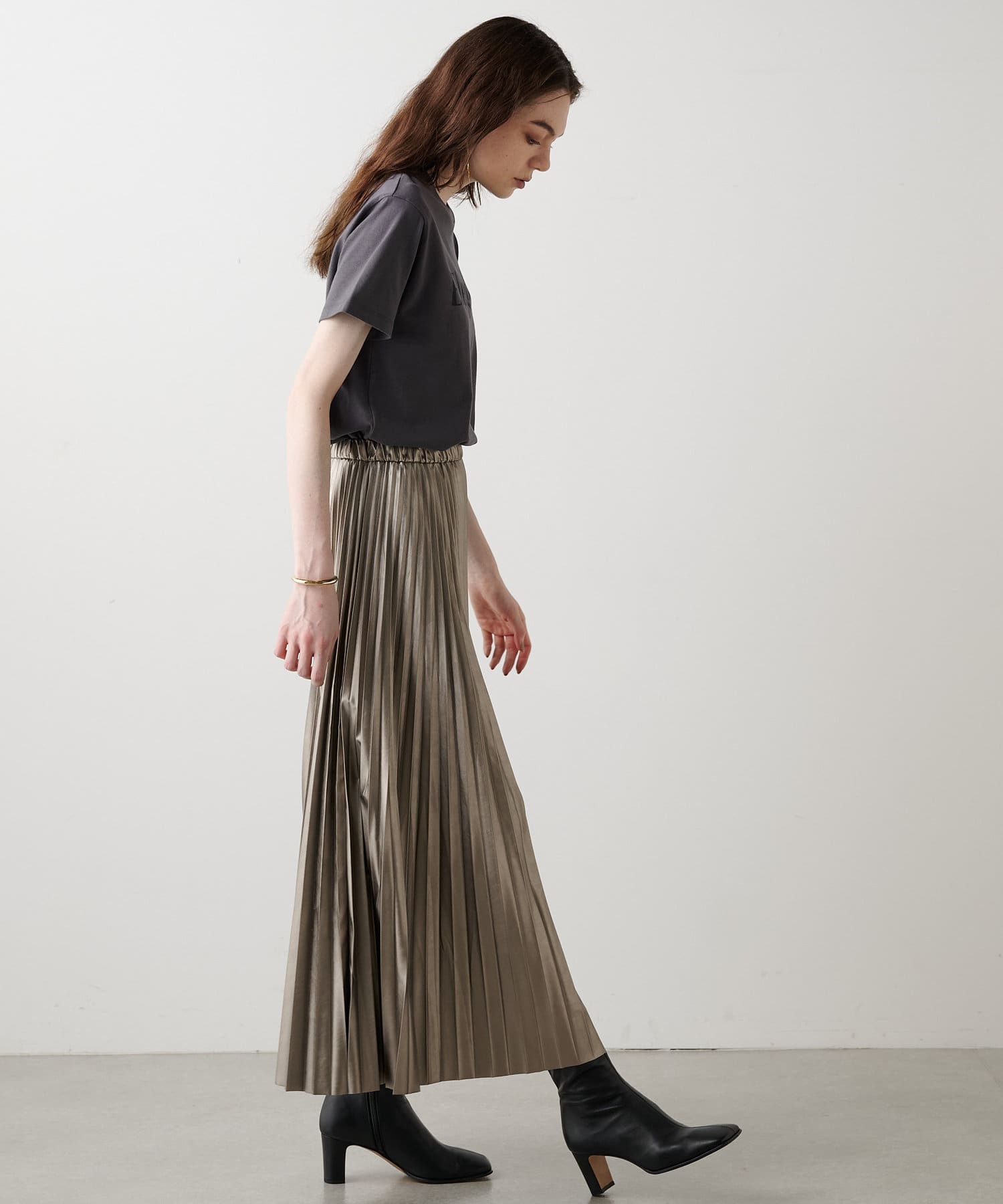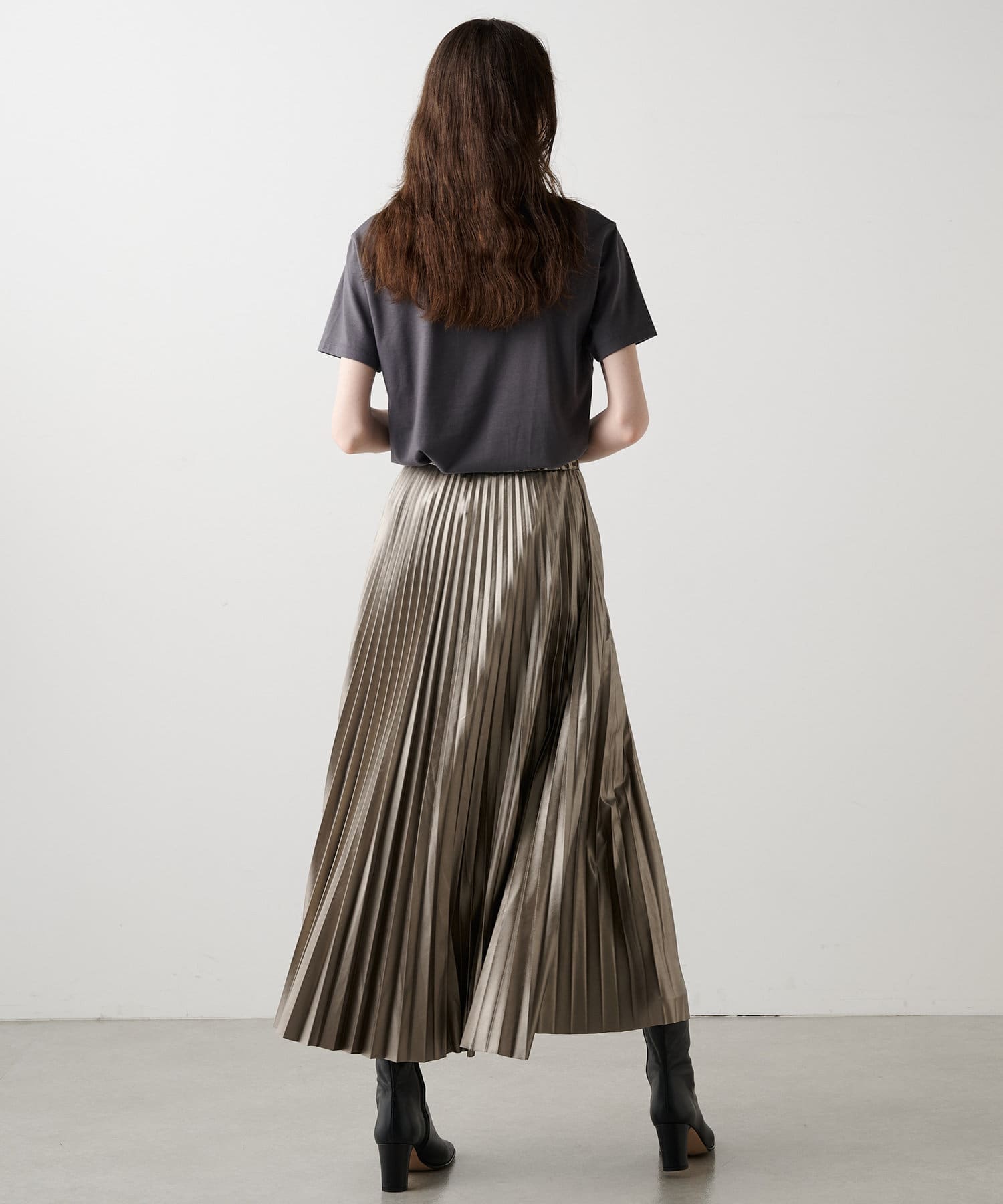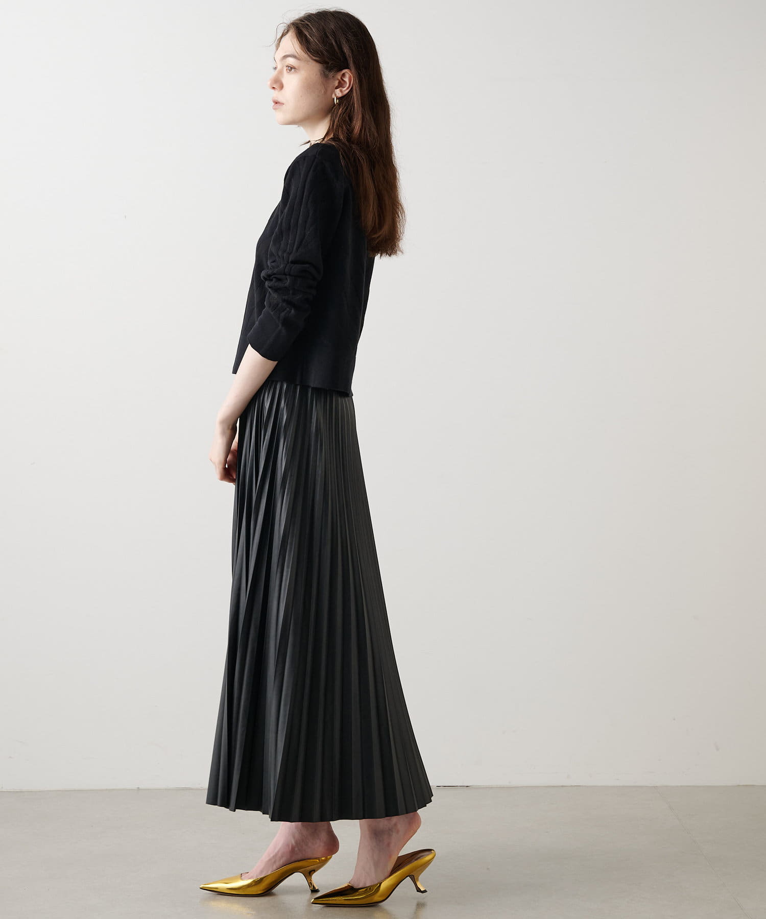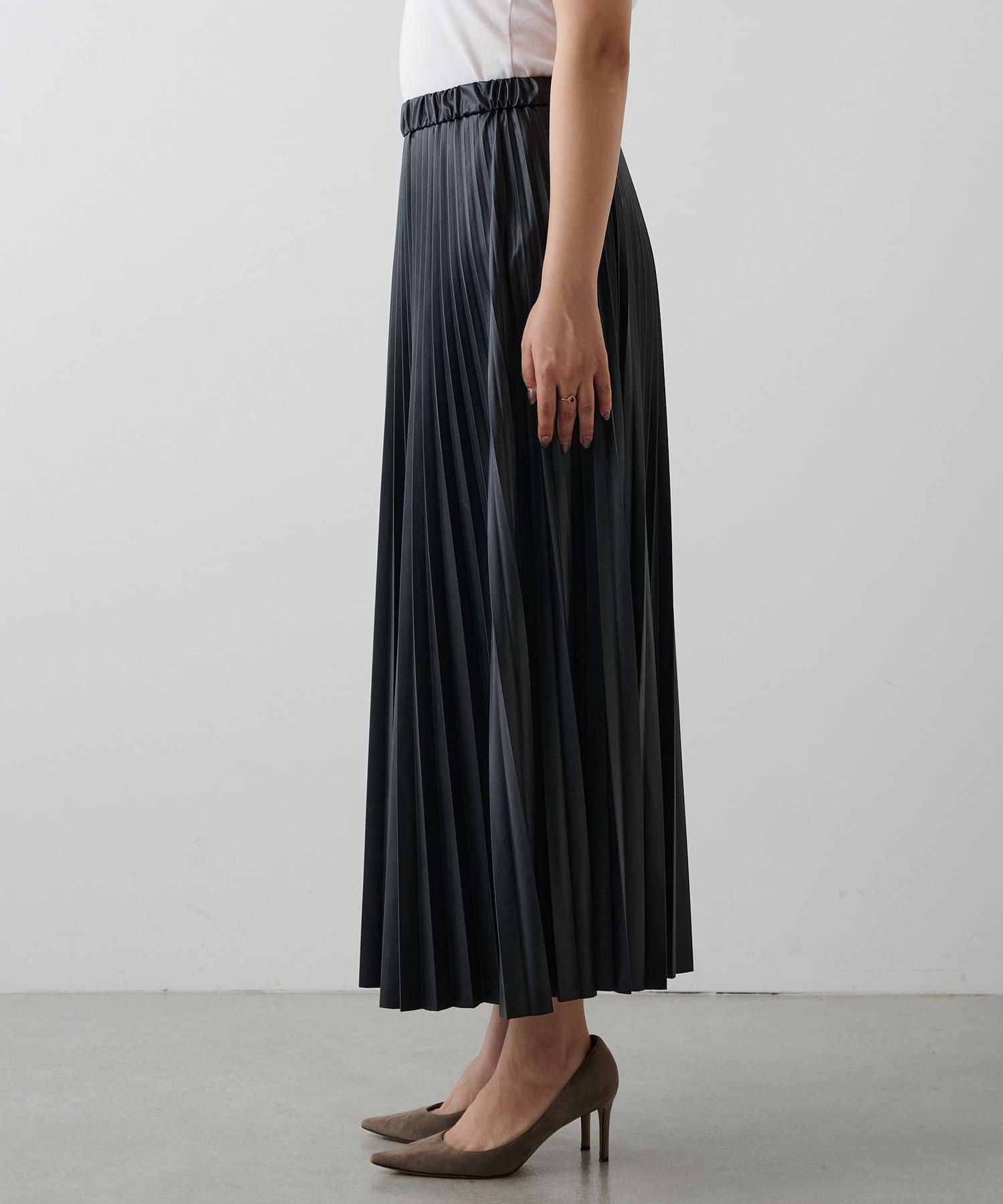 コーデのポイントになる、エコレザー素材のプリーツスカート