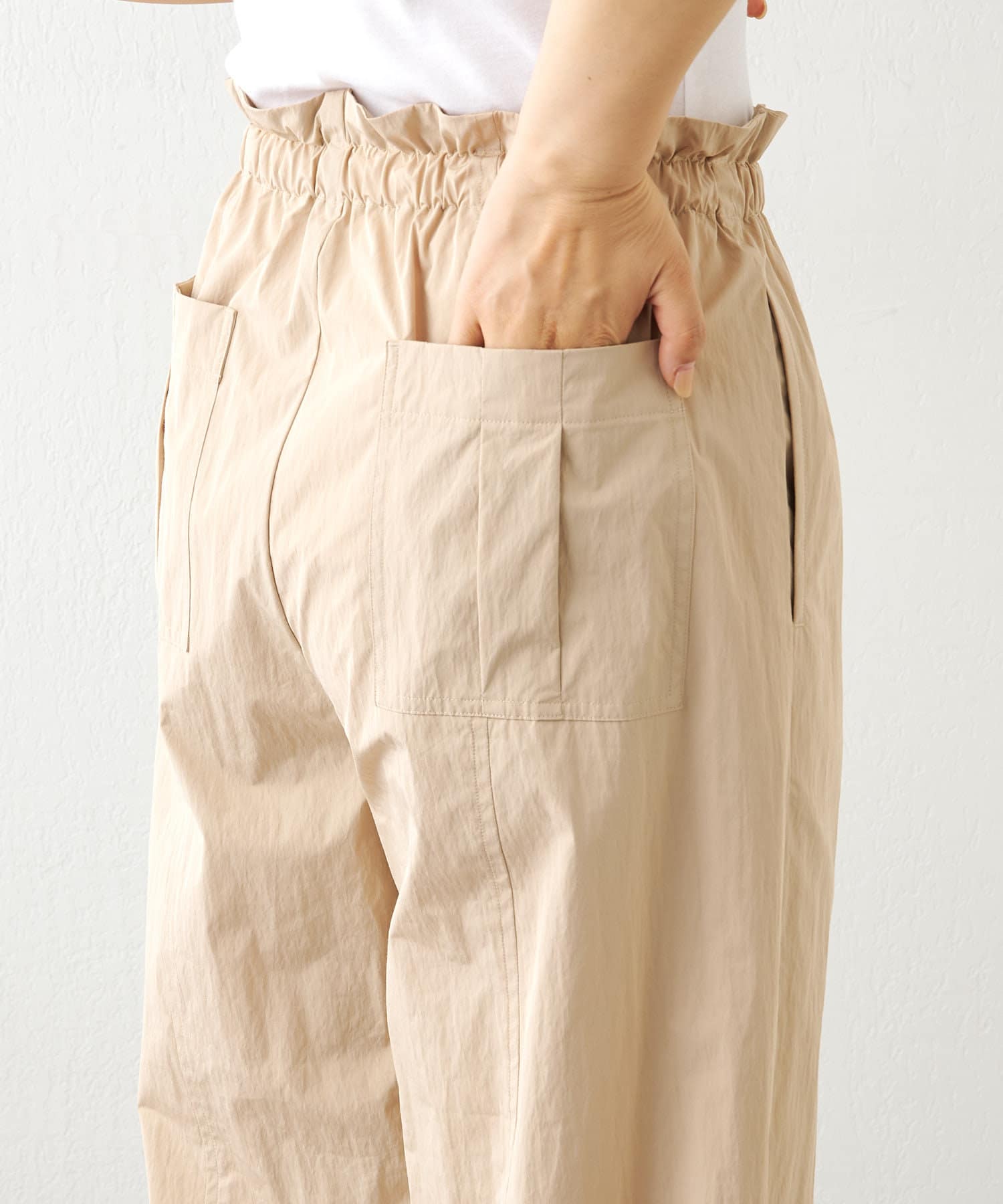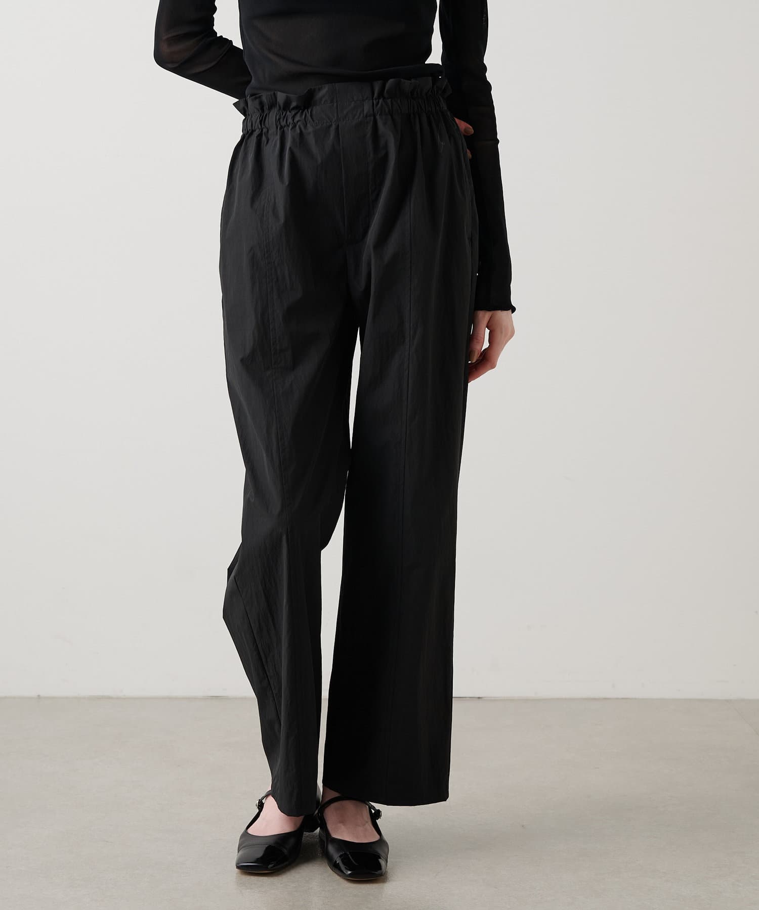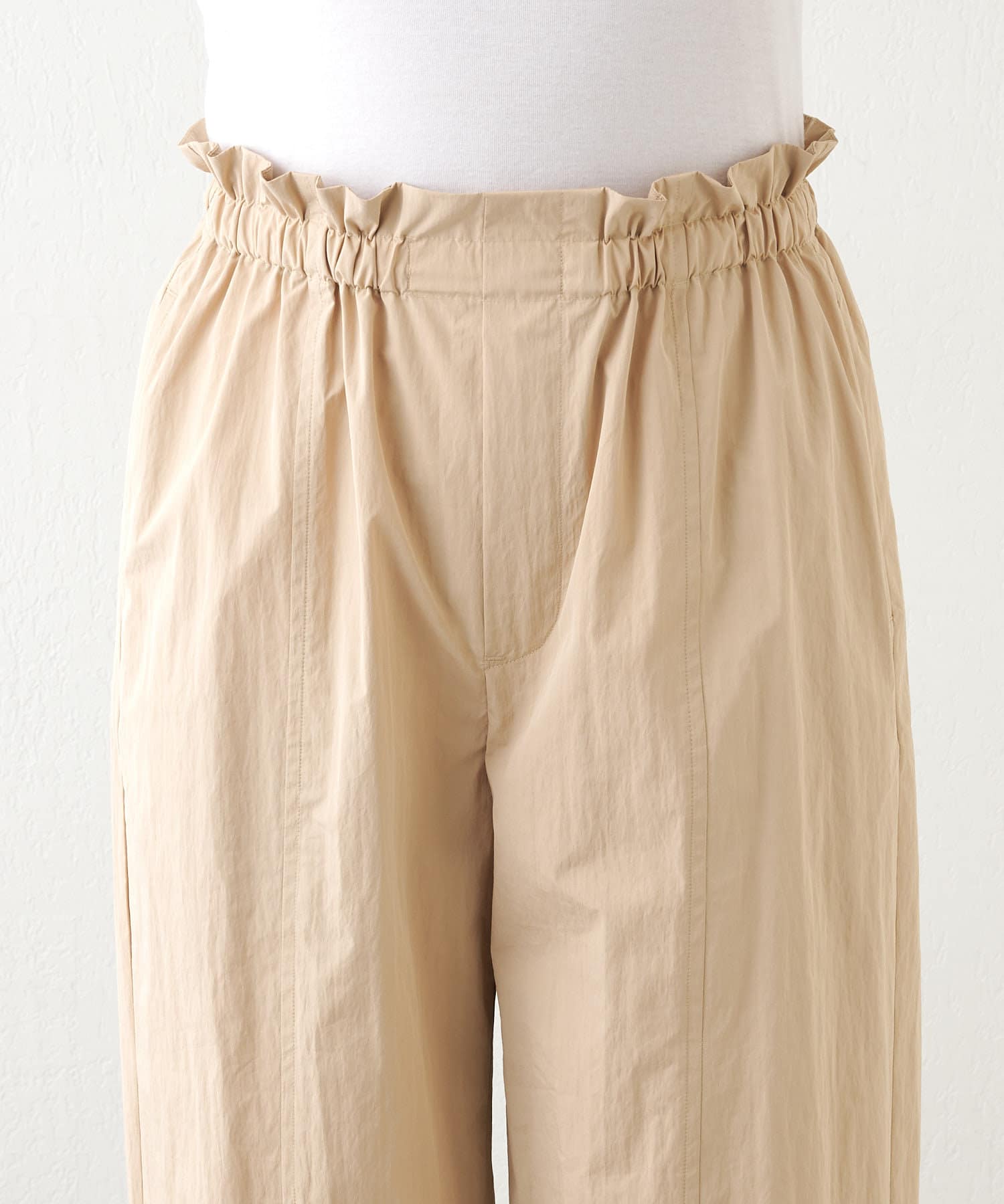 ■程よいハリのある軽いタフタ素材を使用したパンツ。
