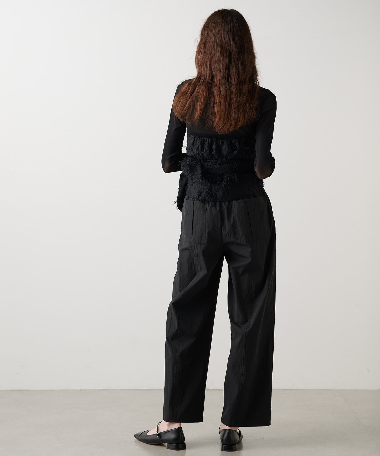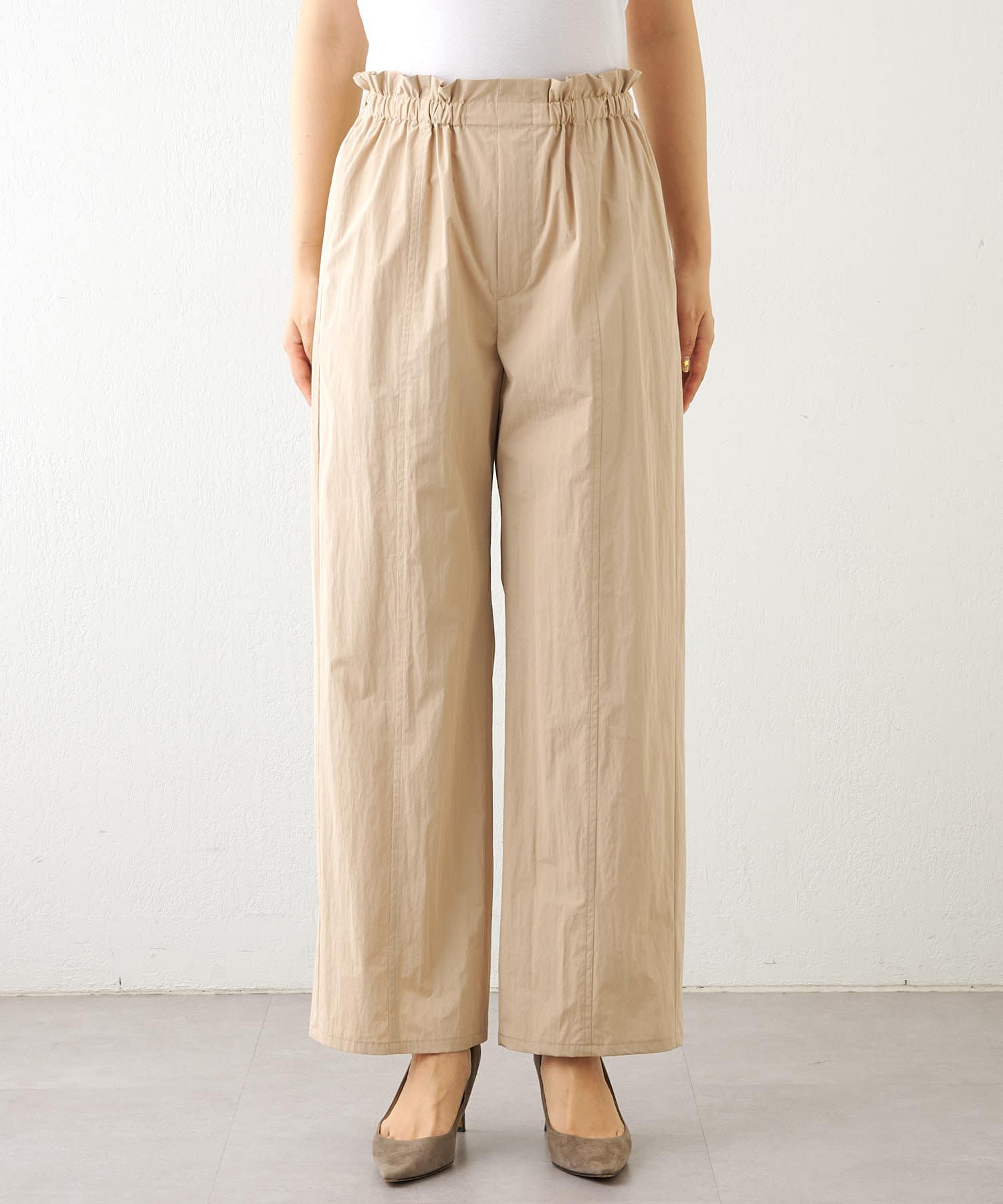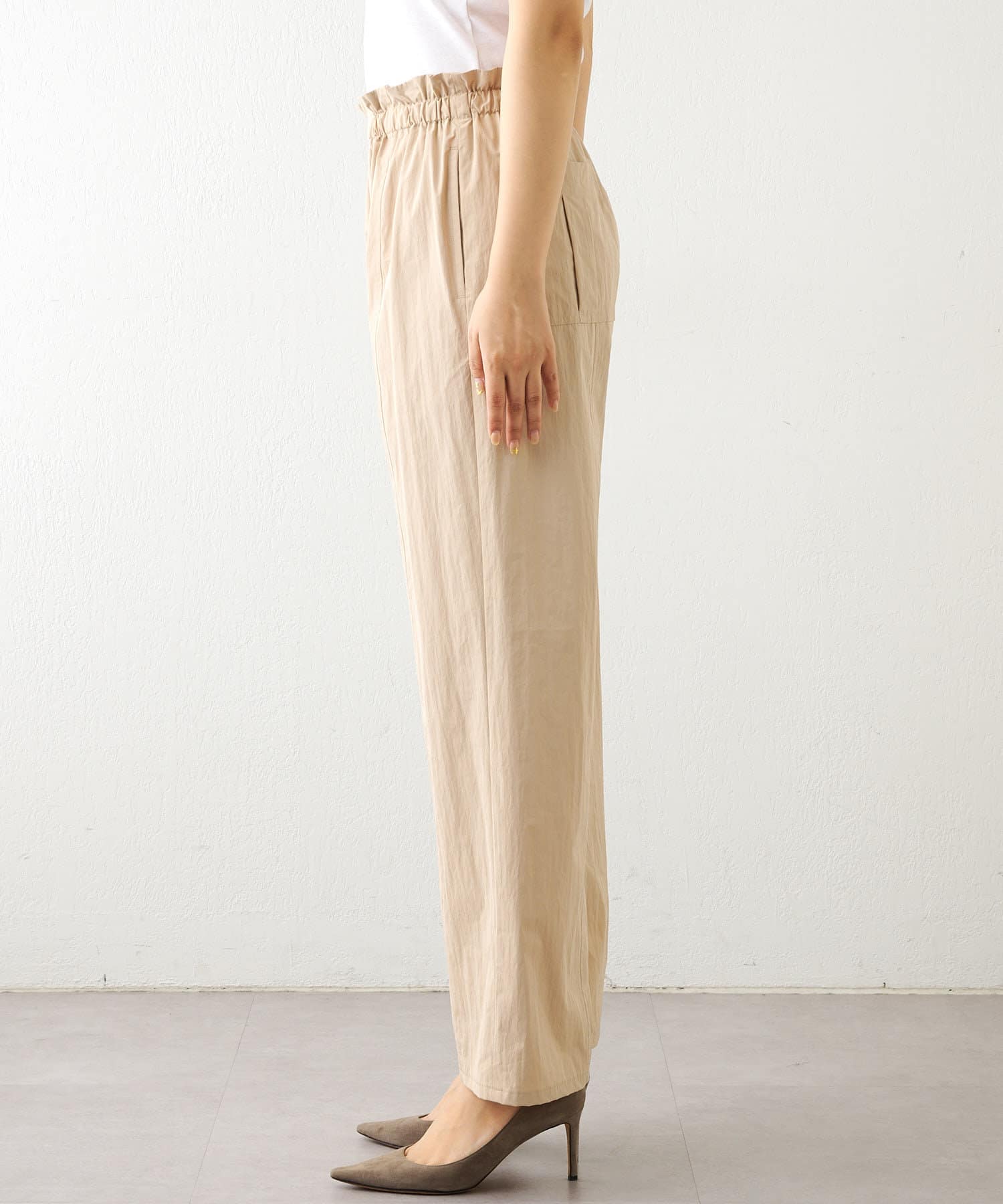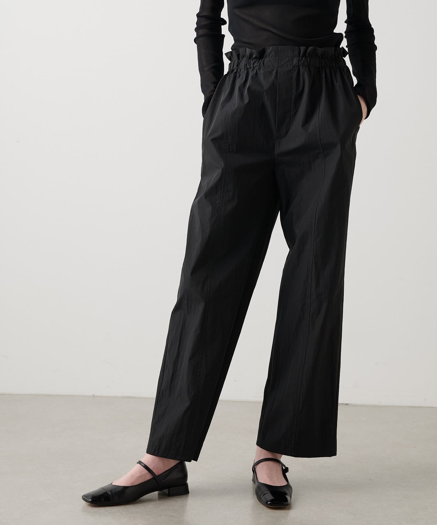 ■程よいハリのある軽いタフタ素材を使用したパンツ。