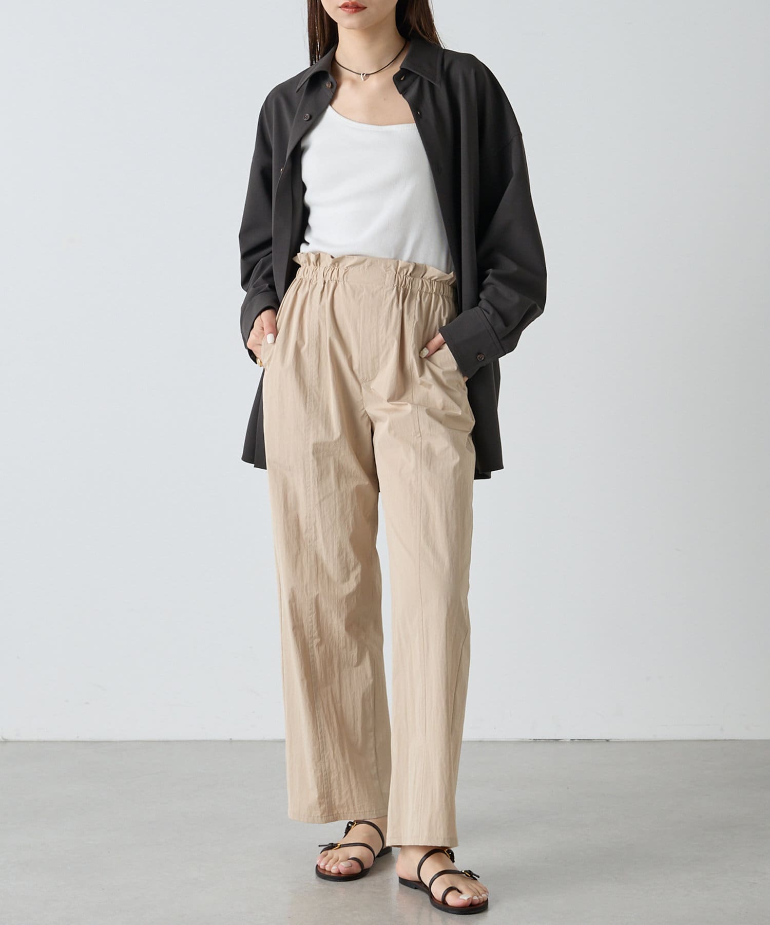 カジュアル素材を大人っぽく落とし込んだタフタパンツ