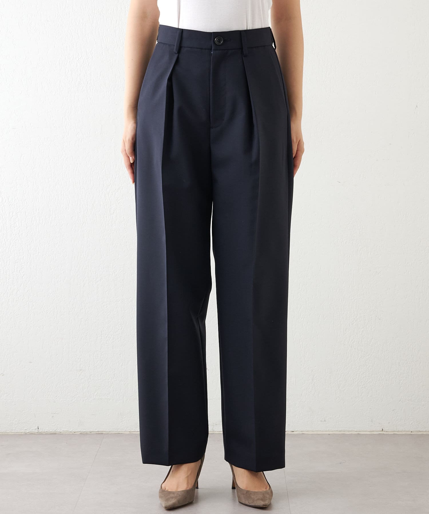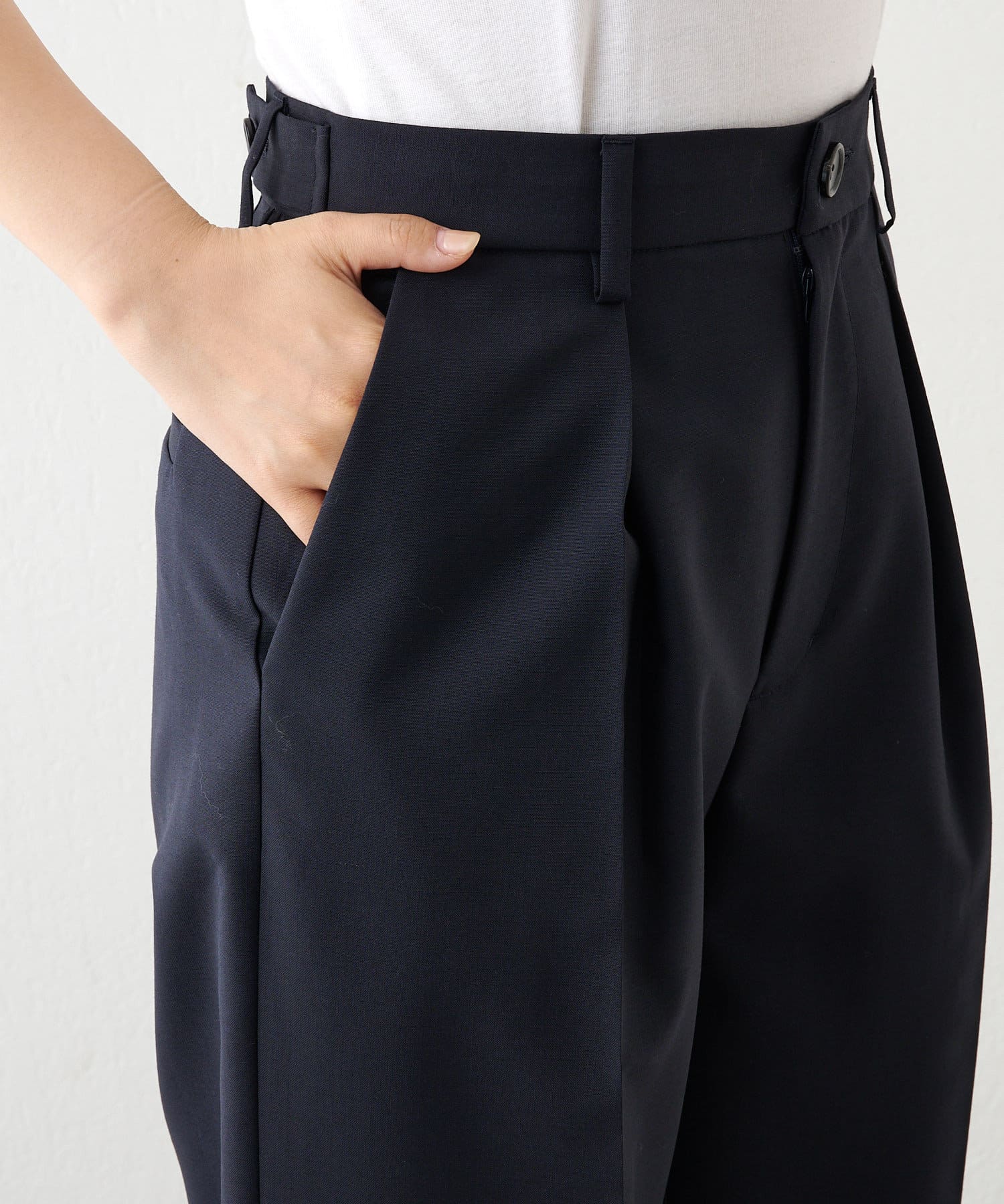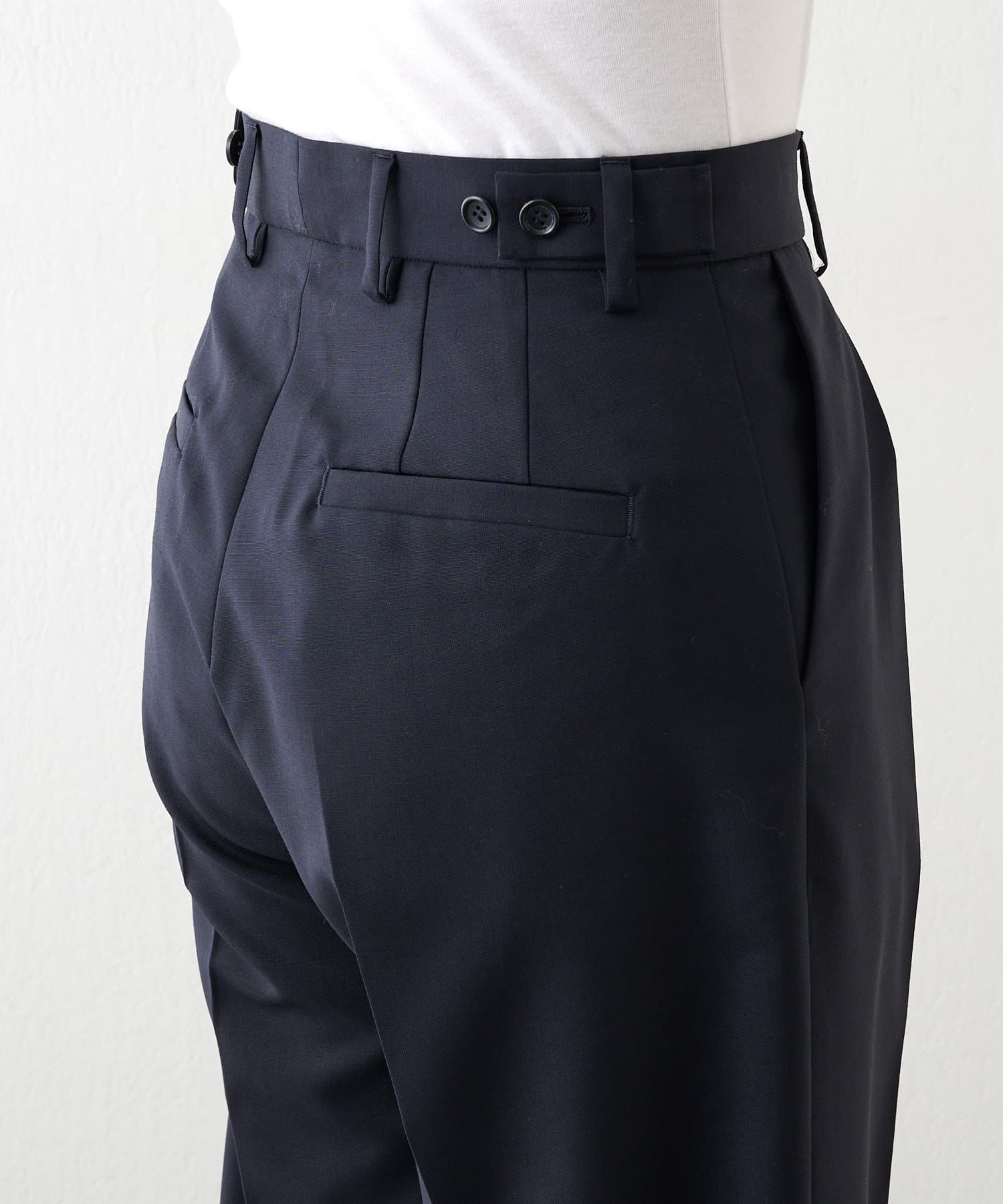 ■ドライでコシのあるスーツ素材を使用したタックパンツ。