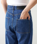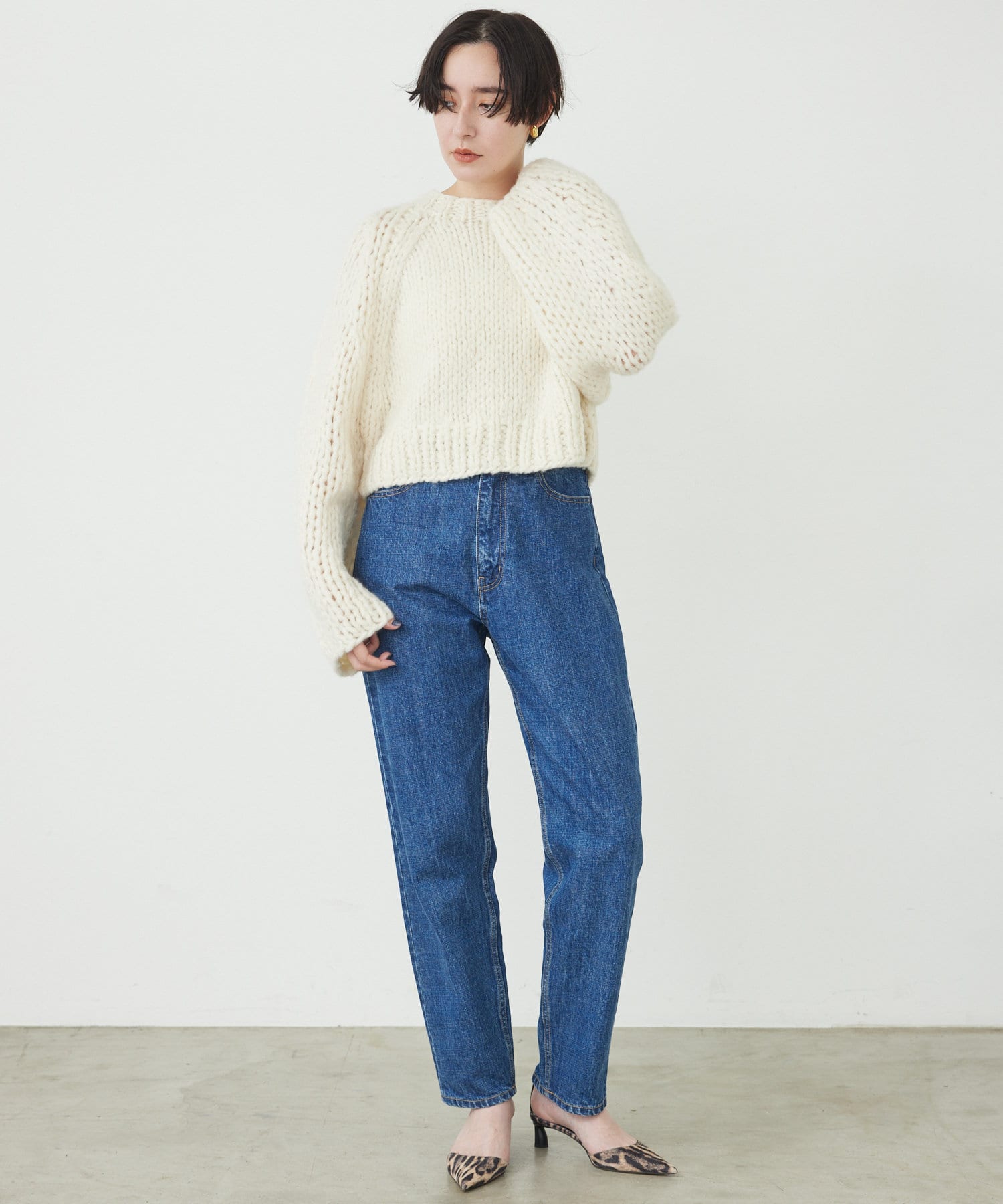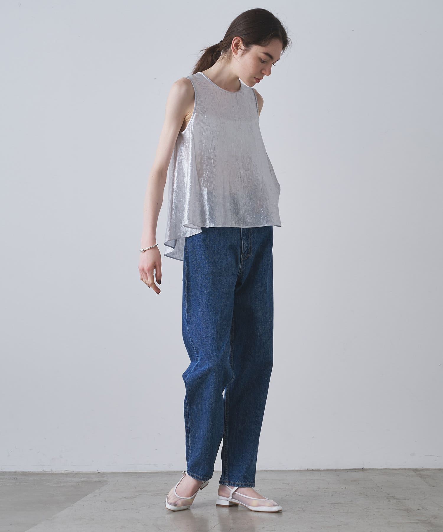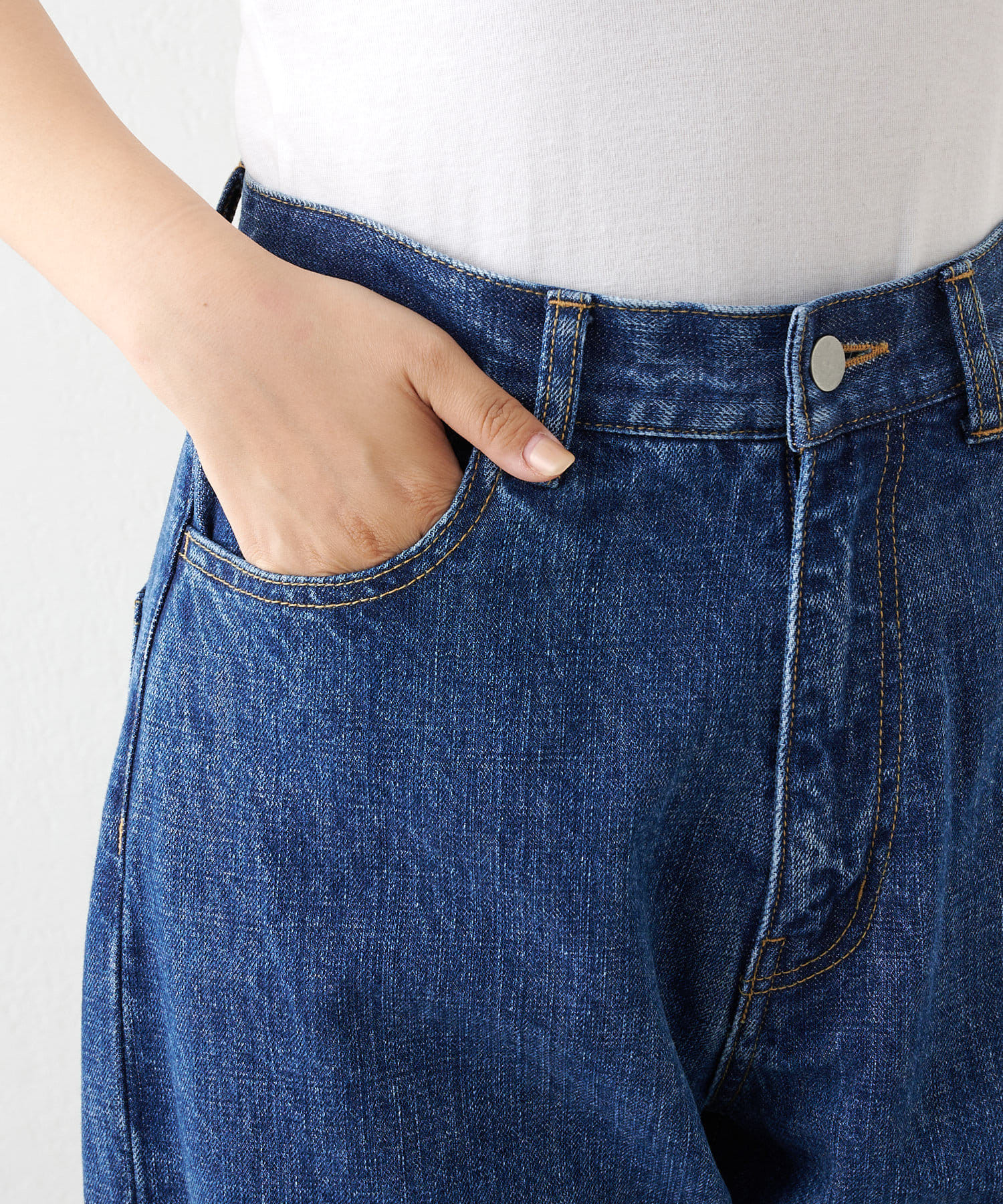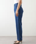 ■細めなプレーンテーパードシルエットのデニムパンツ。