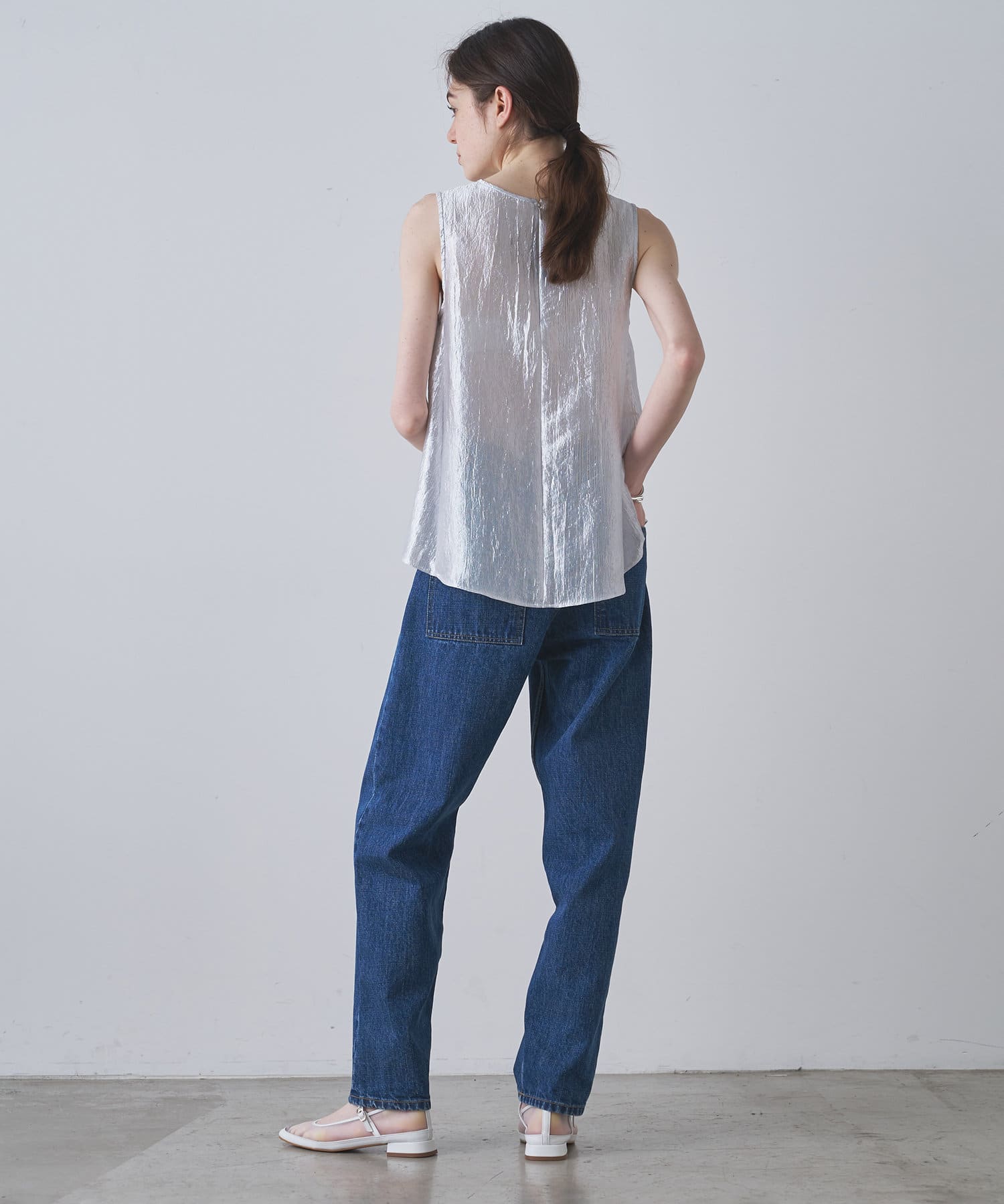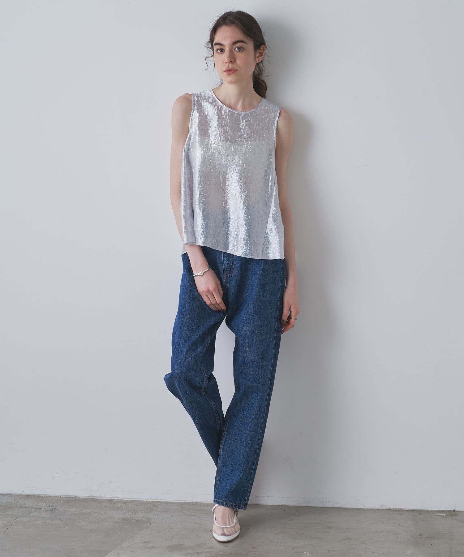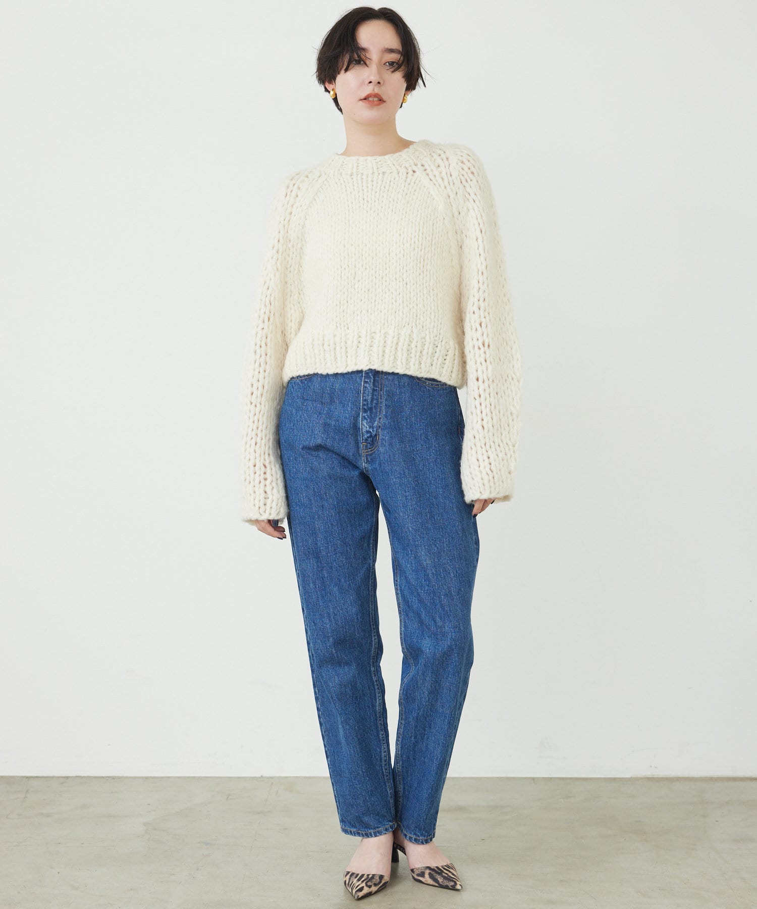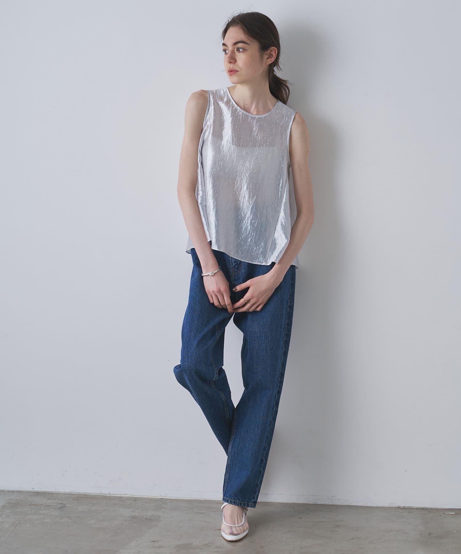 ■細めなプレーンテーパードシルエットのデニムパンツ。