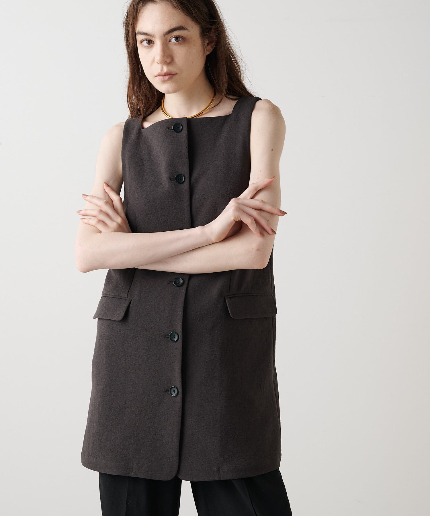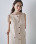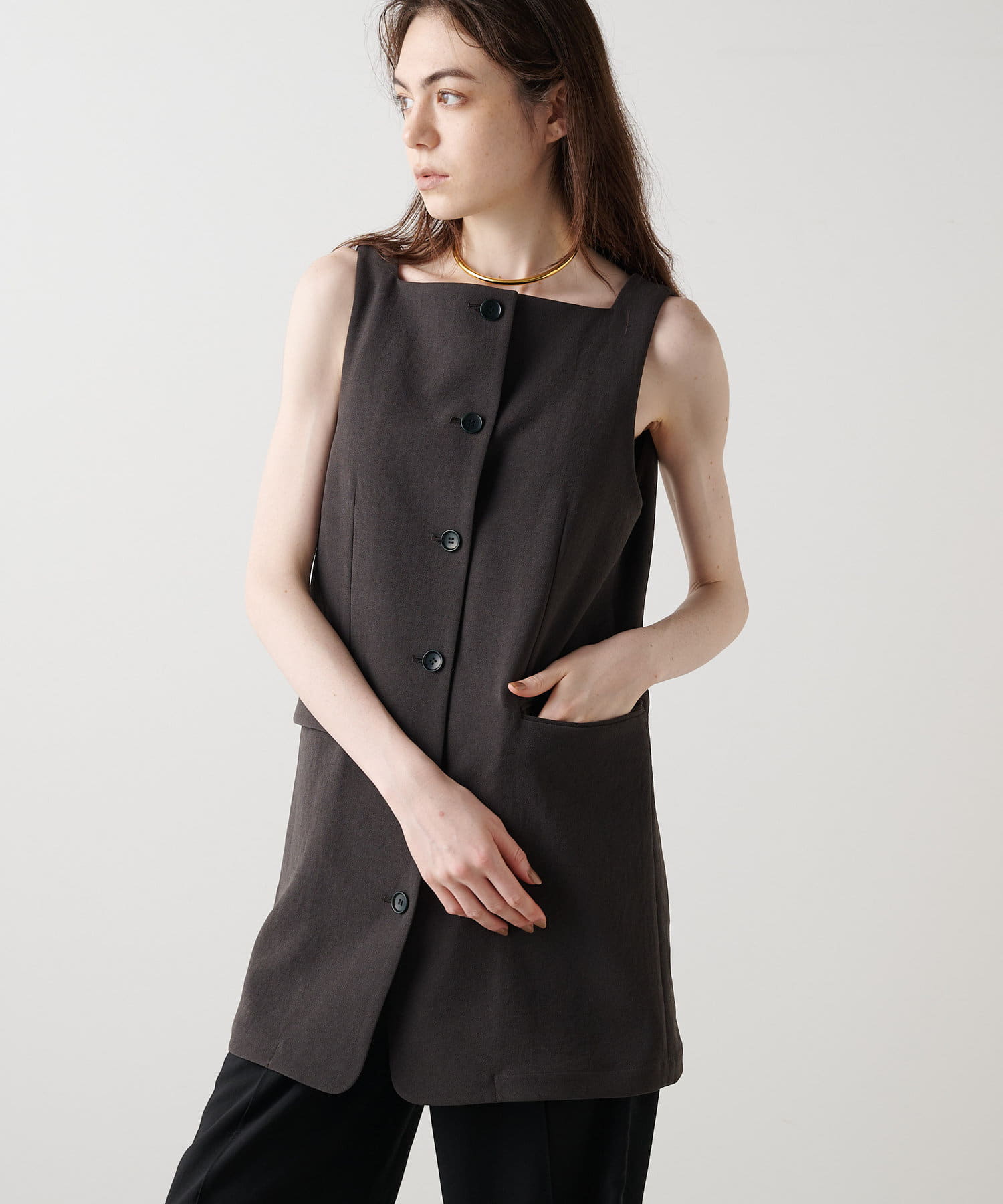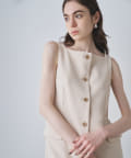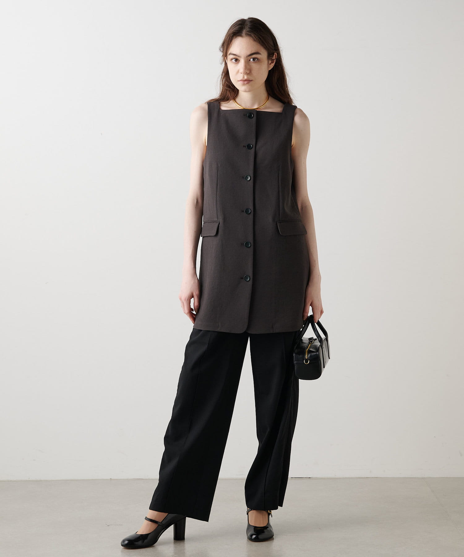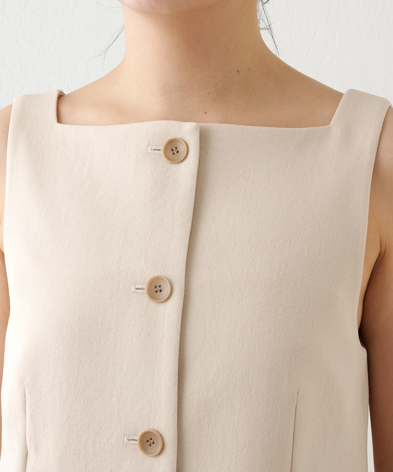 品のある大人ベストです。スクエアネックなので、デコルテラインも綺麗に見えますよ。軽くてサラッとした素材なので、春夏でも着やすいですし、秋冬はタートルニットなどを合わせても素敵かと思います。ワイドパンツ合わせもカッコ良くておすすめです。