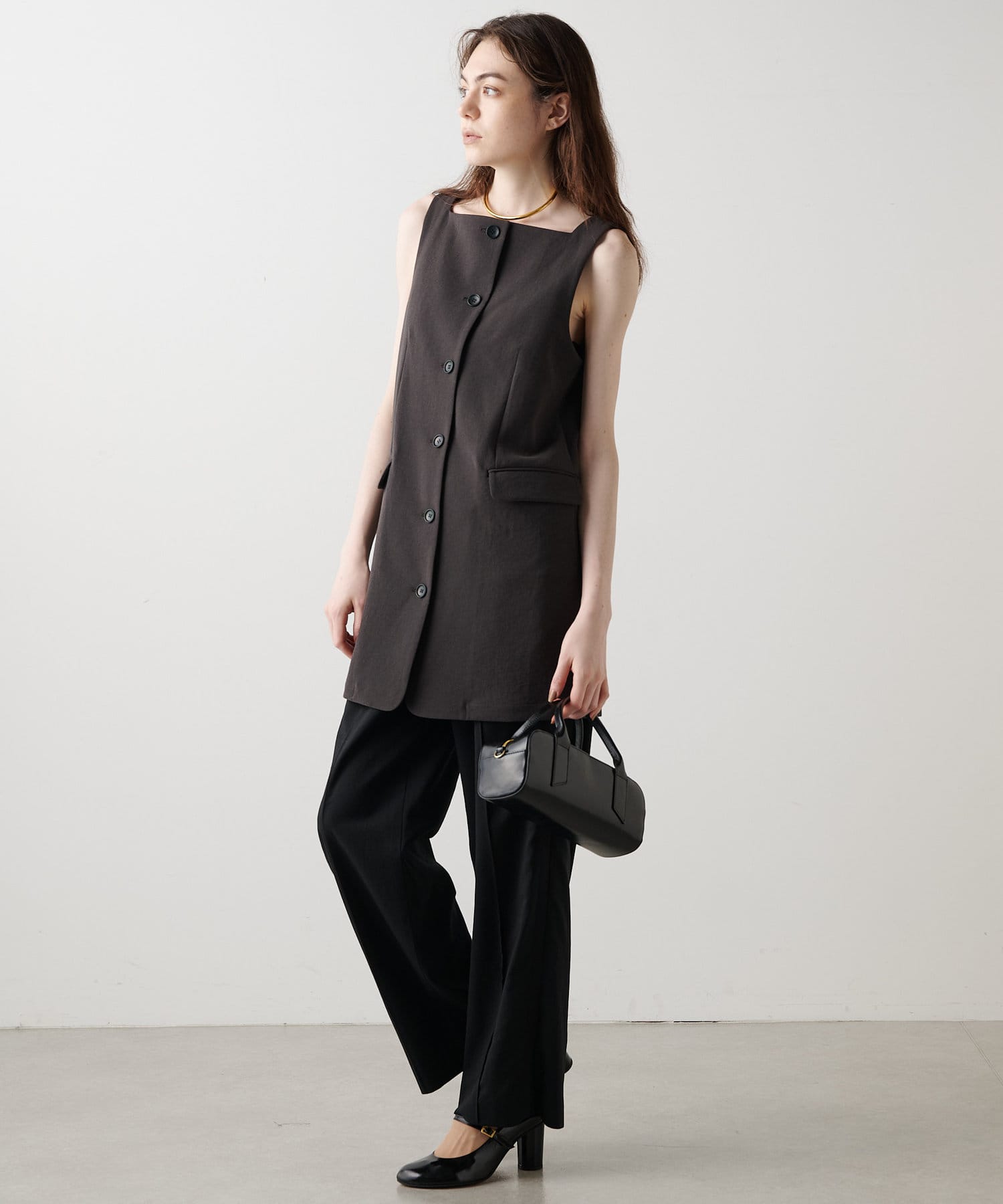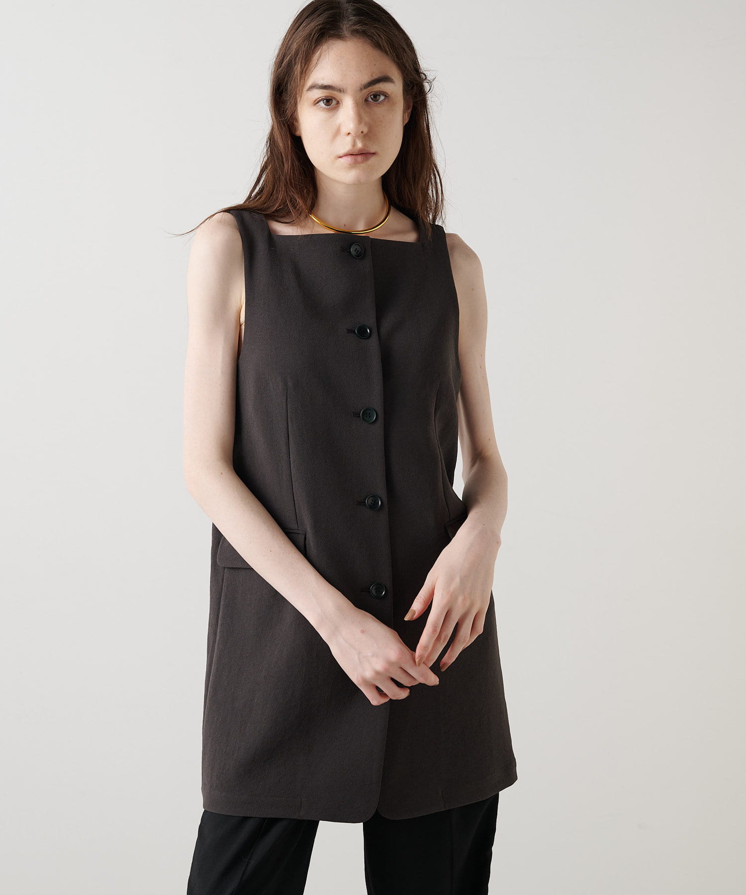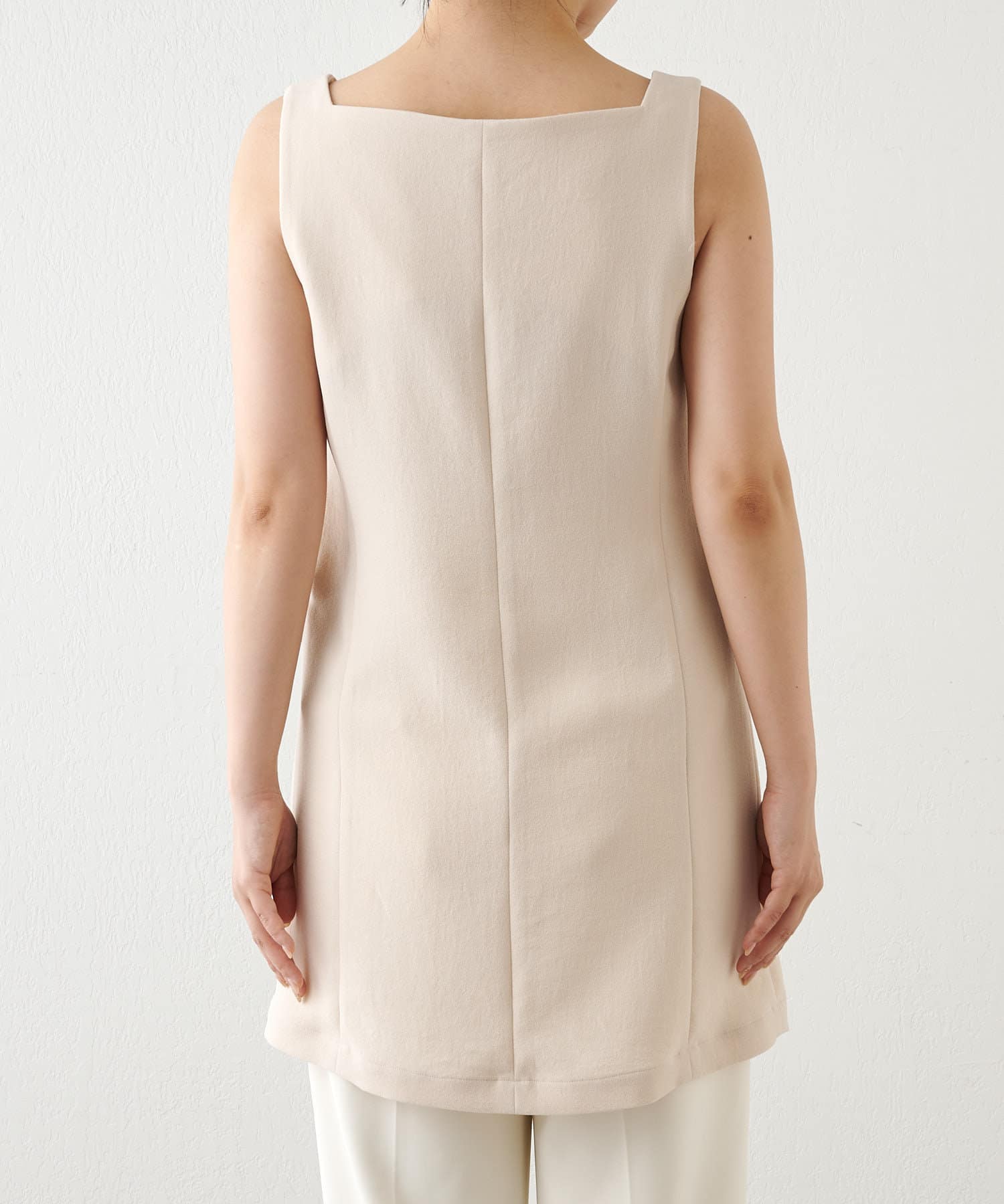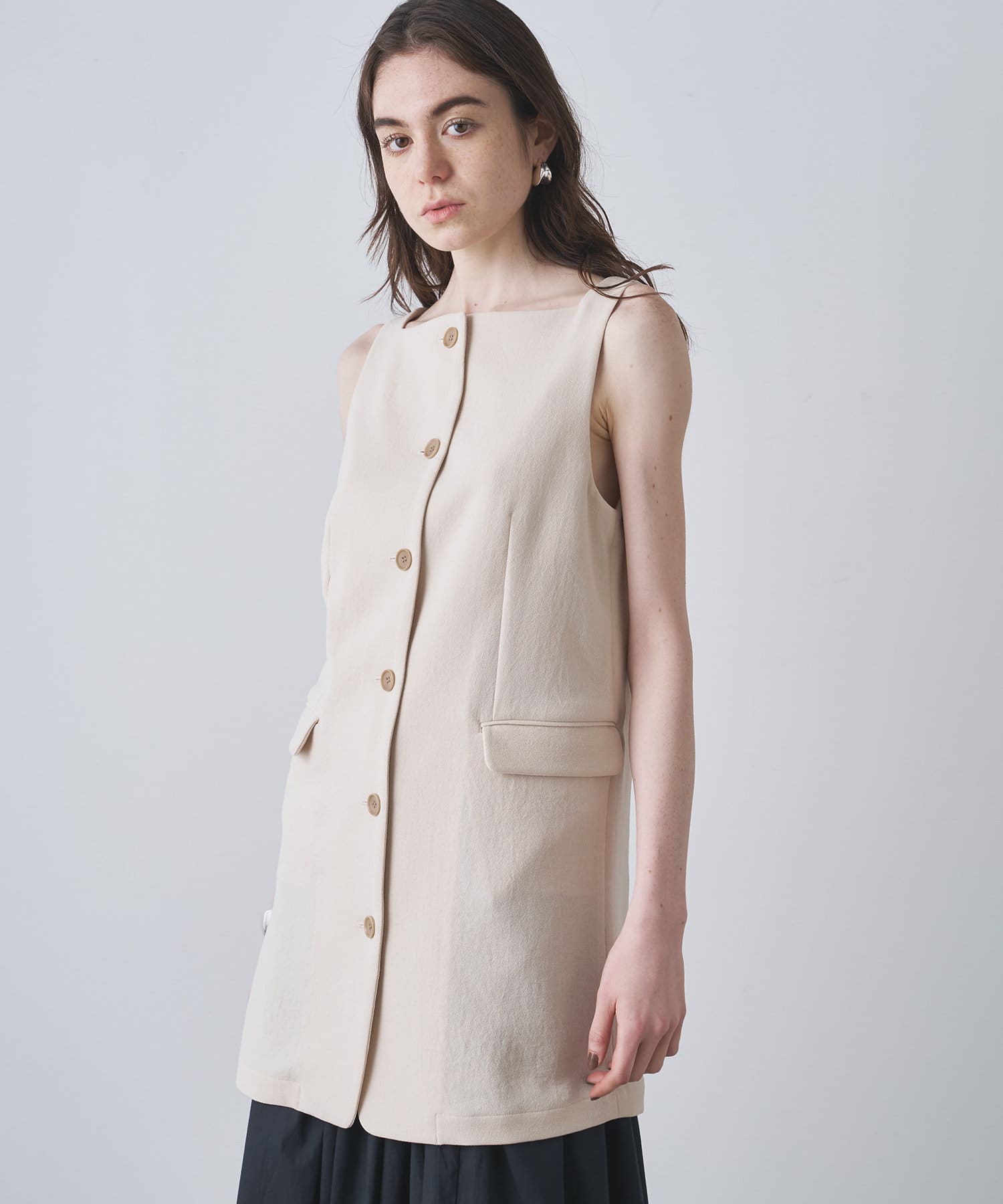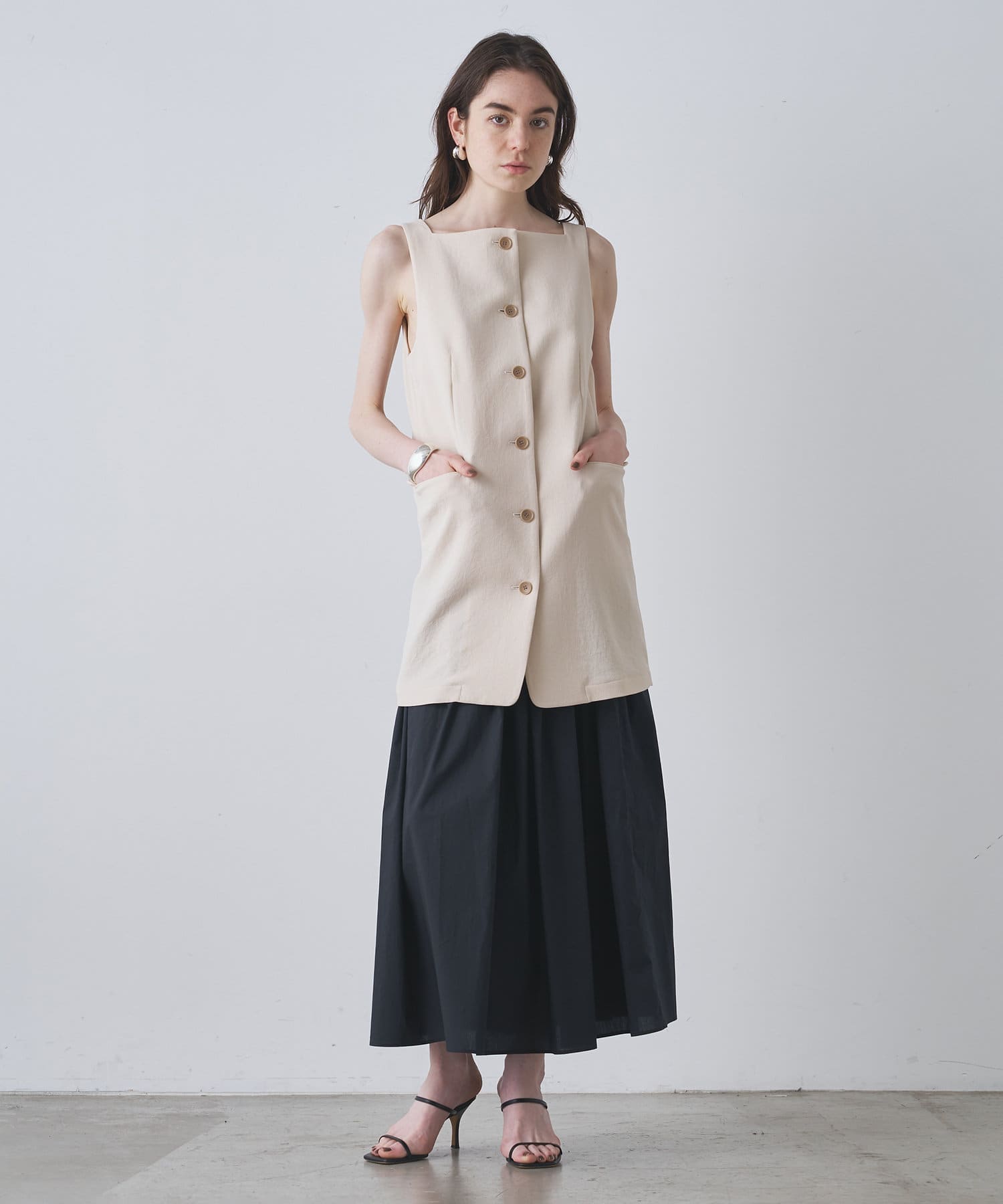 品のある大人ベストです。スクエアネックなので、デコルテラインも綺麗に見えますよ。軽くてサラッとした素材なので、春夏でも着やすいですし、秋冬はタートルニットなどを合わせても素敵かと思います。ワイドパンツ合わせもカッコ良くておすすめです。