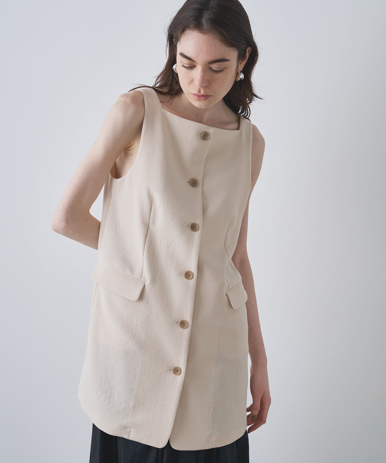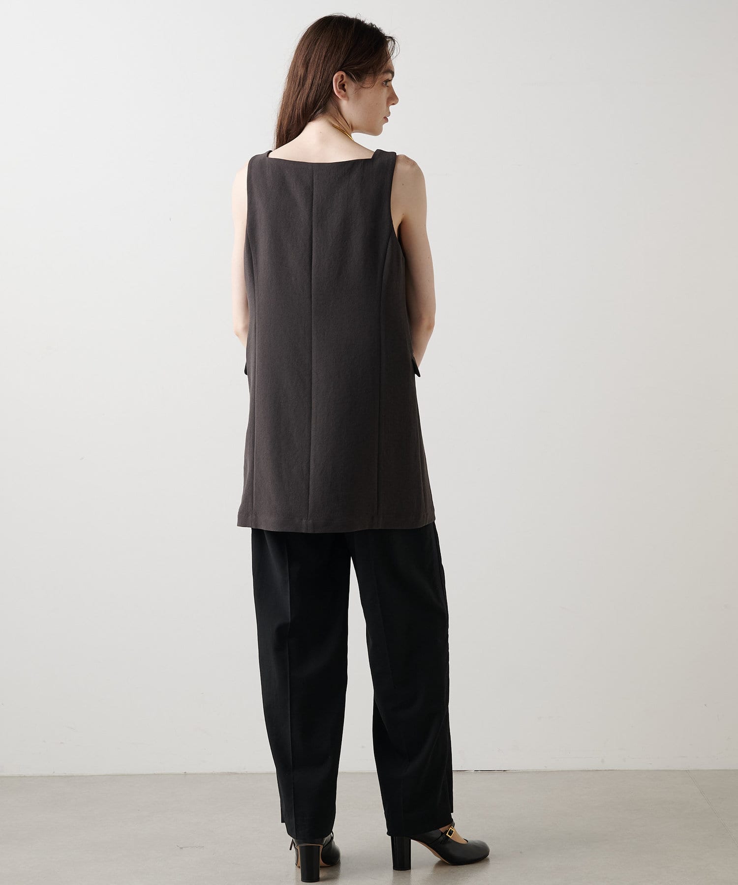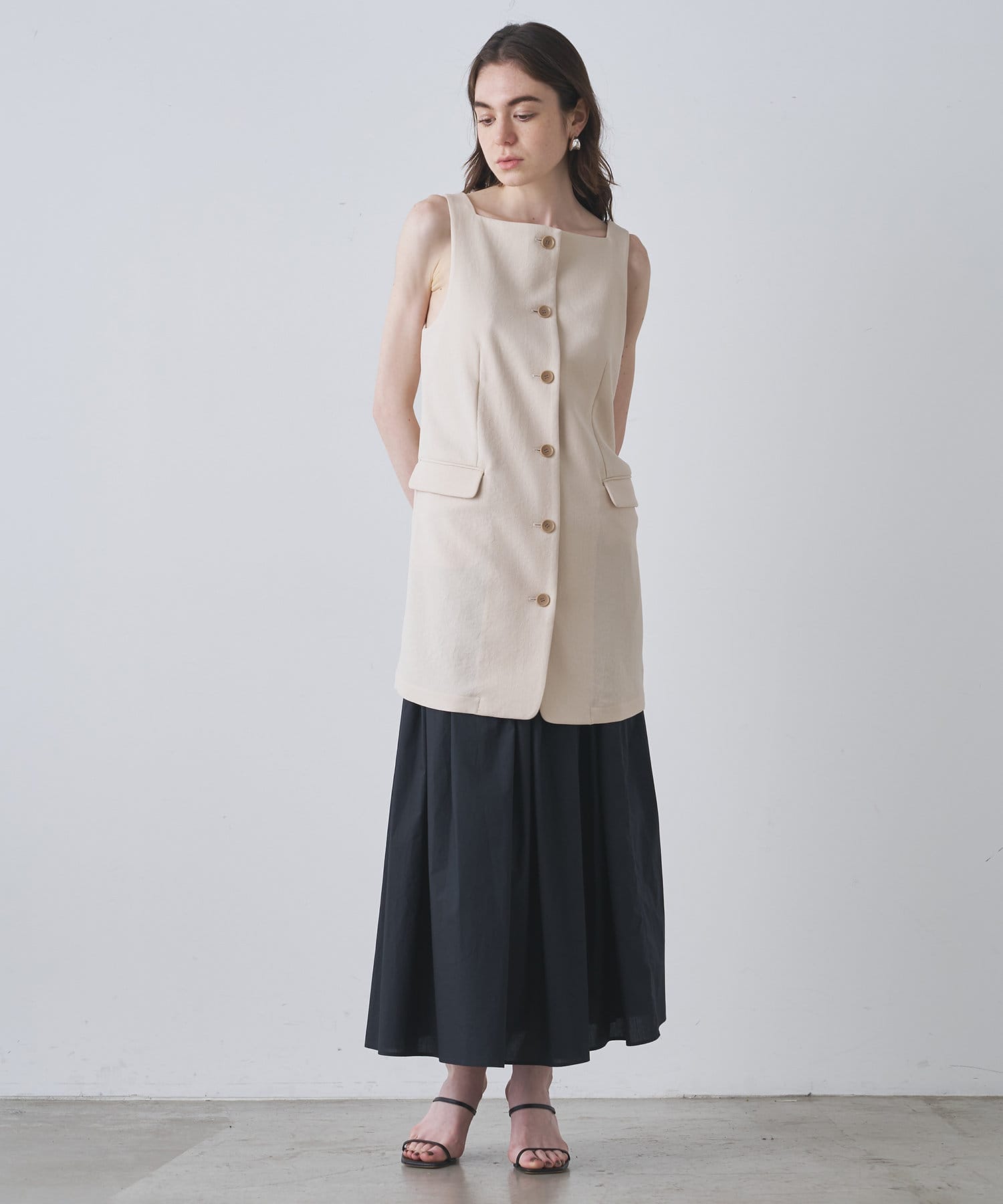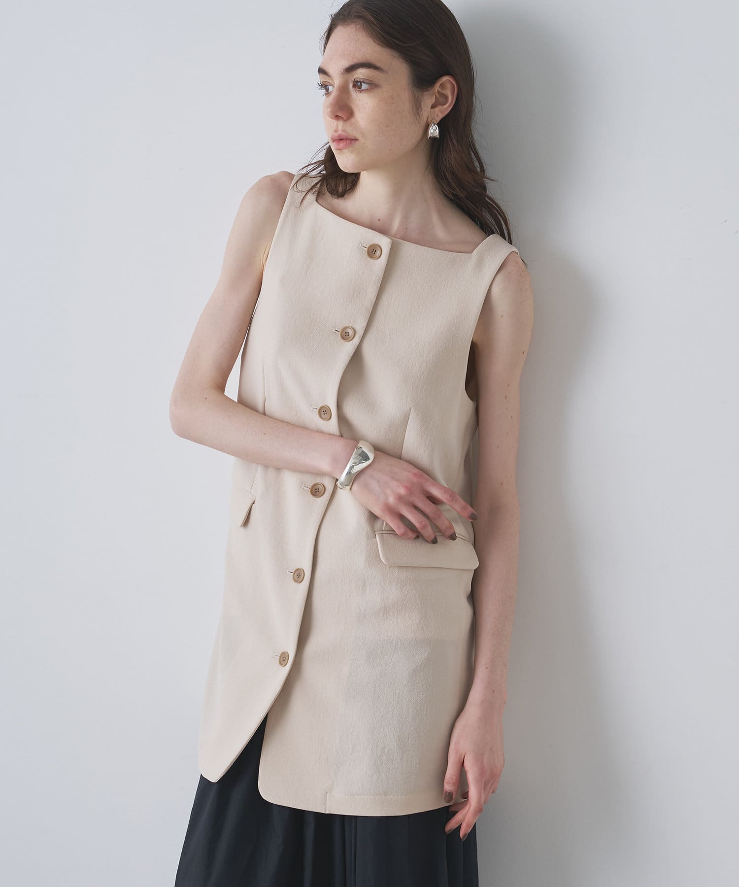 品のある大人ベストです。スクエアネックなので、デコルテラインも綺麗に見えますよ。軽くてサラッとした素材なので、春夏でも着やすいですし、秋冬はタートルニットなどを合わせても素敵かと思います。ワイドパンツ合わせもカッコ良くておすすめです。