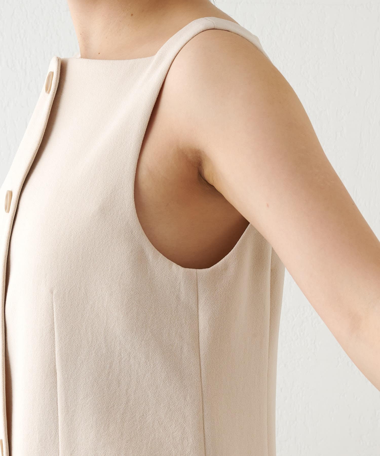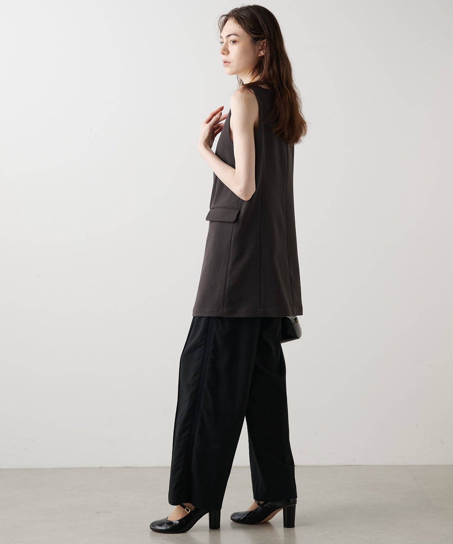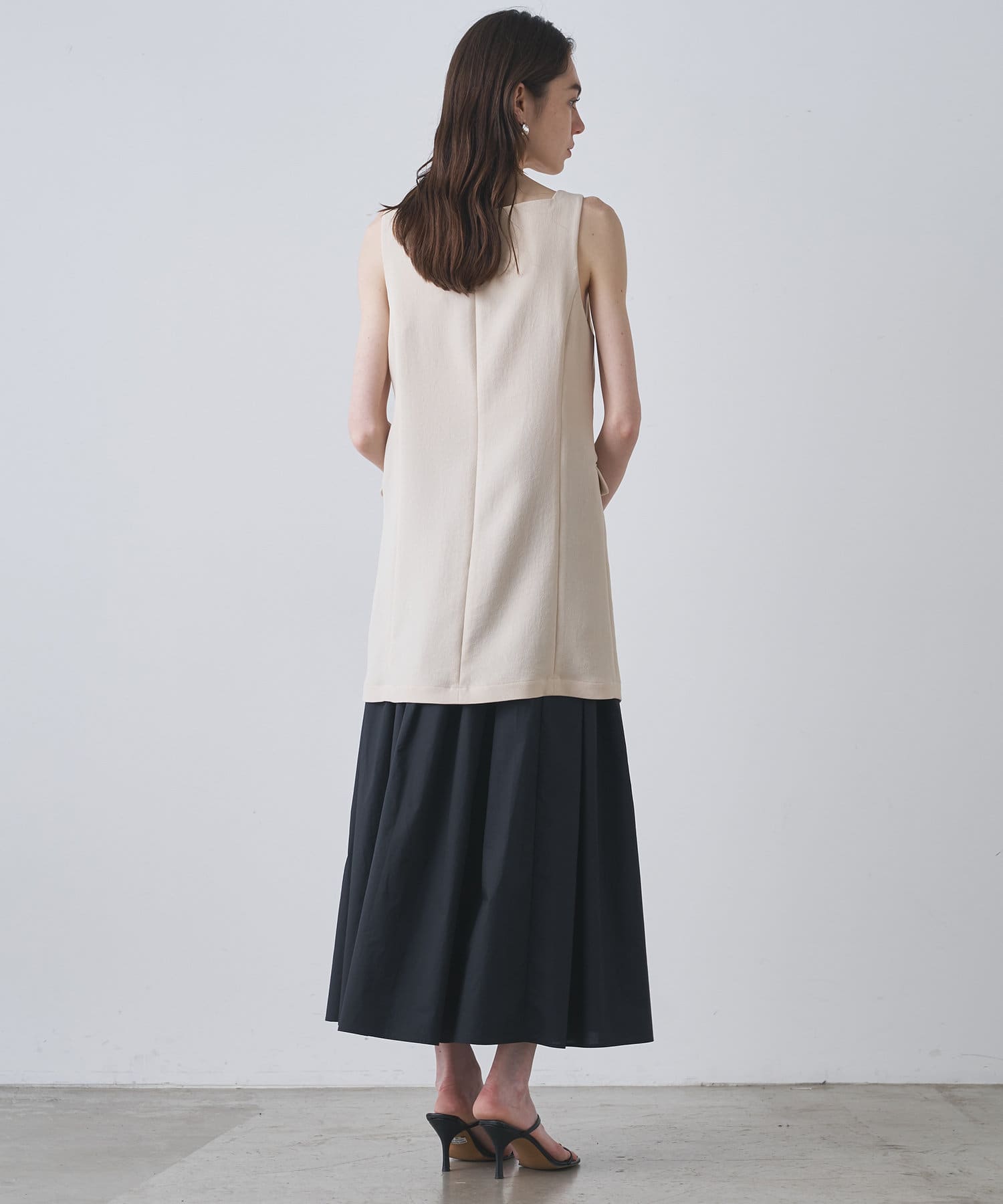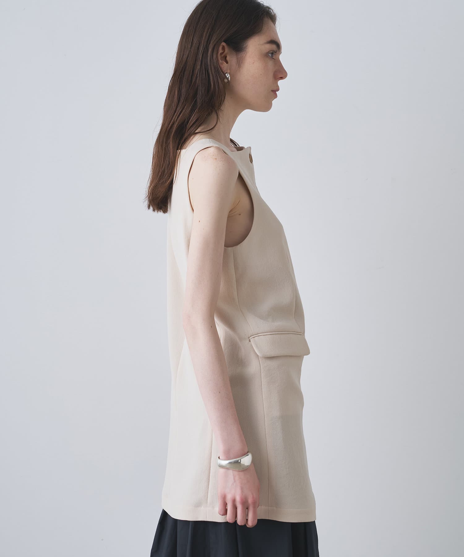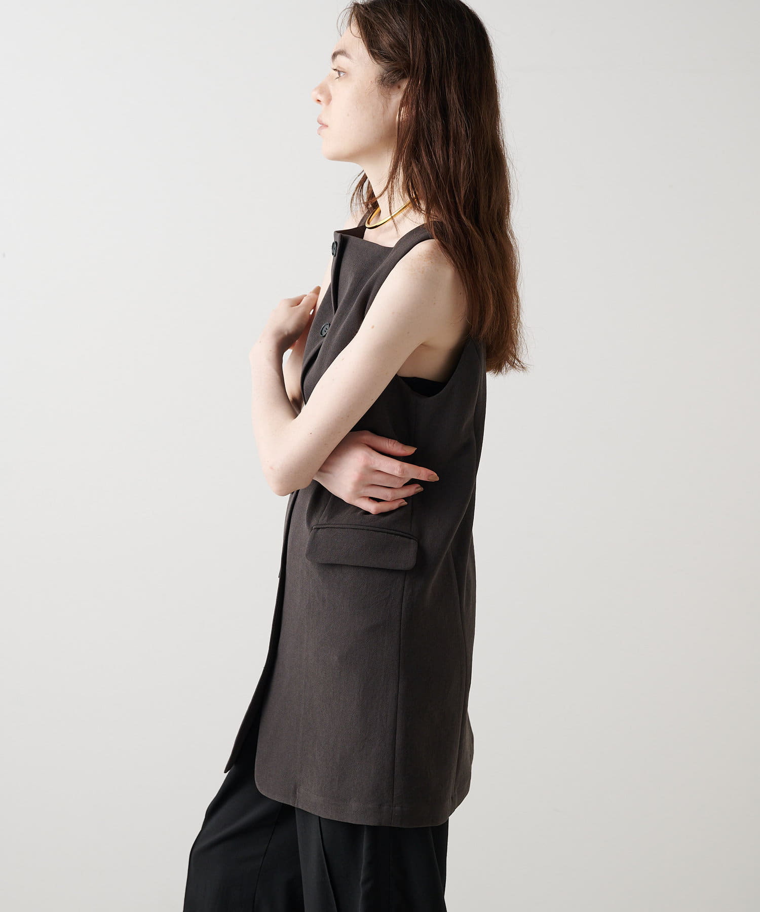品のある大人ベストです。スクエアネックなので、デコルテラインも綺麗に見えますよ。軽くてサラッとした素材なので、春夏でも着やすいですし、秋冬はタートルニットなどを合わせても素敵かと思います。ワイドパンツ合わせもカッコ良くておすすめです。