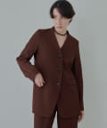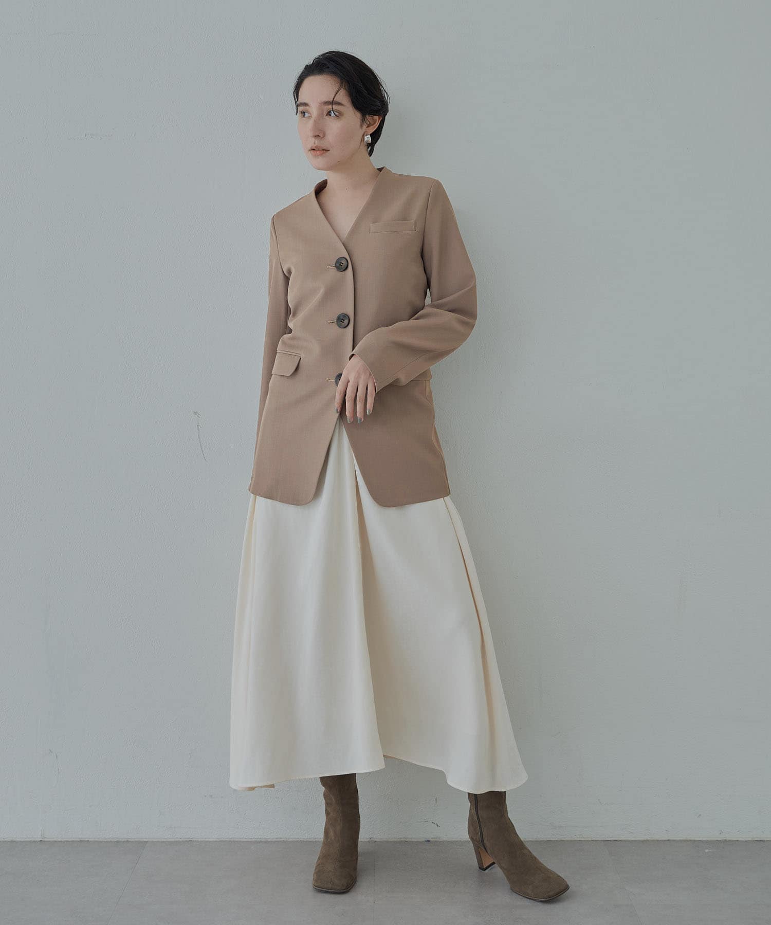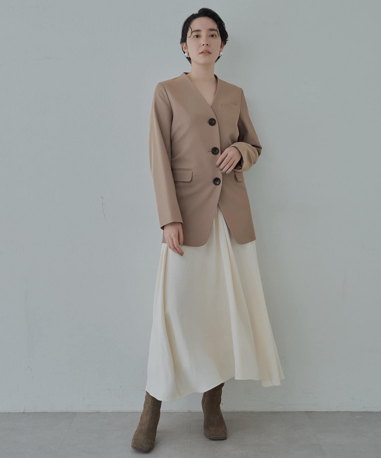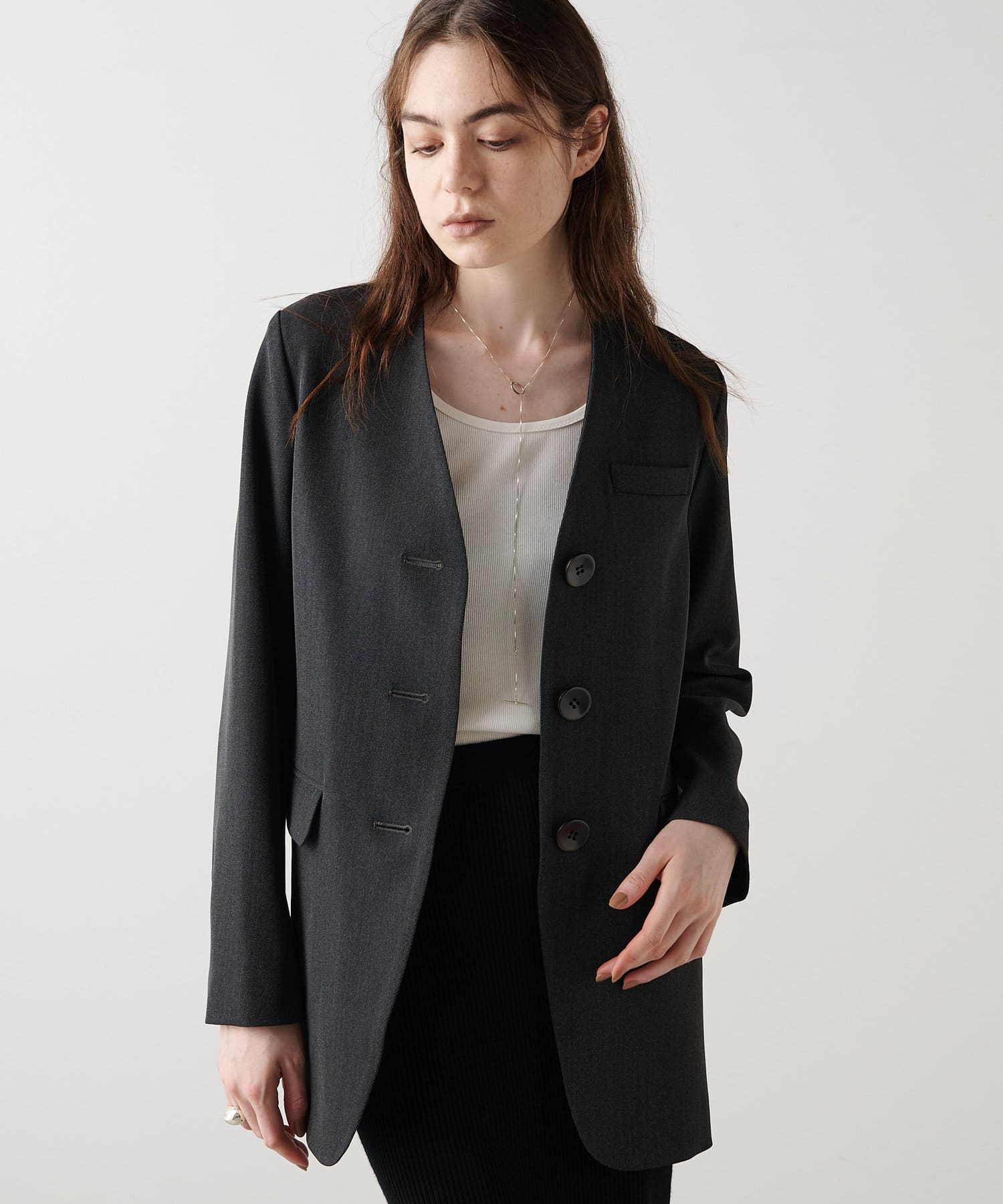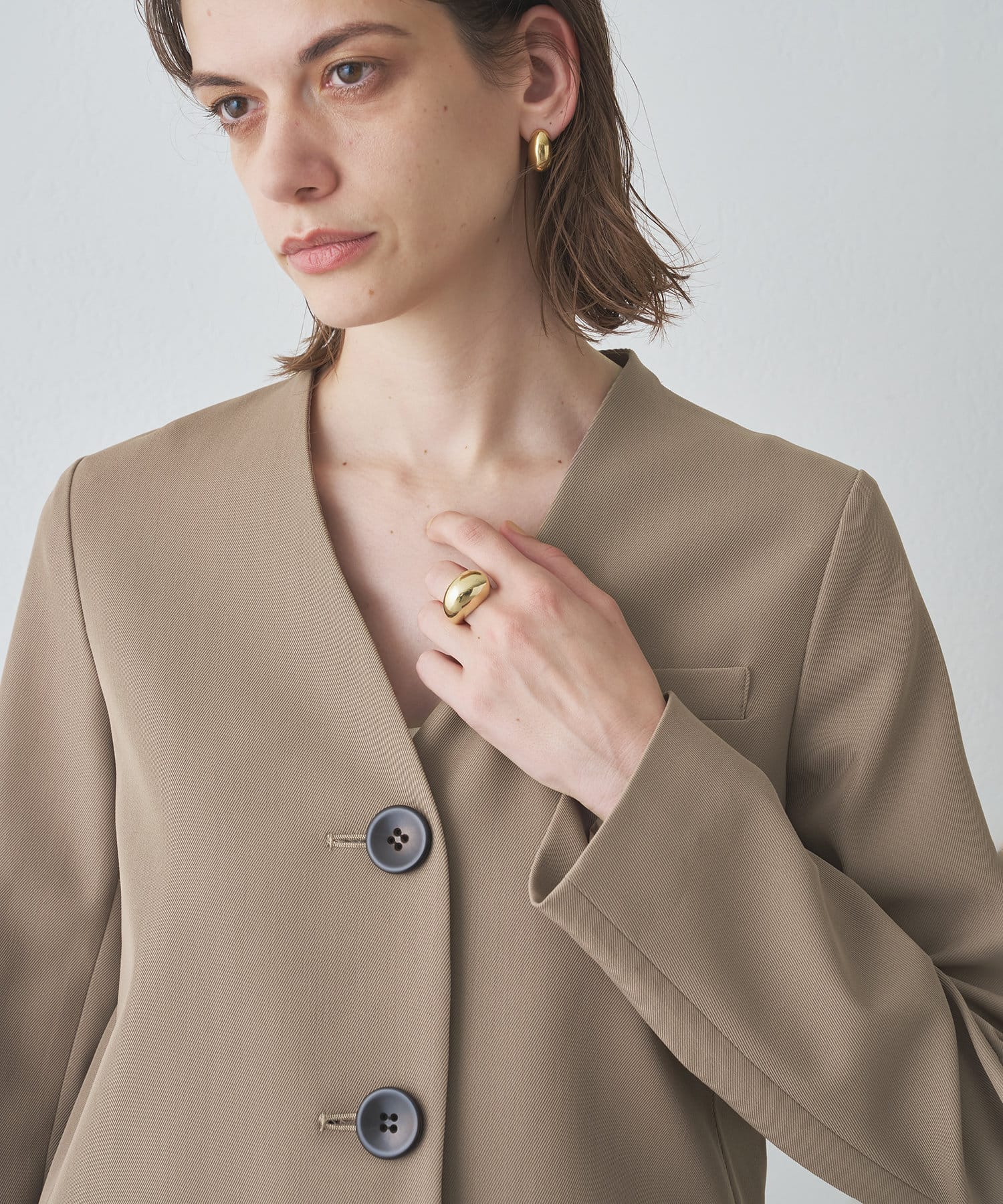 ■ノーカラーが首元をすっきりと見せ、女性らしさをプラスするデザイン。