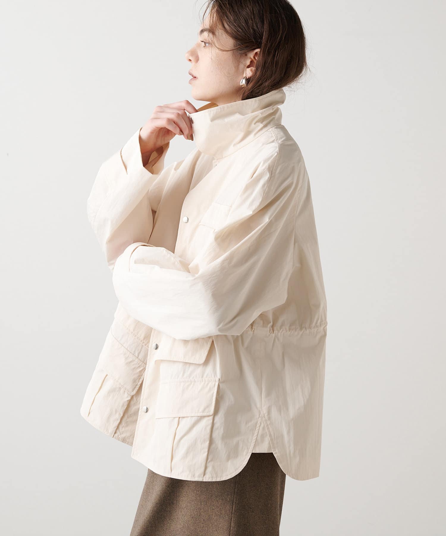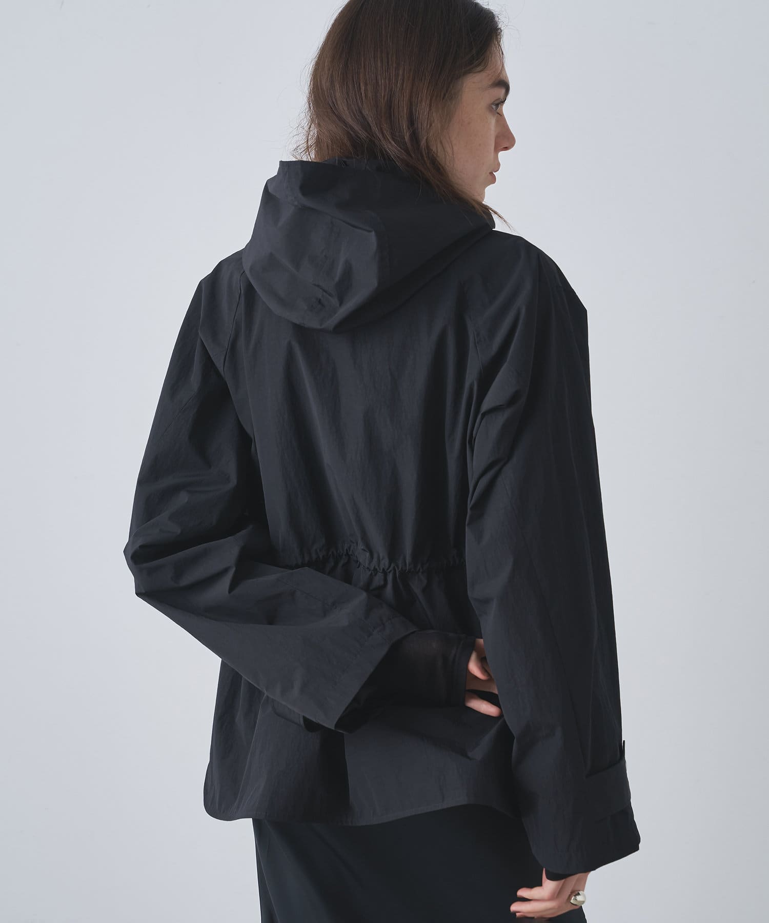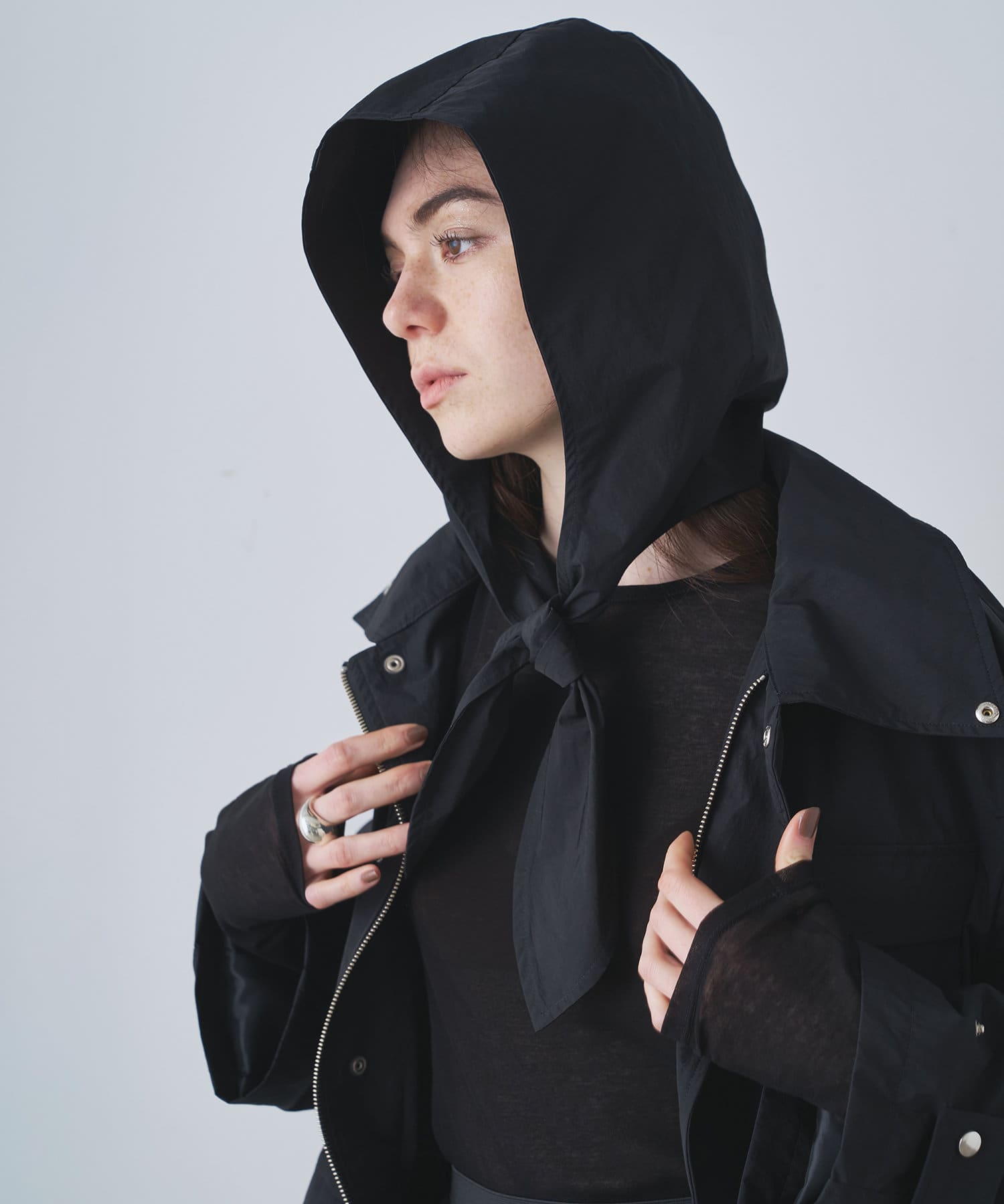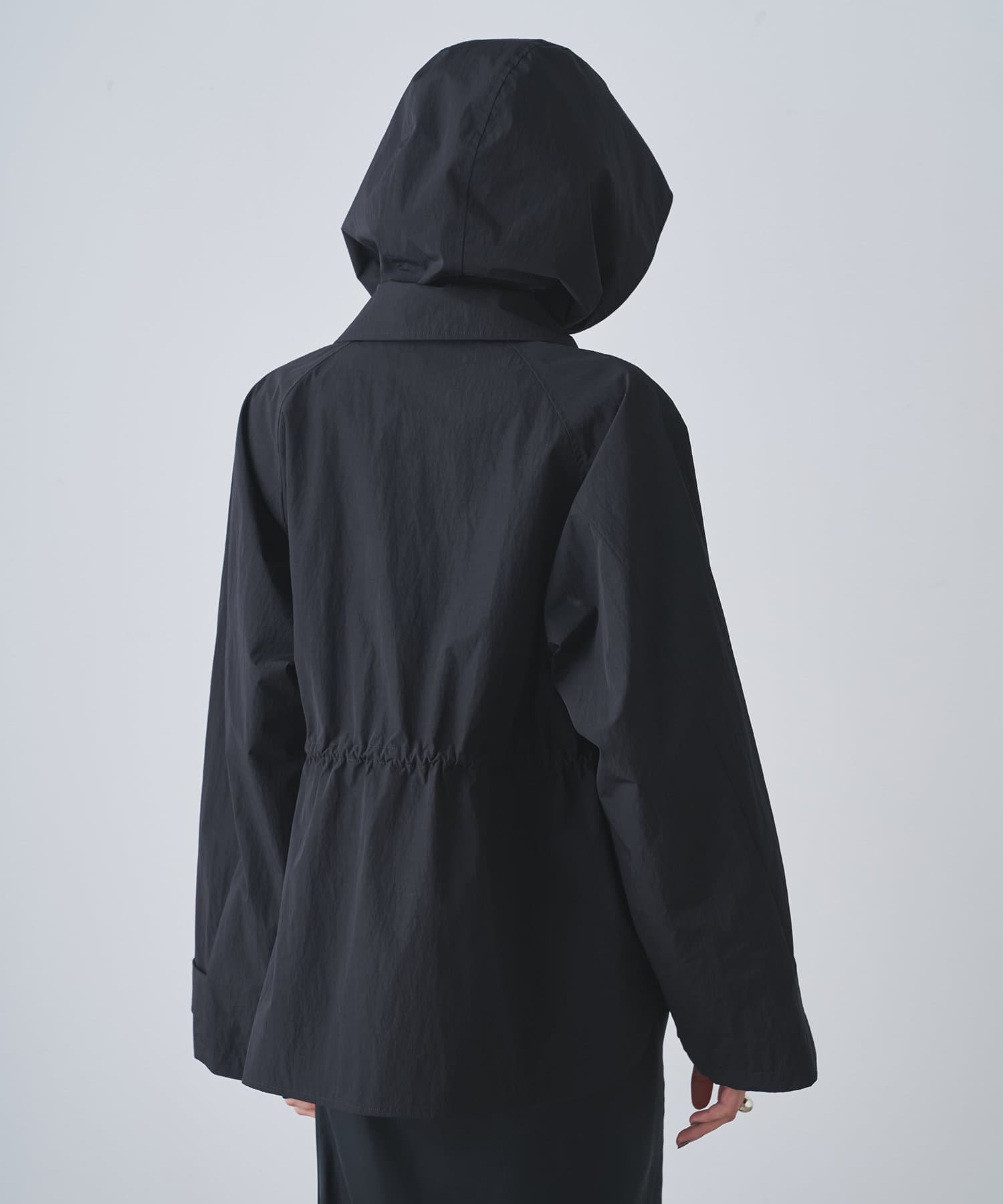 雨の日も使える軽い素材のショートコート。フーディーは取り外して綺麗なスタイルに。