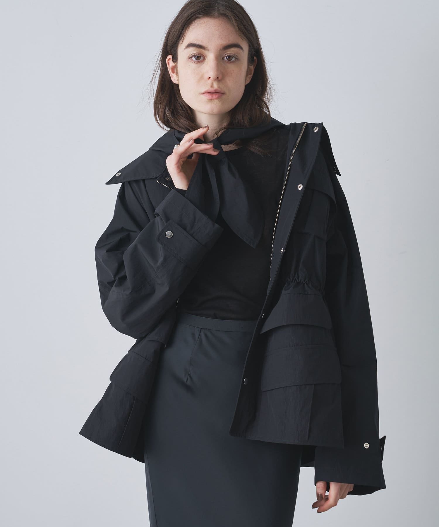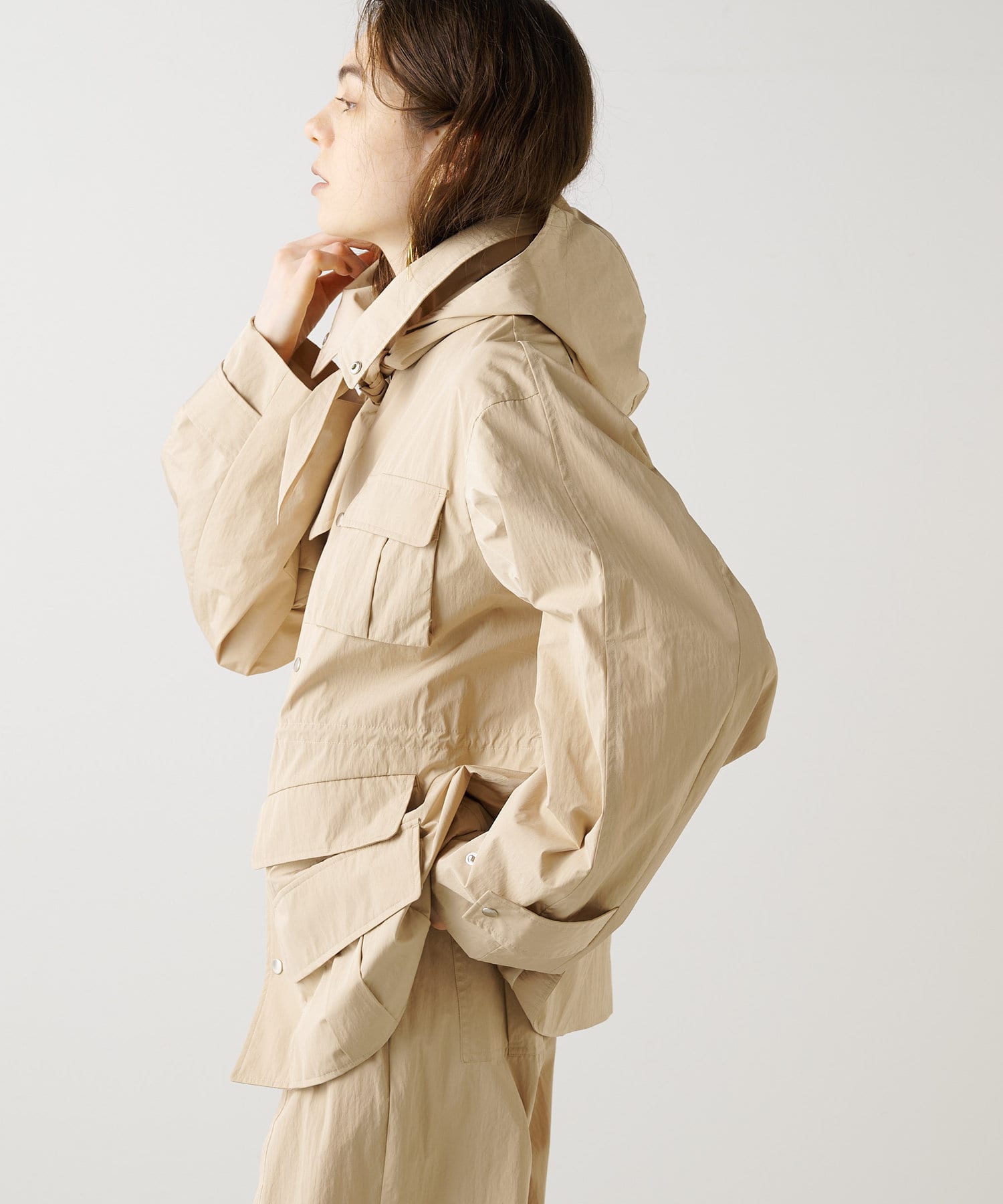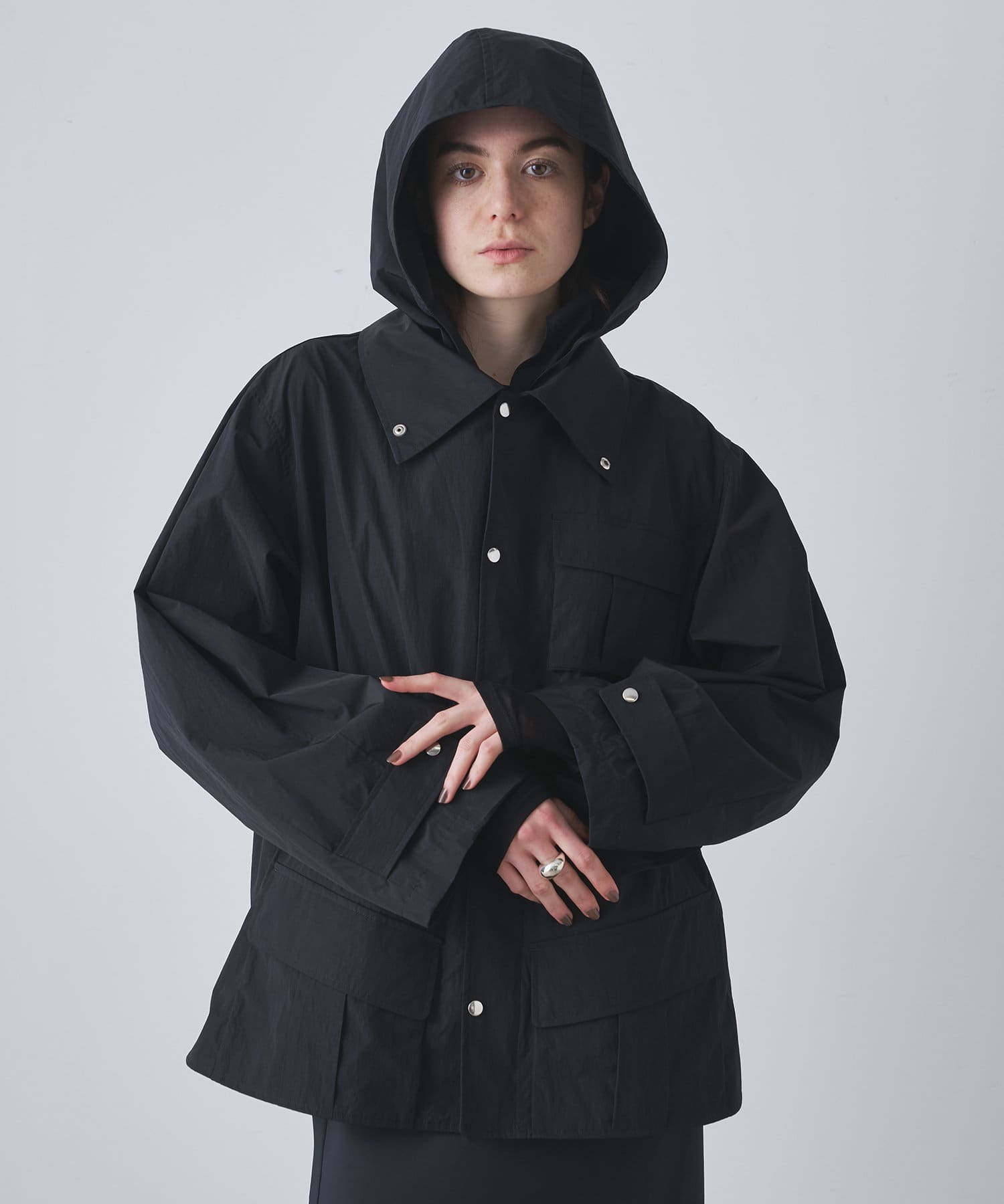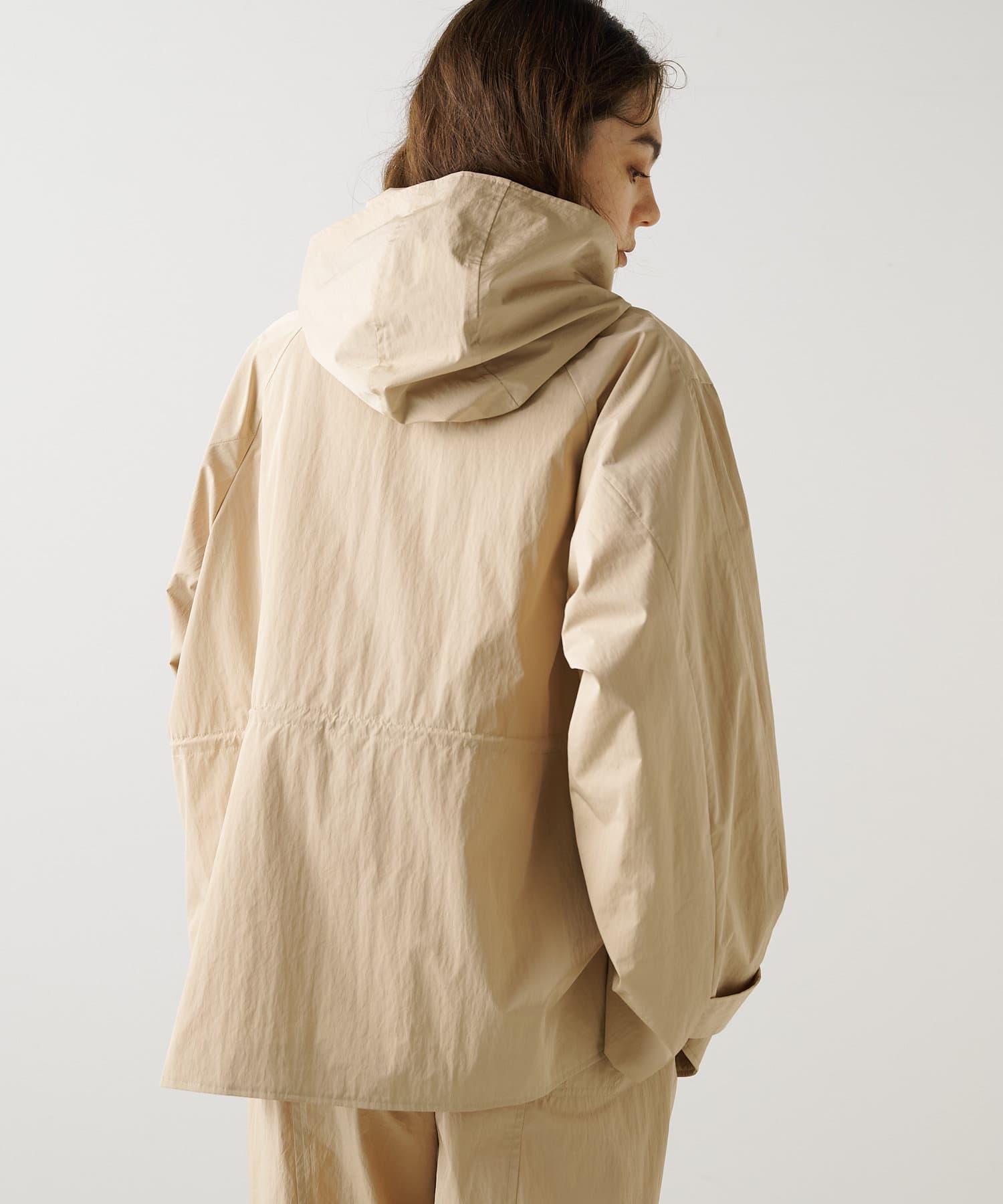 雨の日も使える軽い素材のショートコート。フーディーは取り外して綺麗なスタイルに。