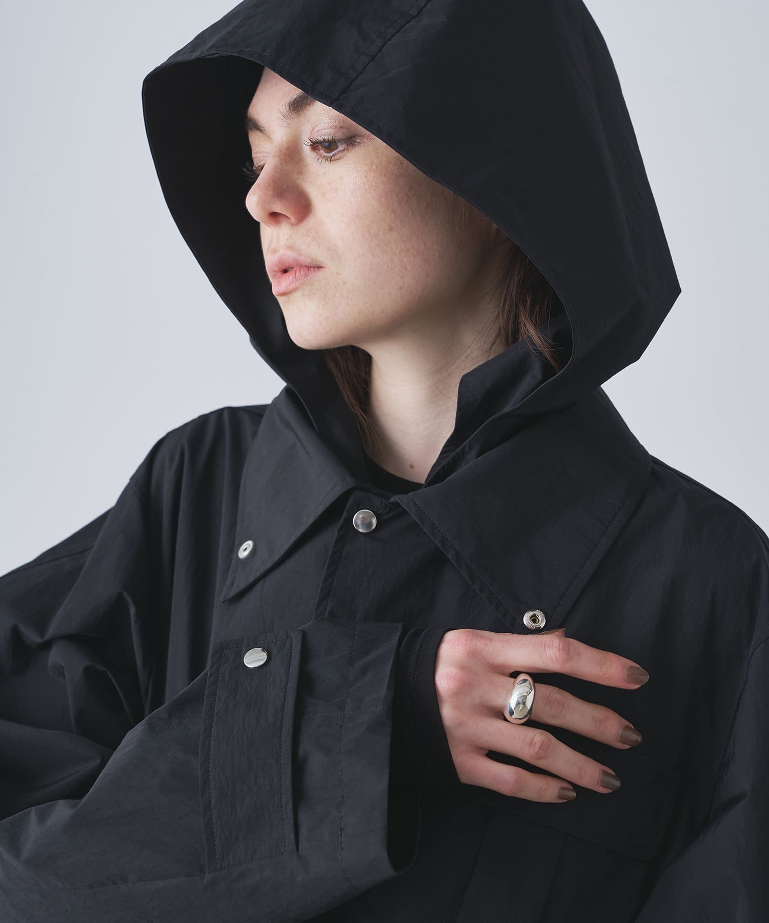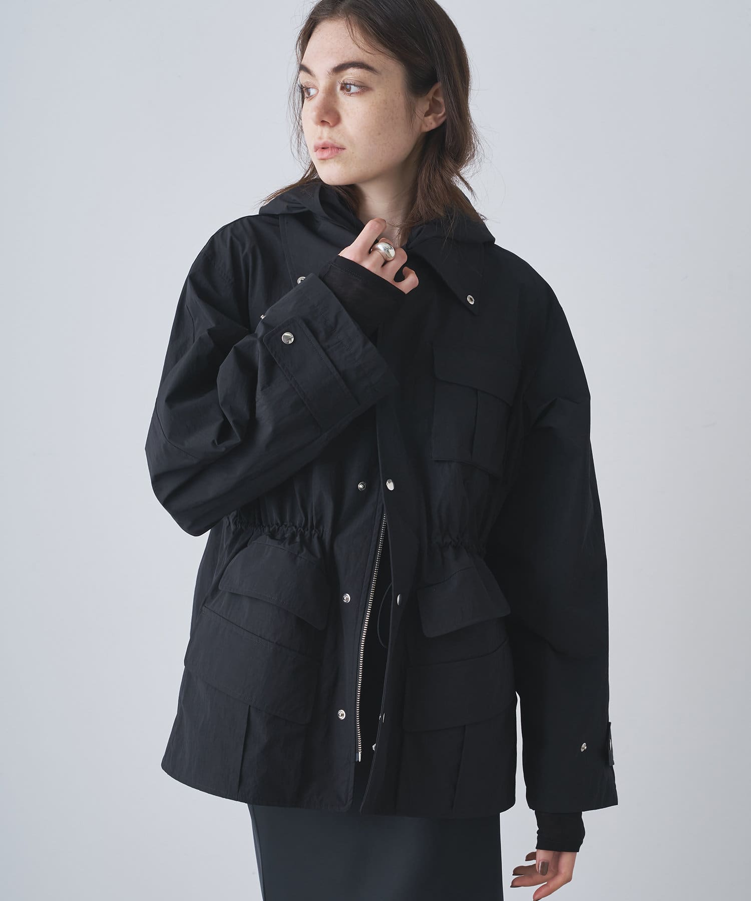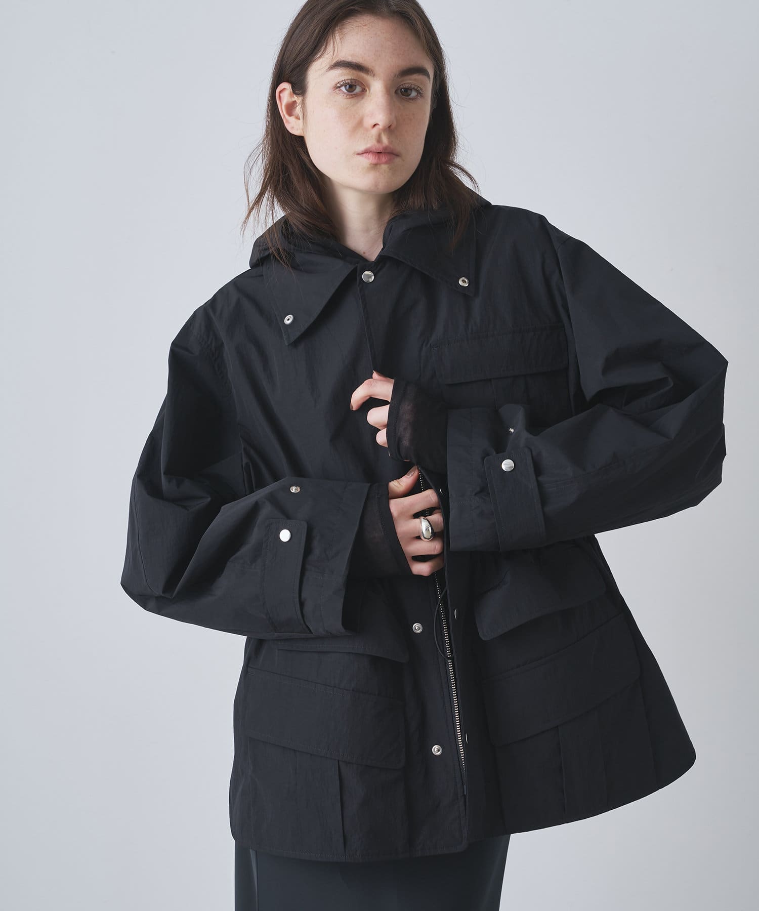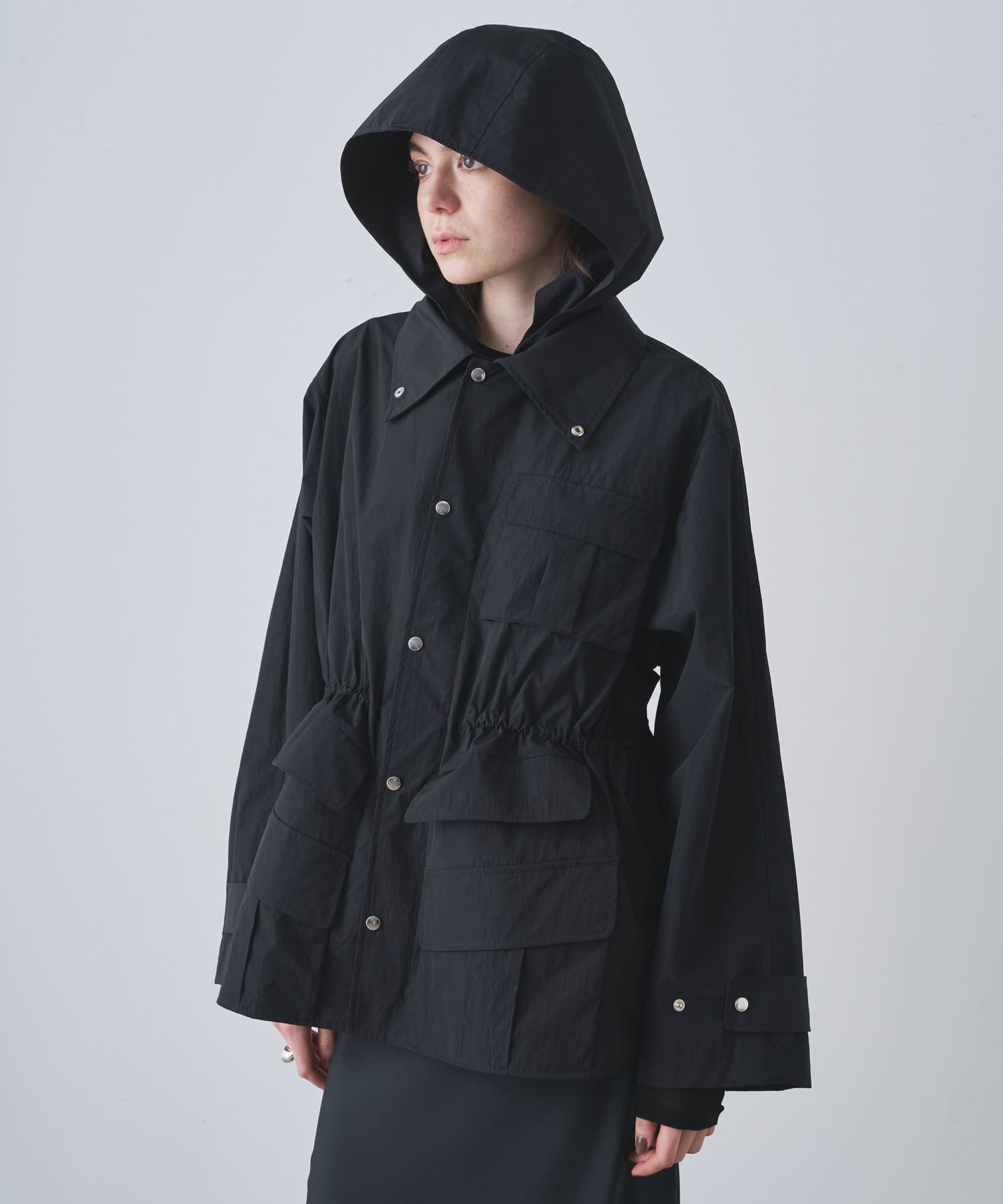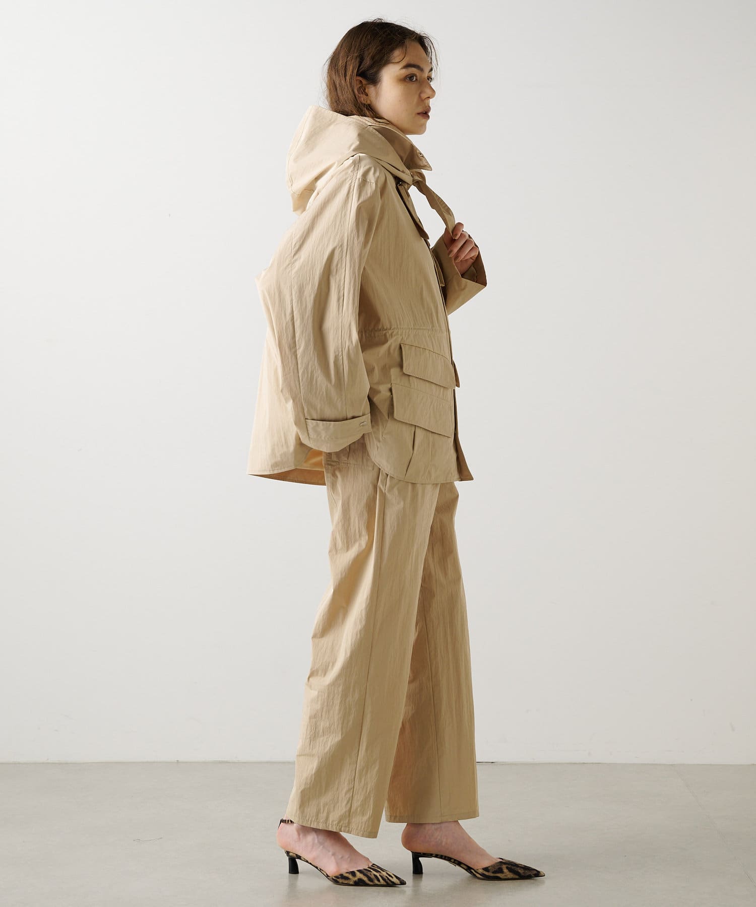 雨の日も使える軽い素材のショートコート。フーディーは取り外して綺麗なスタイルに。
