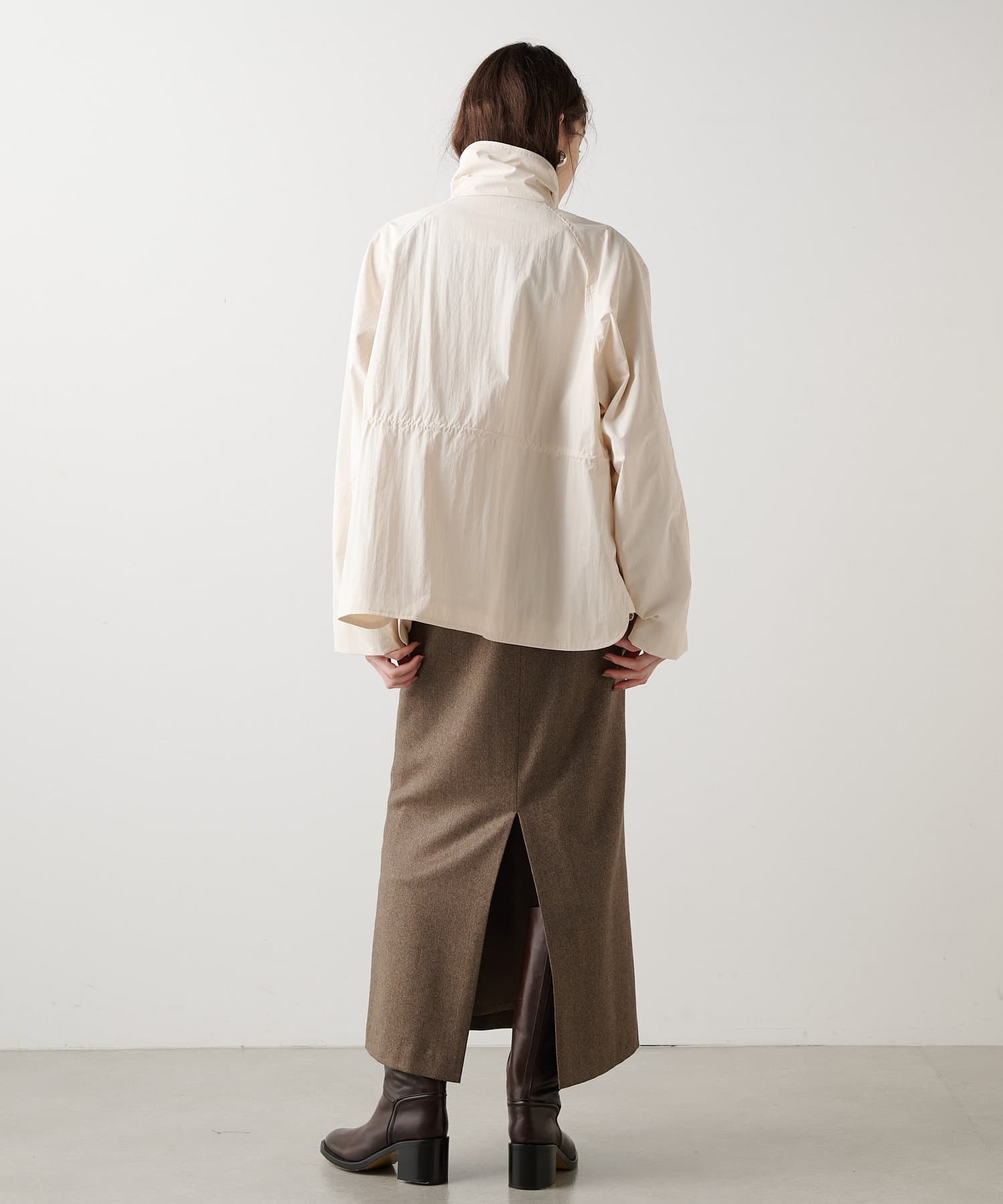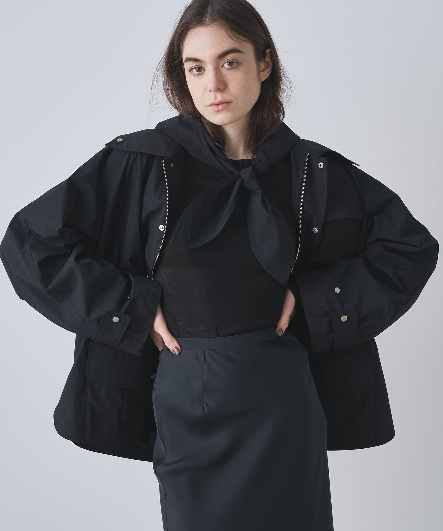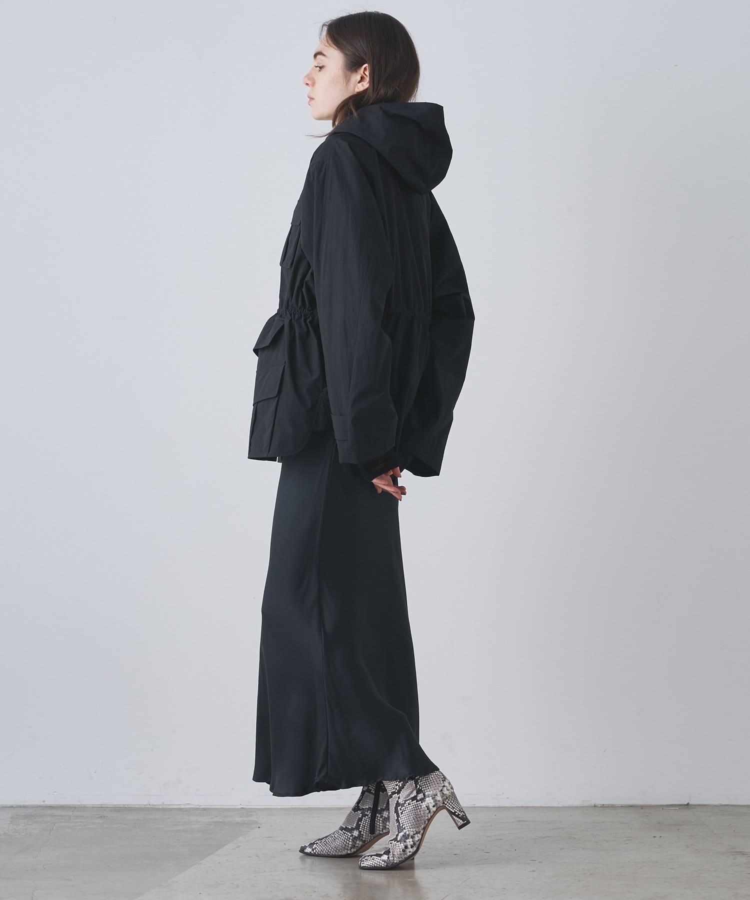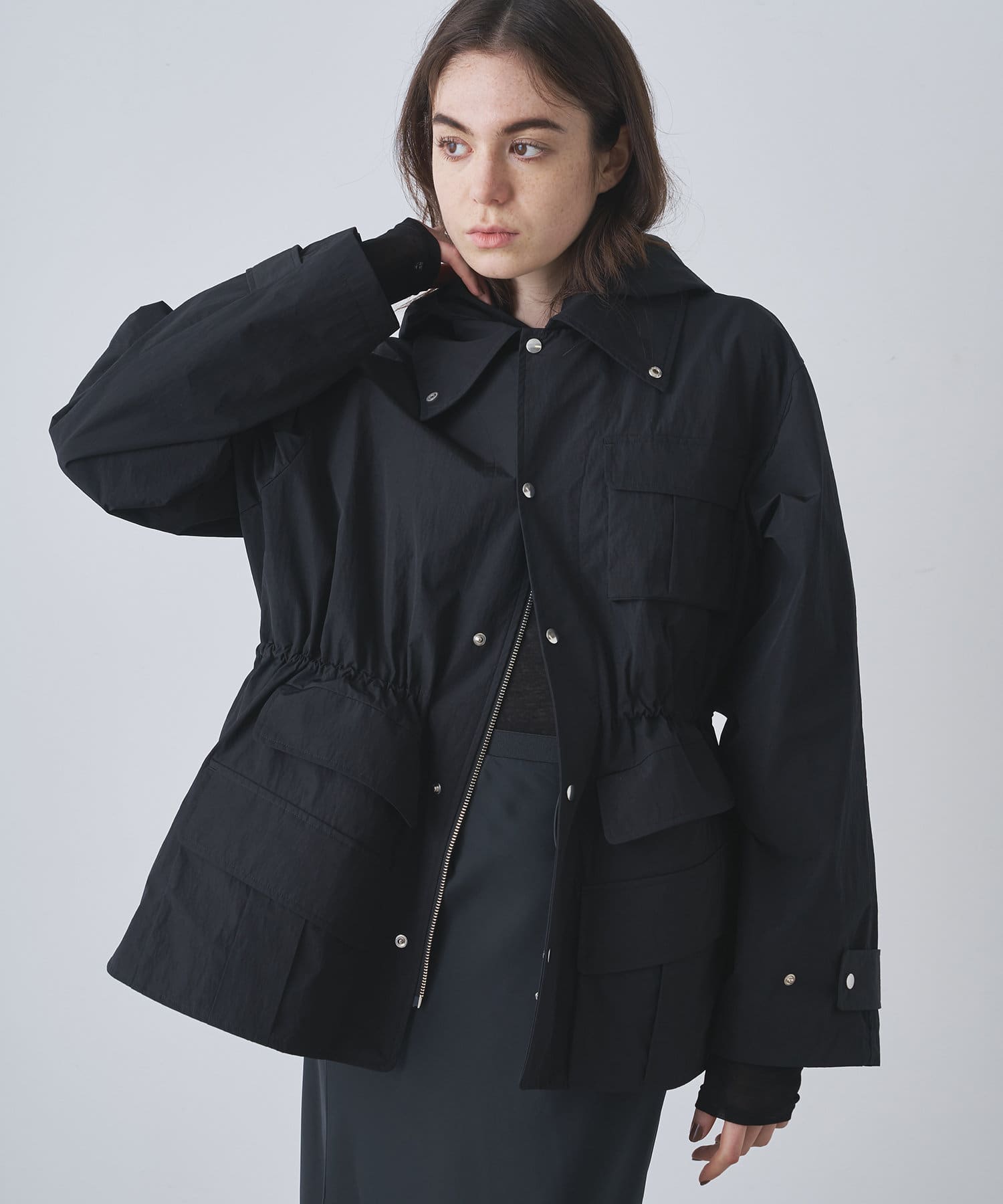 雨の日も使える軽い素材のショートコート。フーディーは取り外して綺麗なスタイルに。