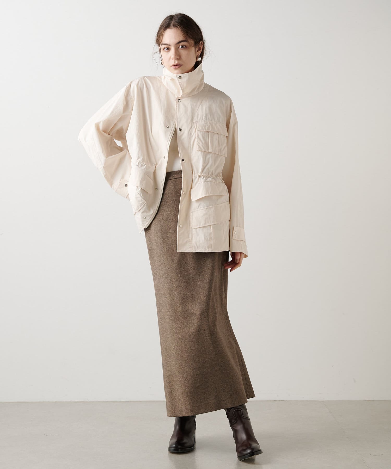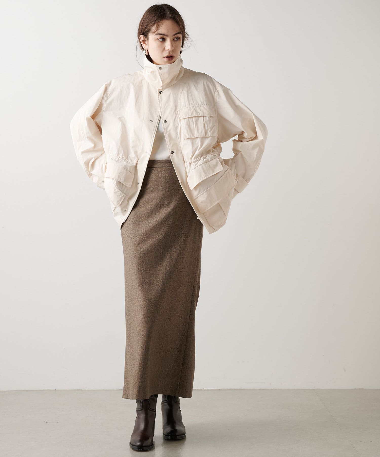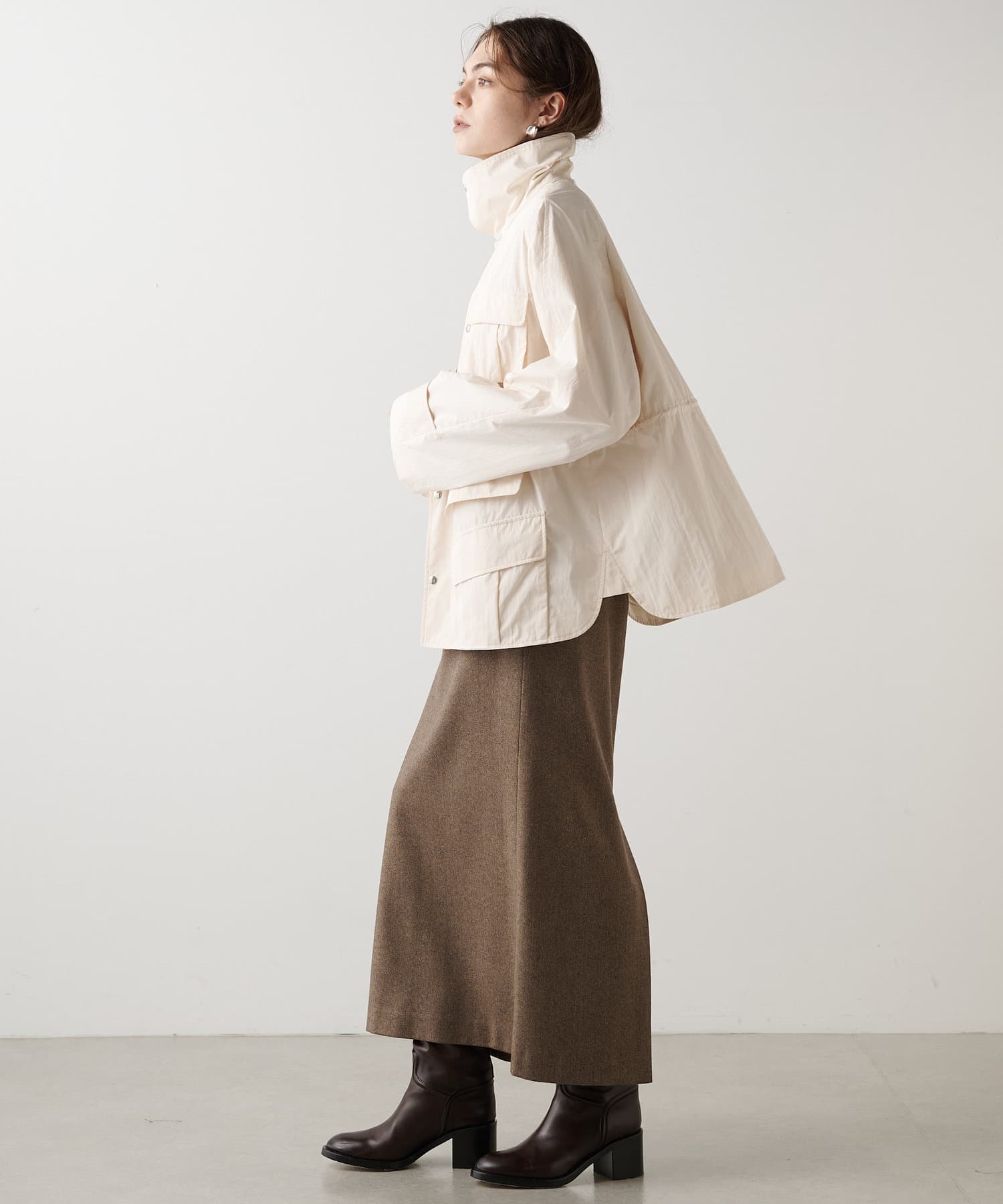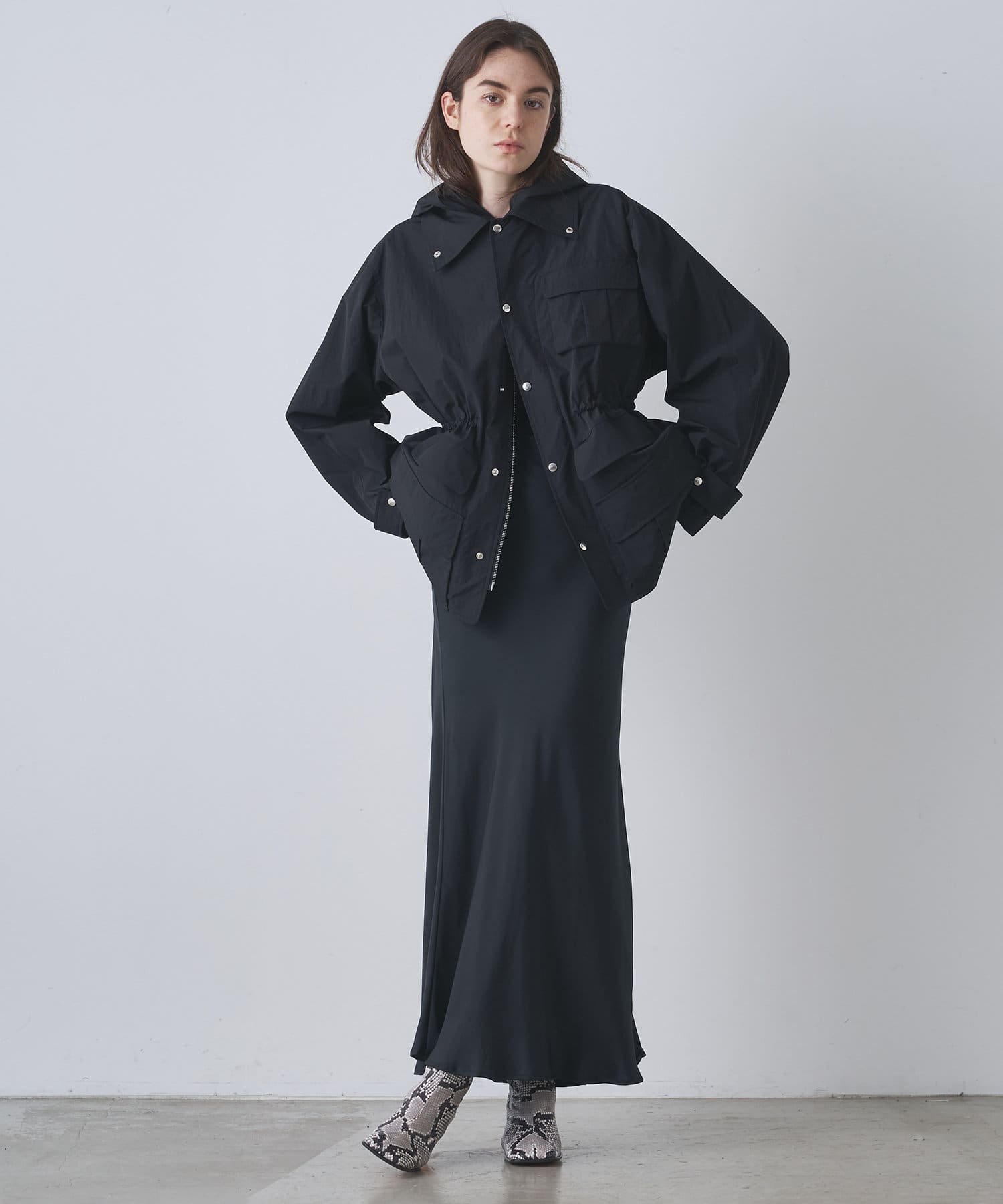 雨の日も使える軽い素材のショートコート。フーディーは取り外して綺麗なスタイルに。