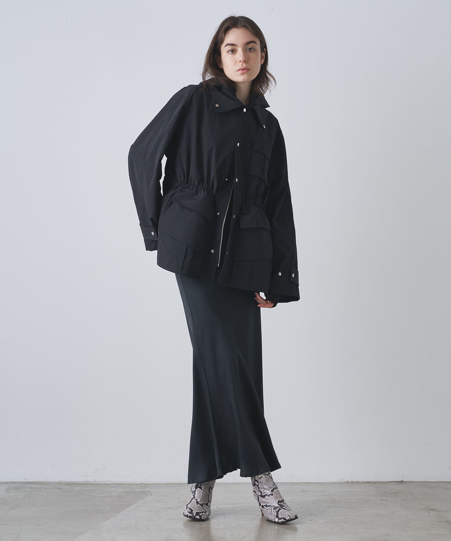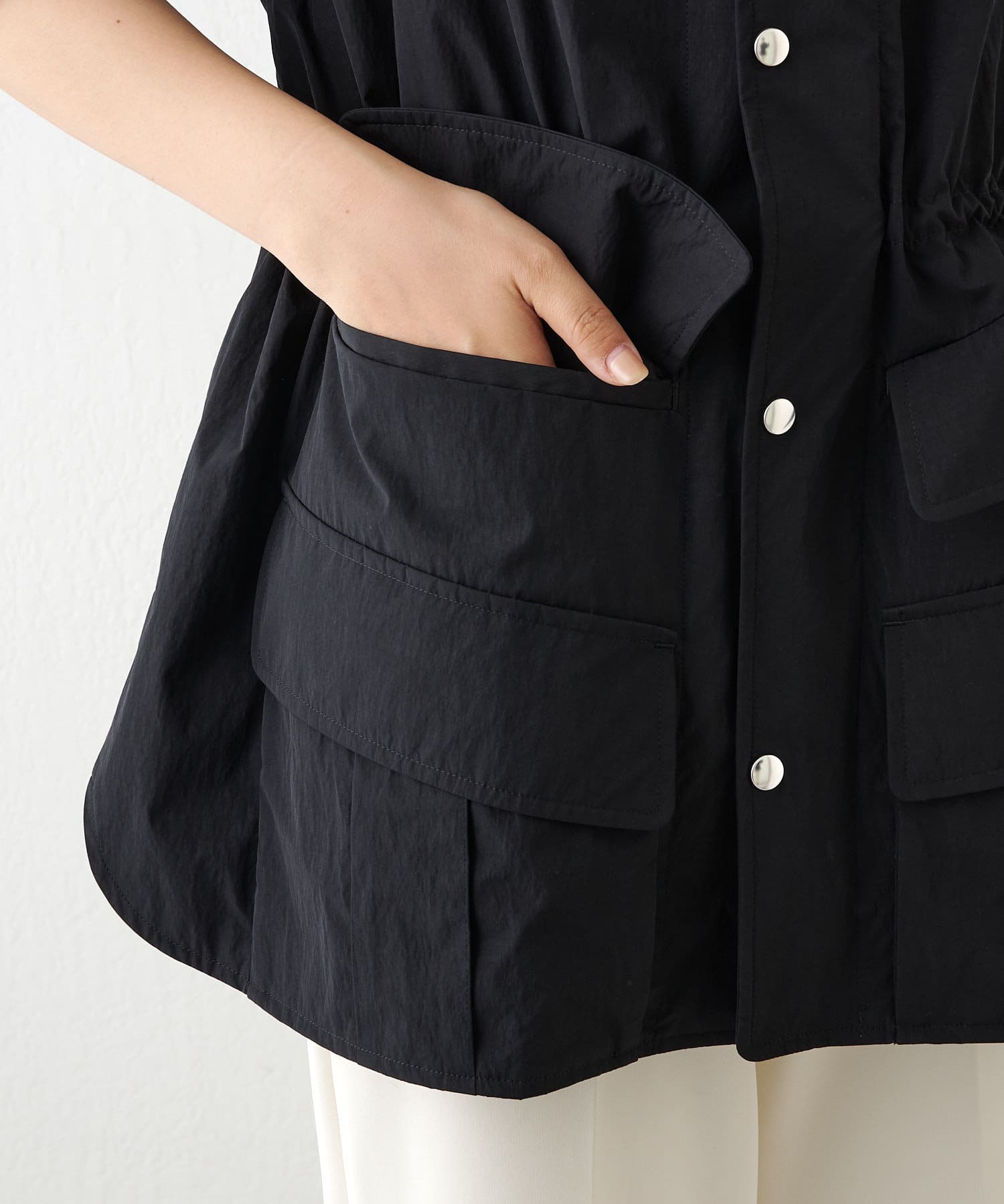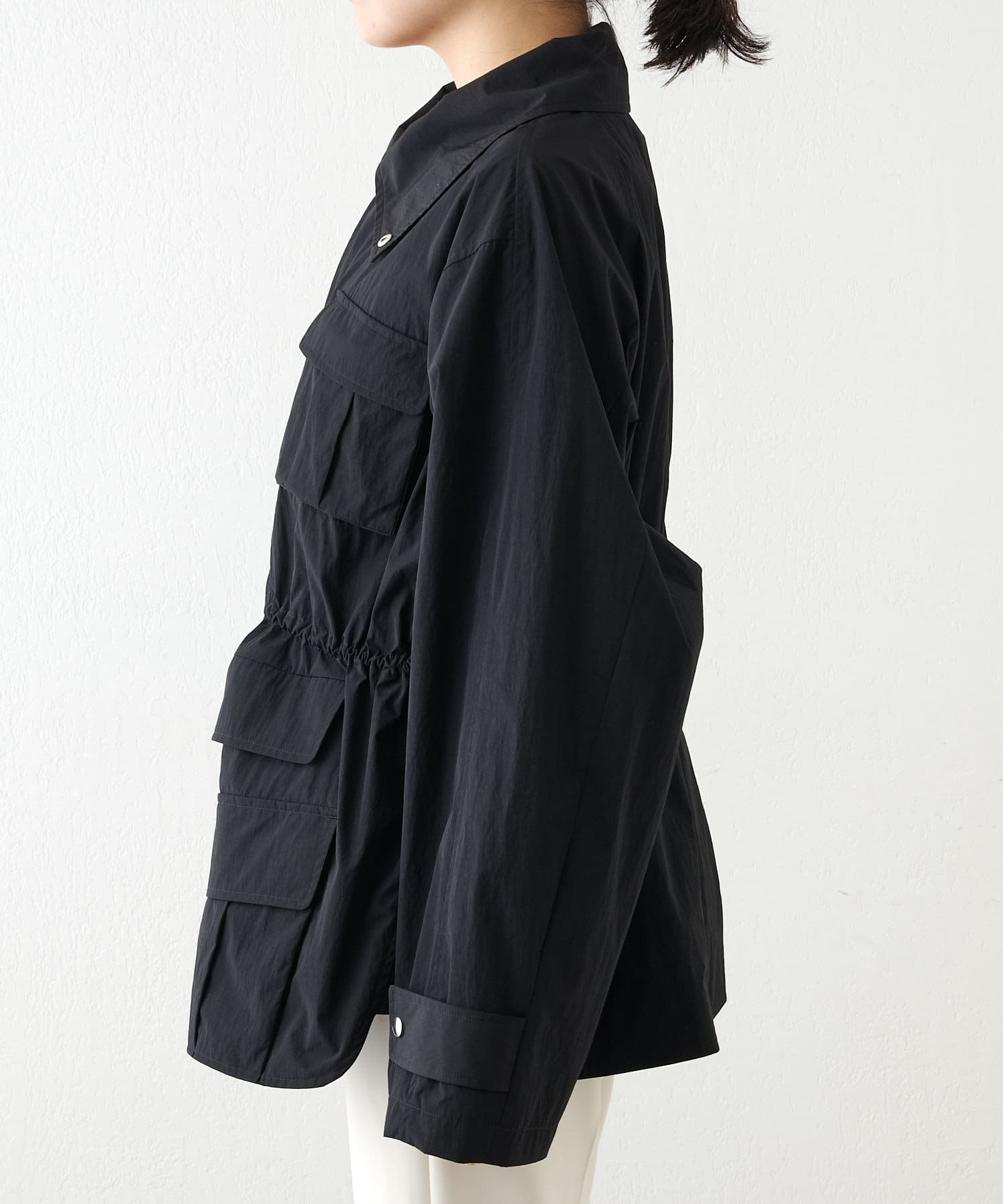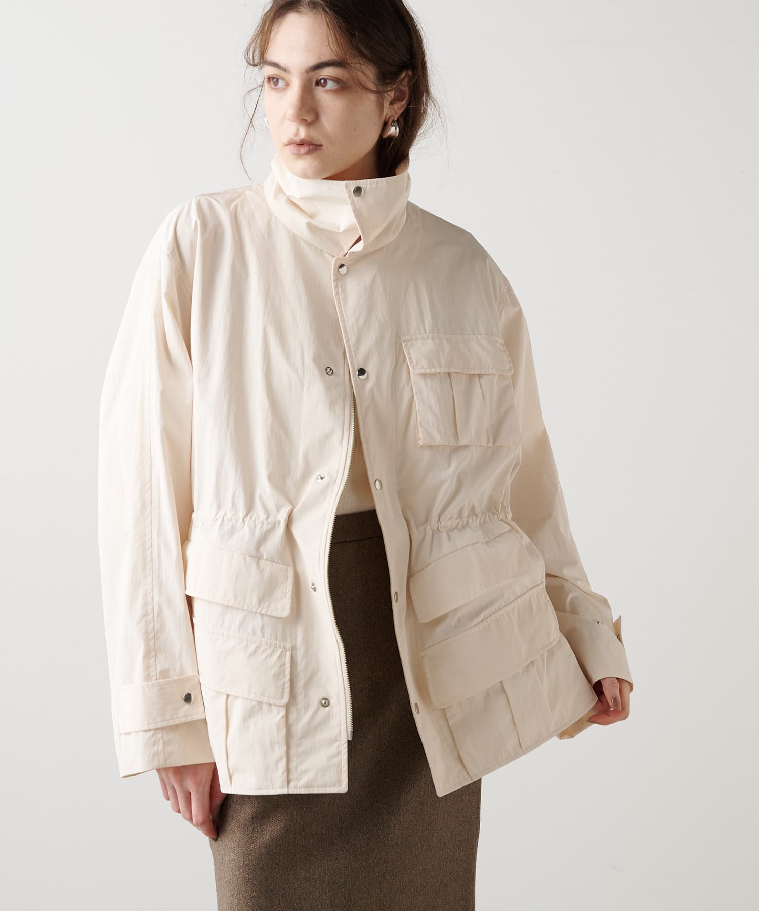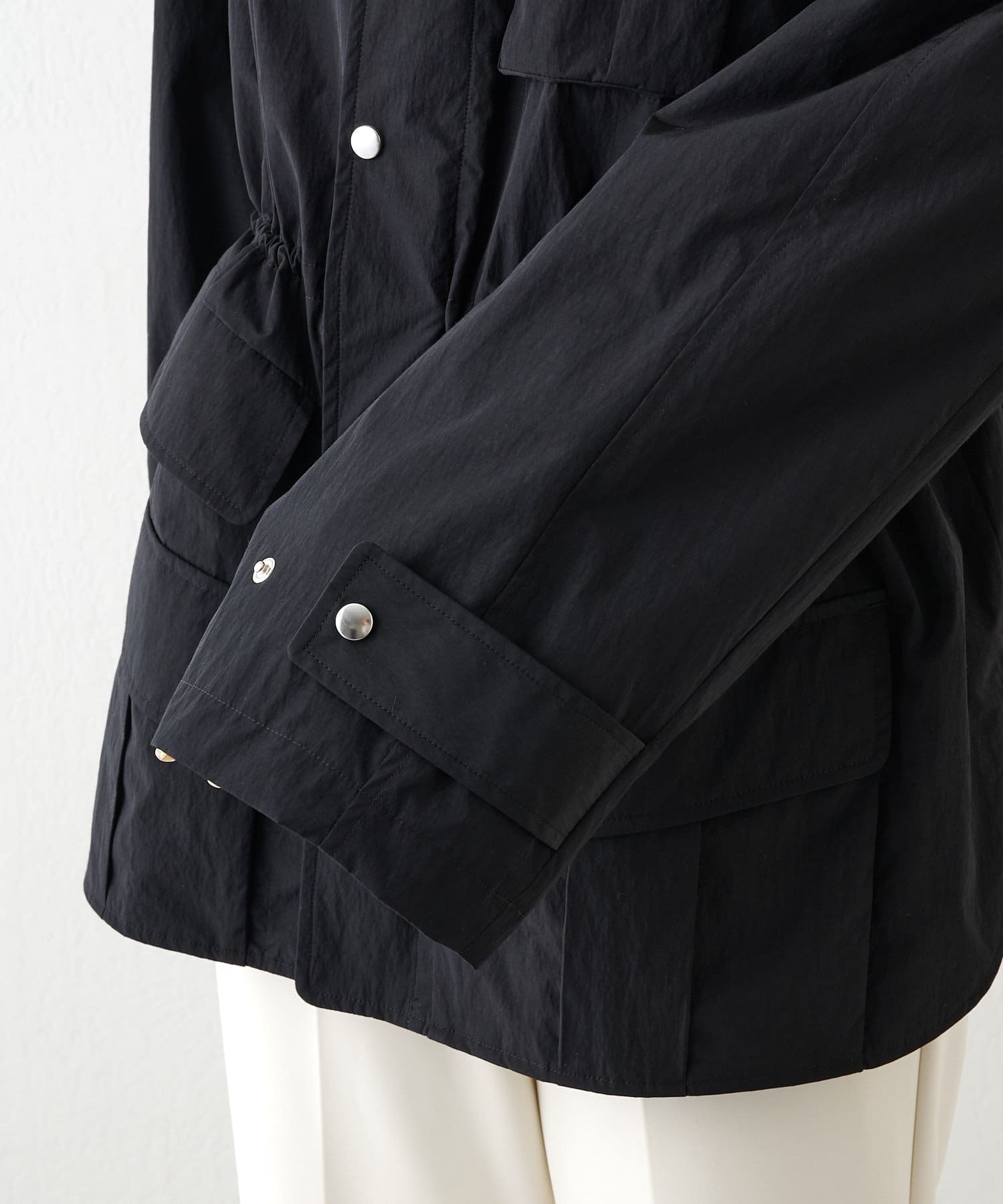 ■スポーティなアイテムながら、ウエスト内側のドローコードでギャザーを絞れば女性らしい印象に。
