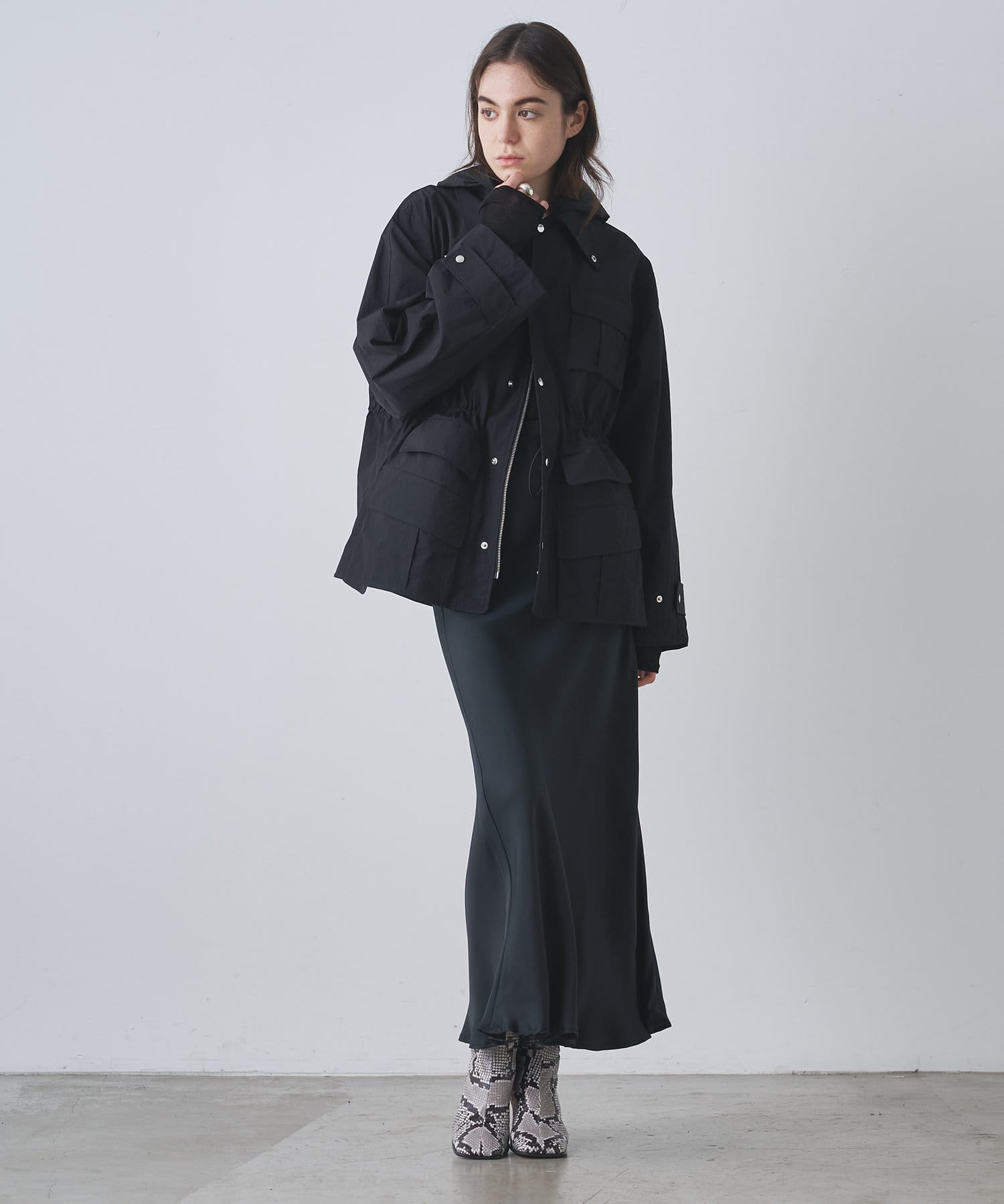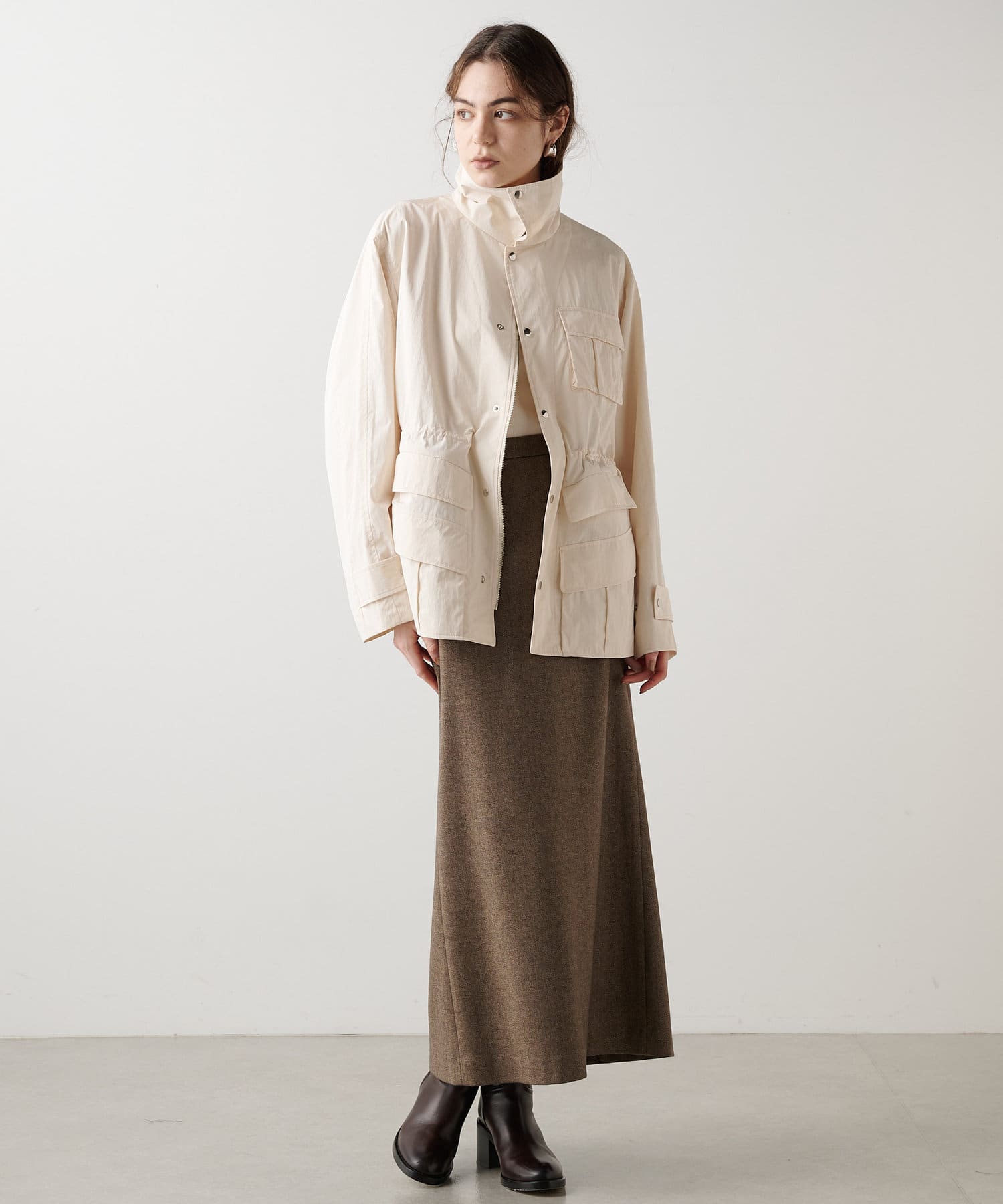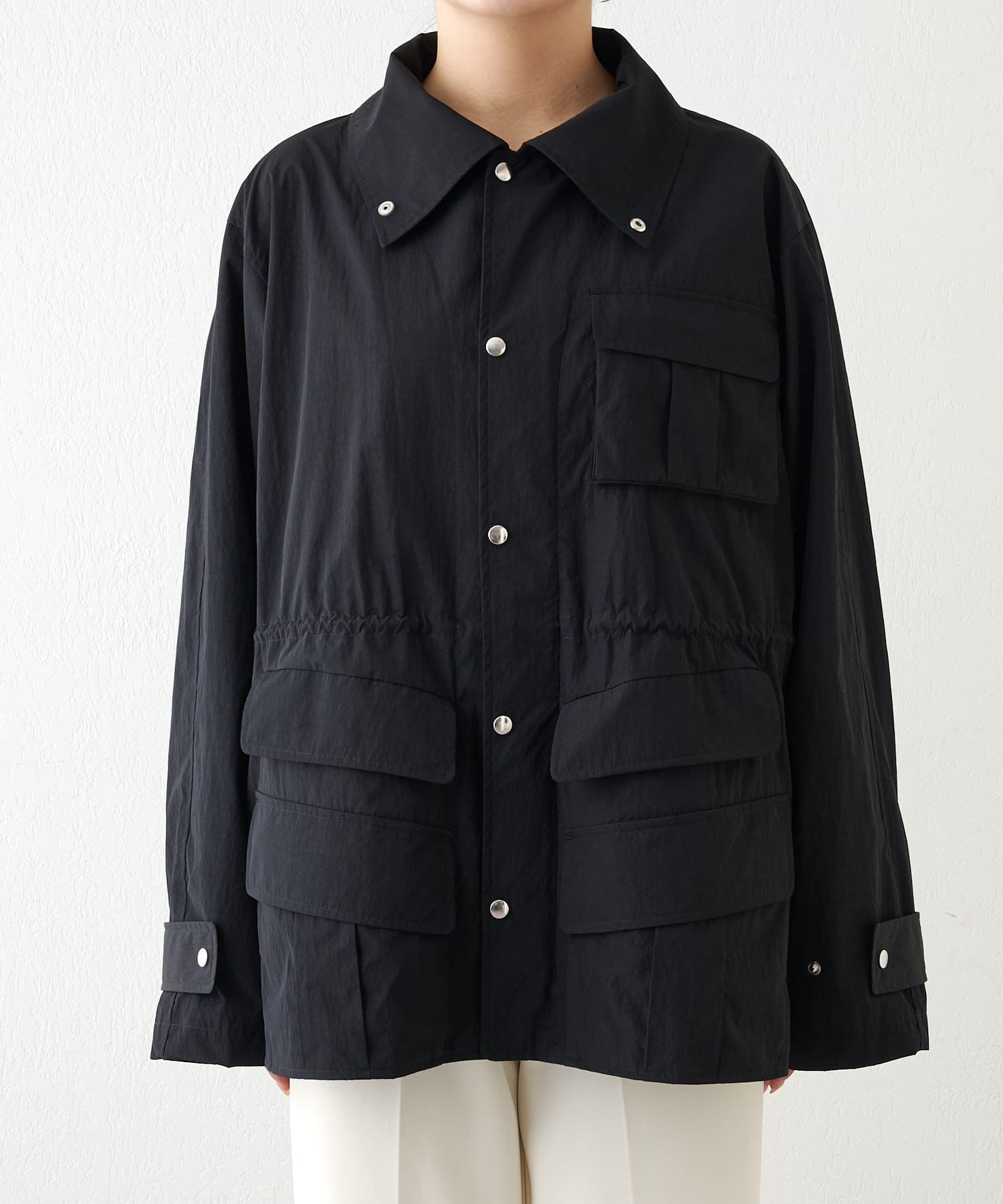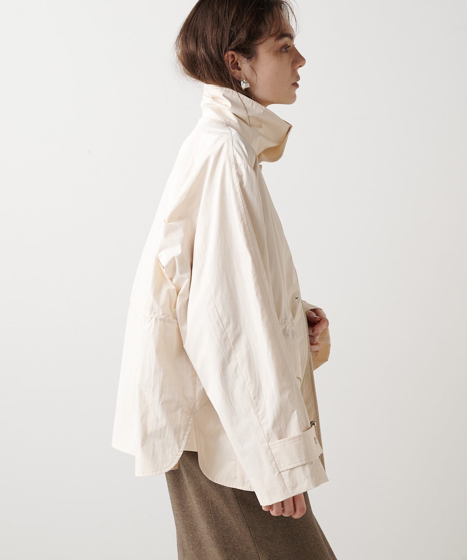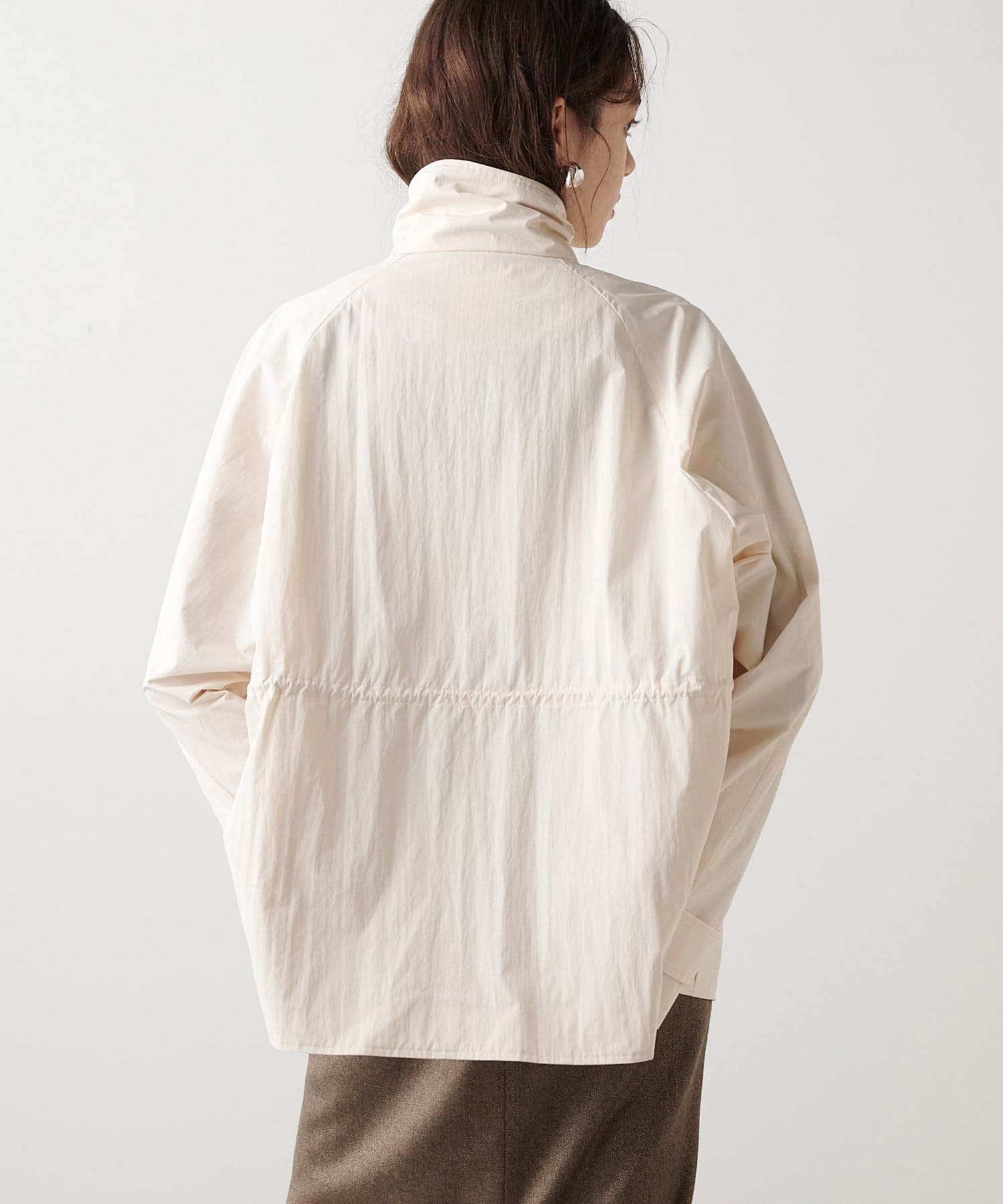 カジュアル素材を大人っぽく落とし込んだタフタブルゾン
