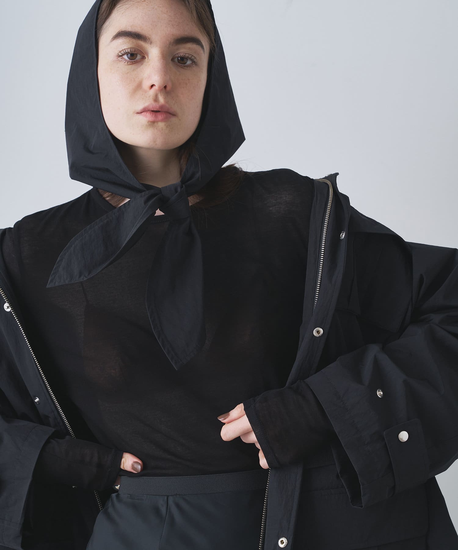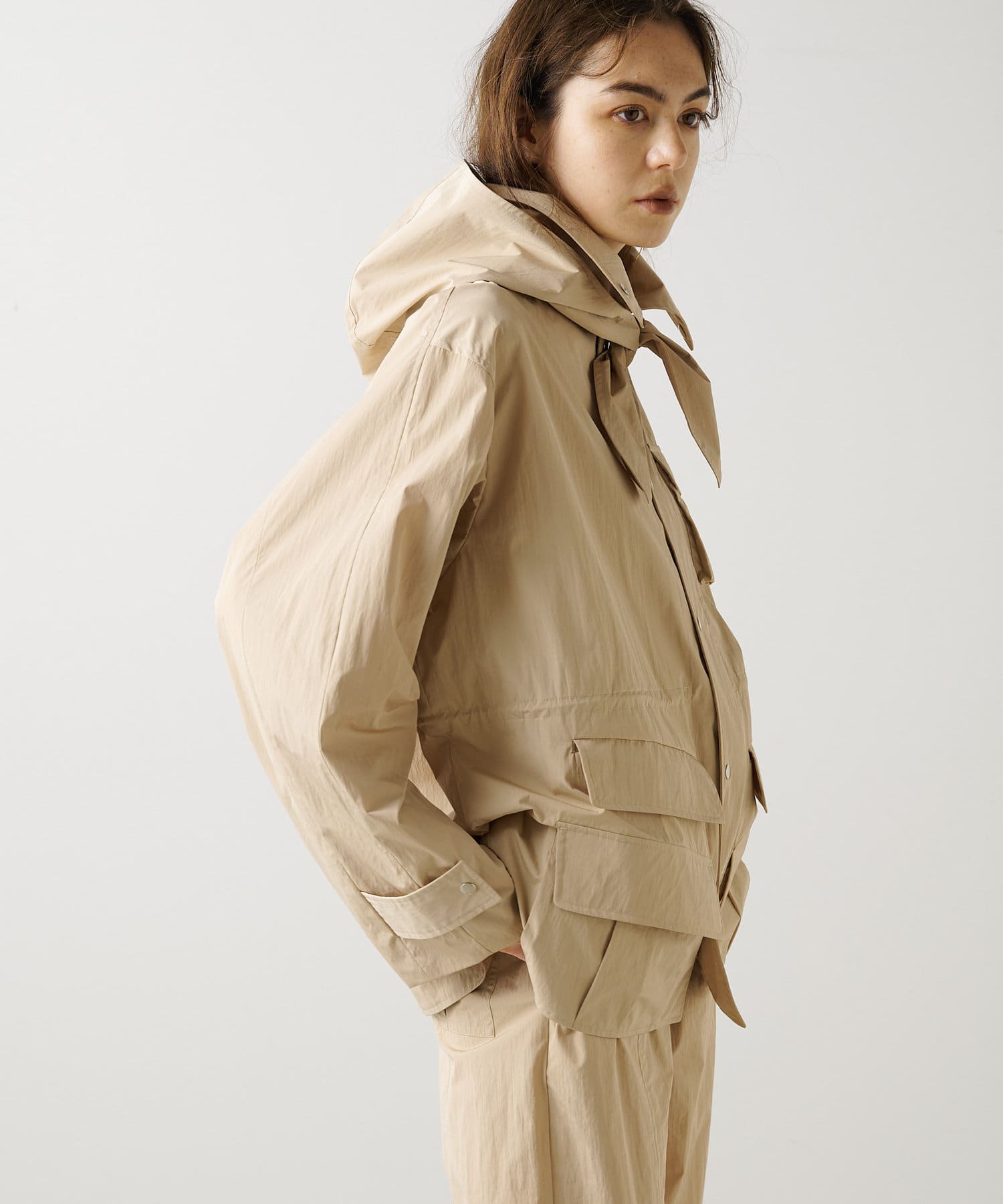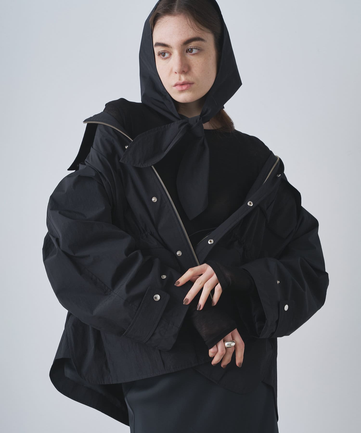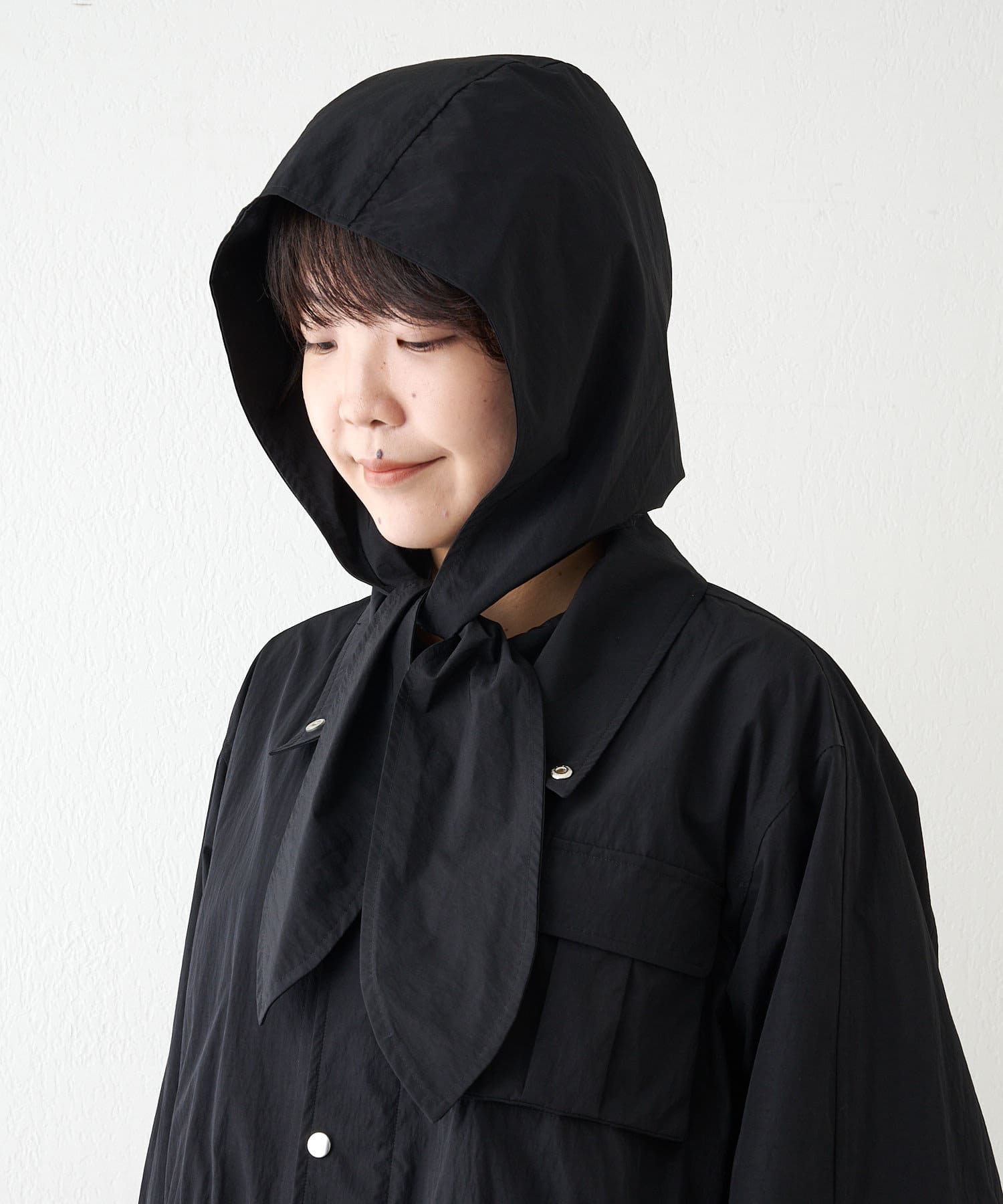 ■同素材のフードはあえて別付けにし、スカーフのようなデザインが大人見えする一着。