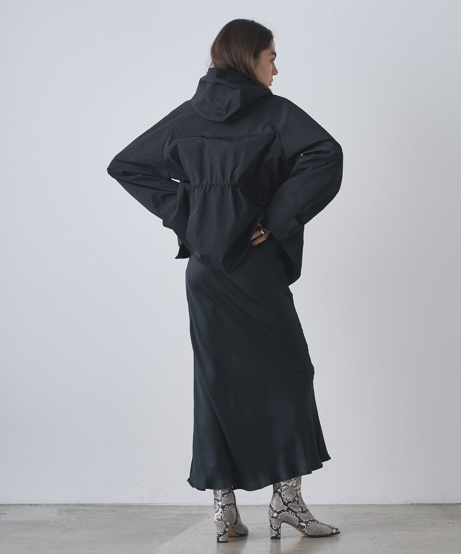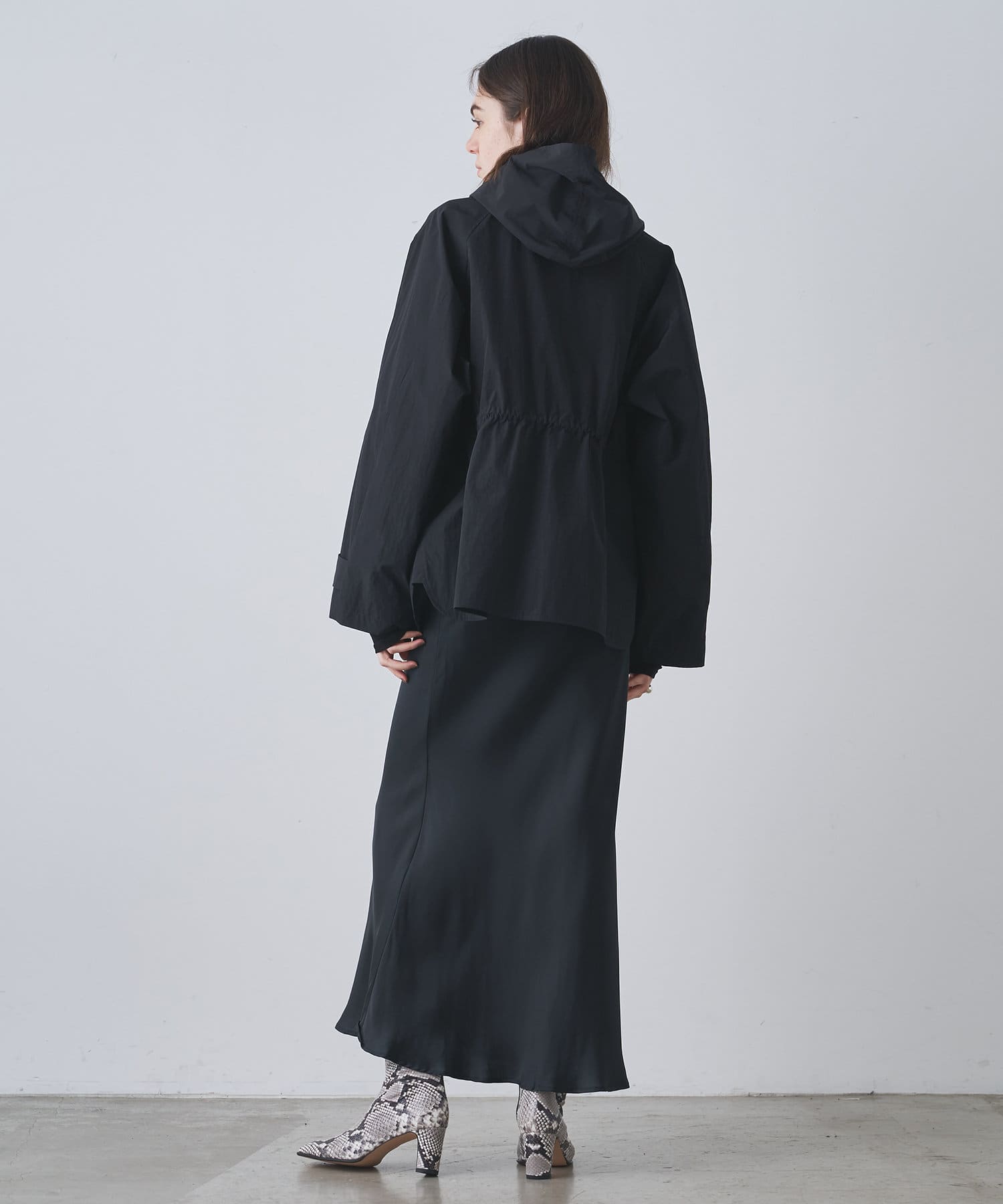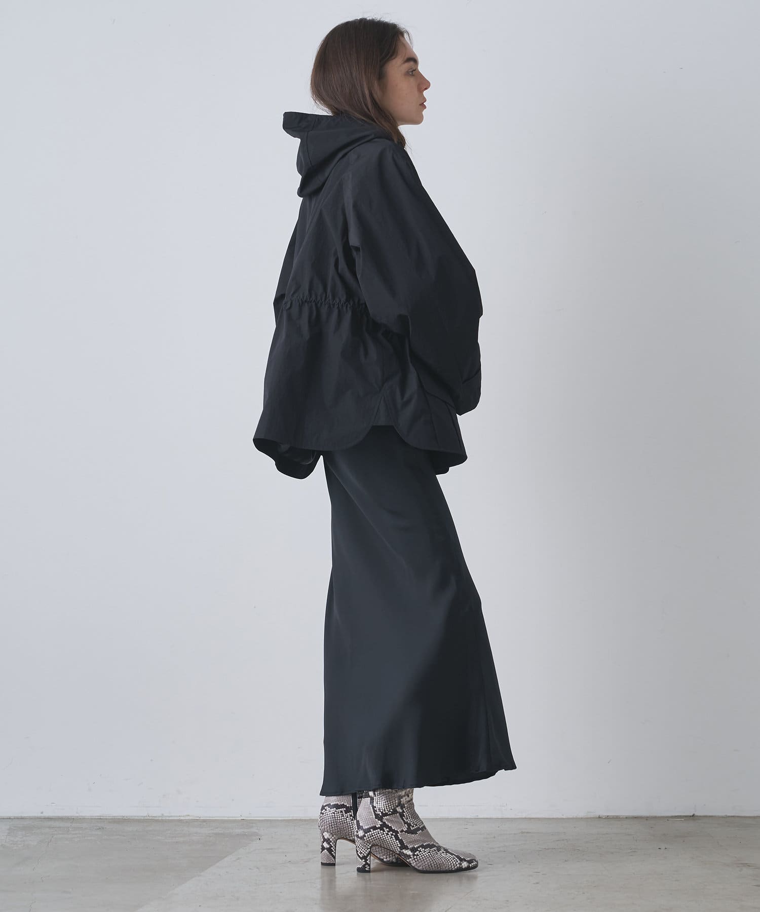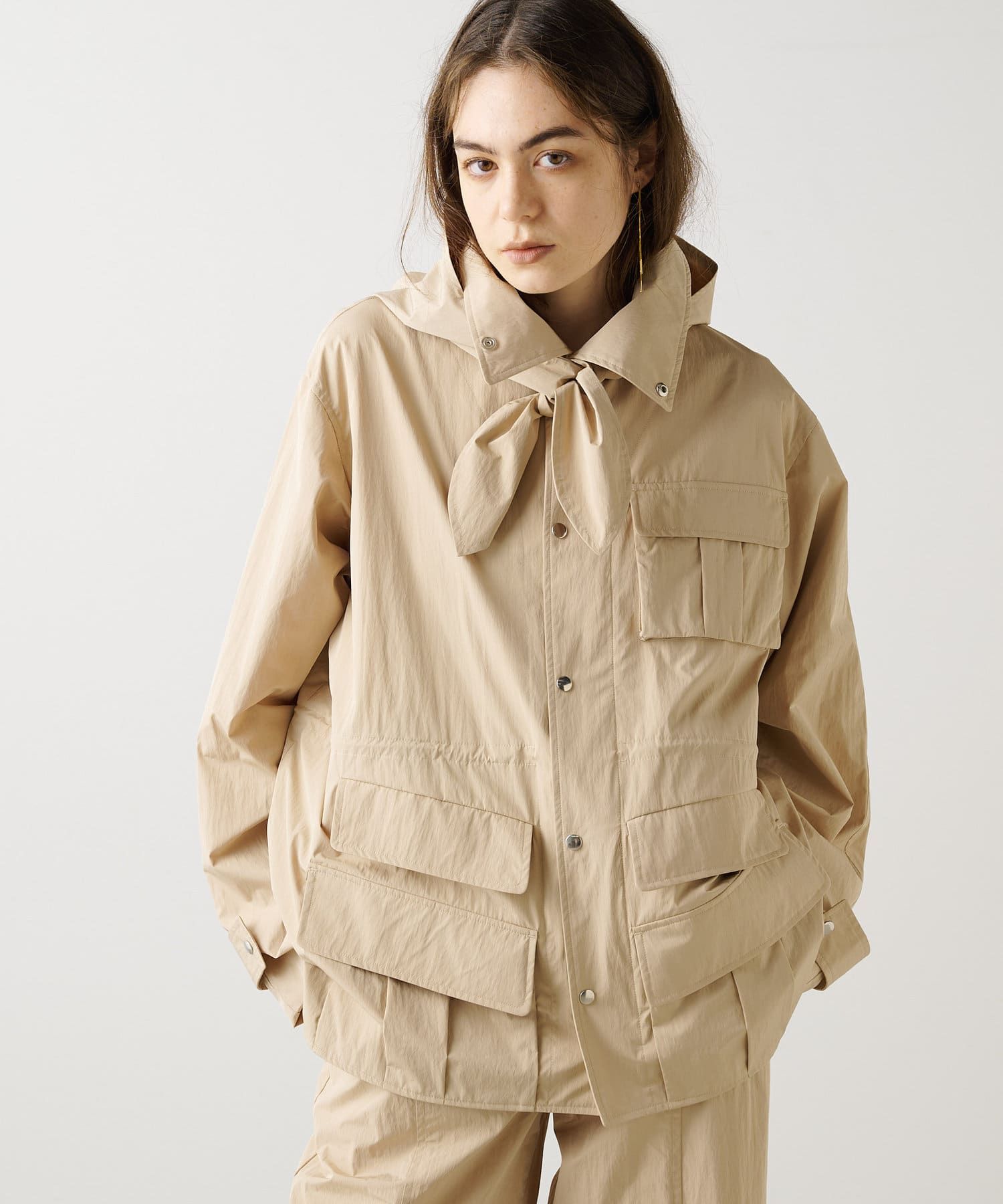 ■同素材のフードはあえて別付けにし、スカーフのようなデザインが大人見えする一着。