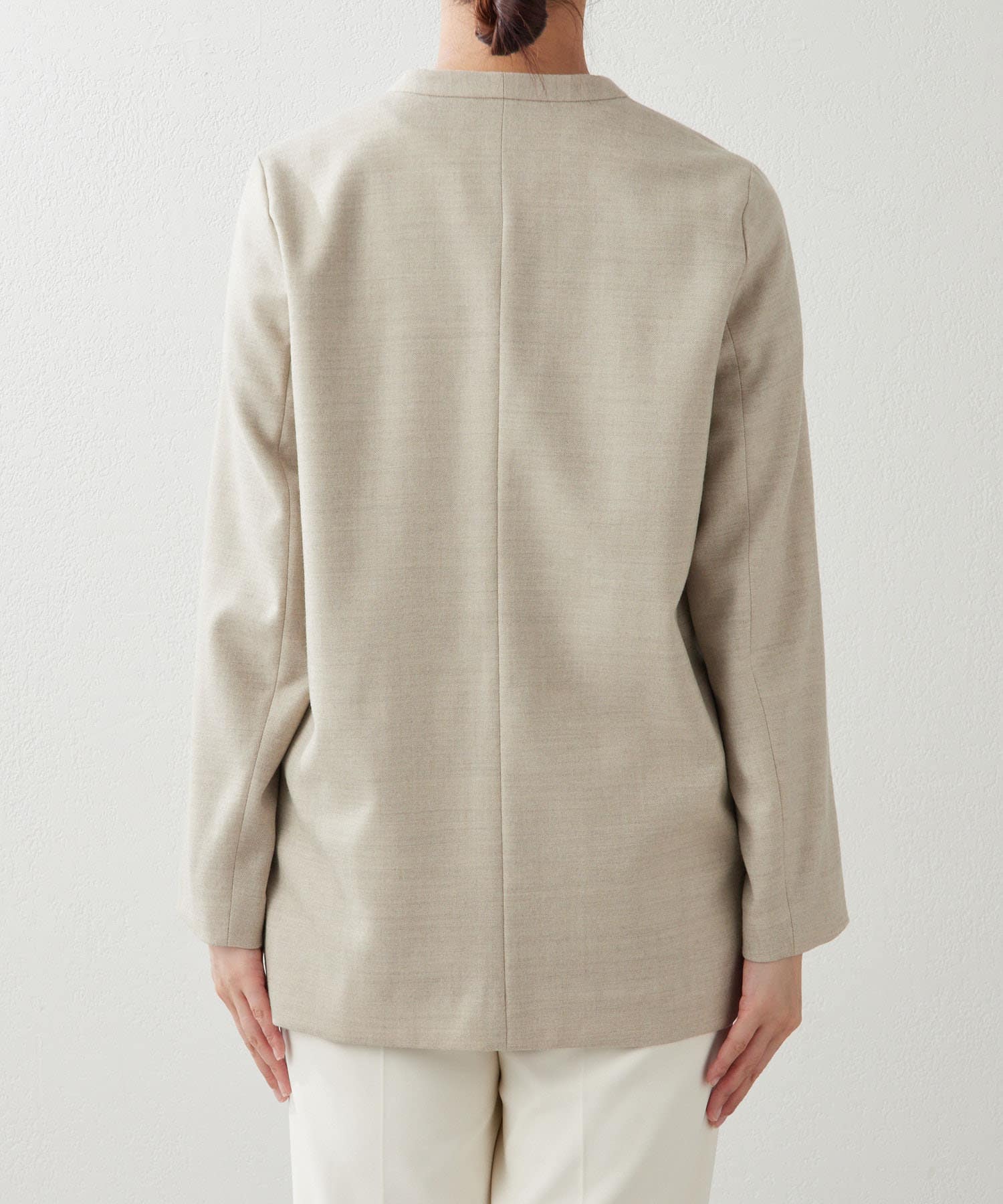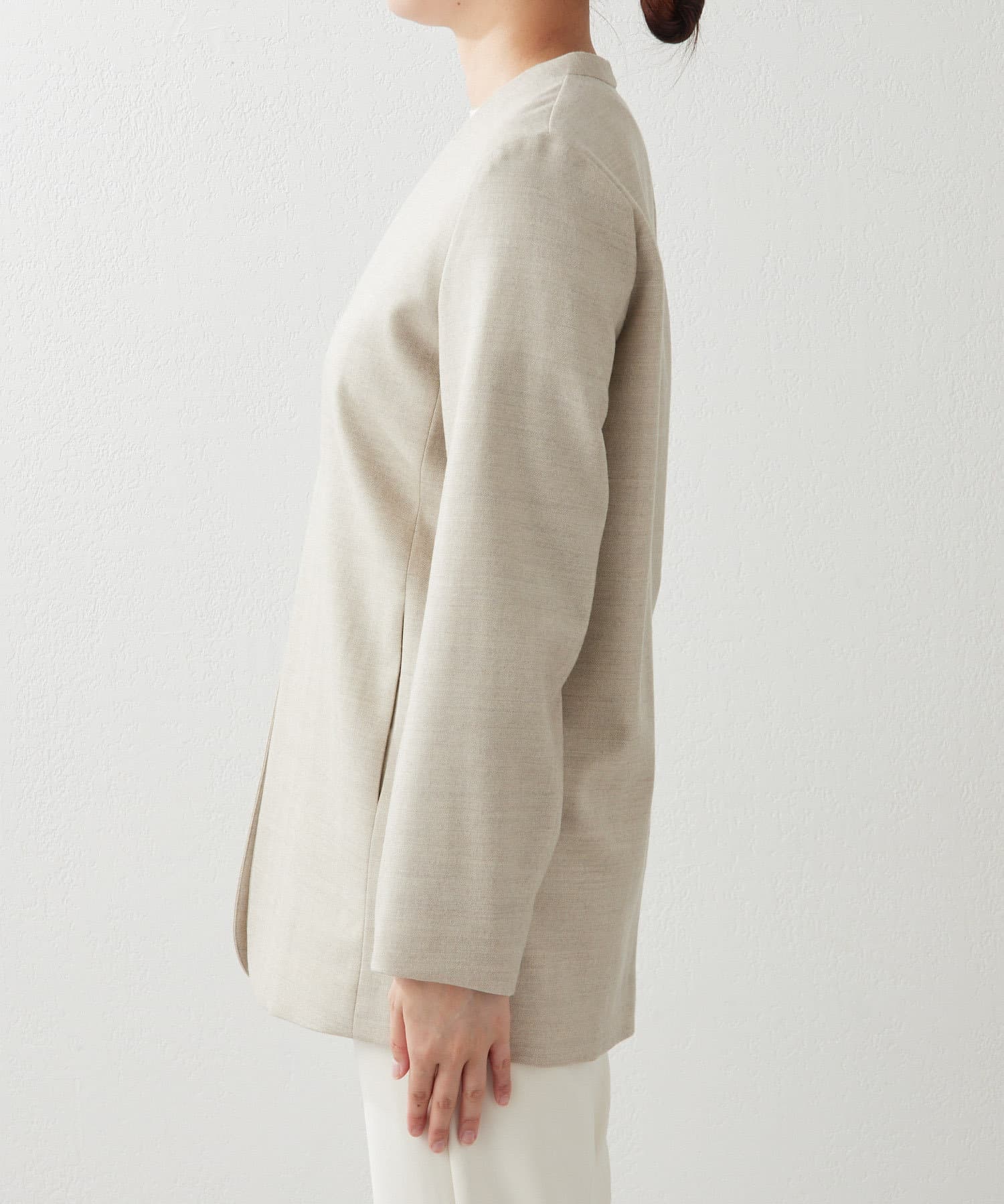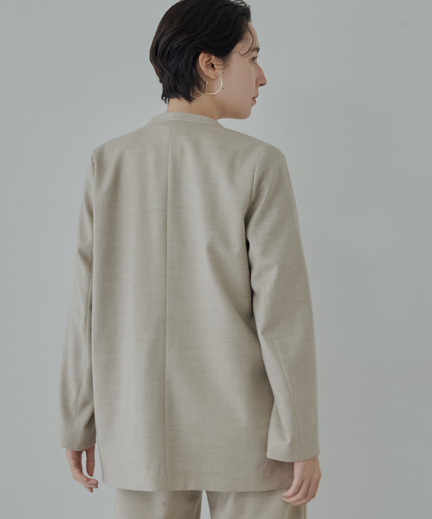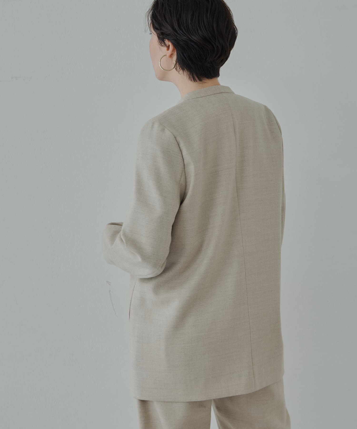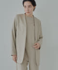 ■ノーカラーですっきりと仕上げたノーカラージャケット。