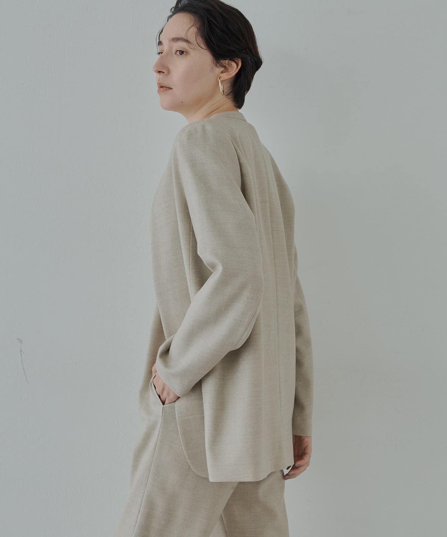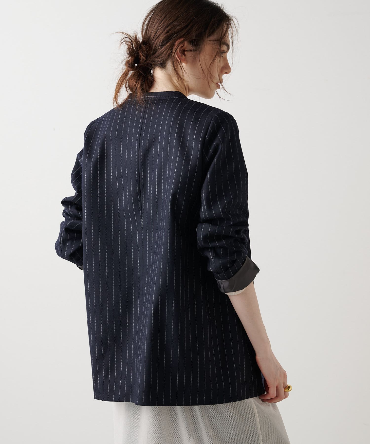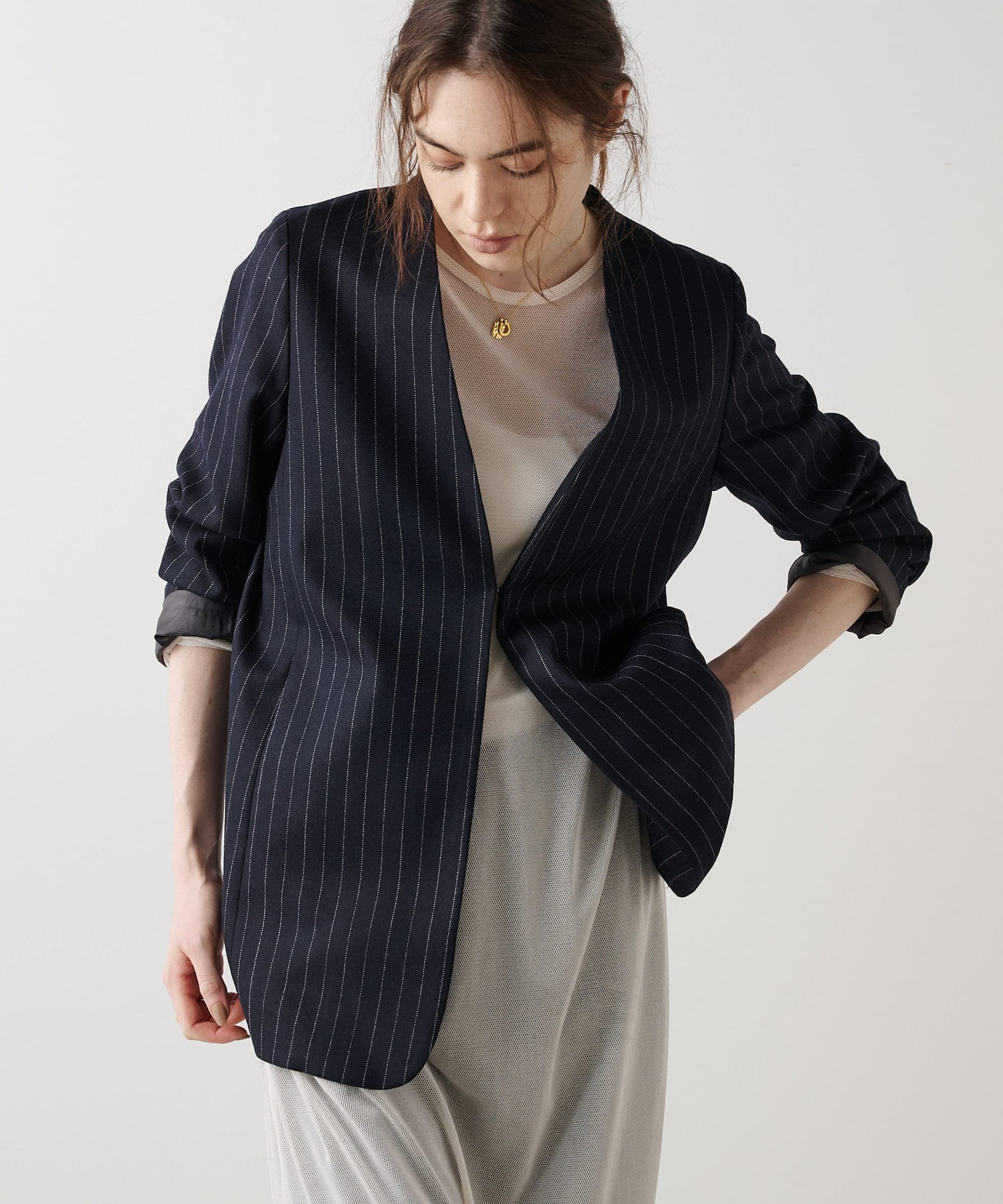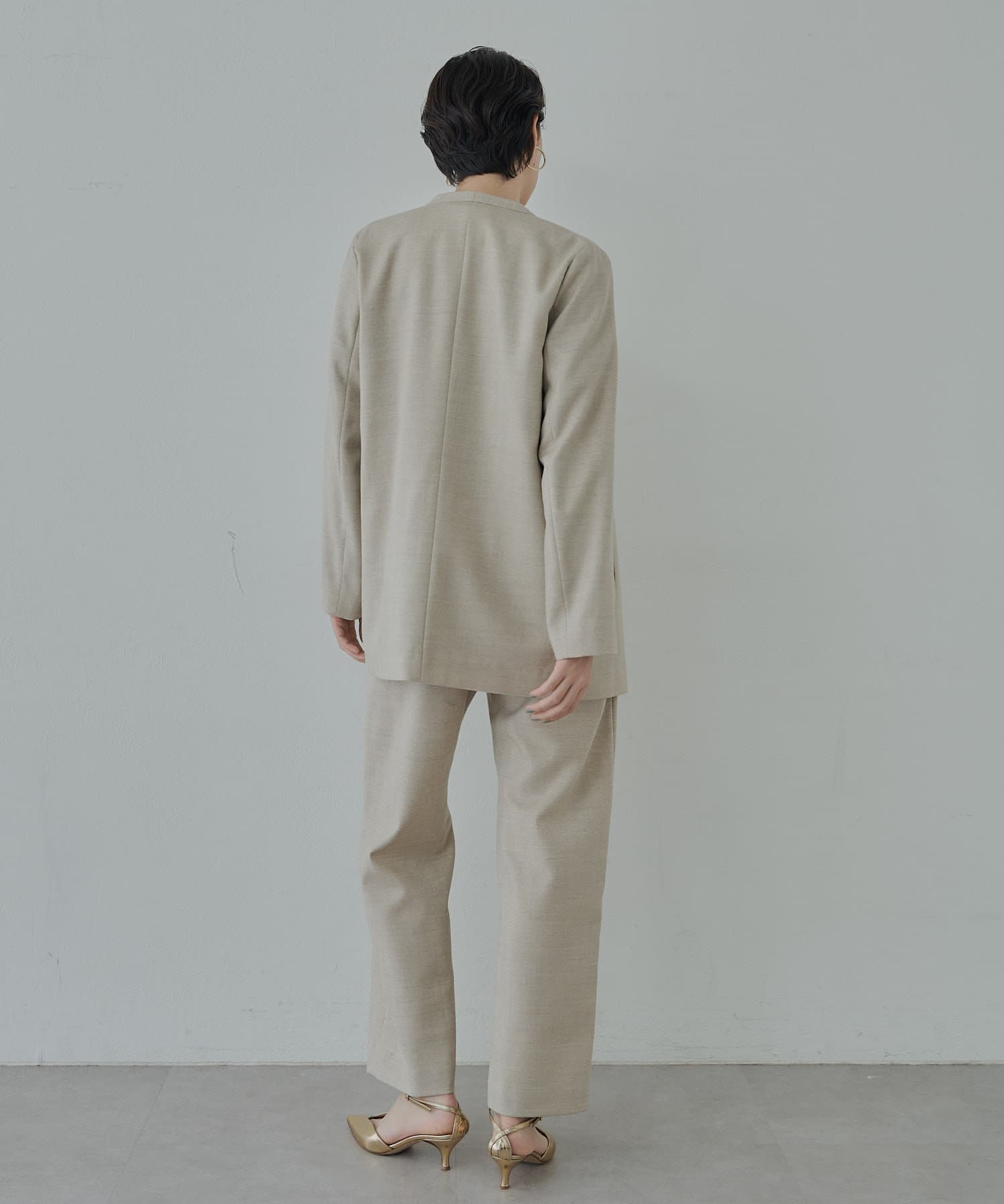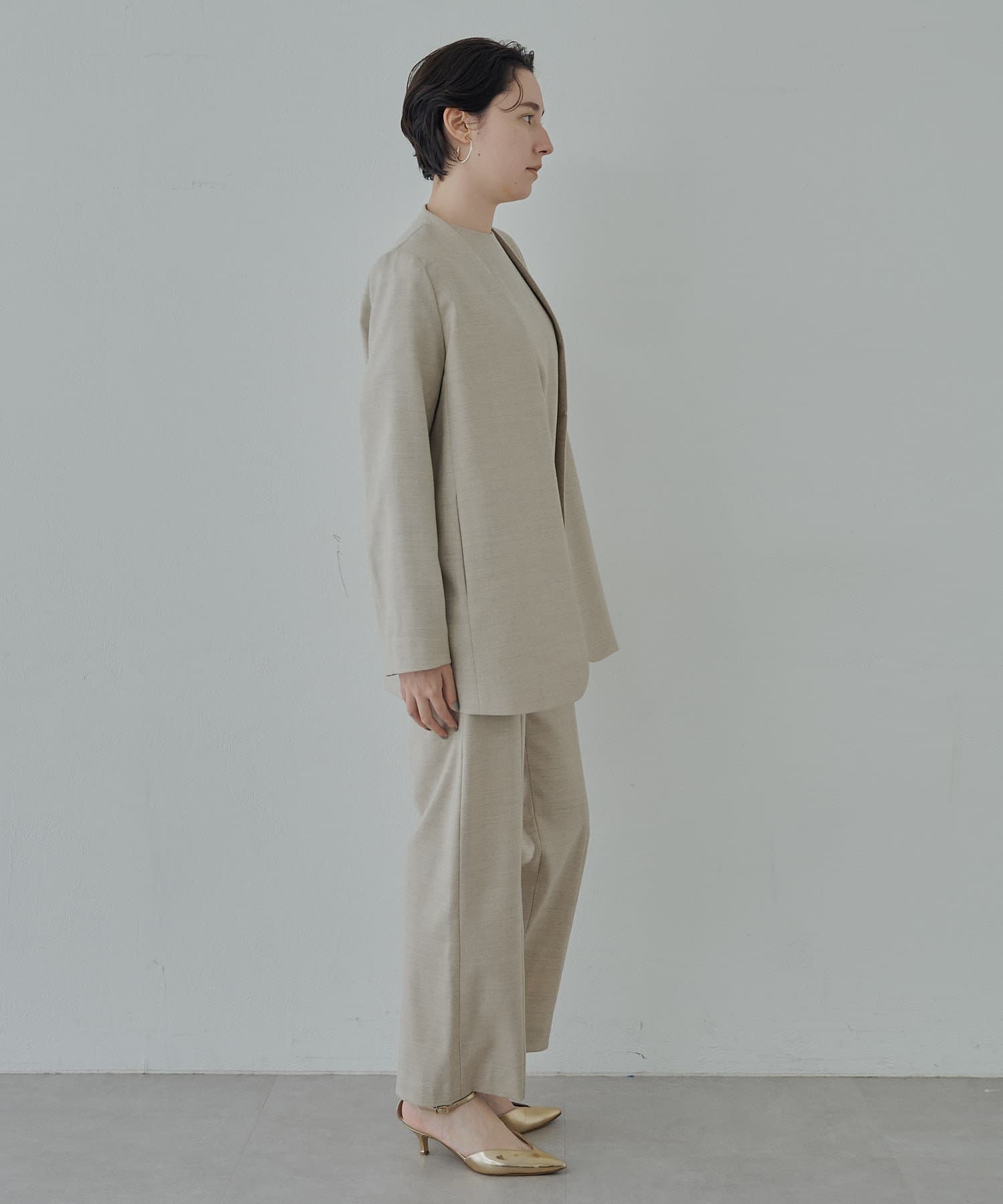 ■ノーカラーですっきりと仕上げたノーカラージャケット。