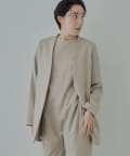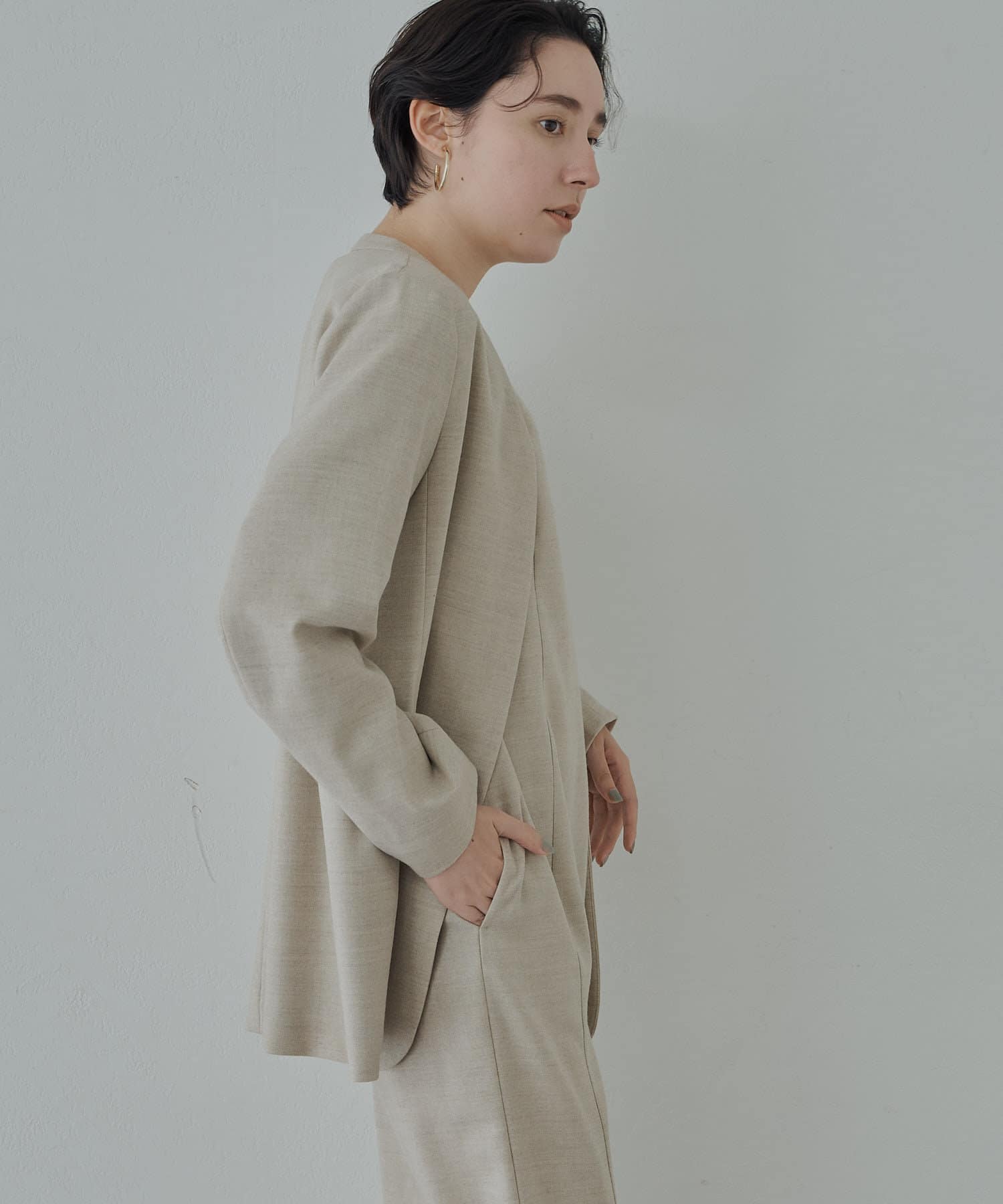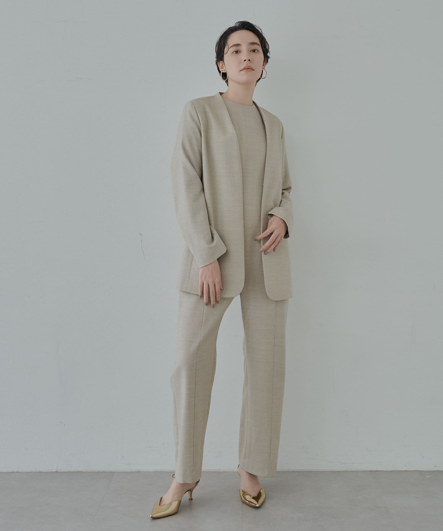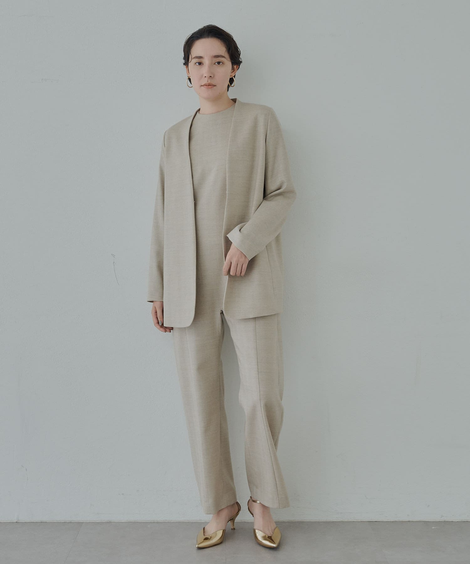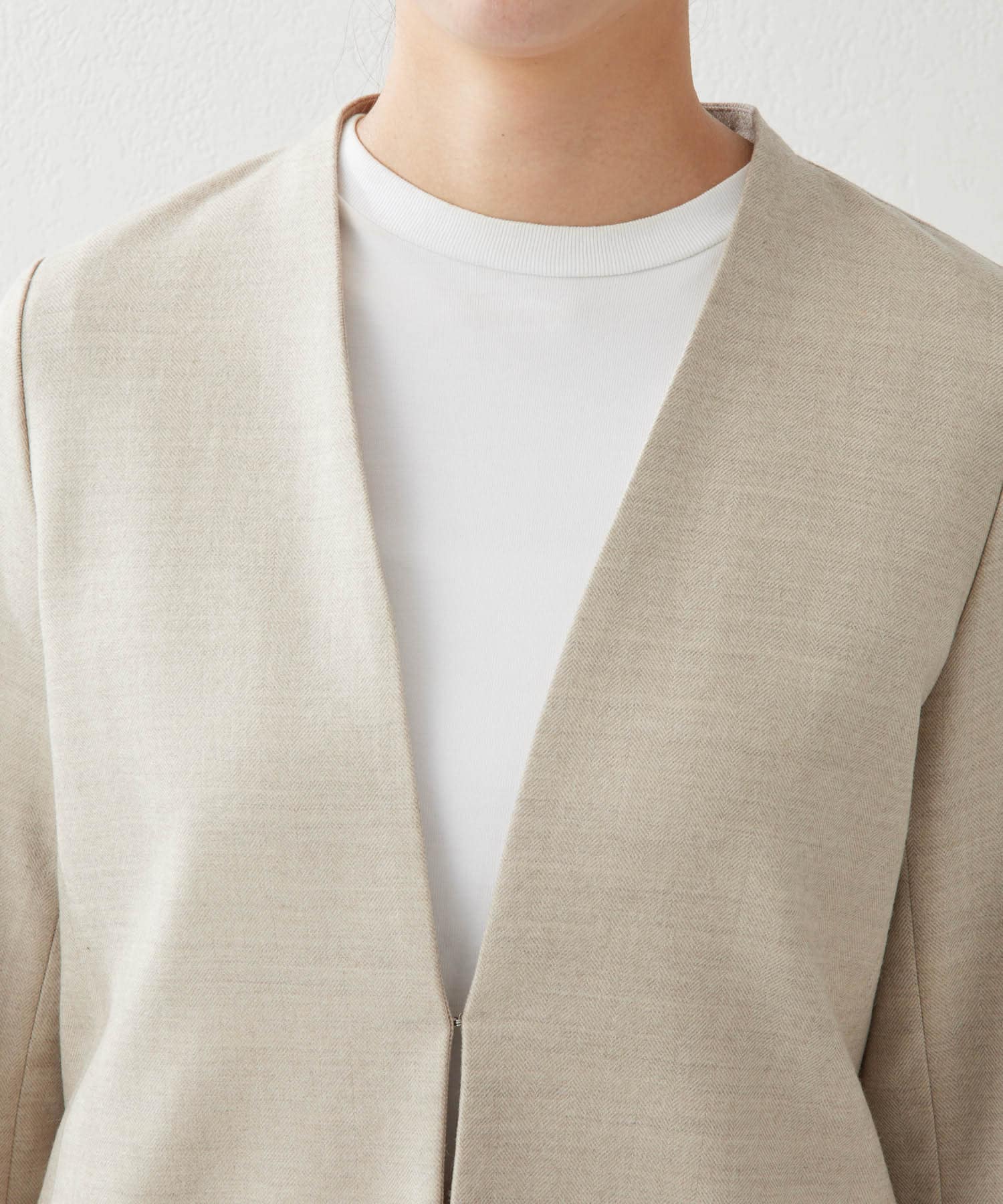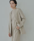 ■ノーカラーですっきりと仕上げたノーカラージャケット。