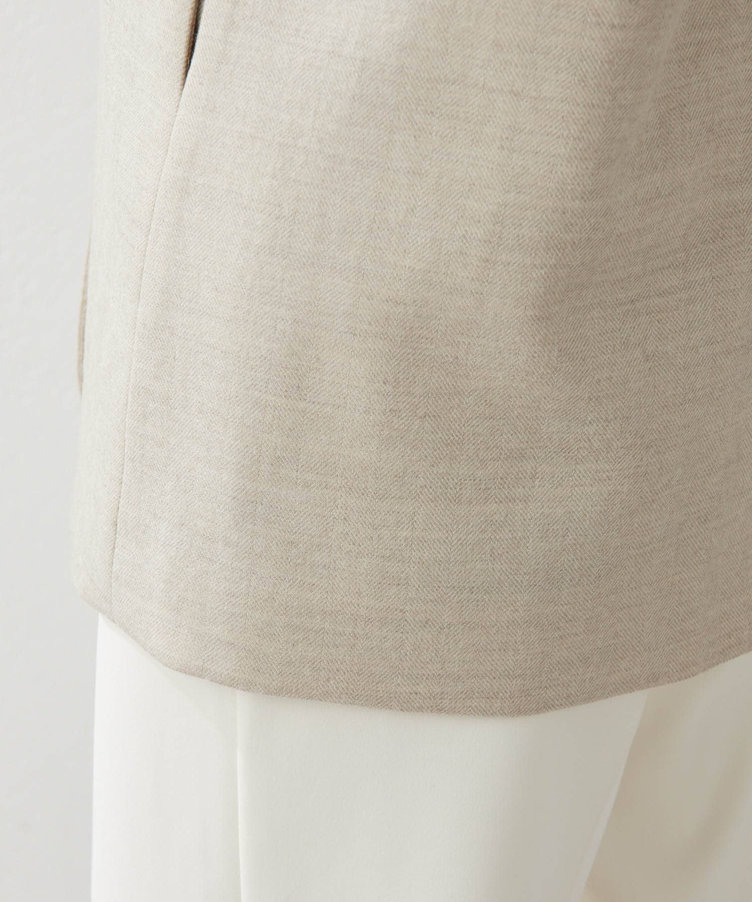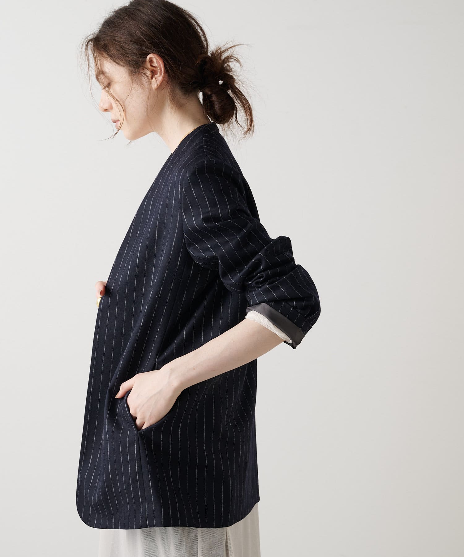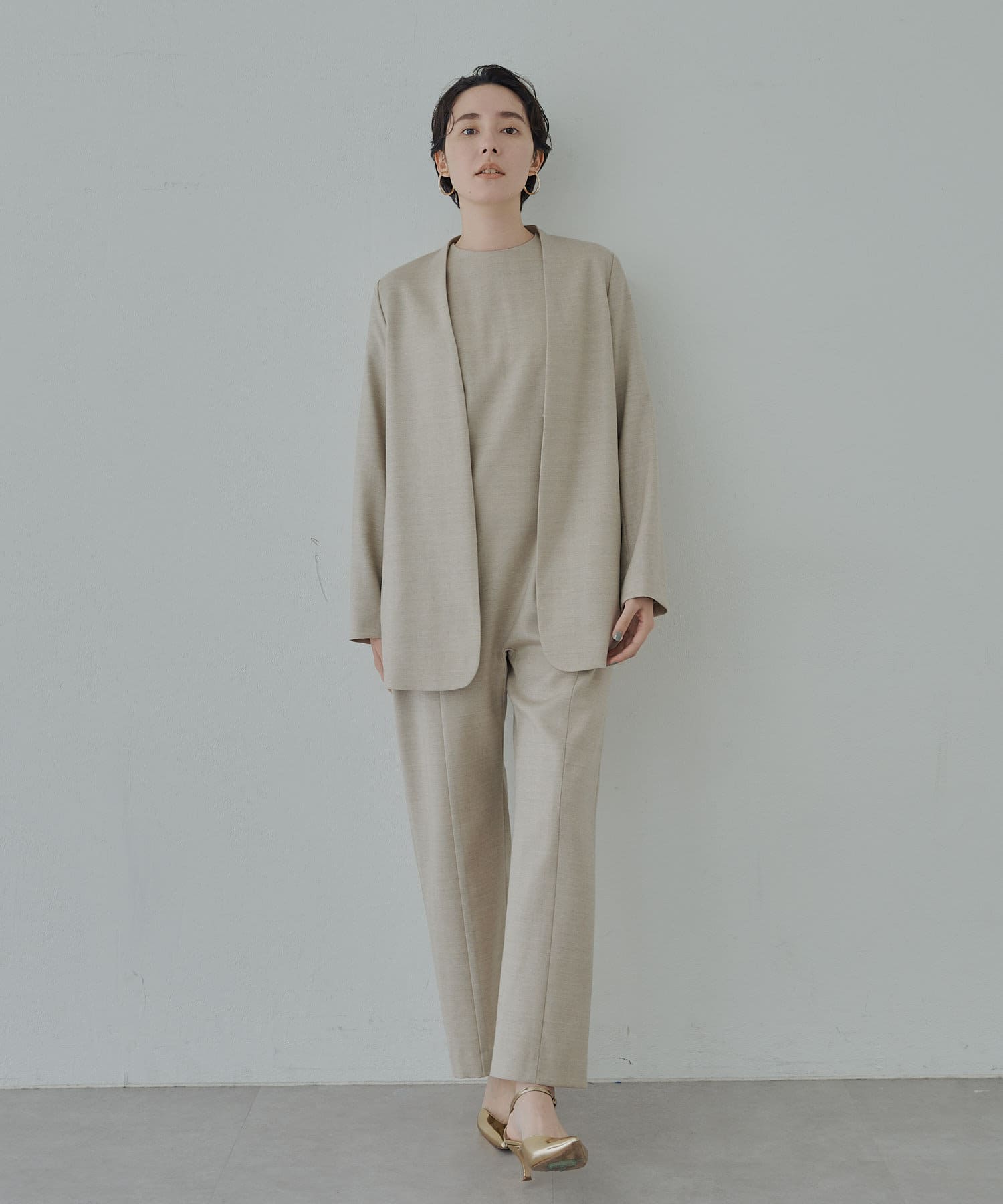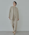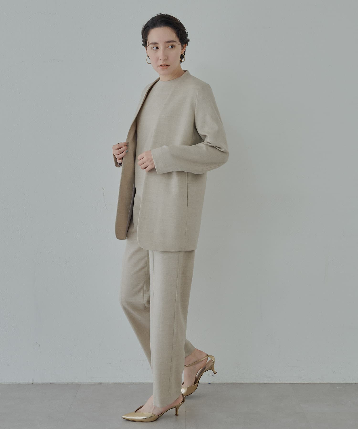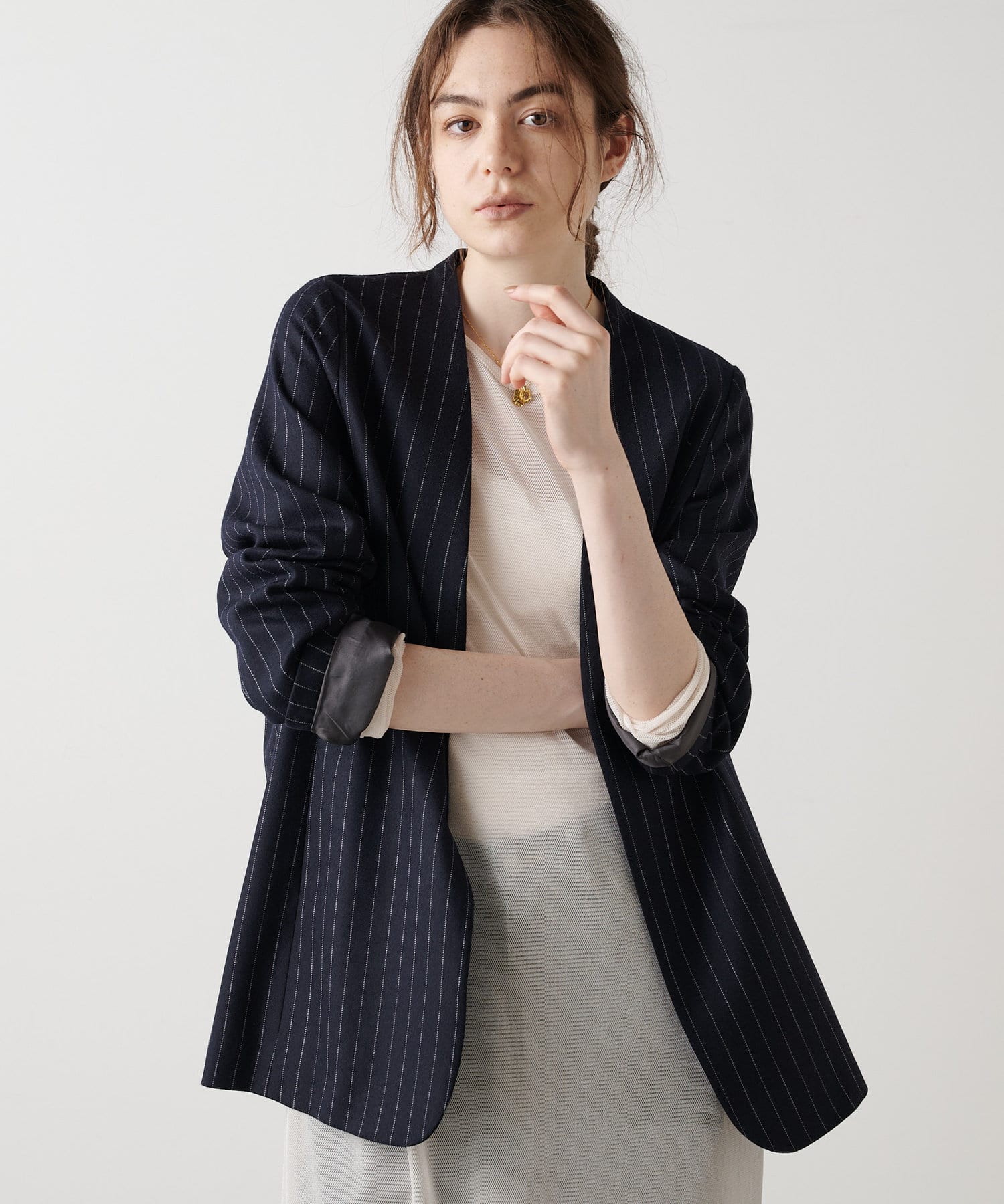 ■ノーカラーですっきりと仕上げたノーカラージャケット。
