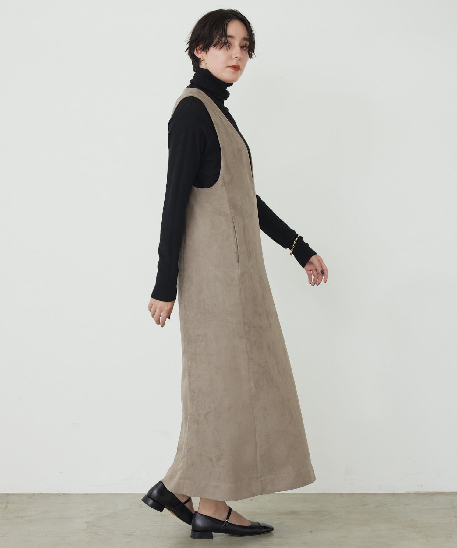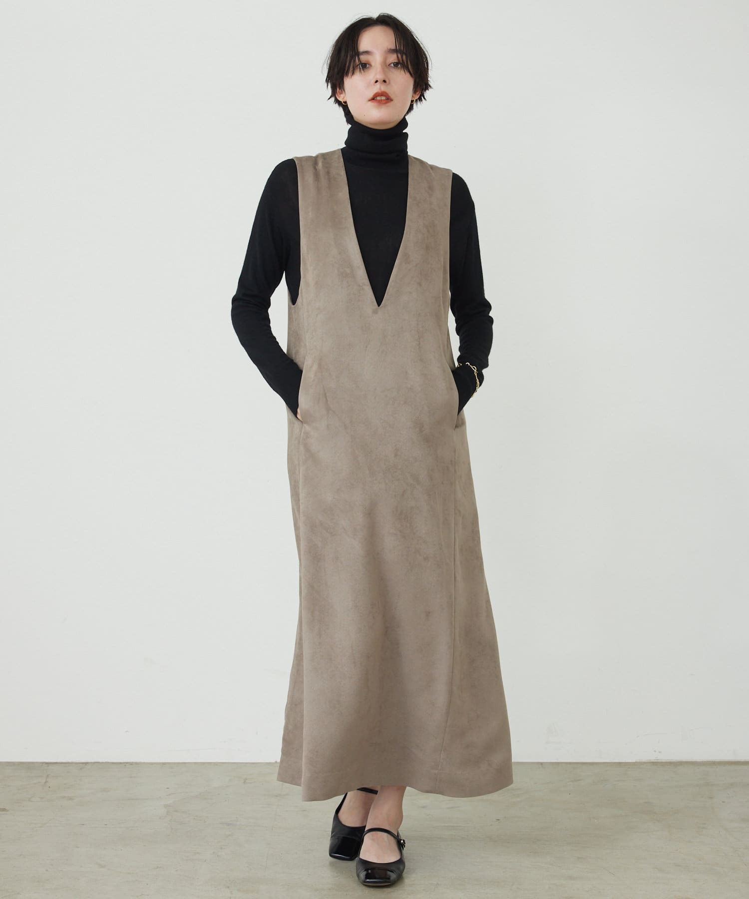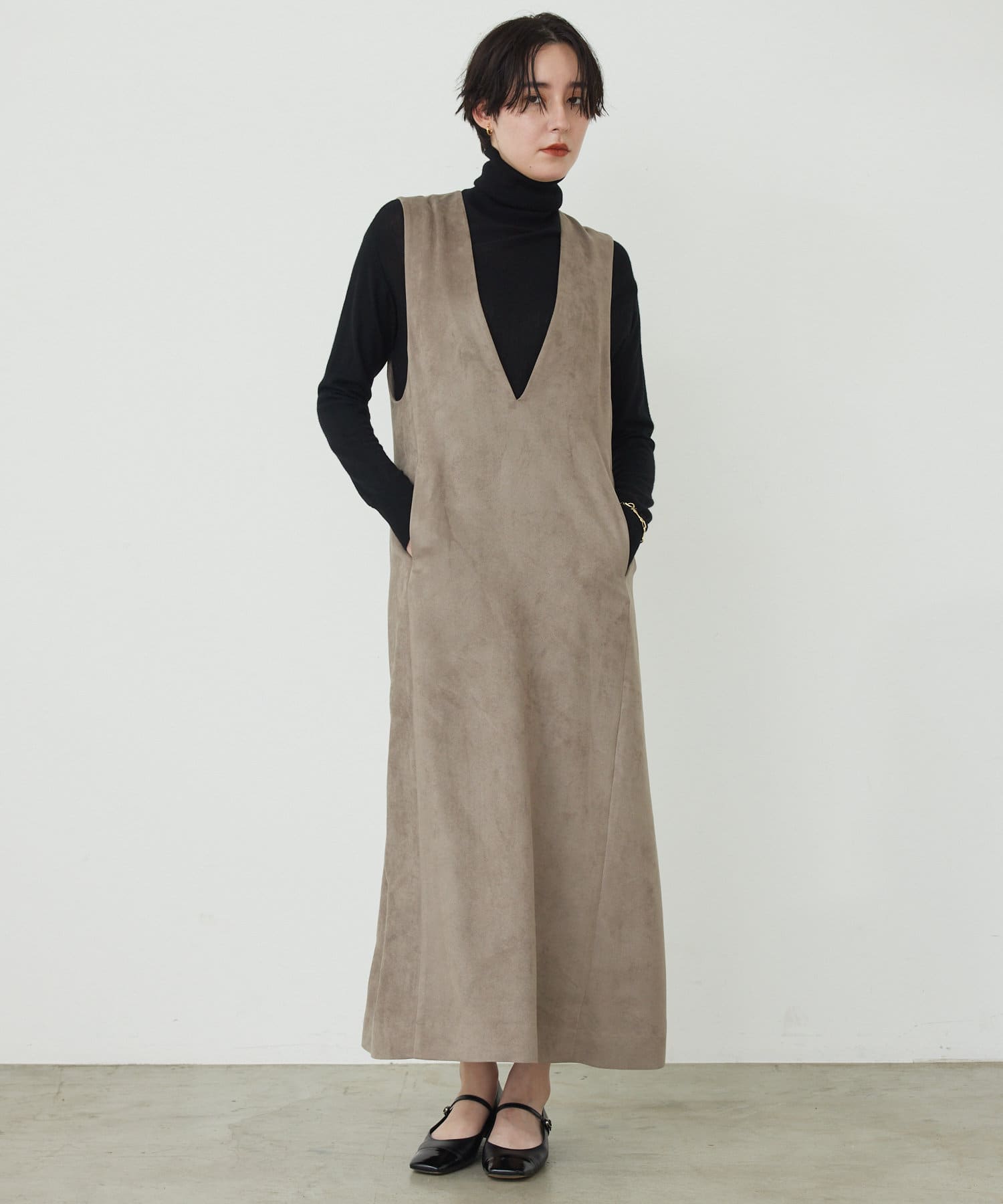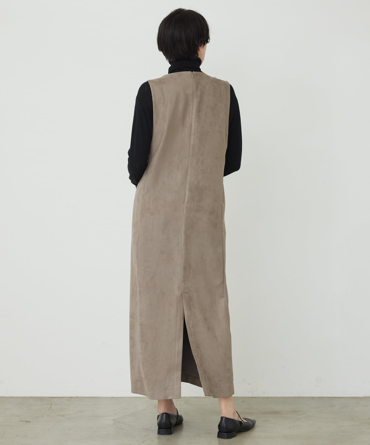 マットなスエード素材がさり気ない季節感と高級感を出してくれるワンピースは、インナー次第でスタイル・シーズン問わず着回しができるのがポイントです。
