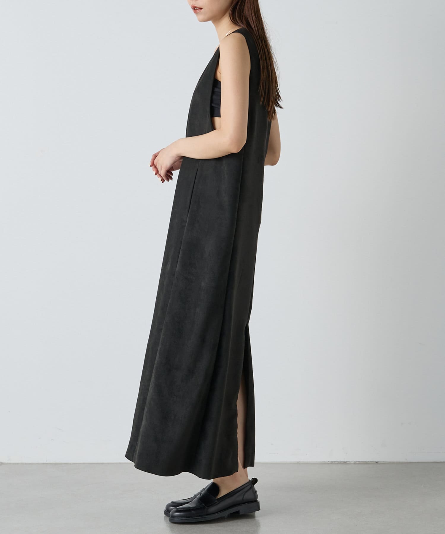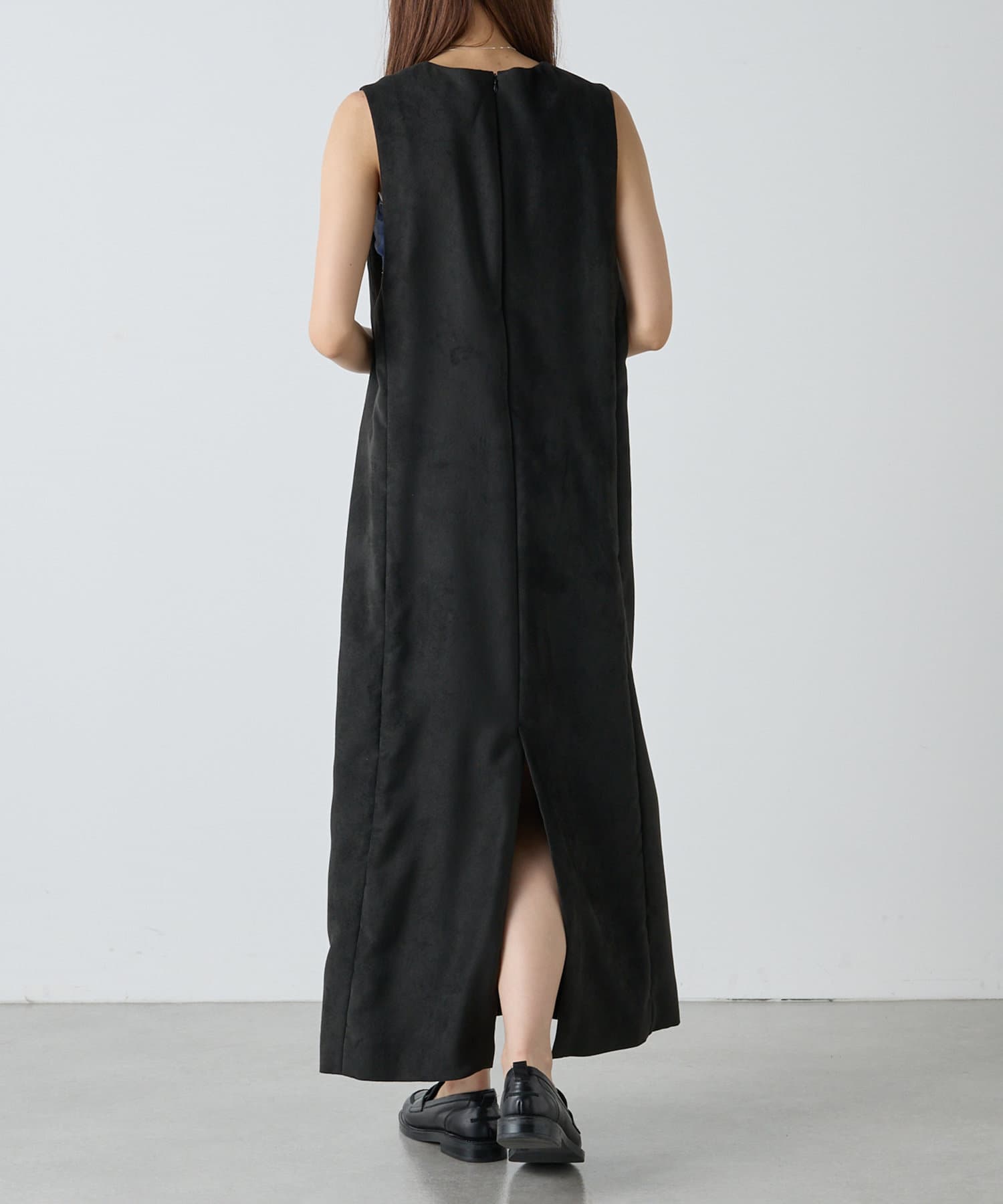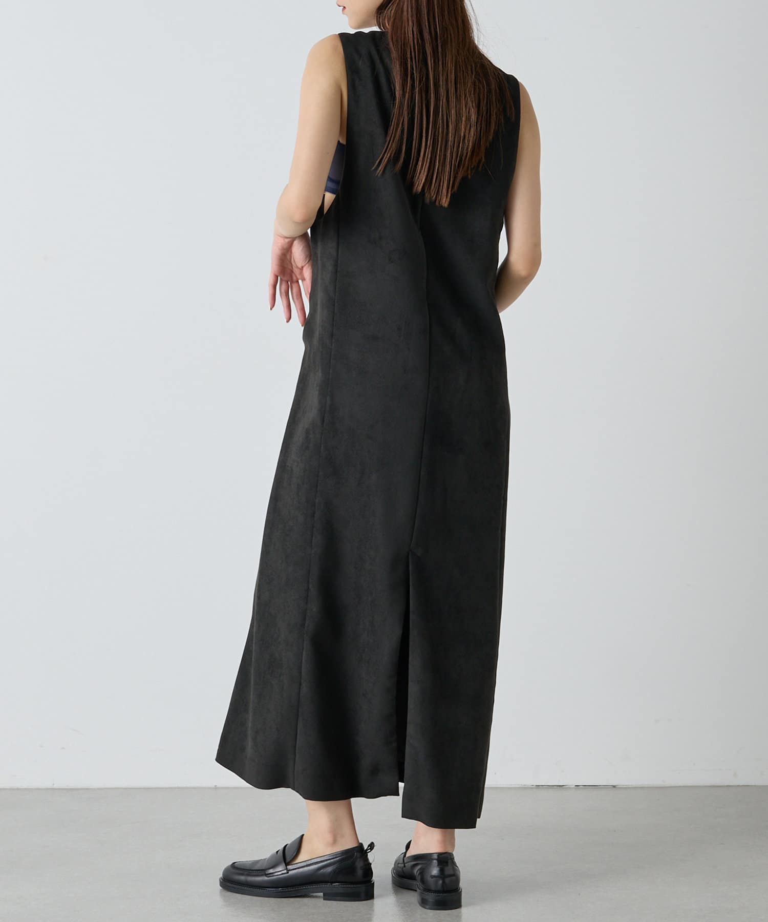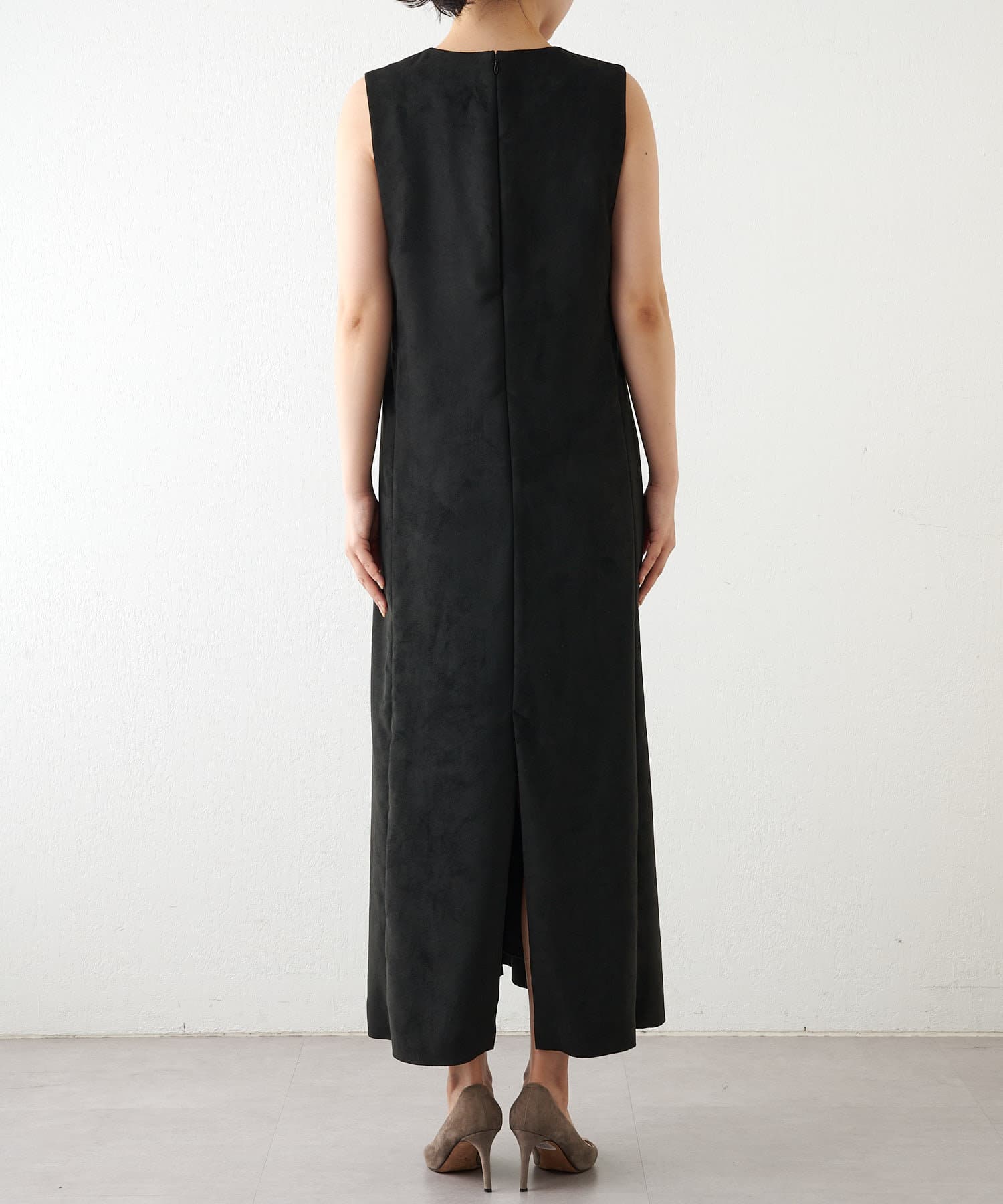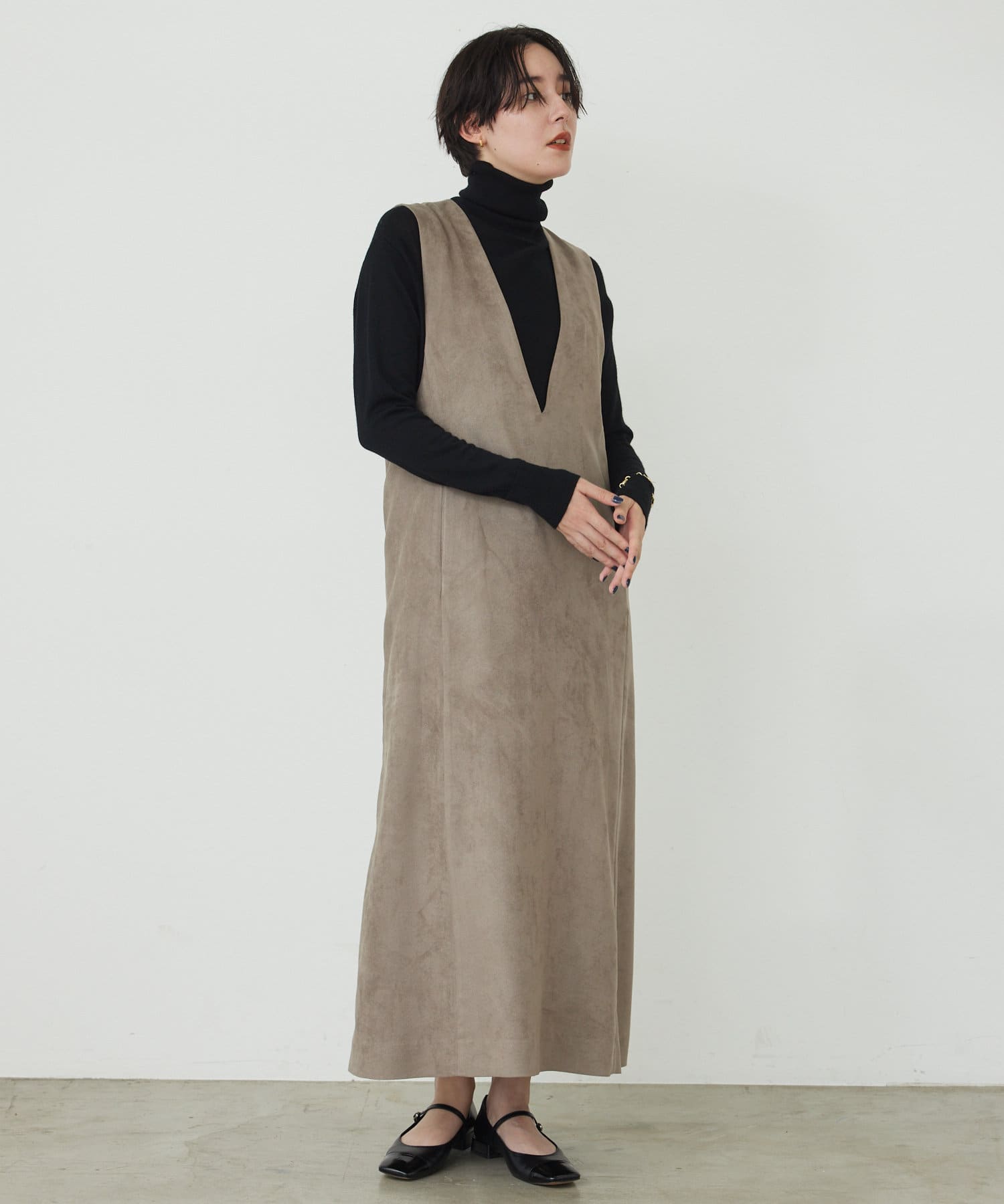 マットなスエード素材がさり気ない季節感と高級感を出してくれるワンピースは、インナー次第でスタイル・シーズン問わず着回しができるのがポイントです。