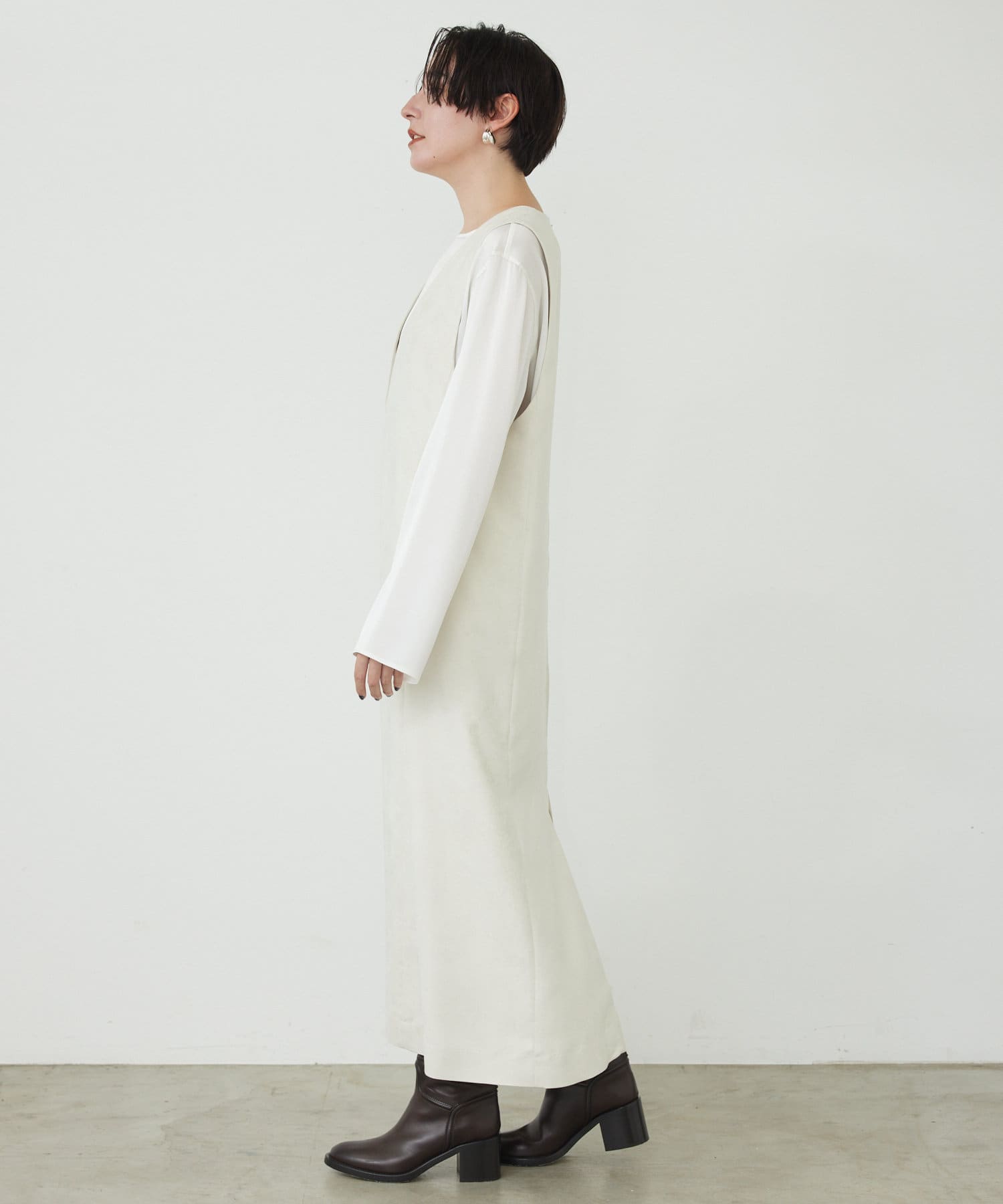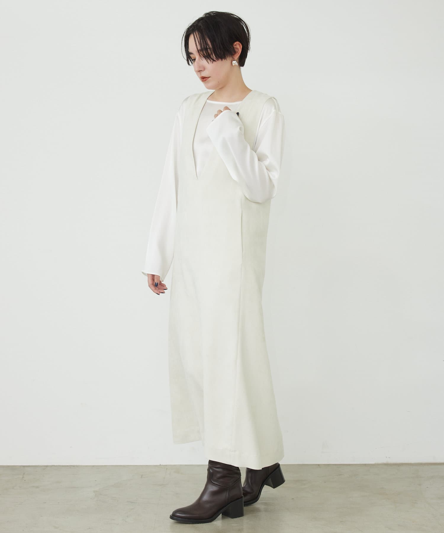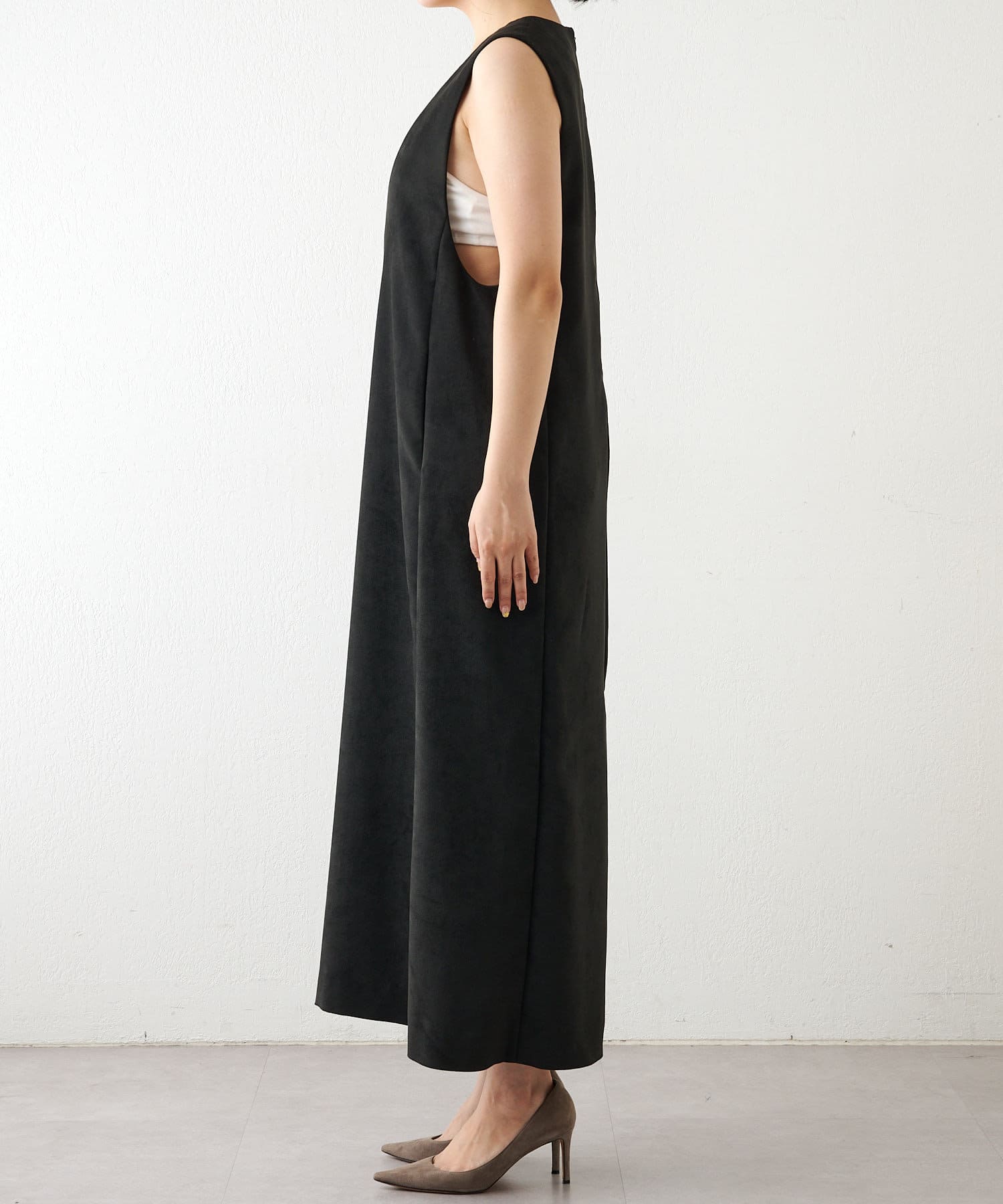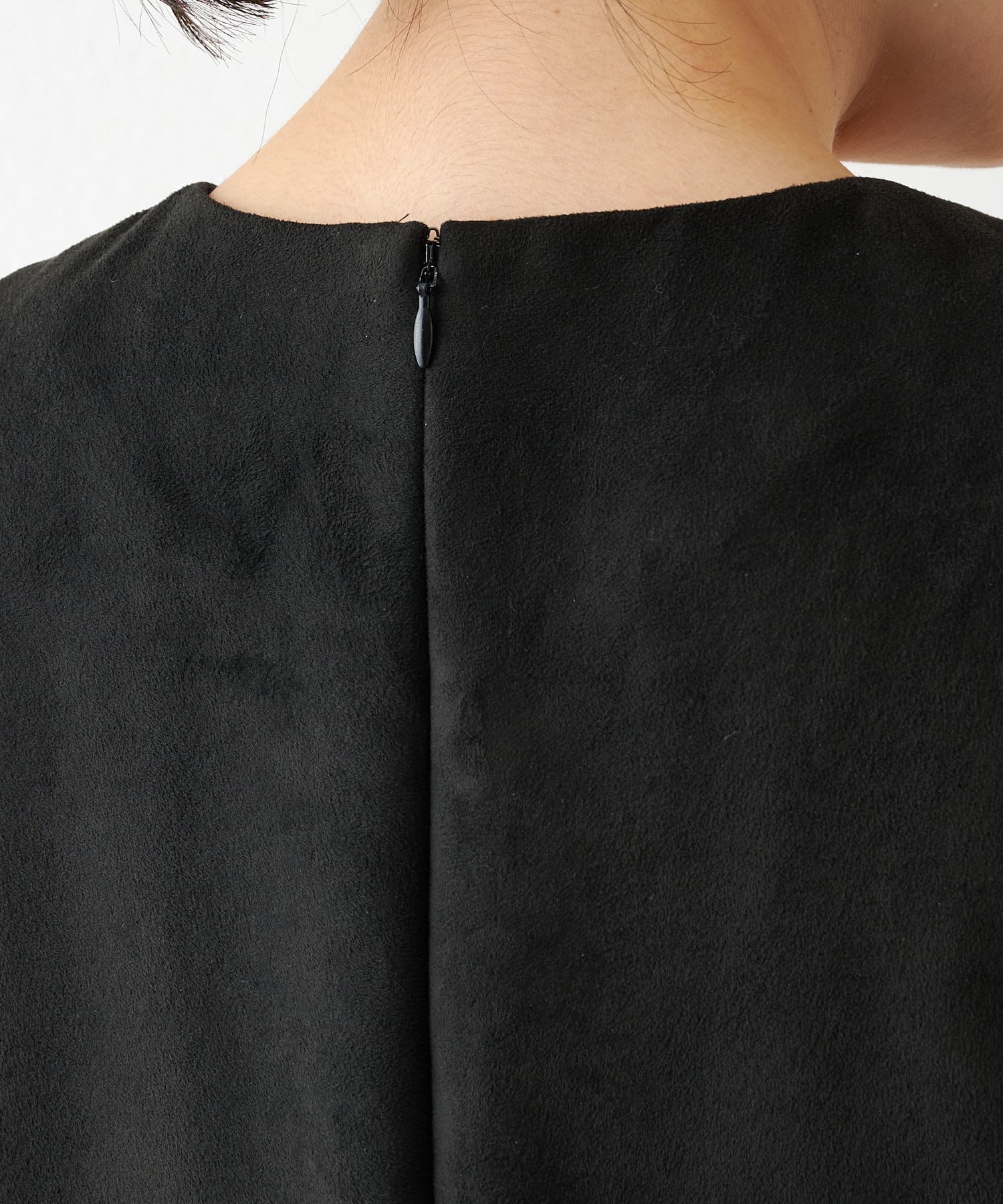 マットなスエード素材がさり気ない季節感と高級感を出してくれるワンピースは、インナー次第でスタイル・シーズン問わず着回しができるのがポイントです。
