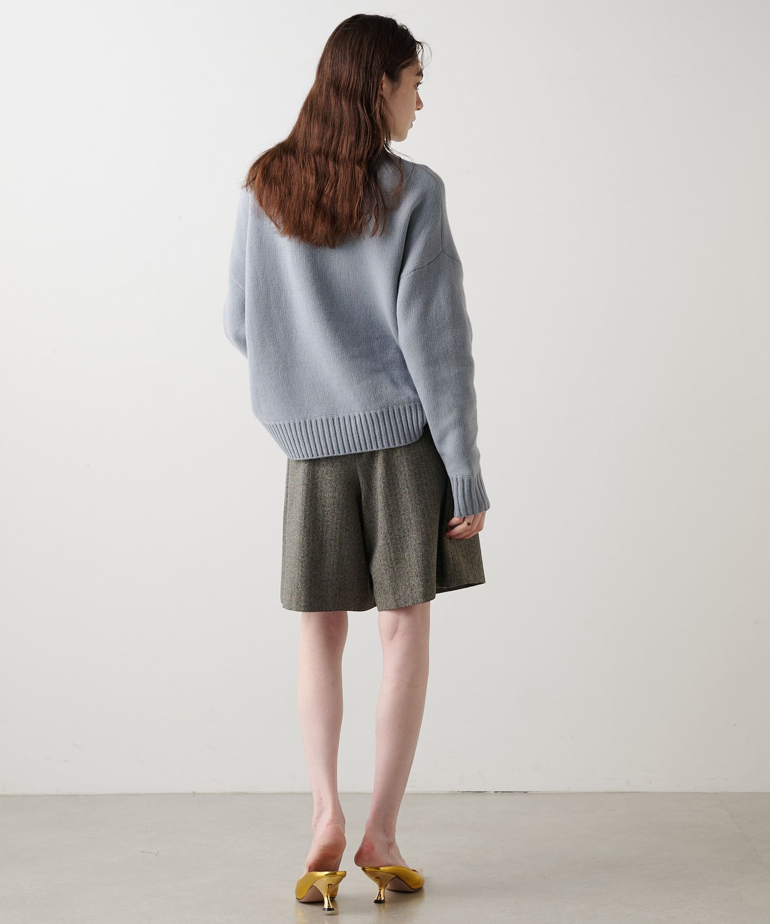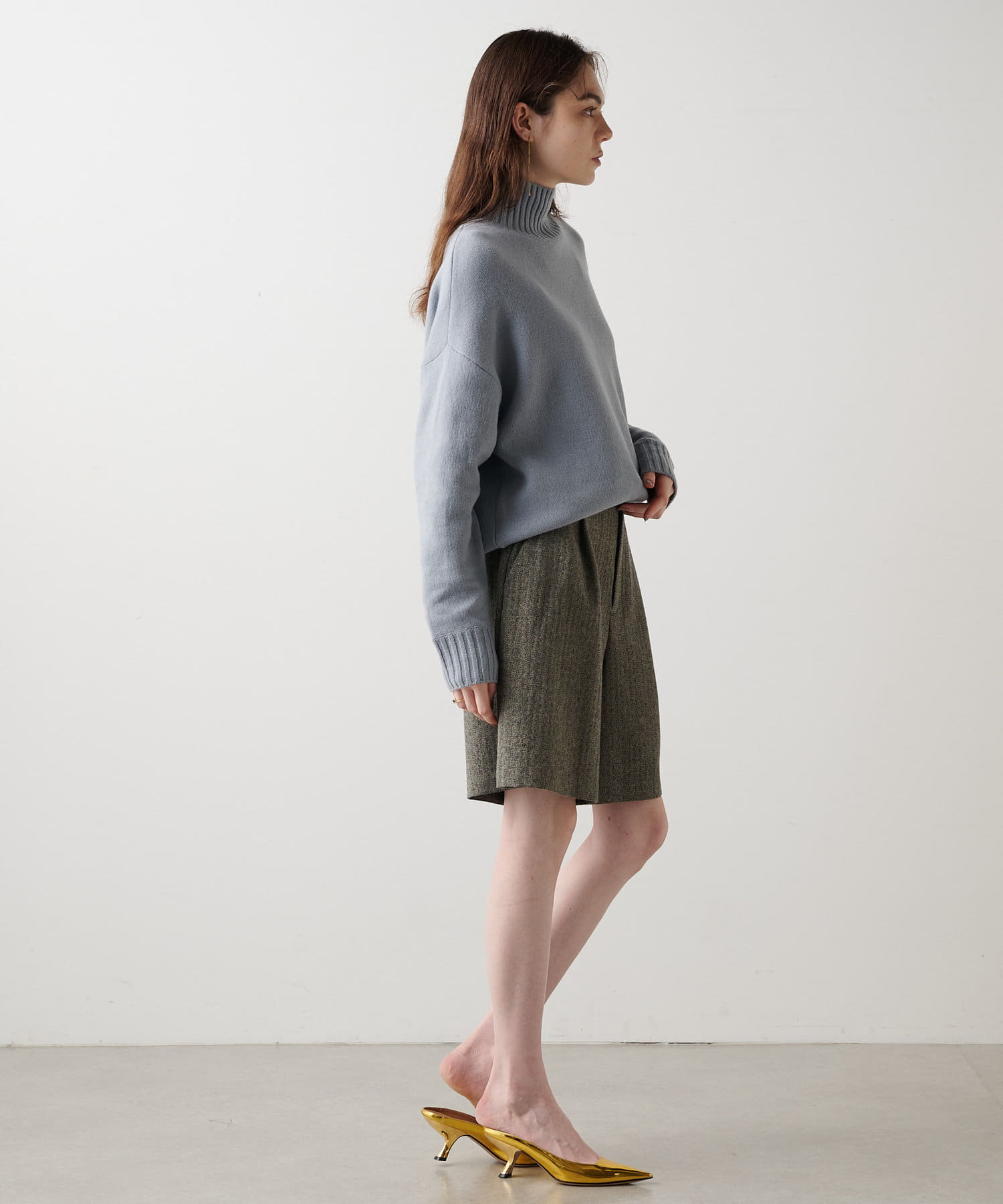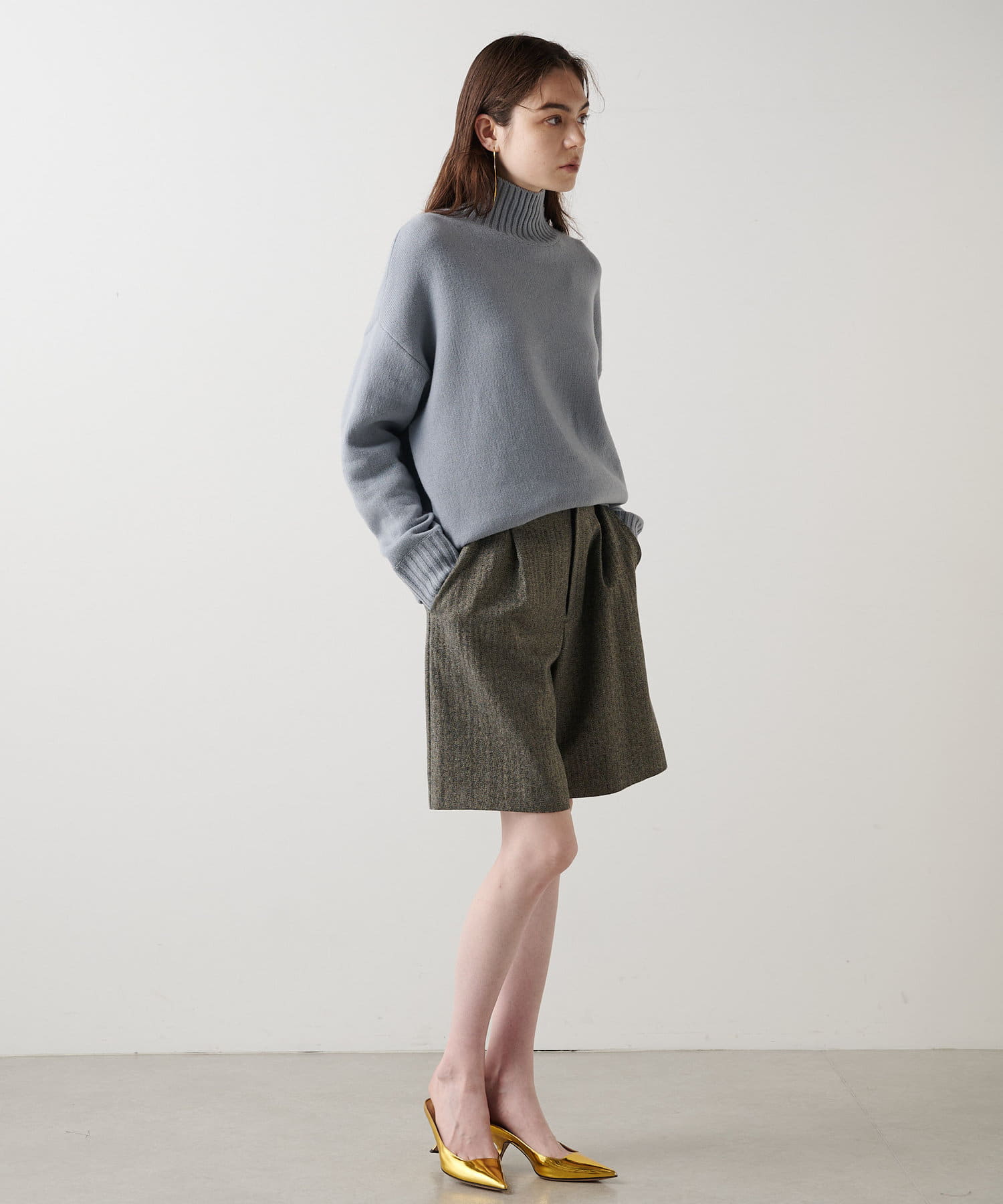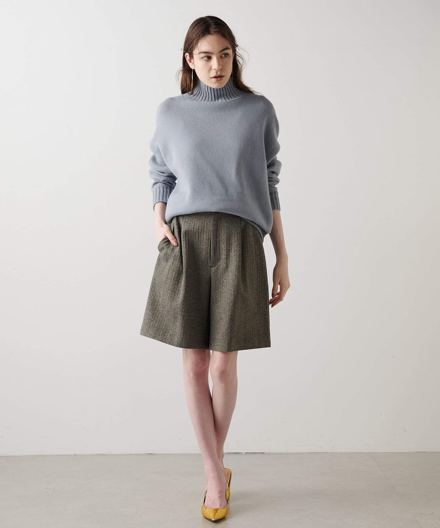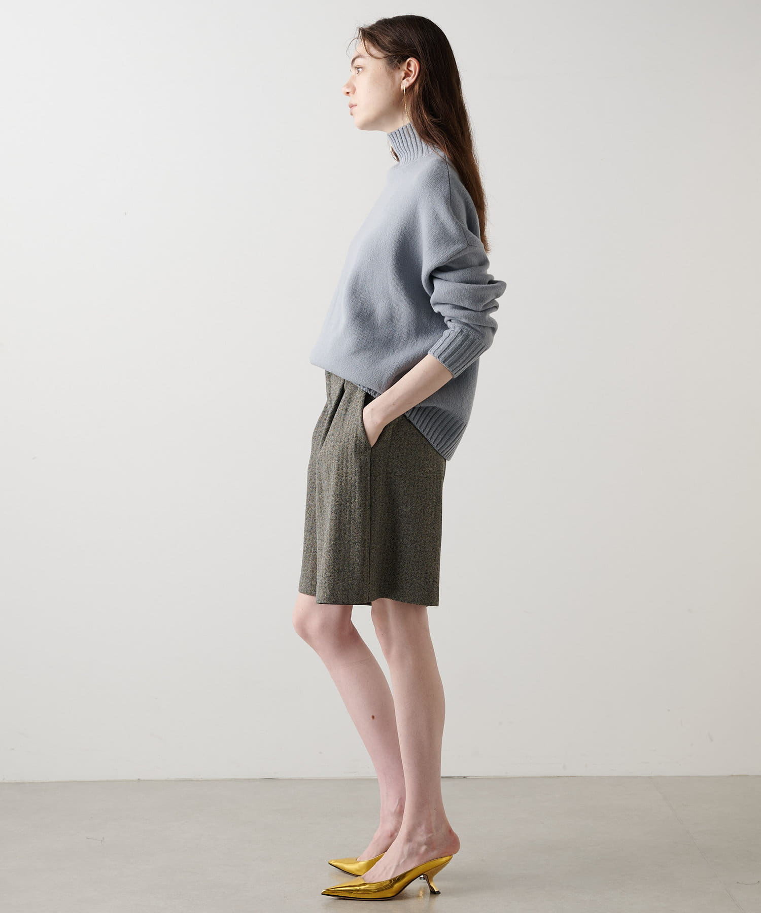 ■膝にかかる丈感で、大人のスタイリングにも取り入れやすいデザイン。
