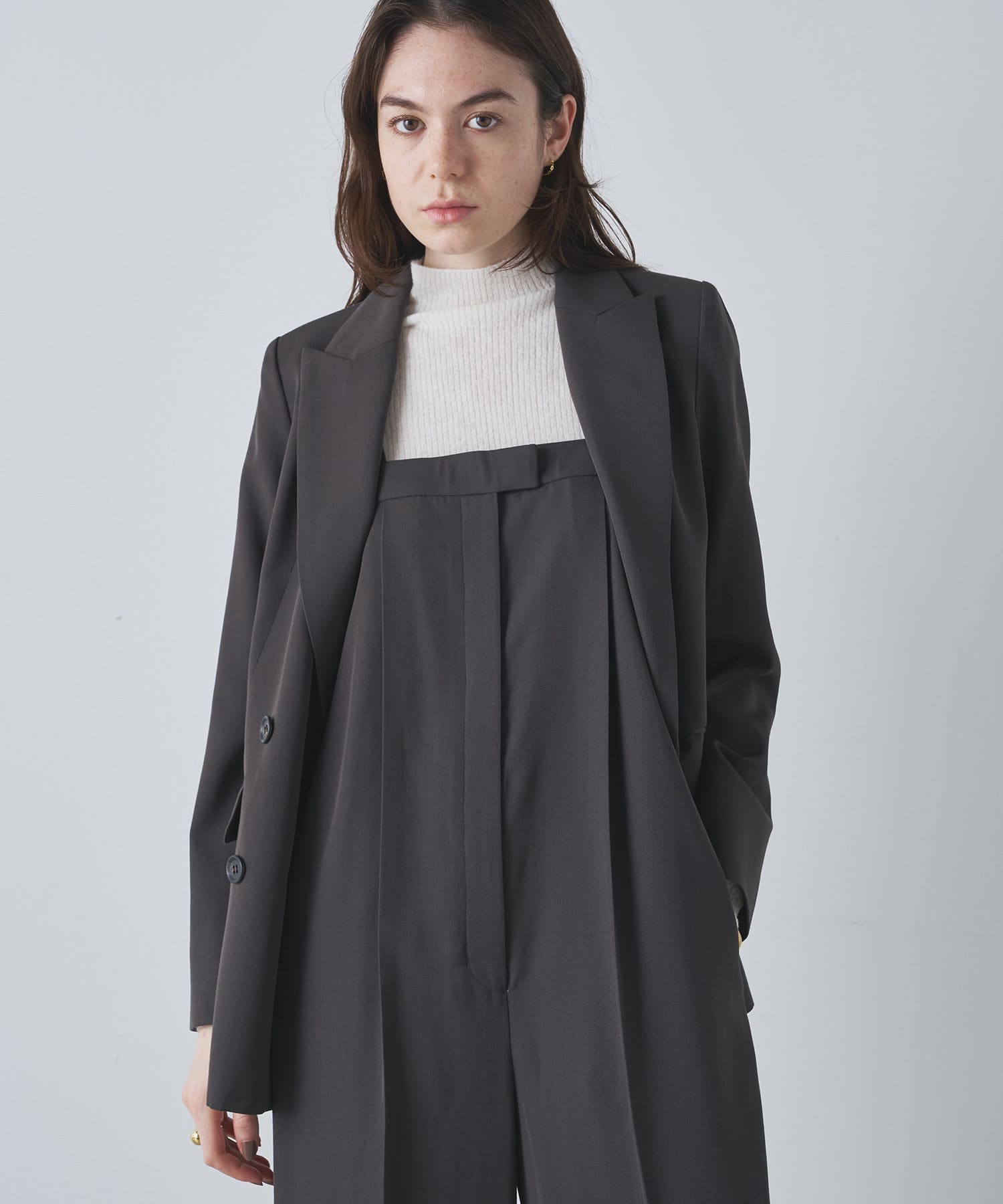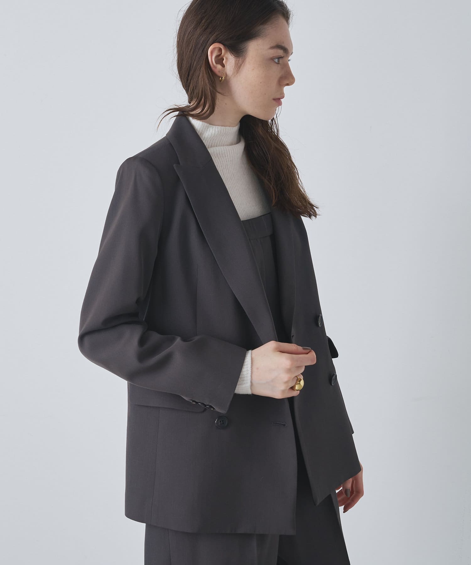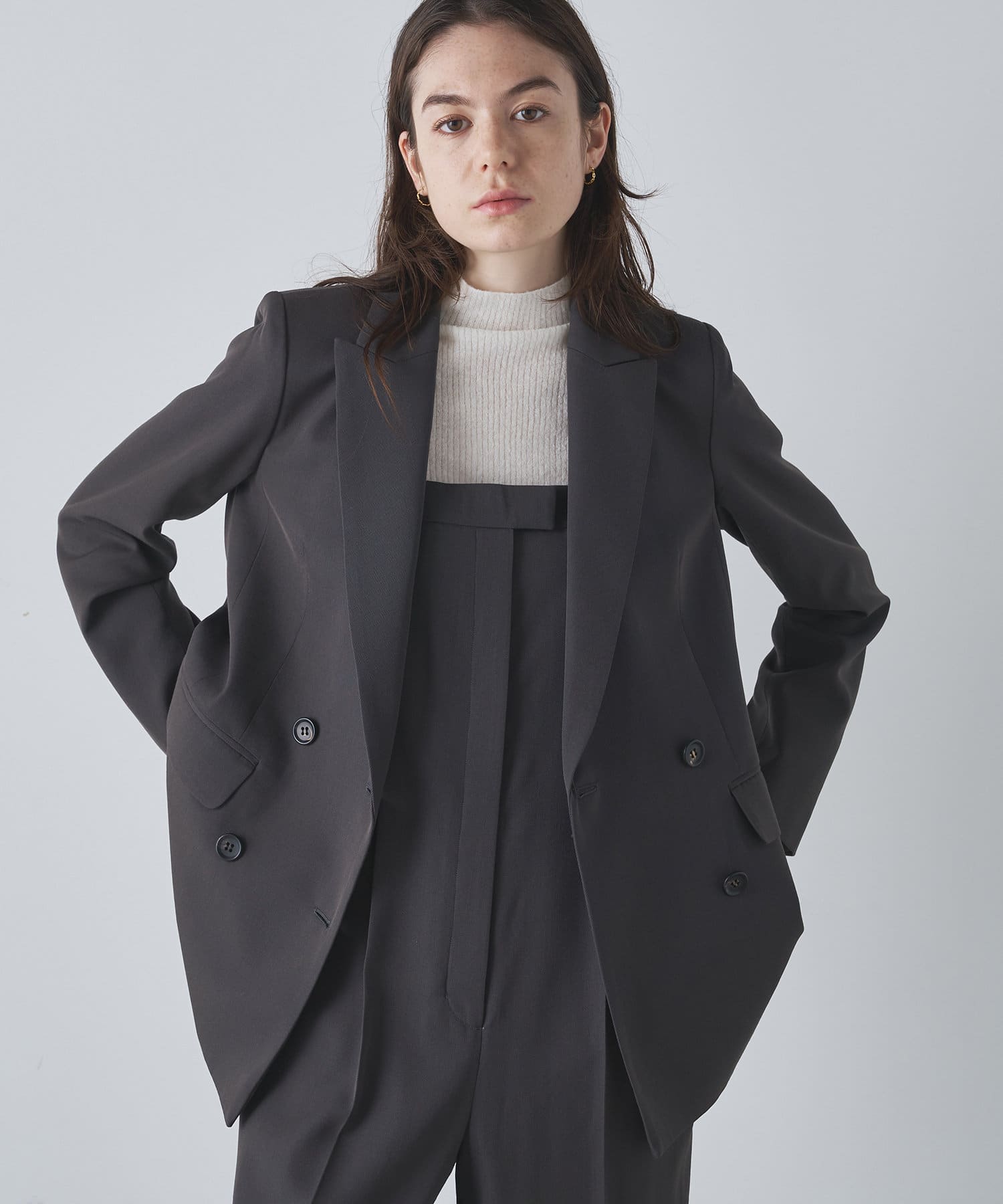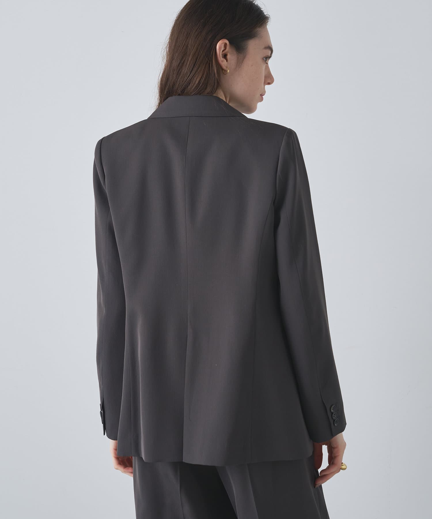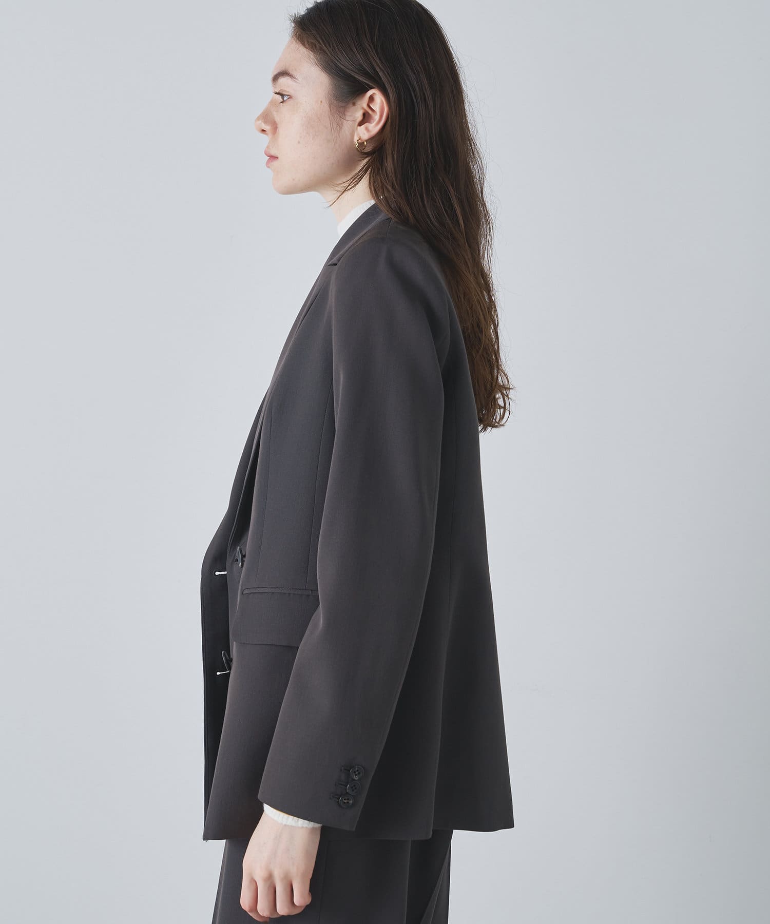 セットインで肩パッドも入っており綺麗めな印象ですが、お尻が隠れる着丈とウール×レーヨンのドライな質感でカジュアルにも合わせやすいですよ。様々なシーンで活躍しそうです。グレーの色味も絶妙で素敵。