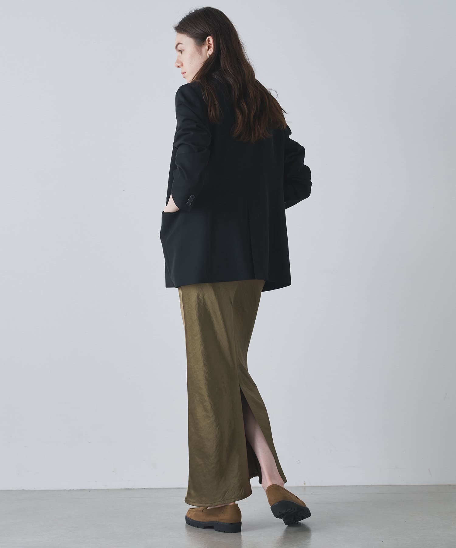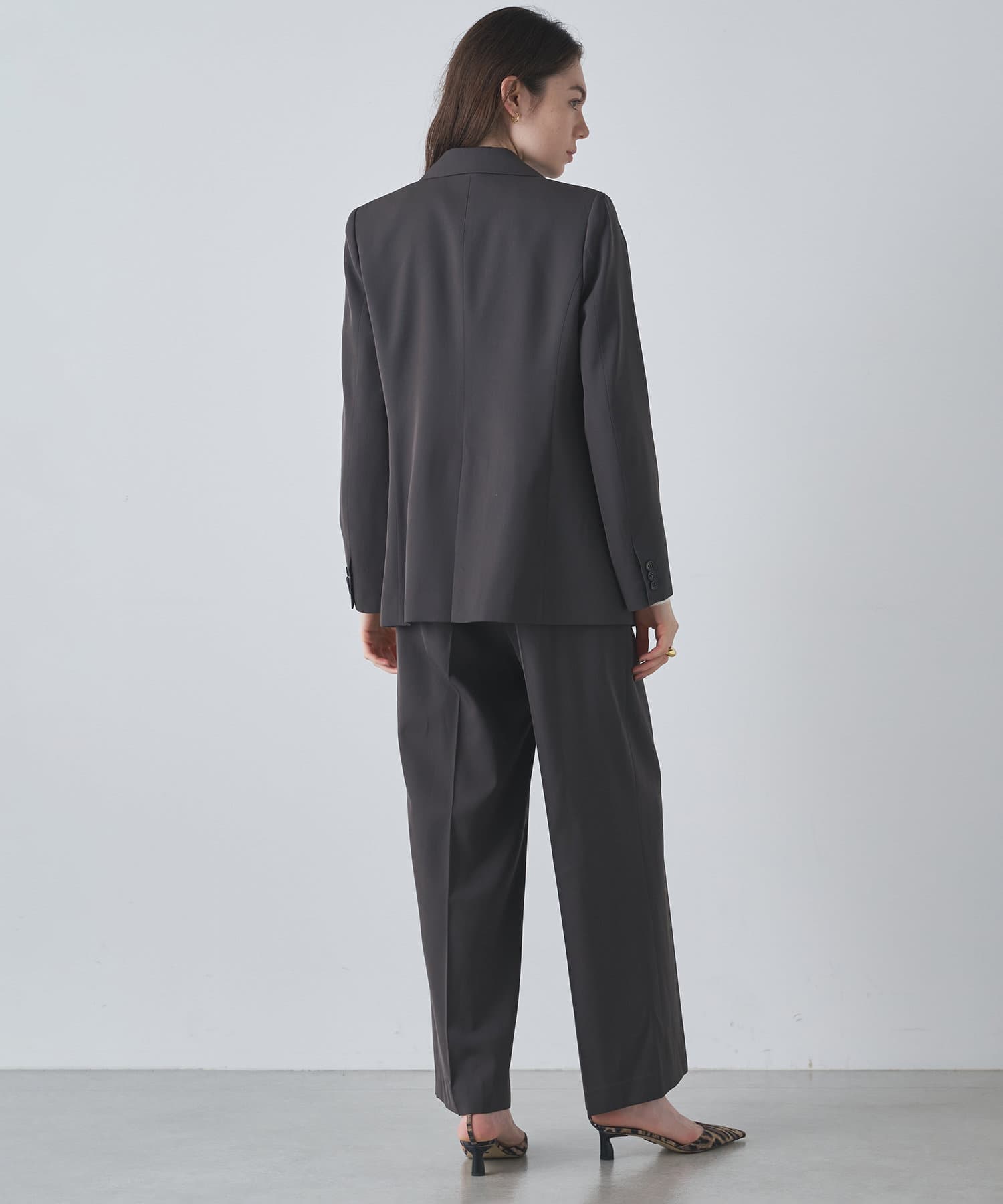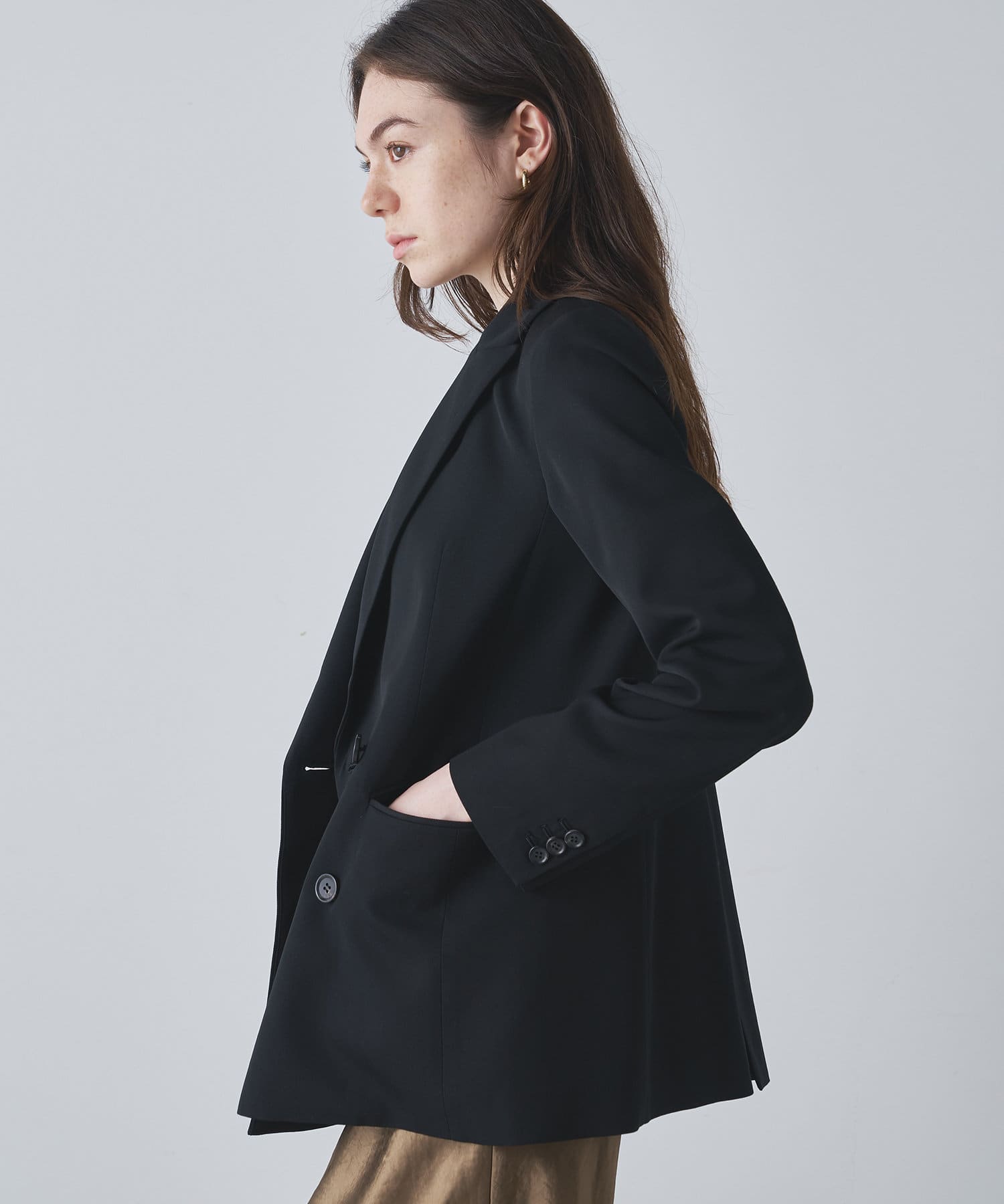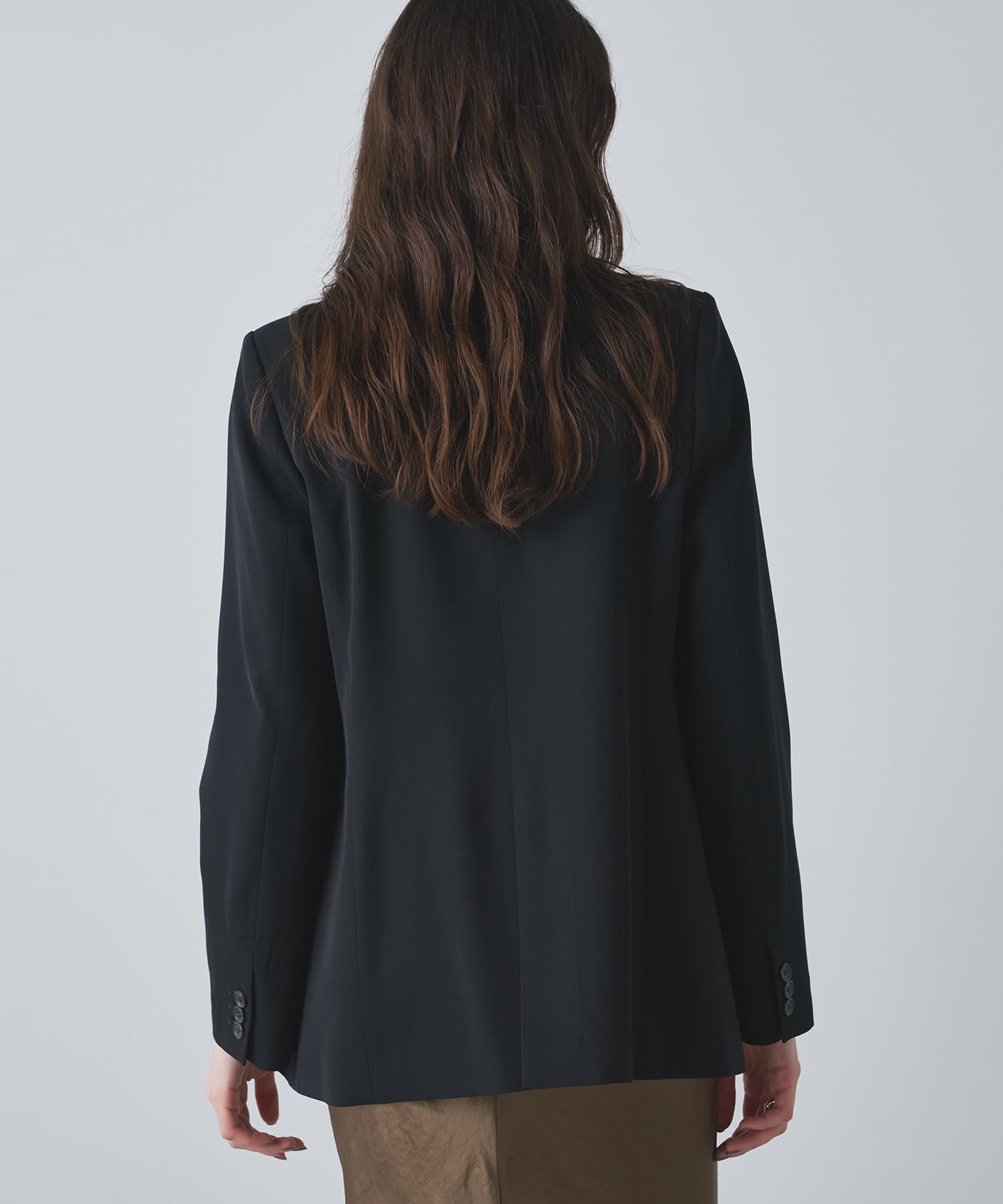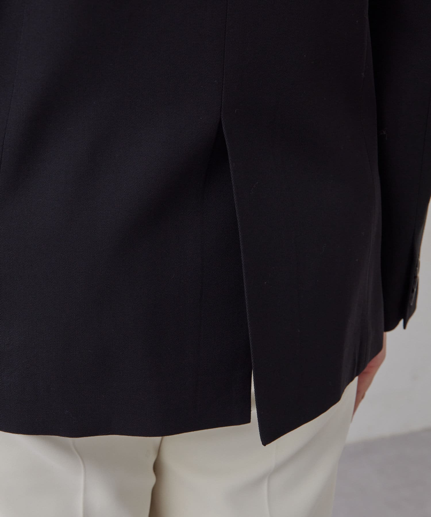 セットインで肩パッドも入っており綺麗めな印象ですが、お尻が隠れる着丈とウール×レーヨンのドライな質感でカジュアルにも合わせやすいですよ。様々なシーンで活躍しそうです。グレーの色味も絶妙で素敵。