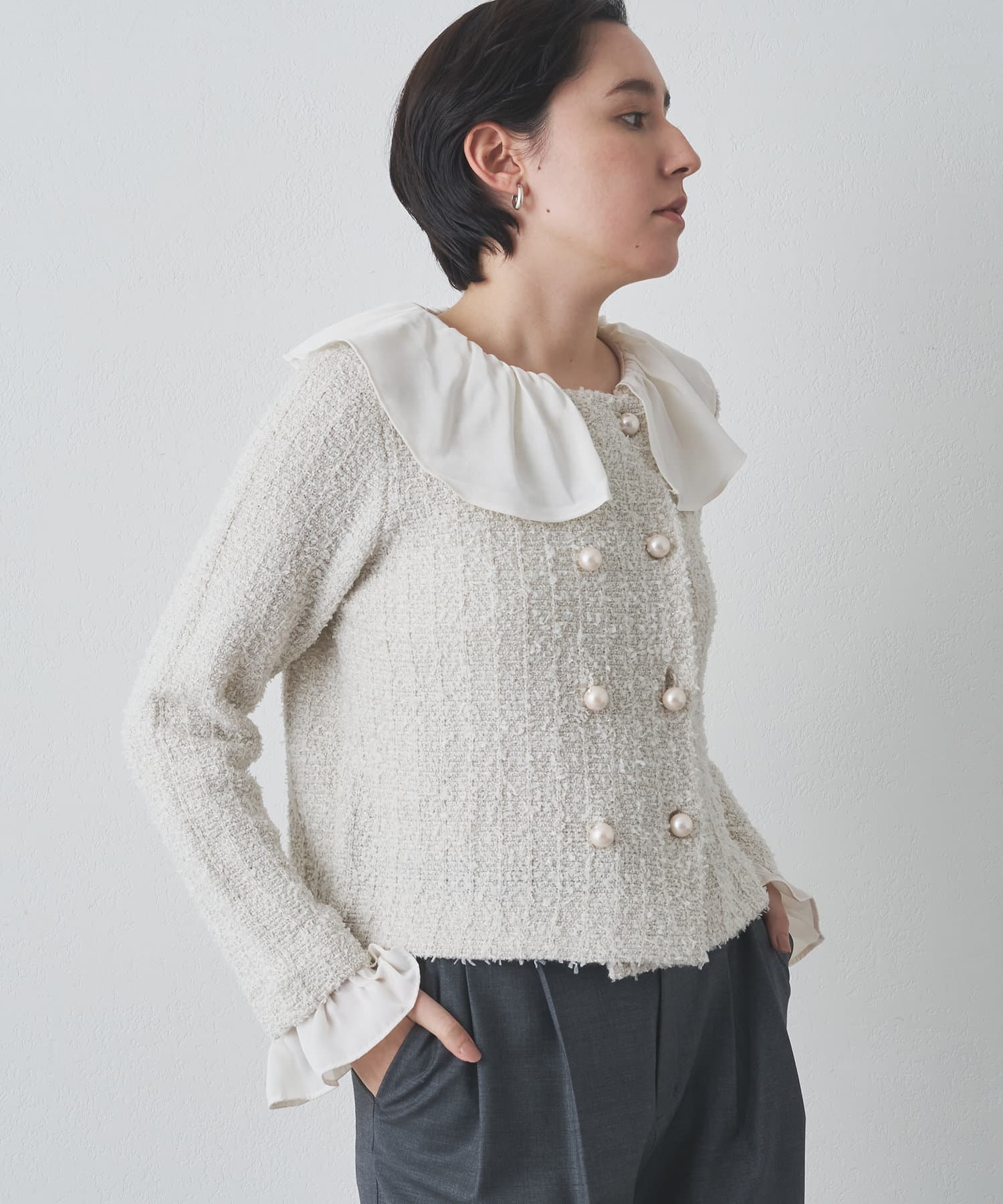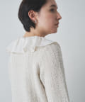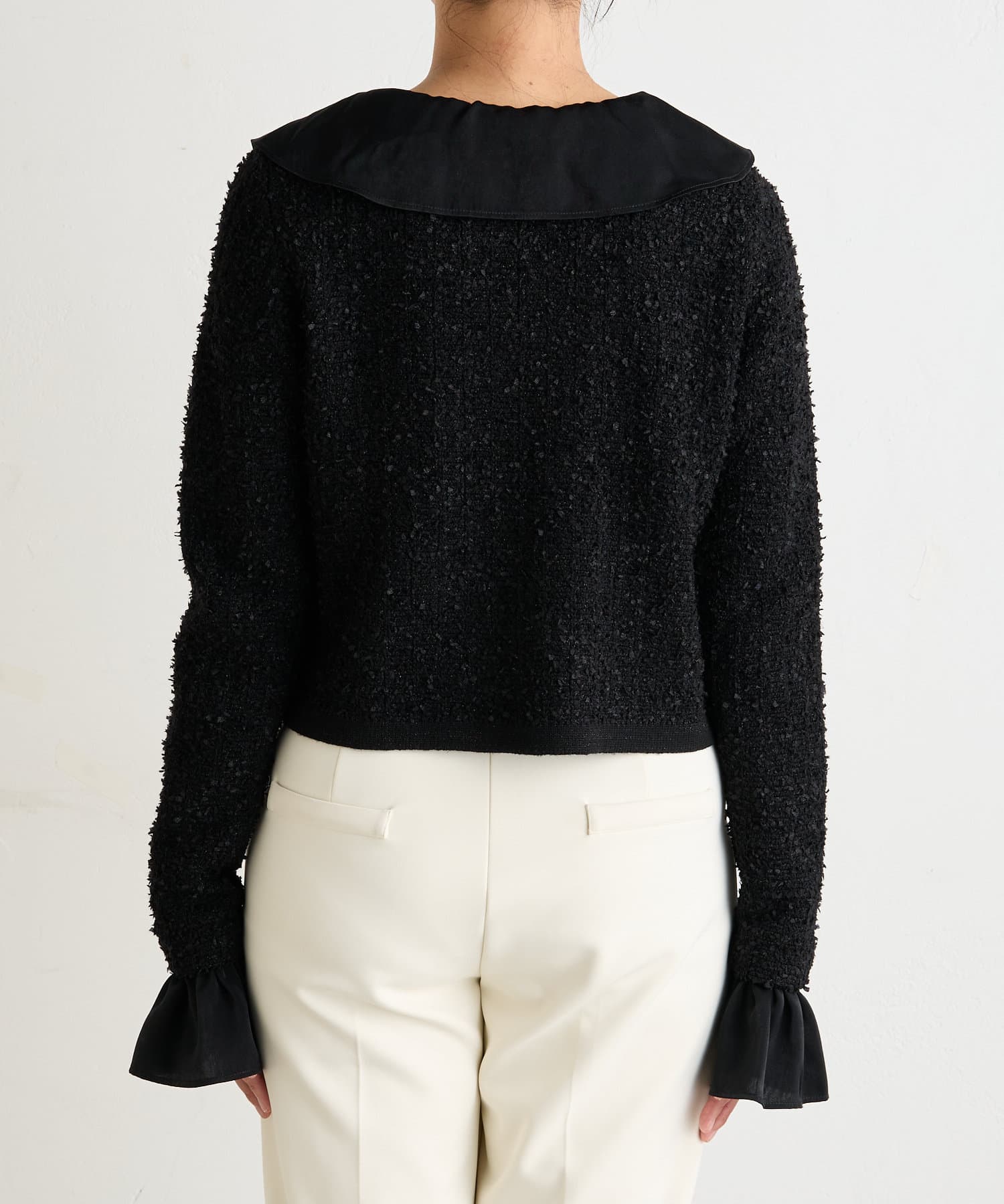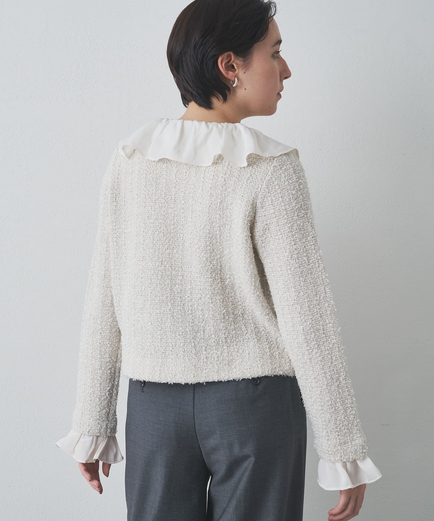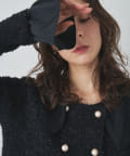 ニットカーデなので、伸縮性がありとても着心地が良かったです!フリルの襟と袖、パールボタン、ツイードが華やかでアクセサリーもテクニックも要りません。楽に着映えする1枚です!オケージョンにも是非。