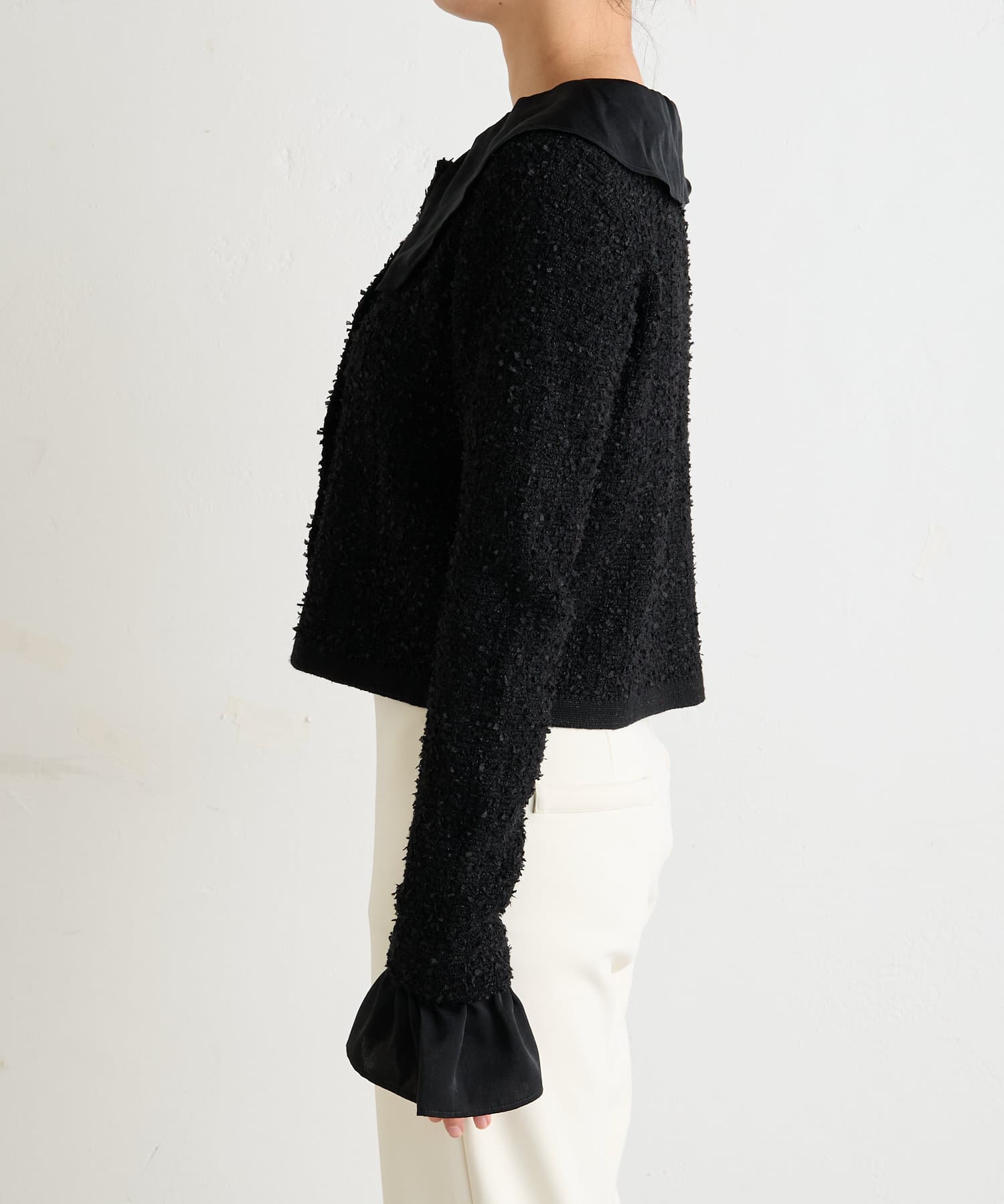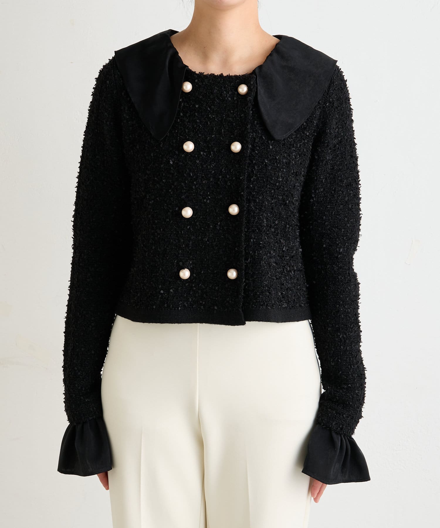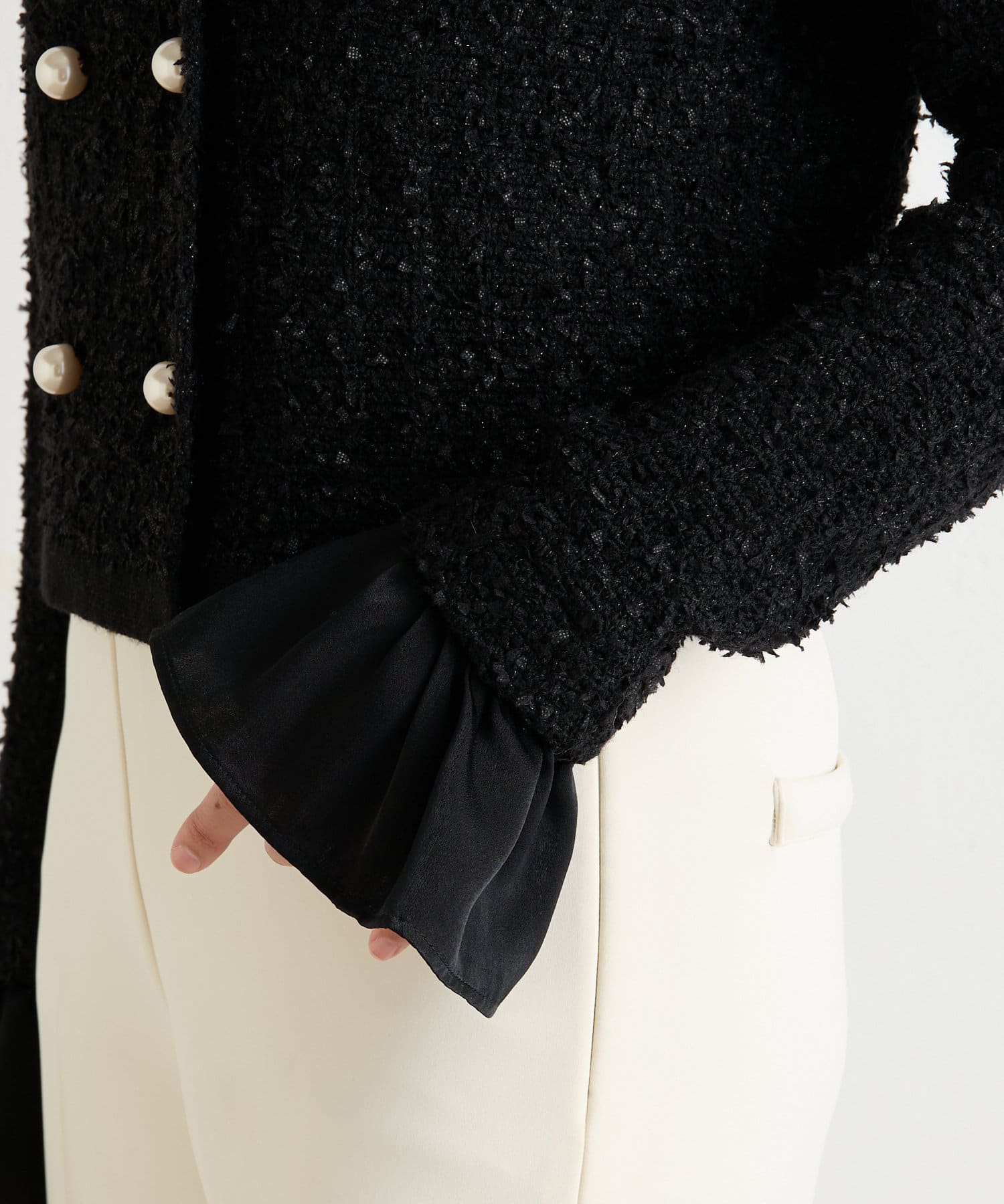 ニットカーデなので、伸縮性がありとても着心地が良かったです!フリルの襟と袖、パールボタン、ツイードが華やかでアクセサリーもテクニックも要りません。楽に着映えする1枚です!オケージョンにも是非。