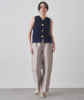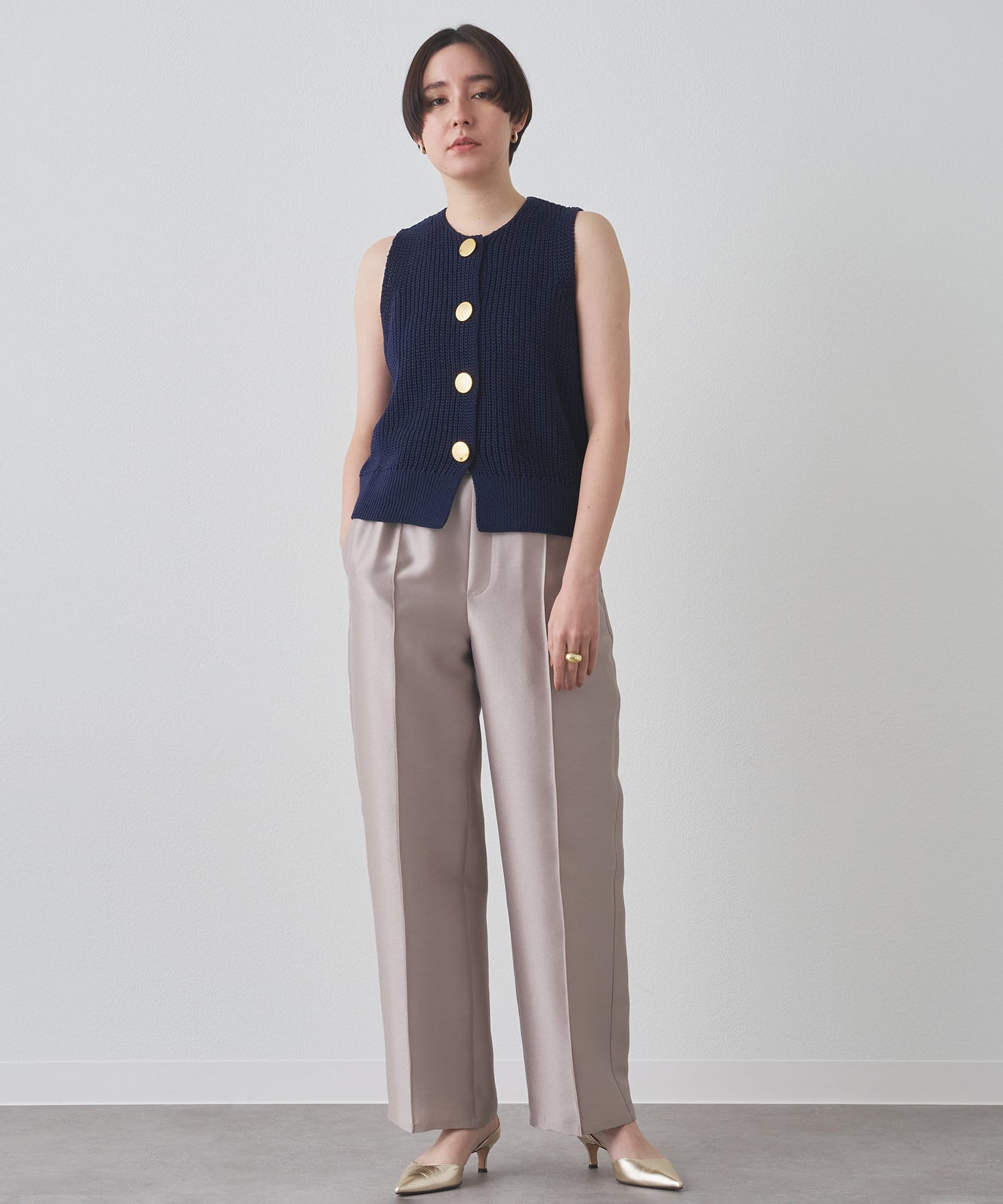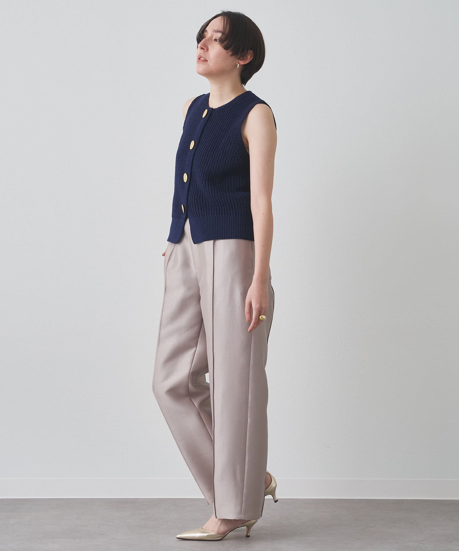パンツはウエストもゴムなので体型選ばずにお召し頂けますし、インしないスタイルにも◎です!ネイビーは裏地がないので、ほんのり透け感があります。真夏以外は使える軽さです。