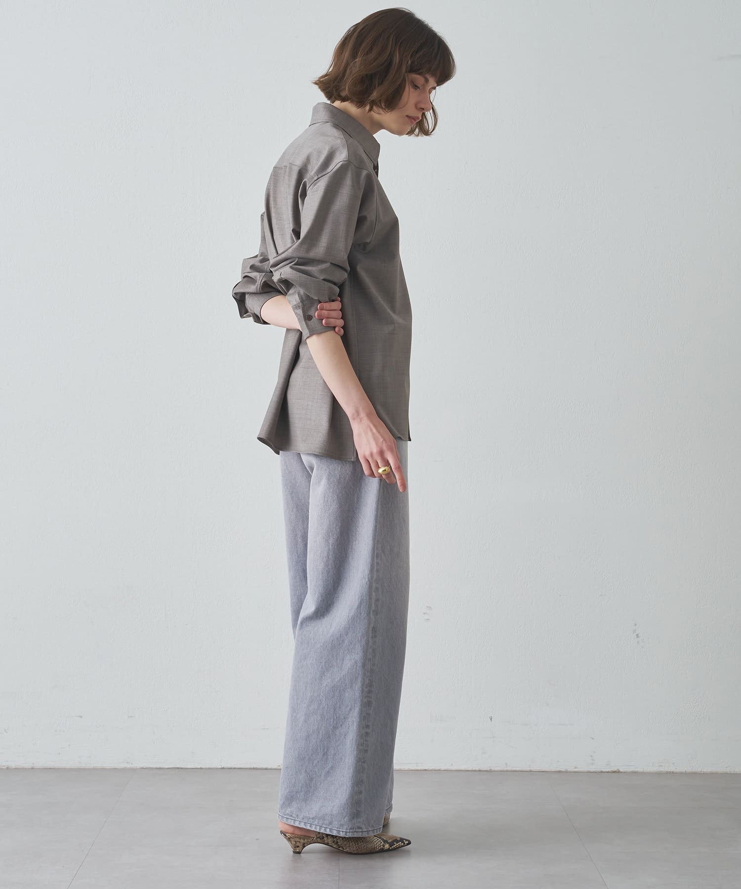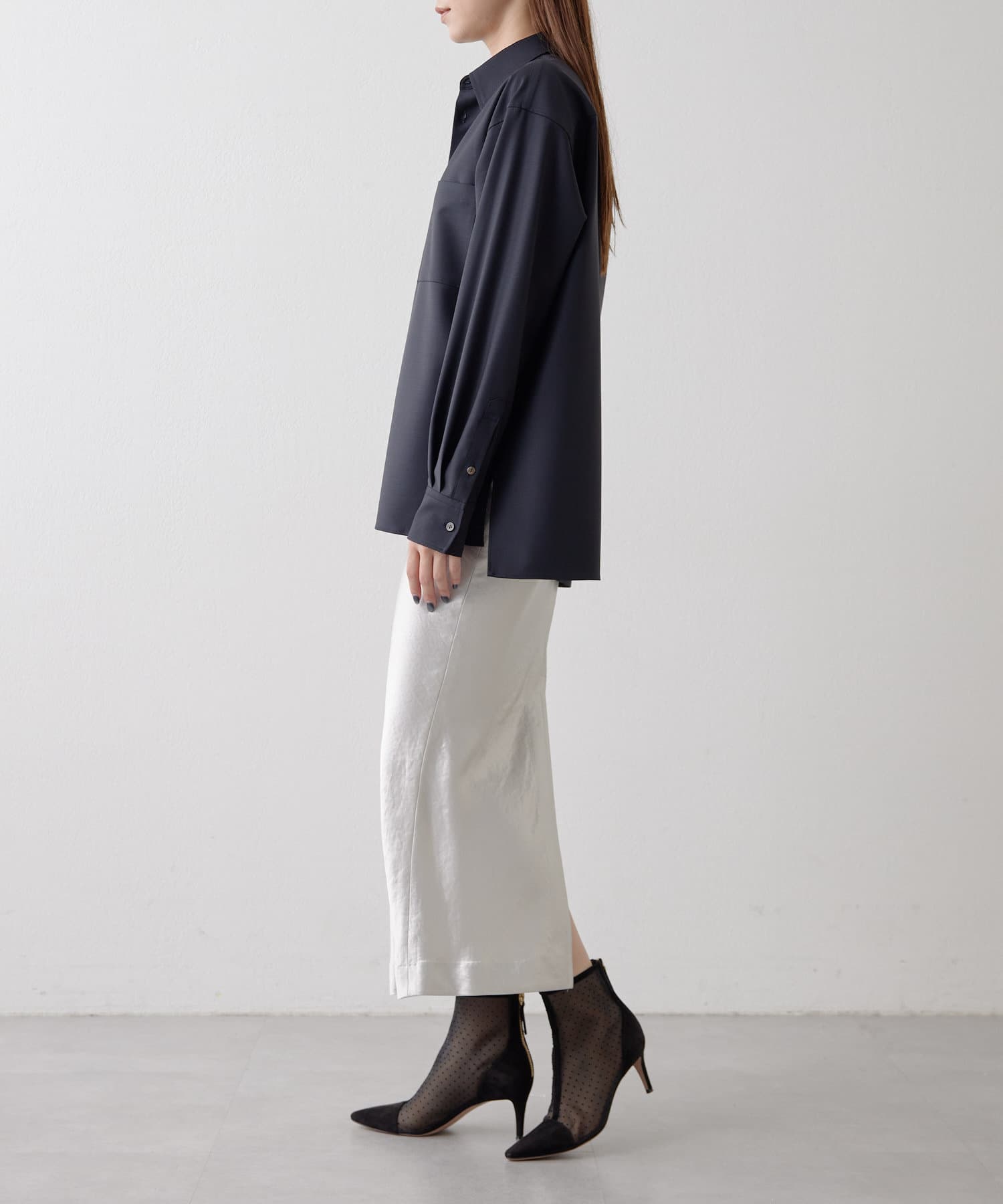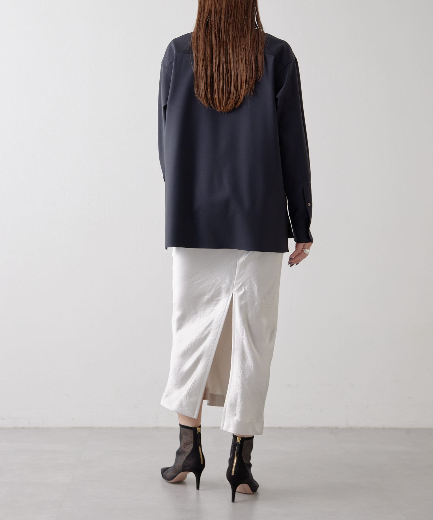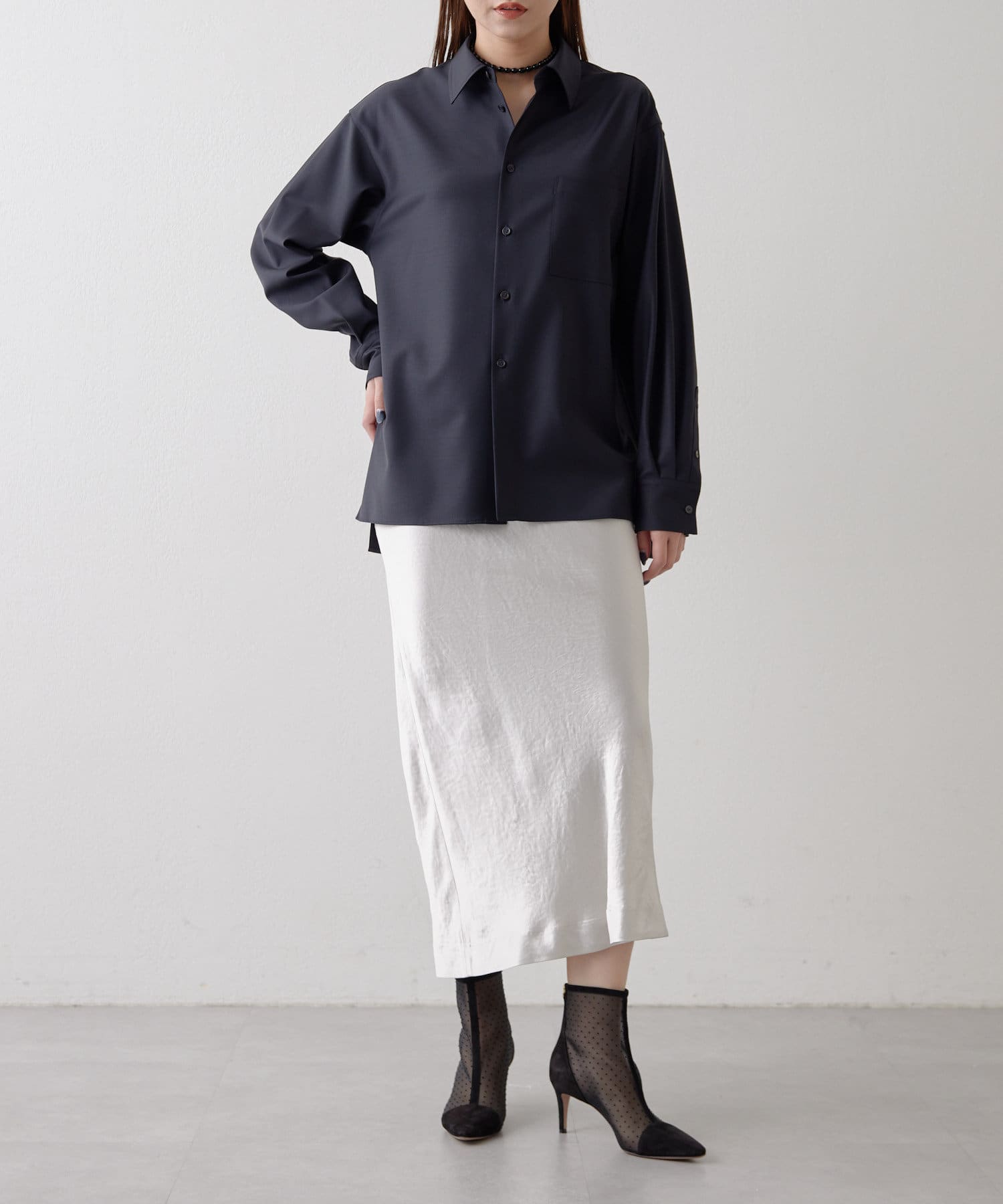 美しいツヤがポイントで、パンツ同様にシーズンレスで使えます◎