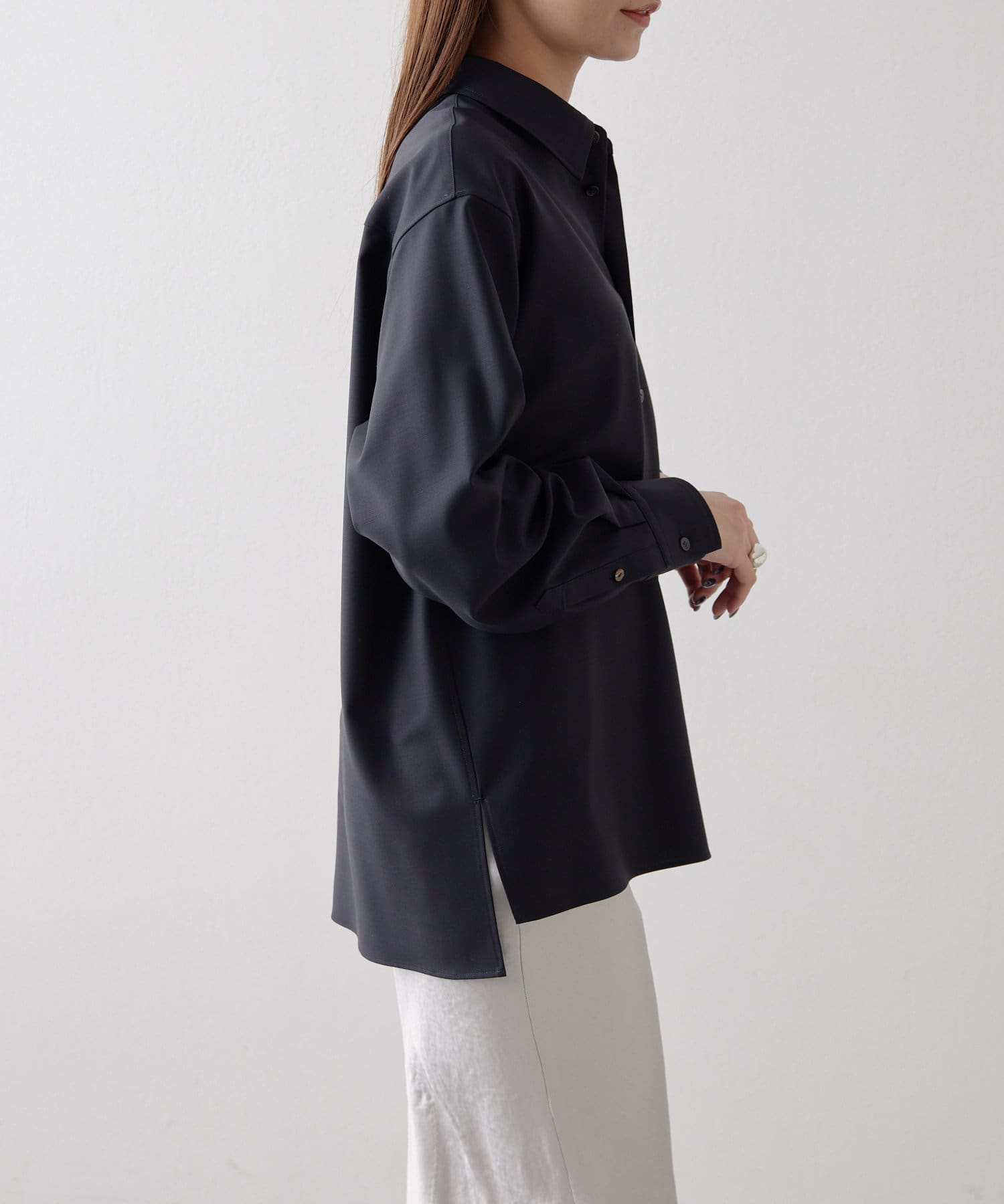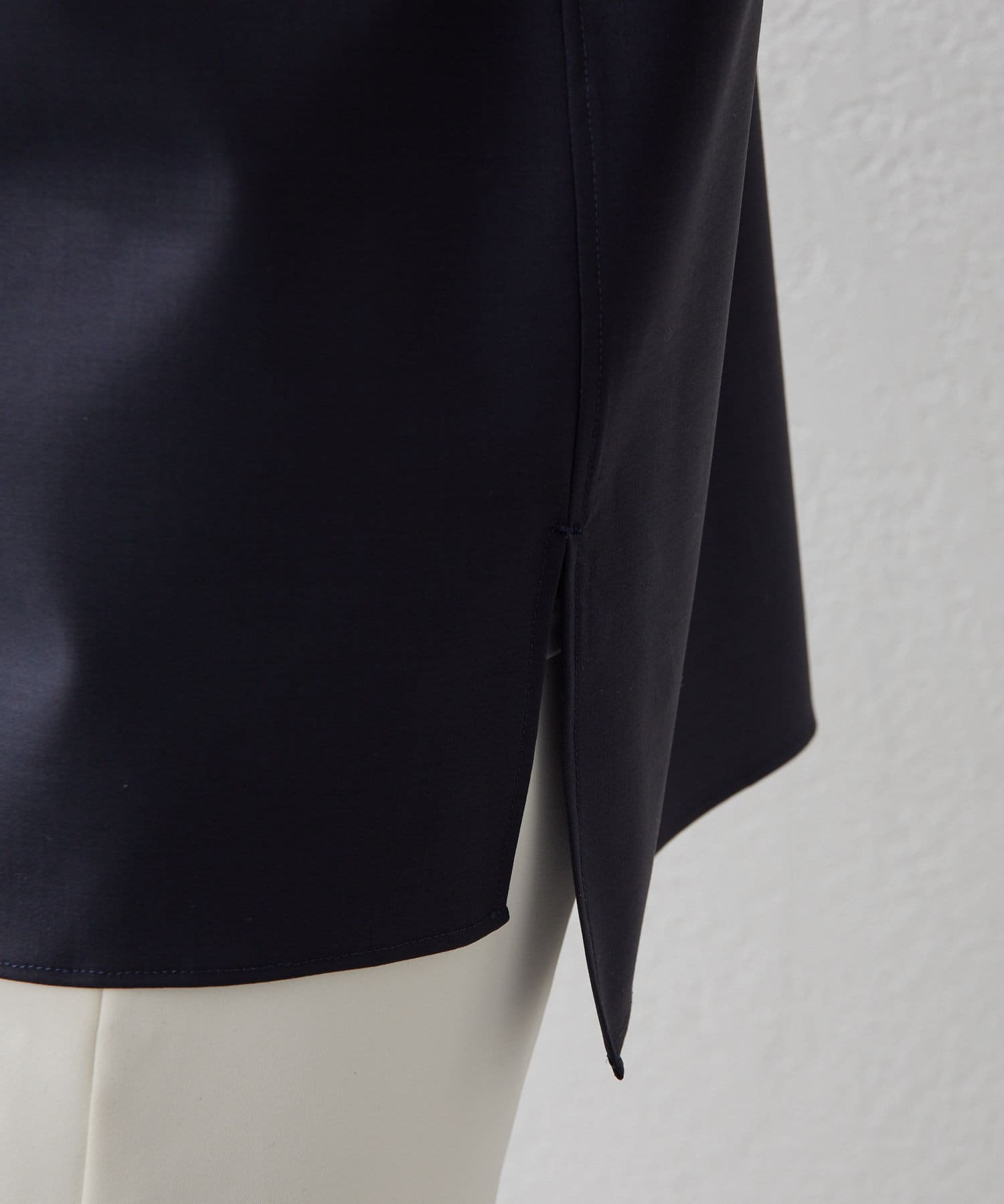 ■サイドスリット入りでタックインでもアウトでもサマになり、ストレートのヘムラインがシャープな印象をプラス。