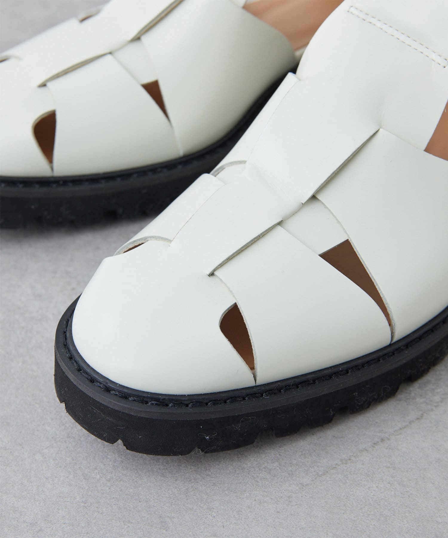 ■編み込まれたレザーと丸みのあるトゥが特徴のグルカサンダル。