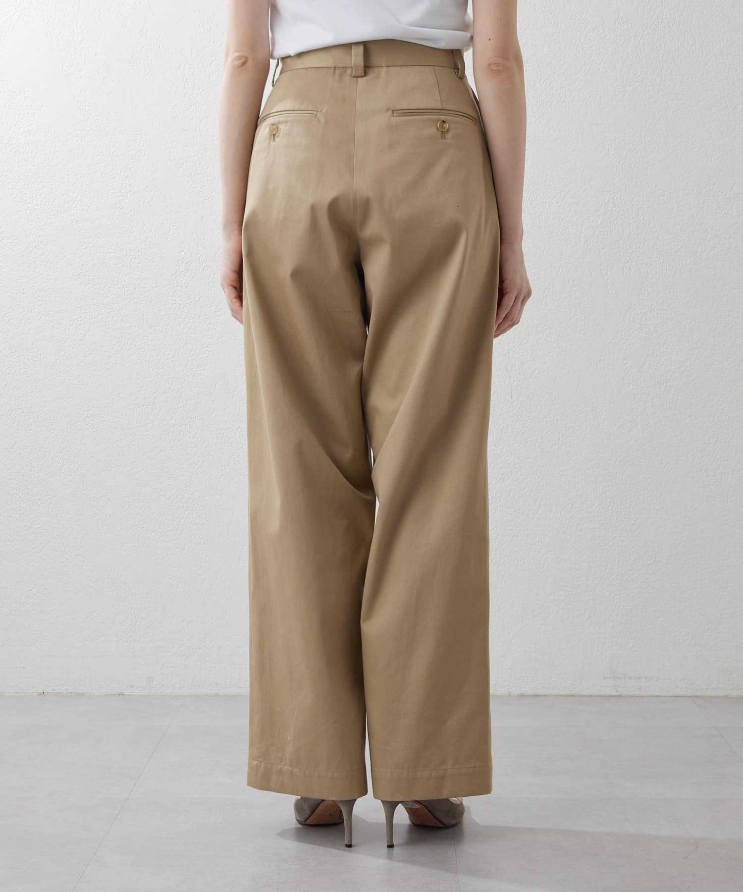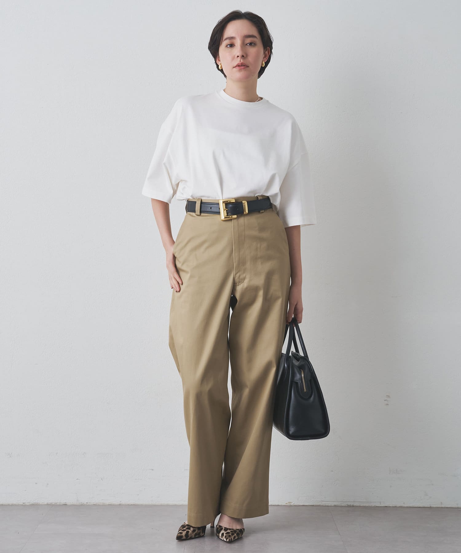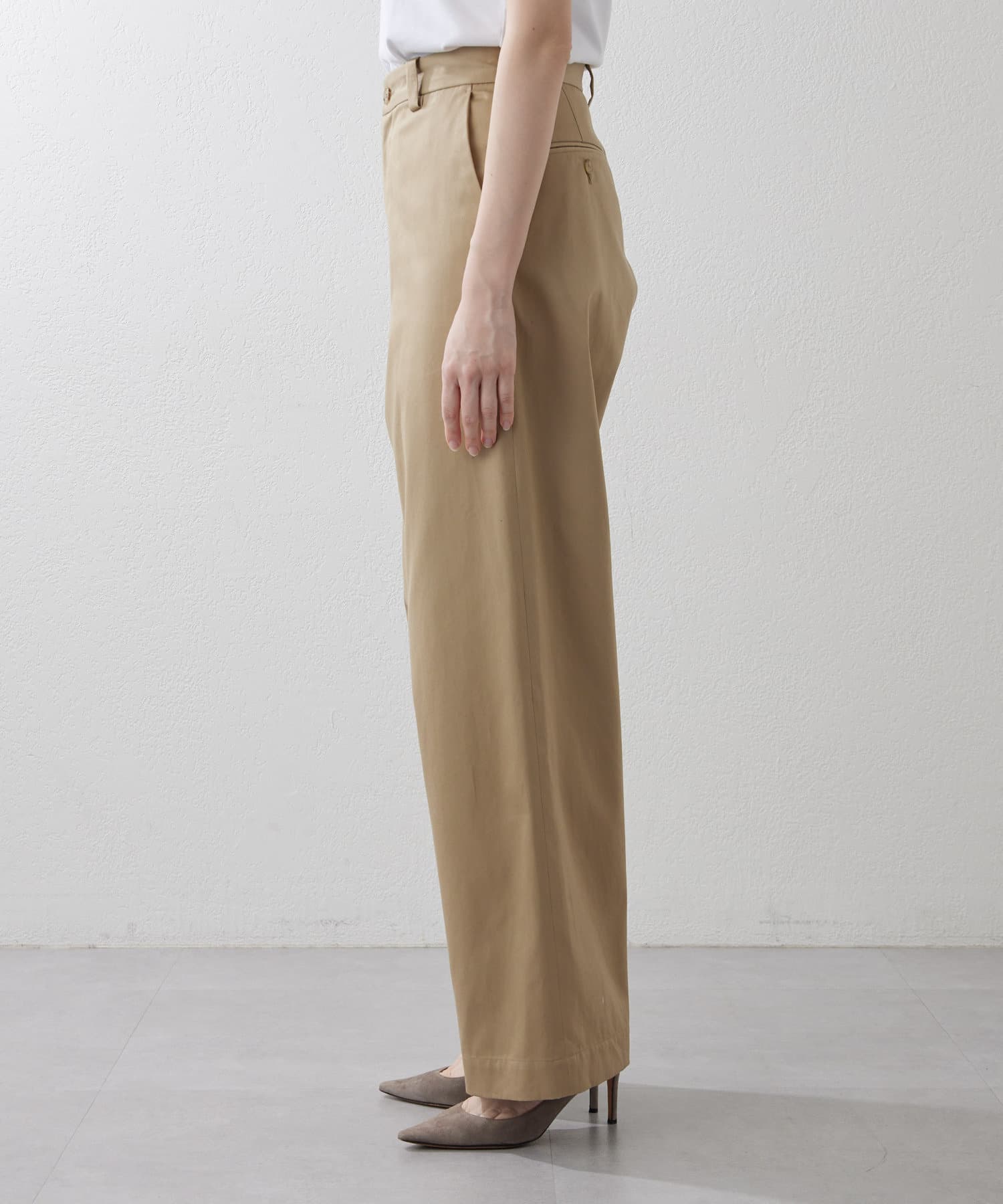 程よくハリのある素材やハイウエストデザインで大人が品よくおしゃれに履けるチノパンです。