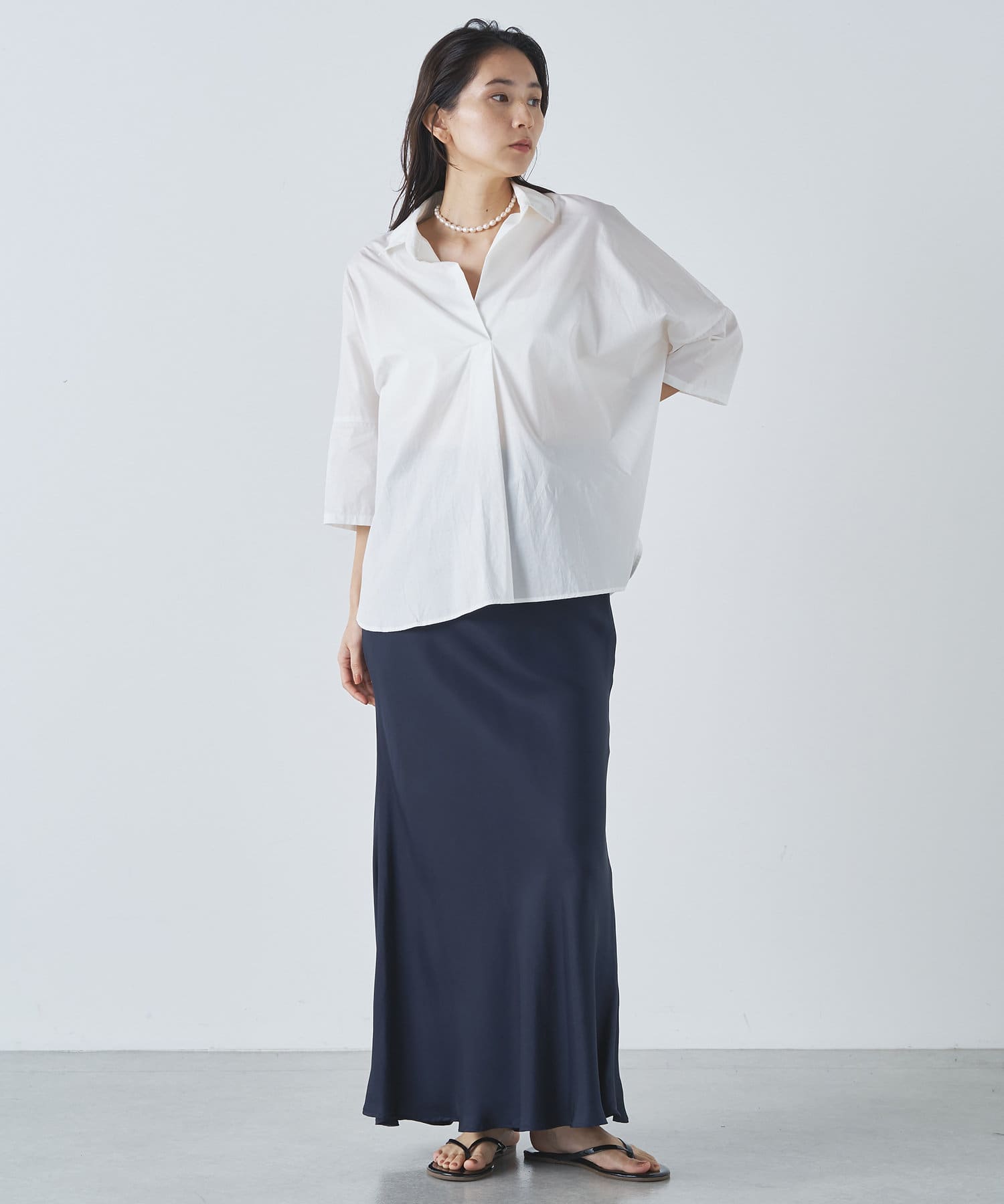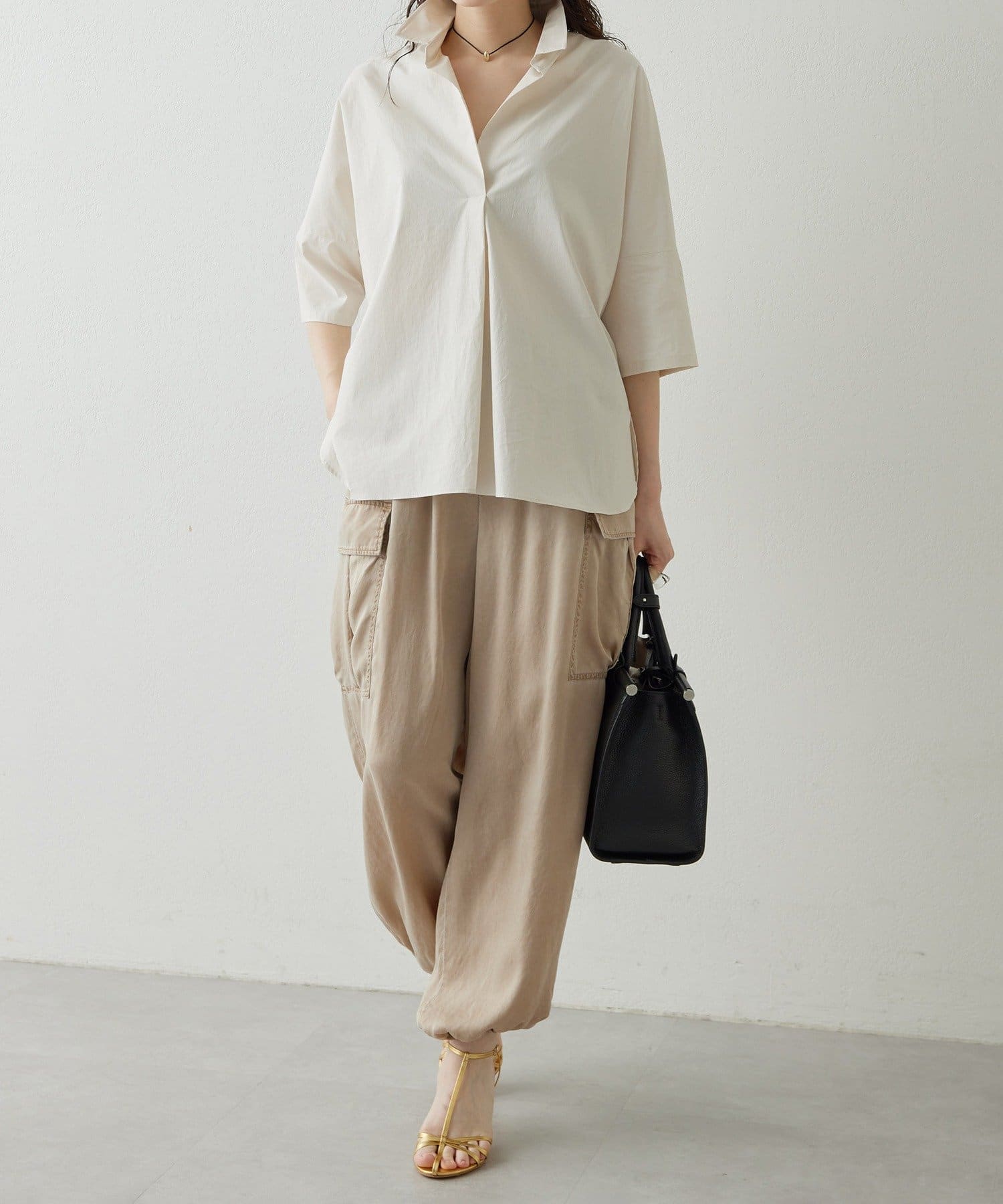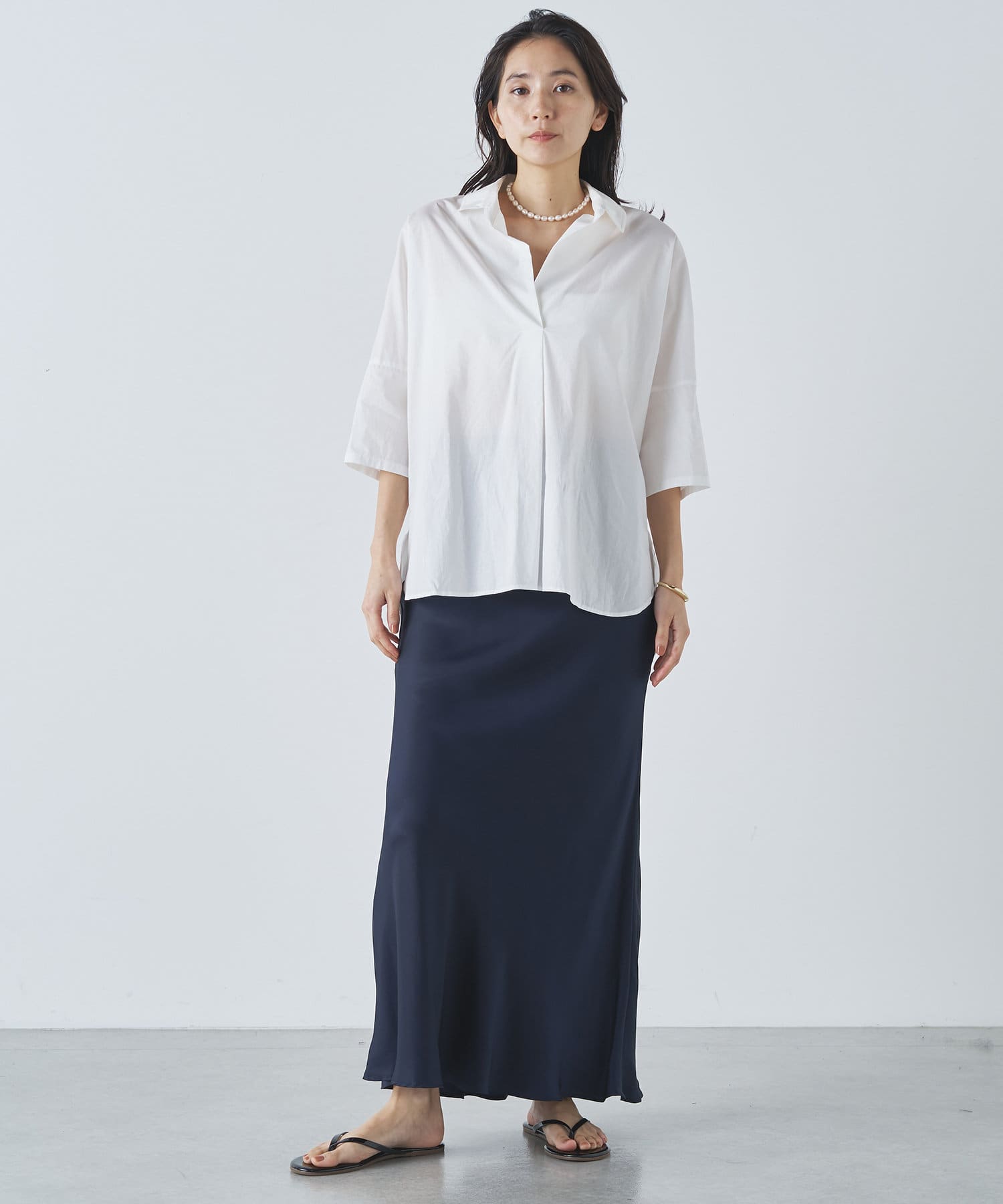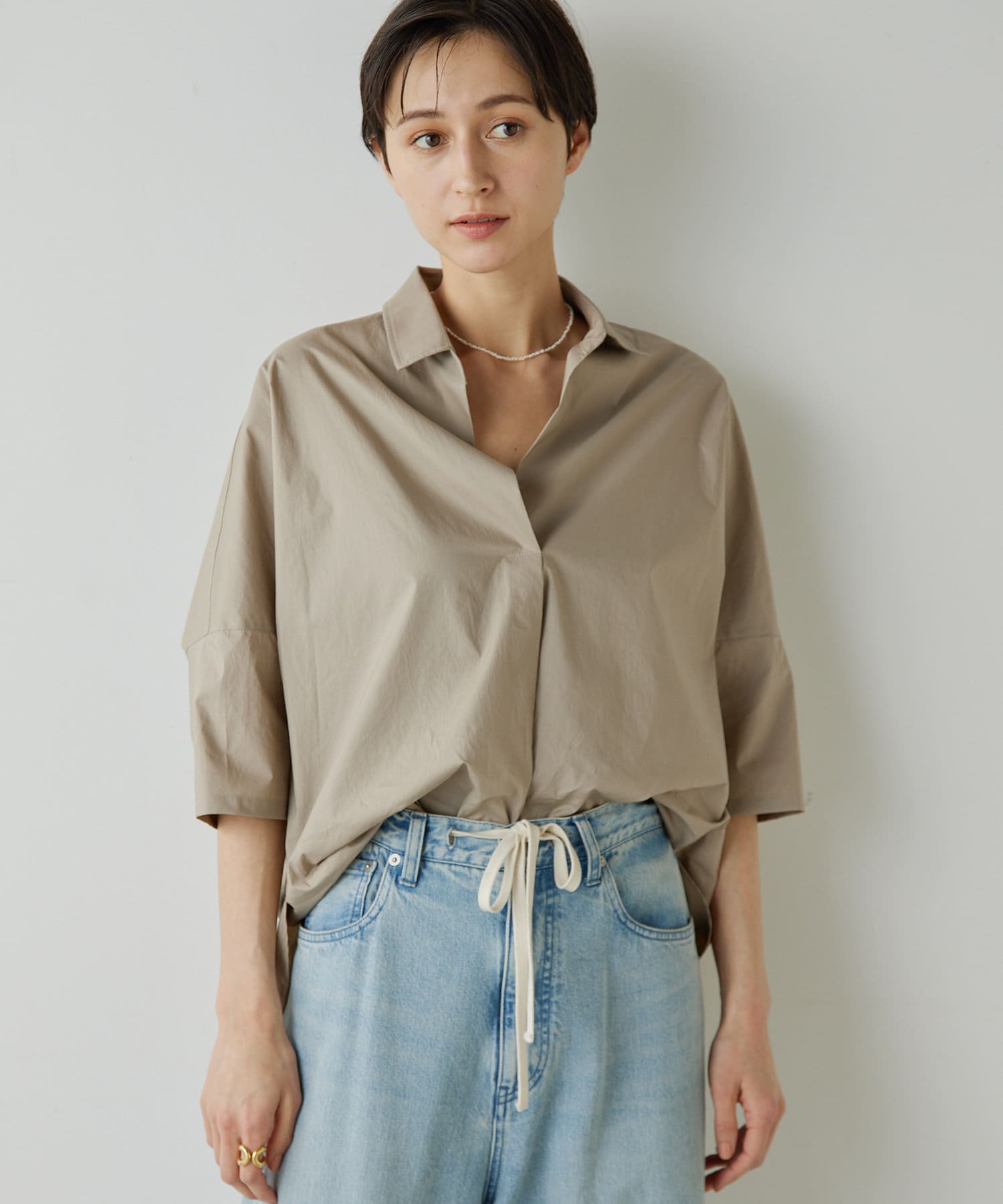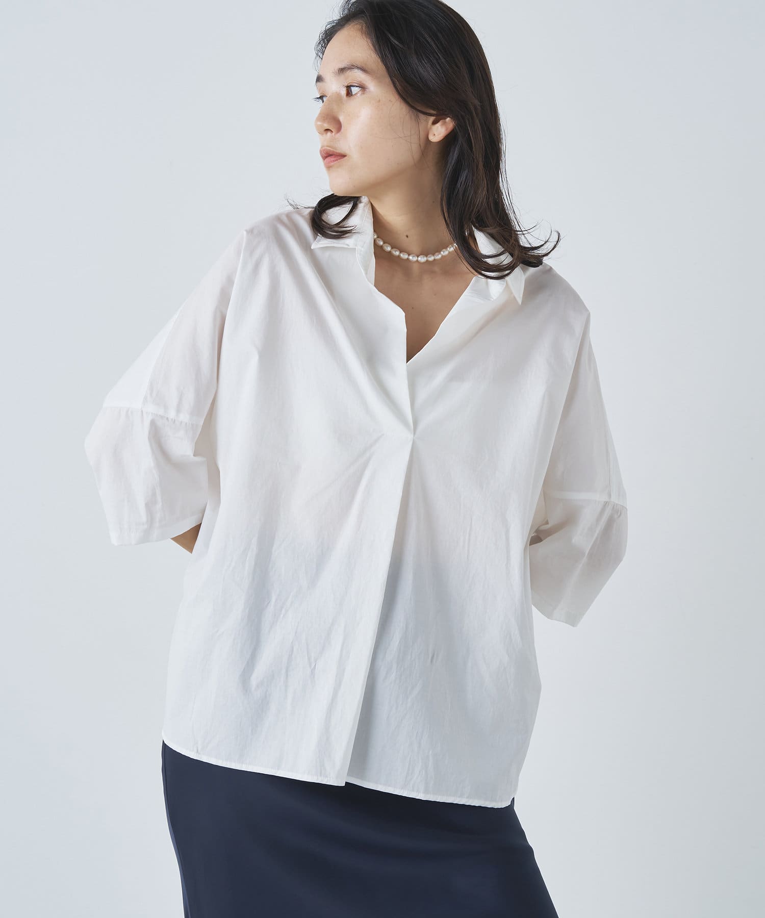 スキッパー仕様でデコルテを美しく魅せてくれます。自然と後ろに抜けるようなデザインで着るだけでこなれ見えします。