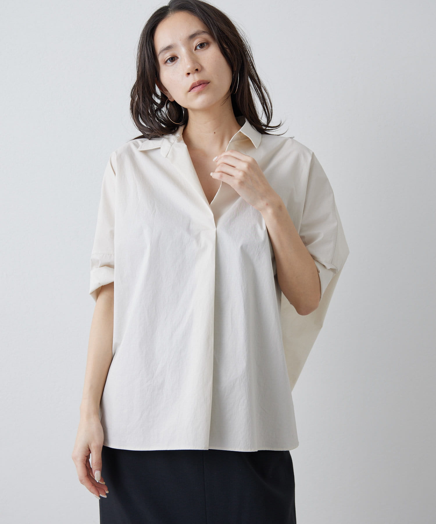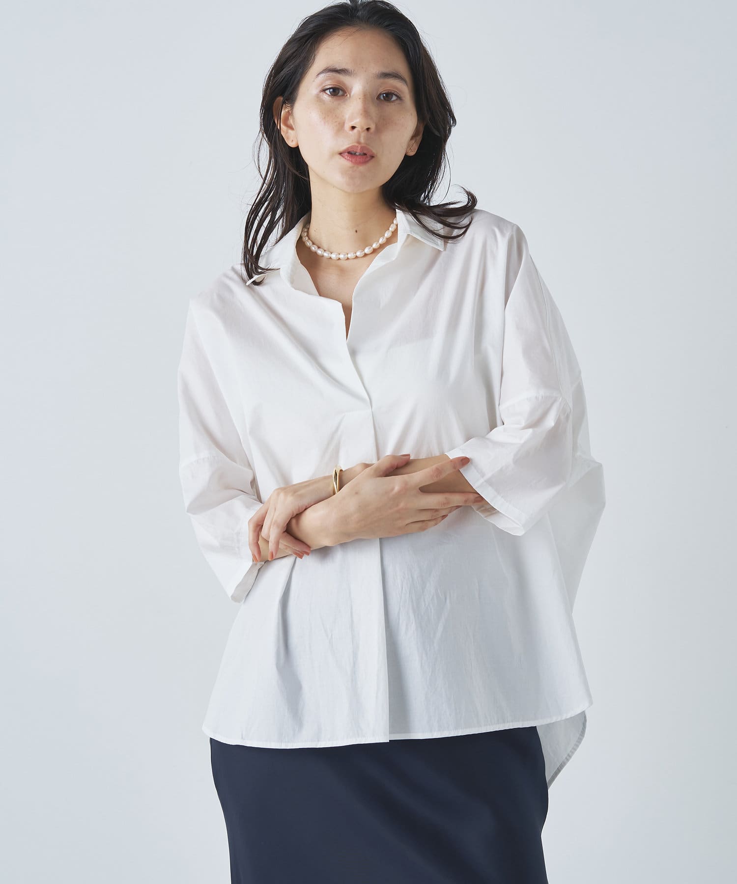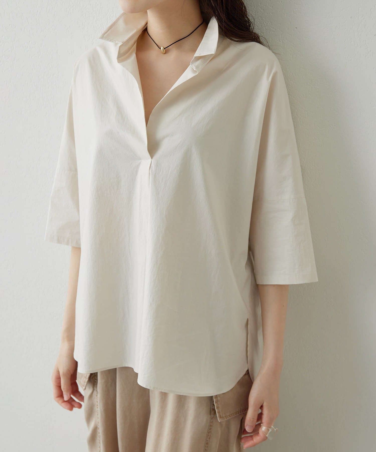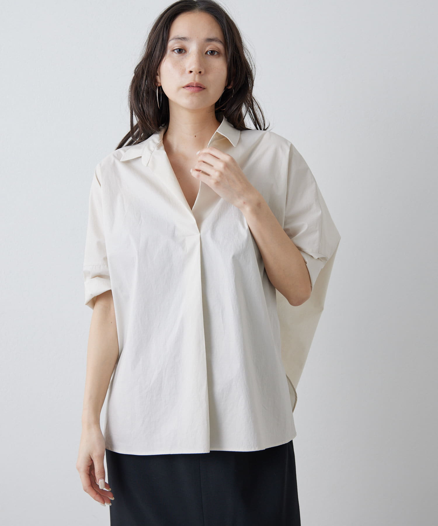 スキッパー仕様でデコルテを美しく魅せてくれます。自然と後ろに抜けるようなデザインで着るだけでこなれ見えします。
