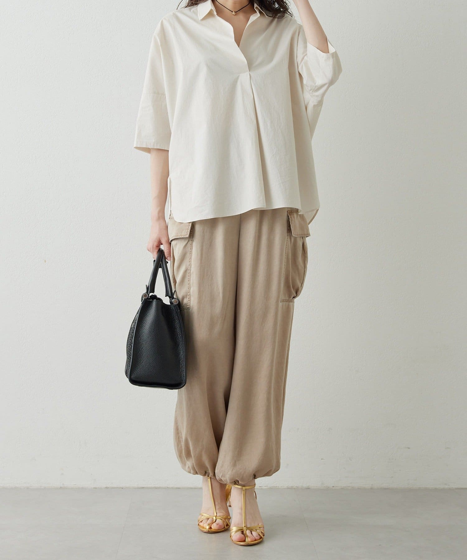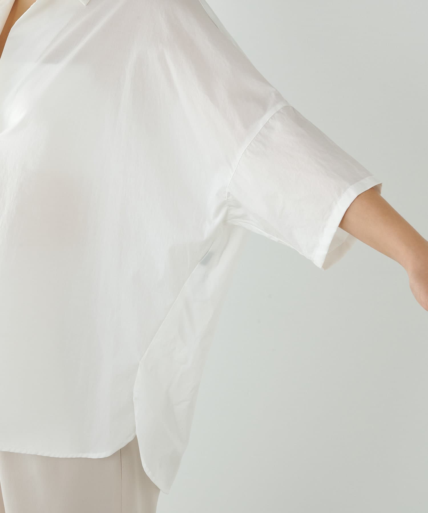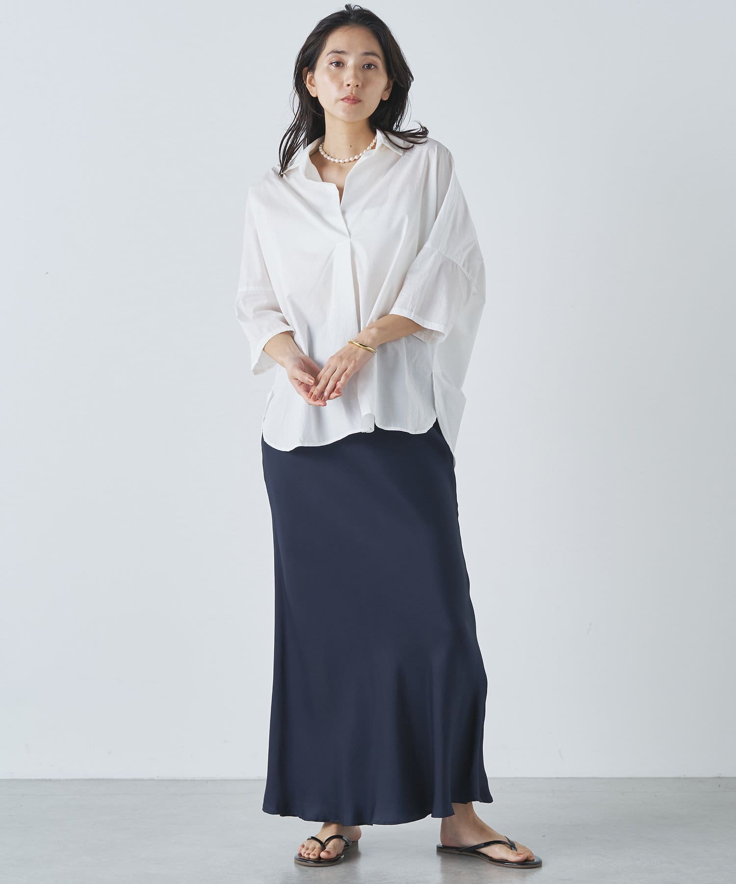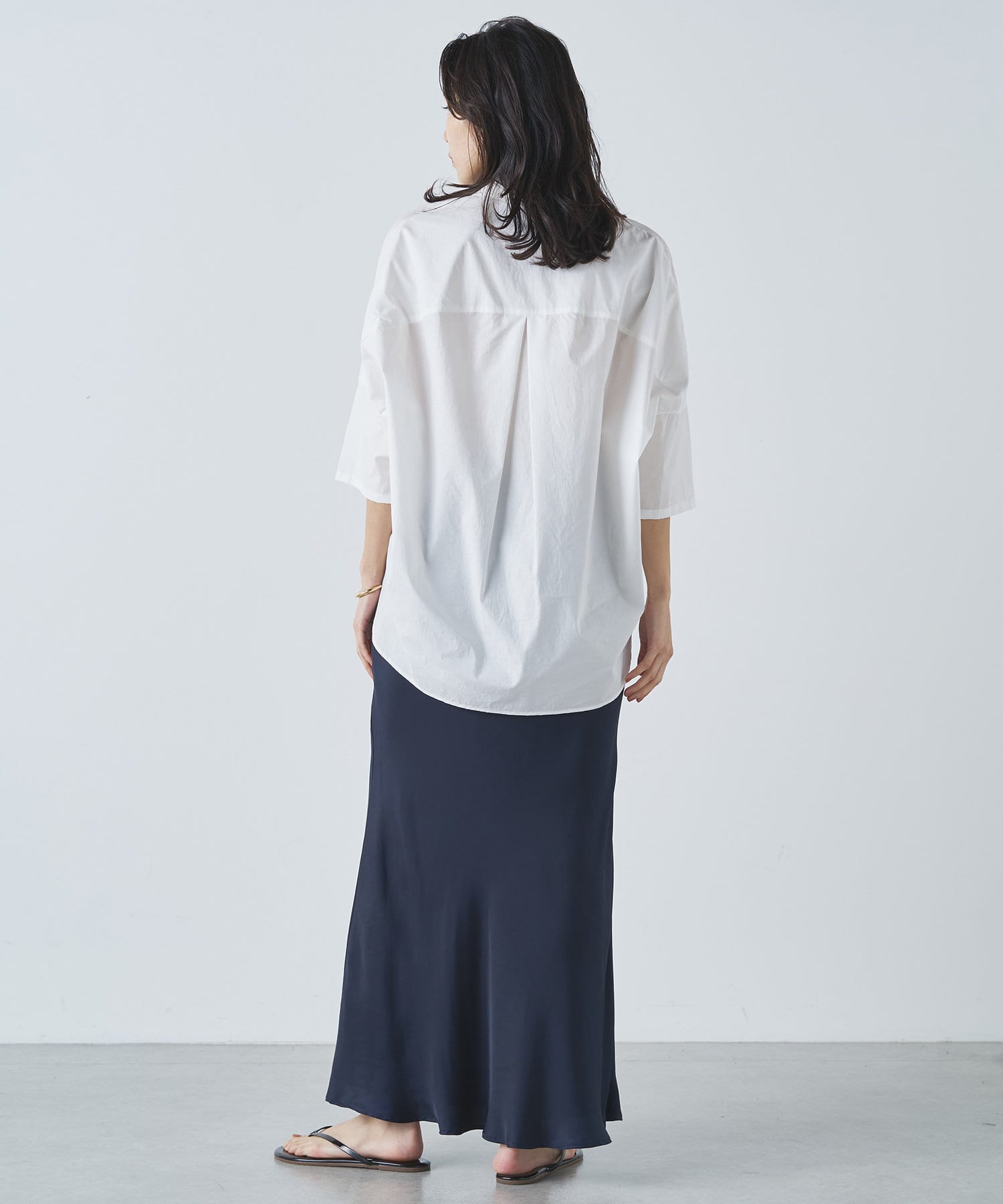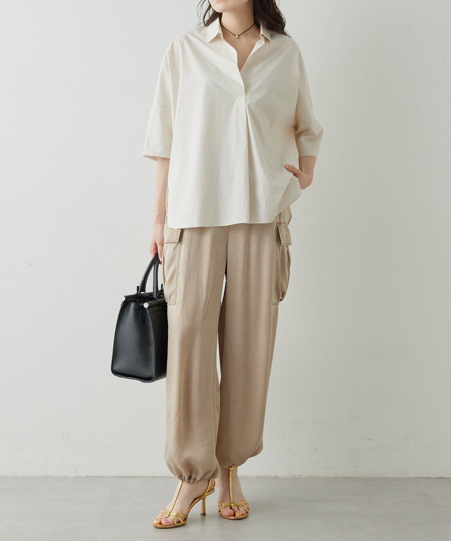 スキッパー仕様でデコルテを美しく魅せてくれます。自然と後ろに抜けるようなデザインで着るだけでこなれ見えします。