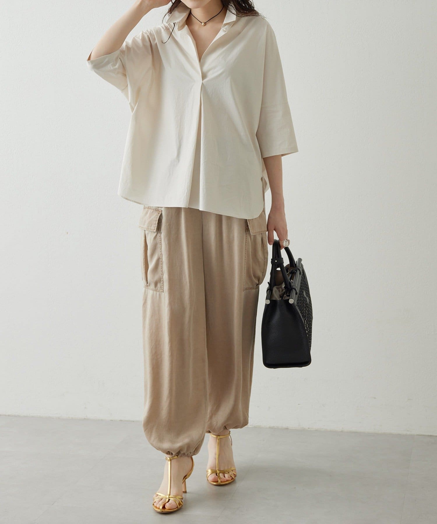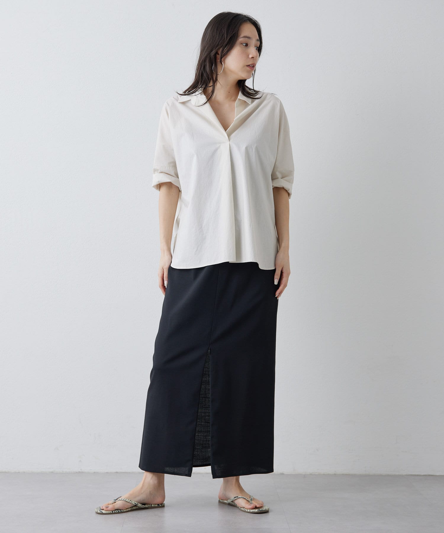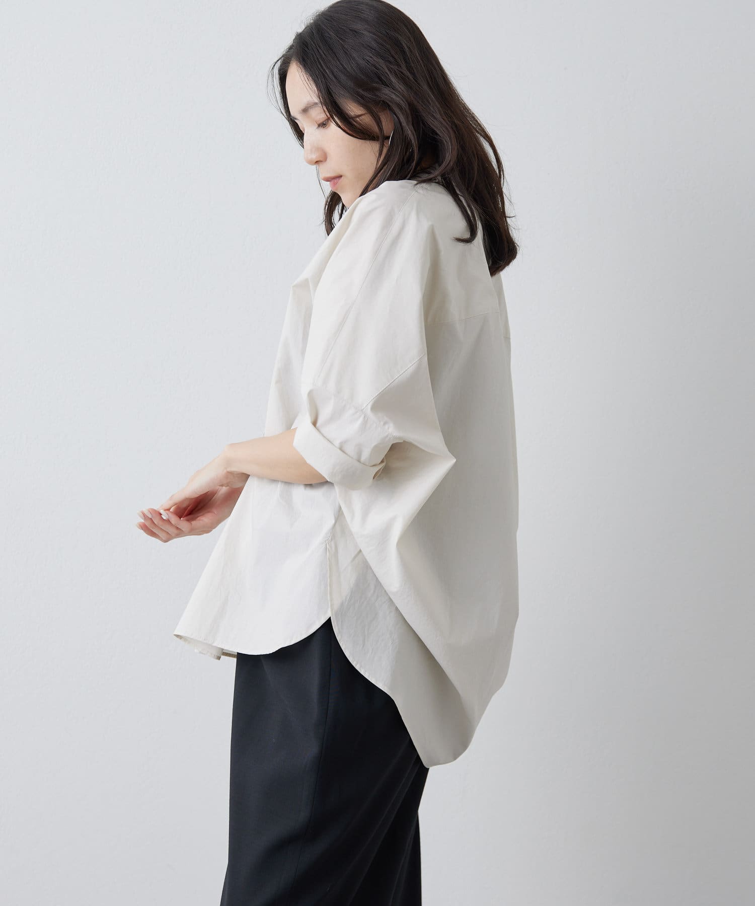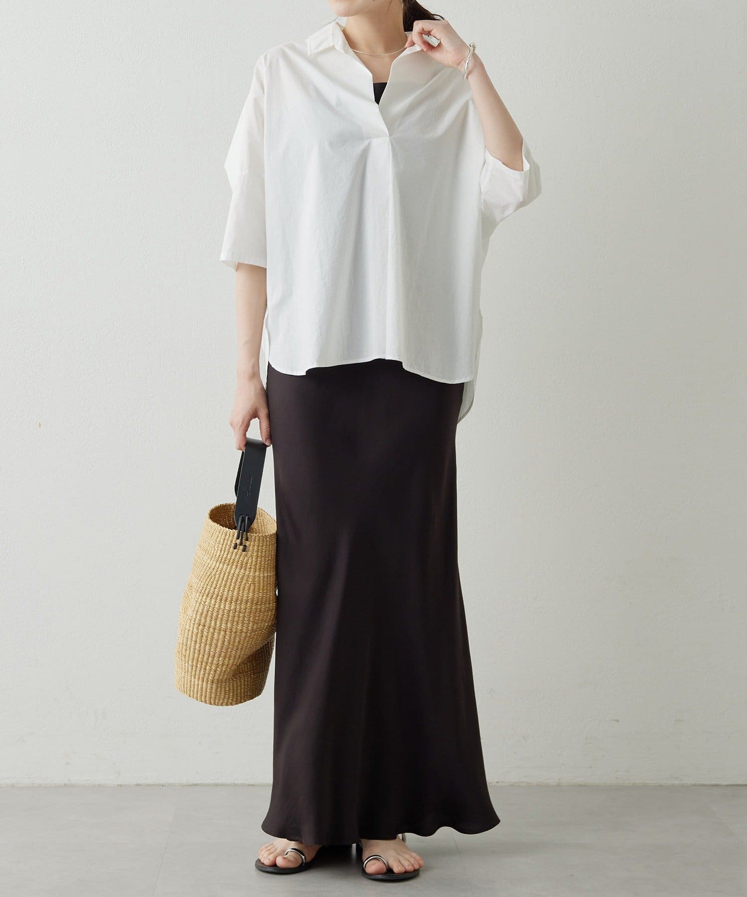 スキッパー仕様でデコルテを美しく魅せてくれます。自然と後ろに抜けるようなデザインで着るだけでこなれ見えします。