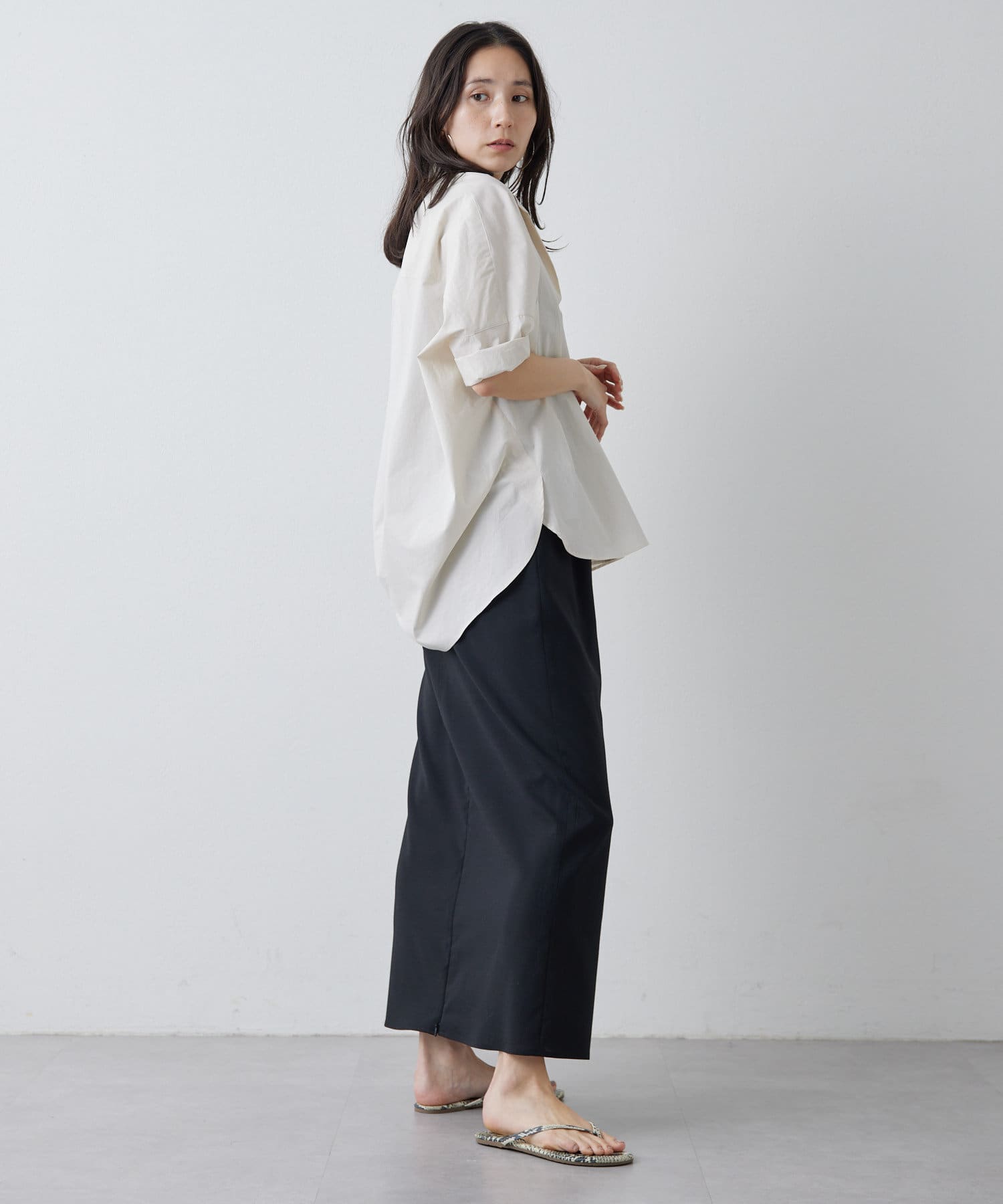 ボトムスにインしても後ろのもたつきがなく、アウトしてもサイドから見た形がすごく綺麗なシルエットで抜け感が勝手に出て、前後の丈の差や細かいタックや後身ごろのふんわりしてくれる形がとっても素敵でした。