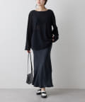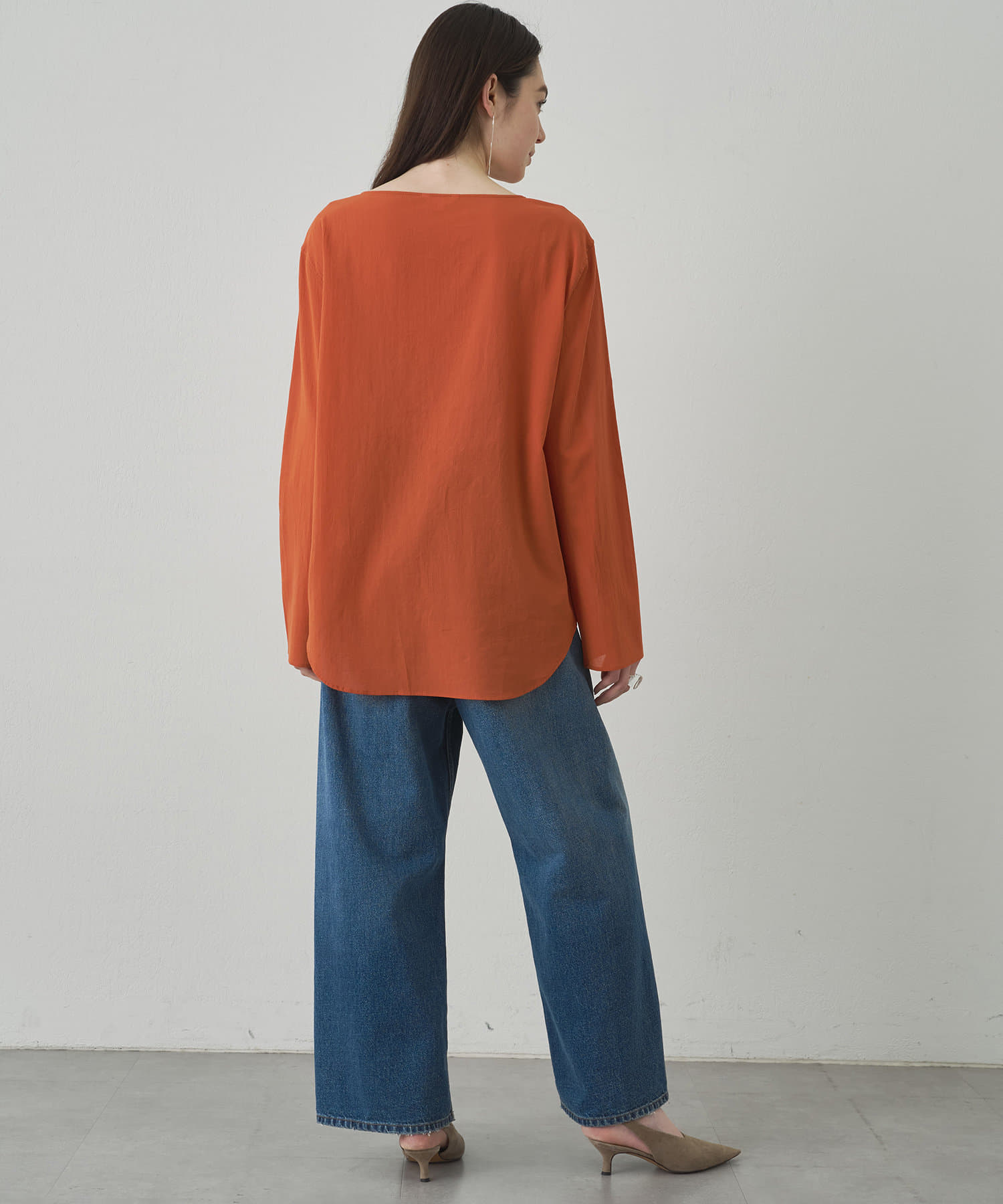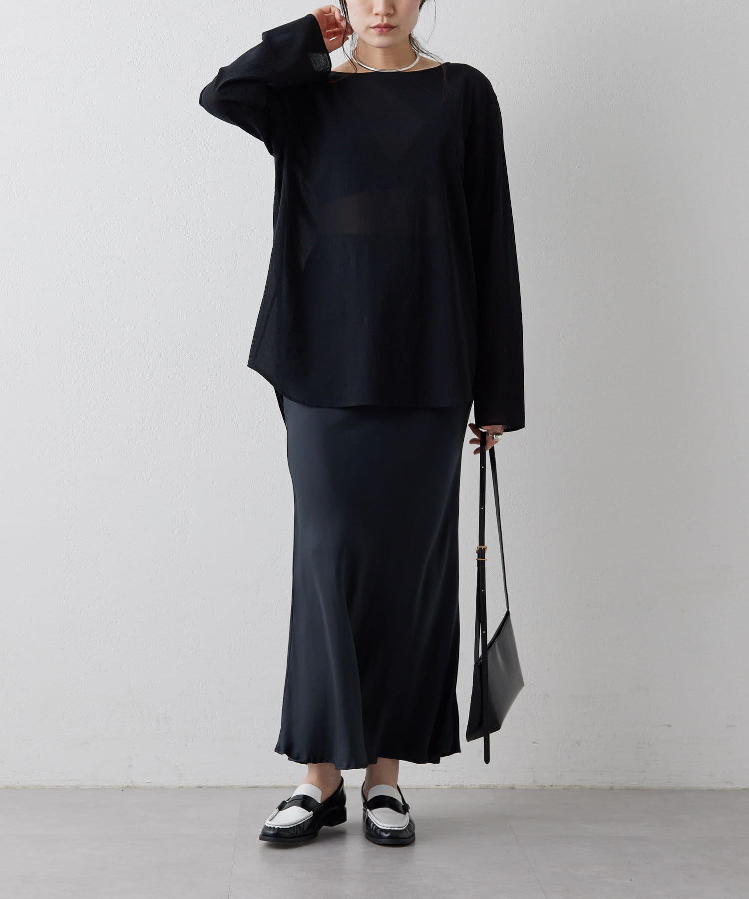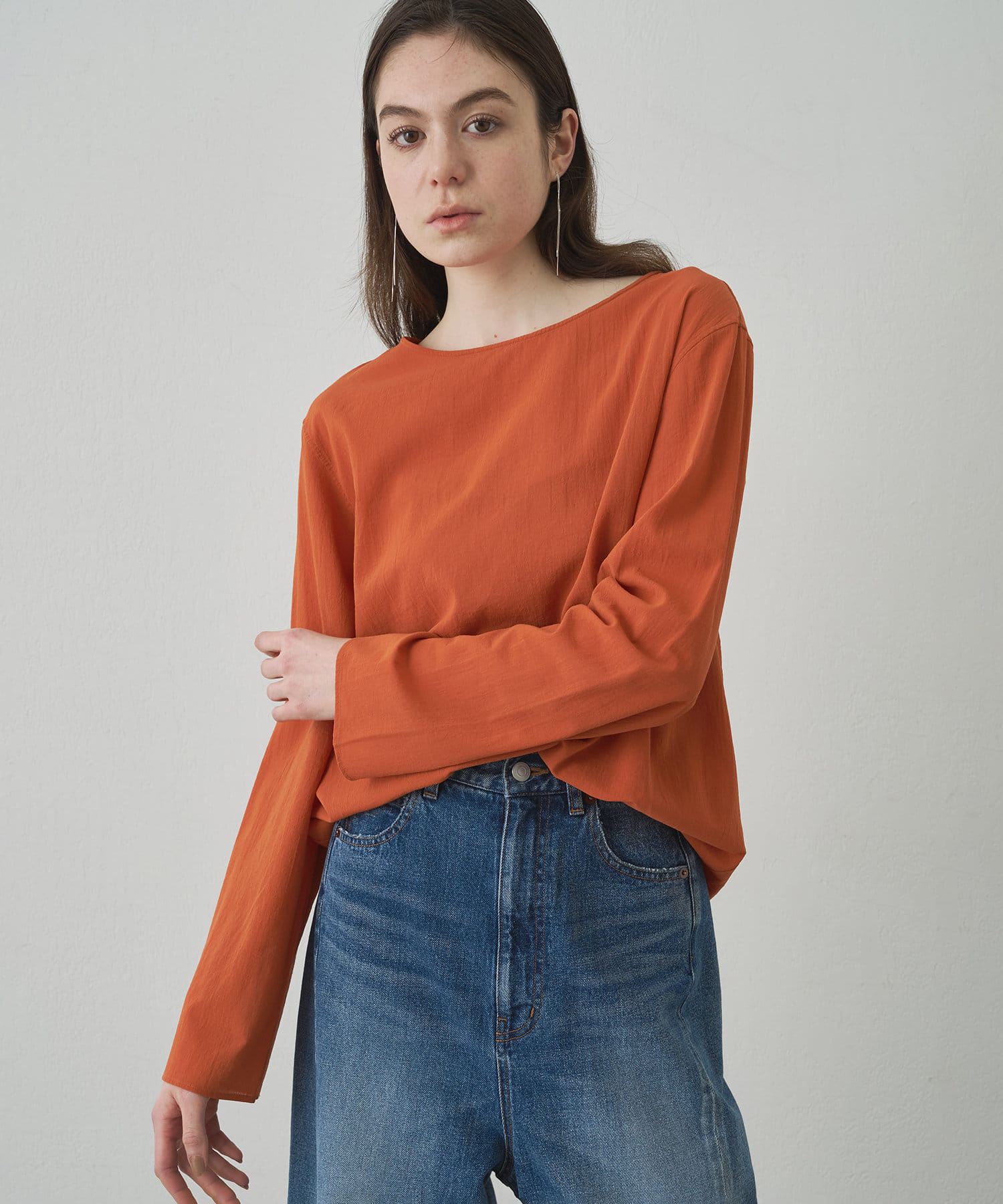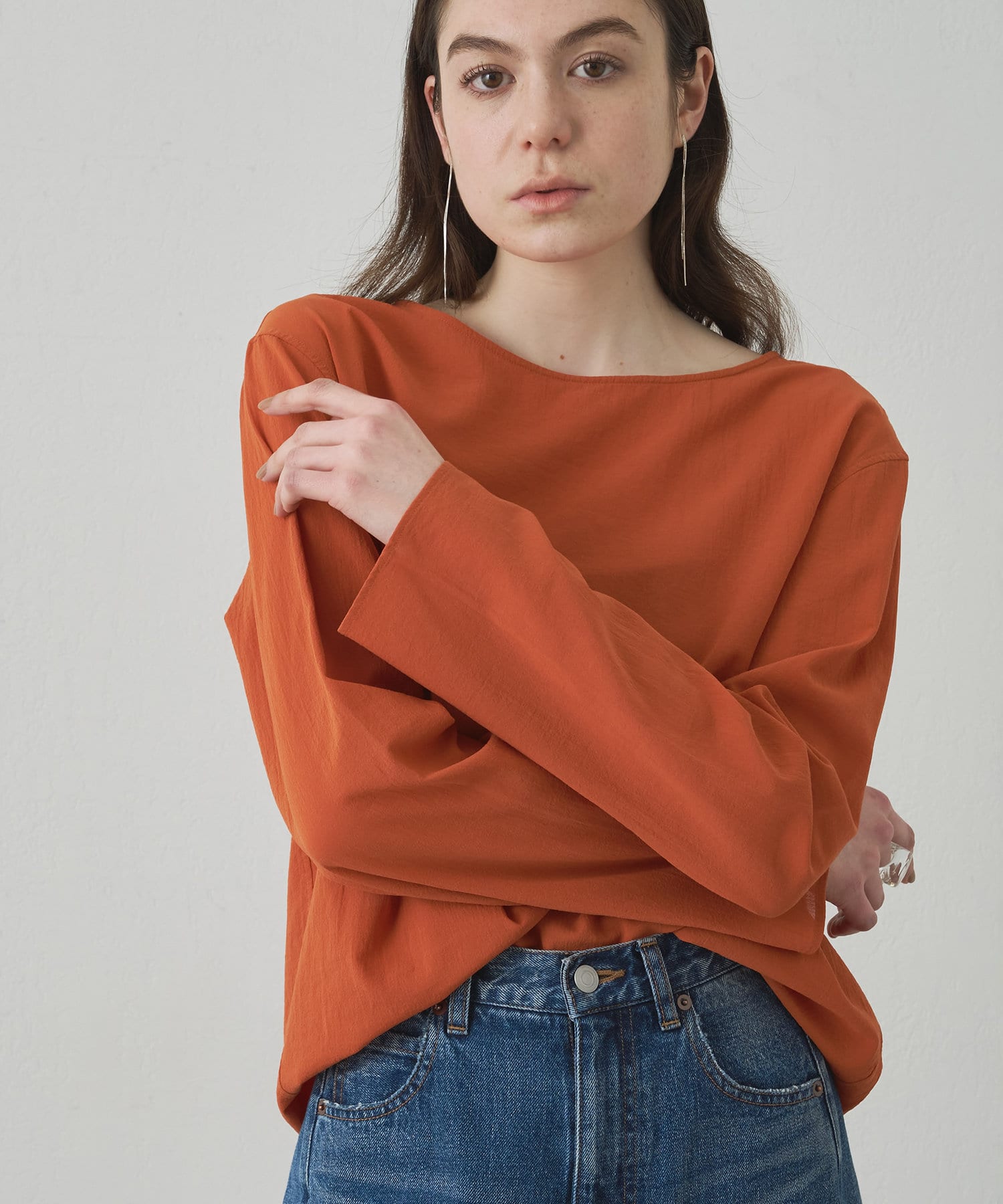 ■首元はデコルテのきれいに見える緩やかなボートネックで女性らしさをプラス。