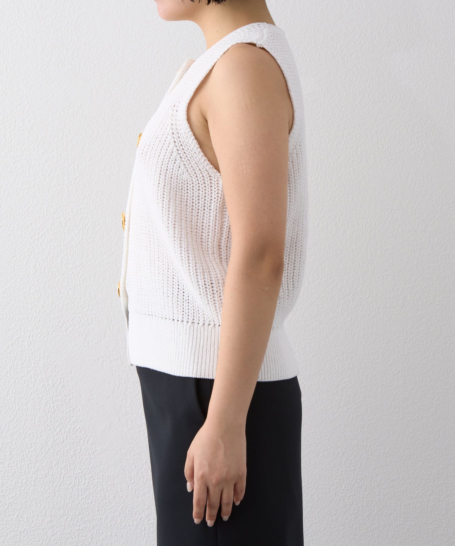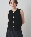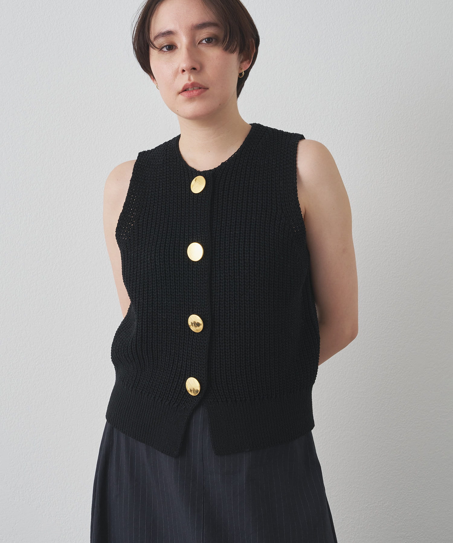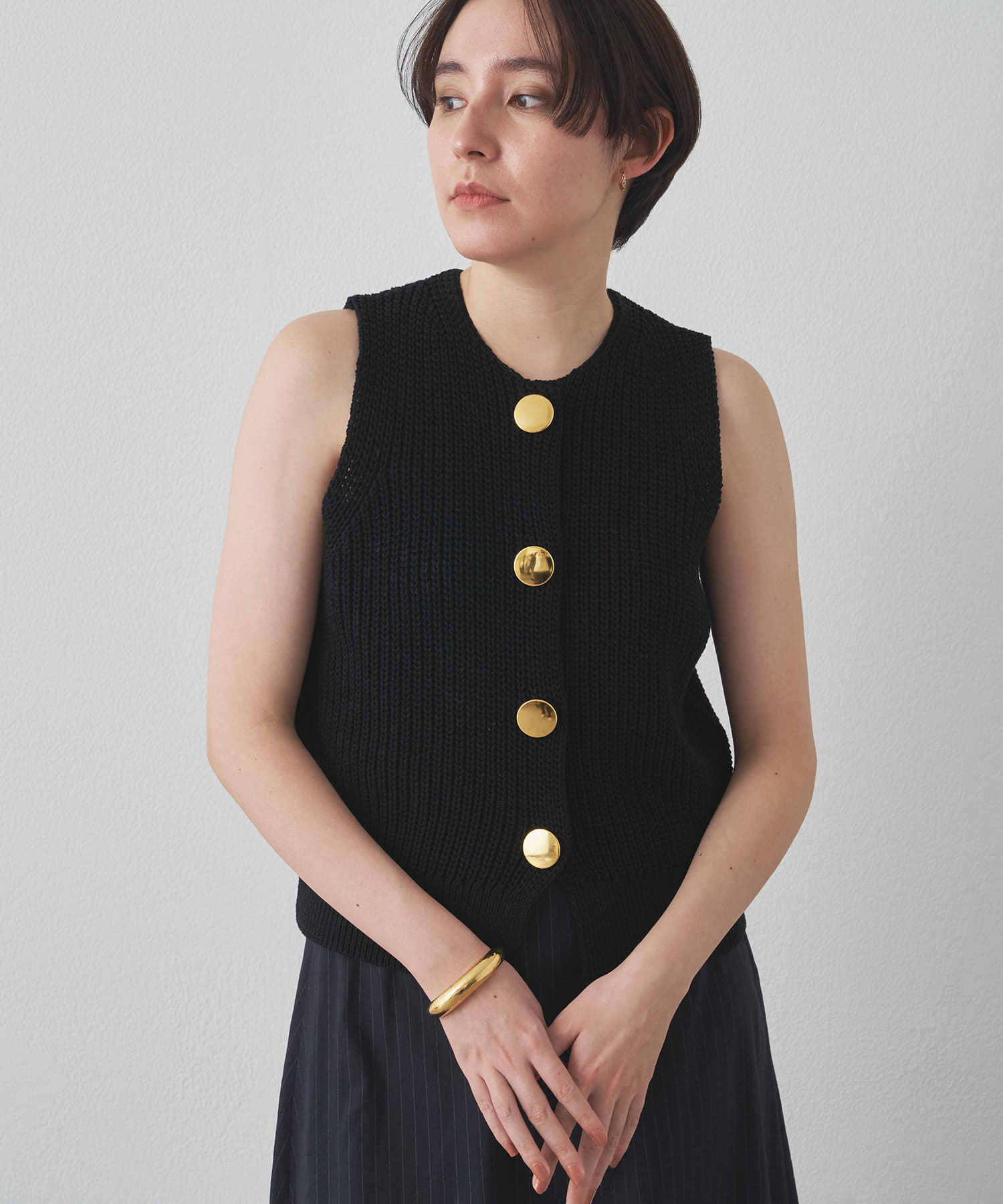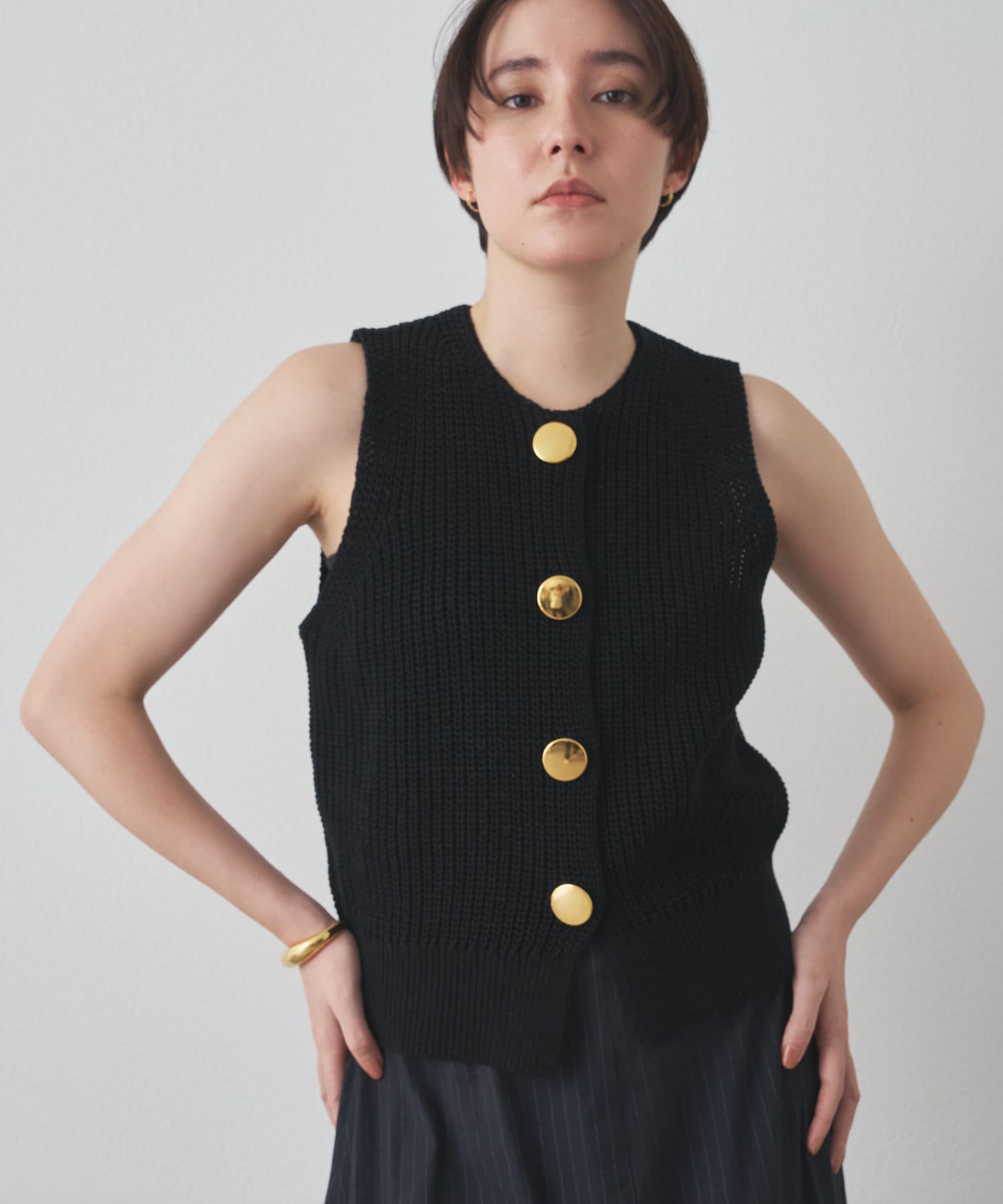 ■大きめの金ボタンがアクセサリー感覚で映えるニットベスト。