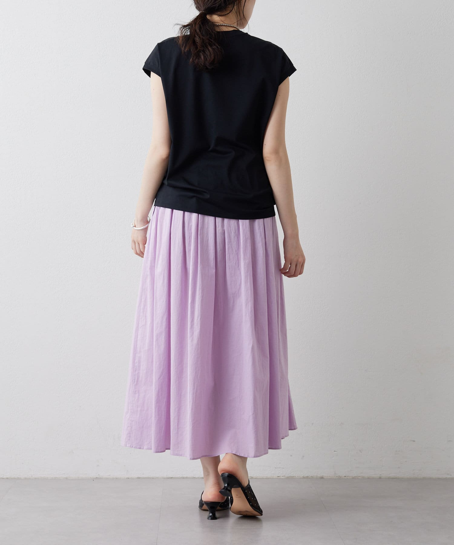■程よくゆとりのあるシルエットに、二の腕をカバーするフレンチスリーブがポイント。