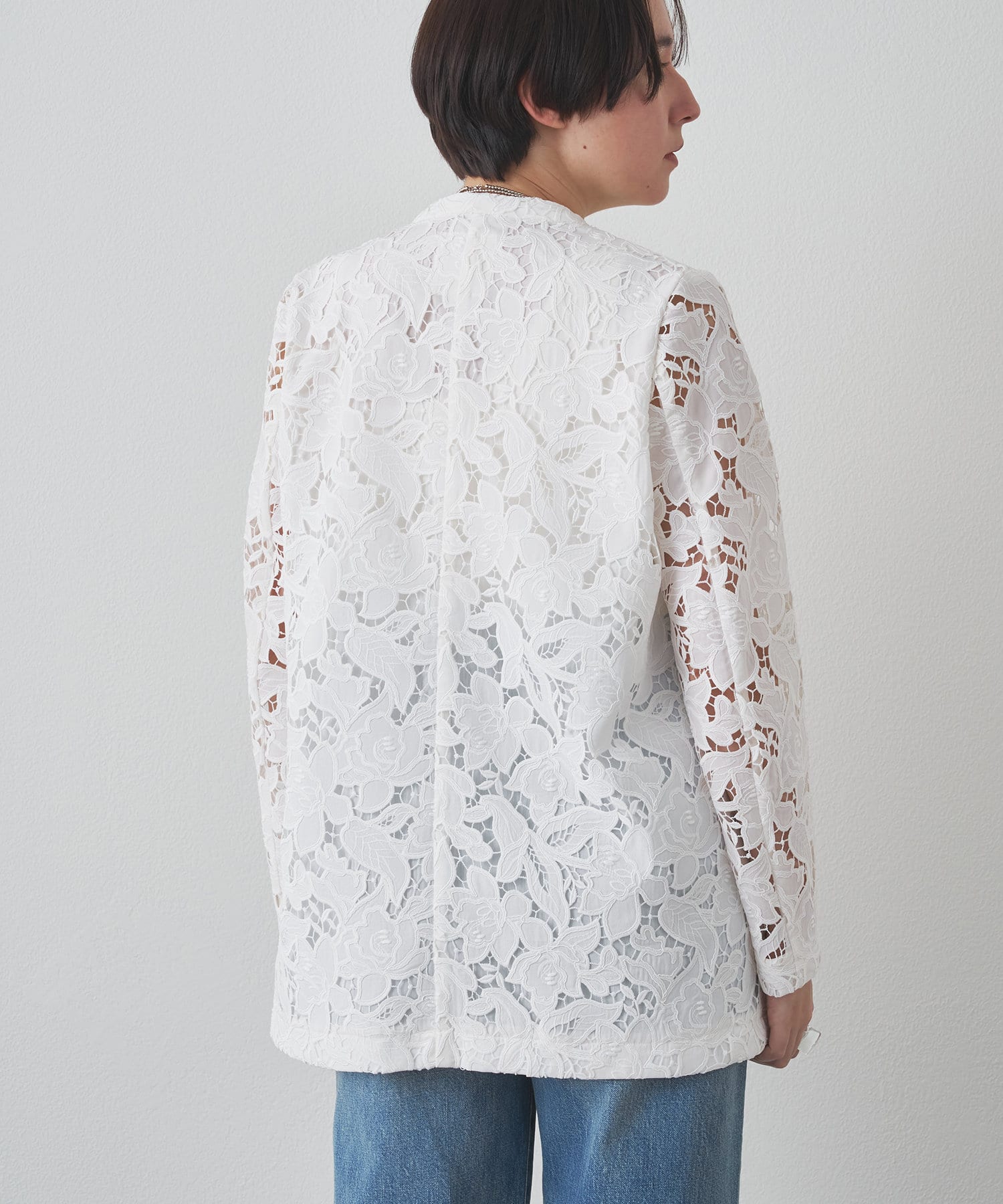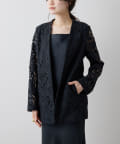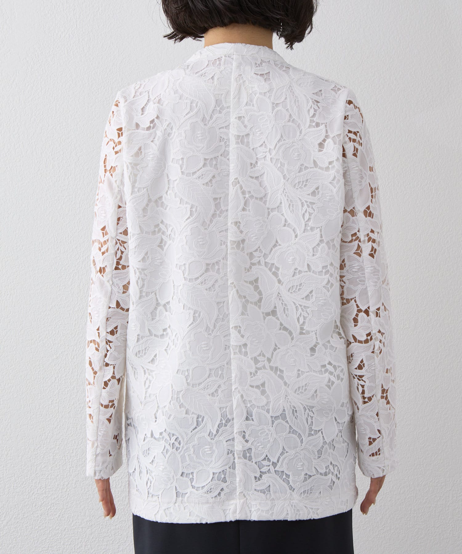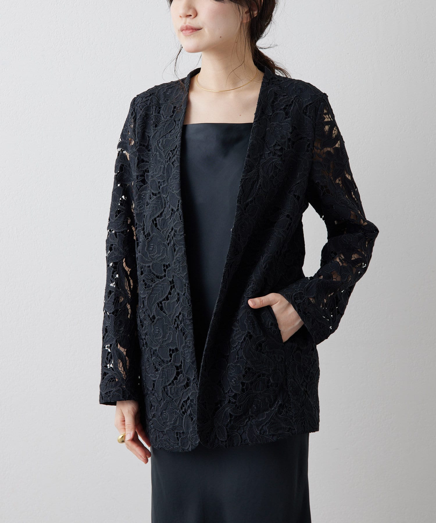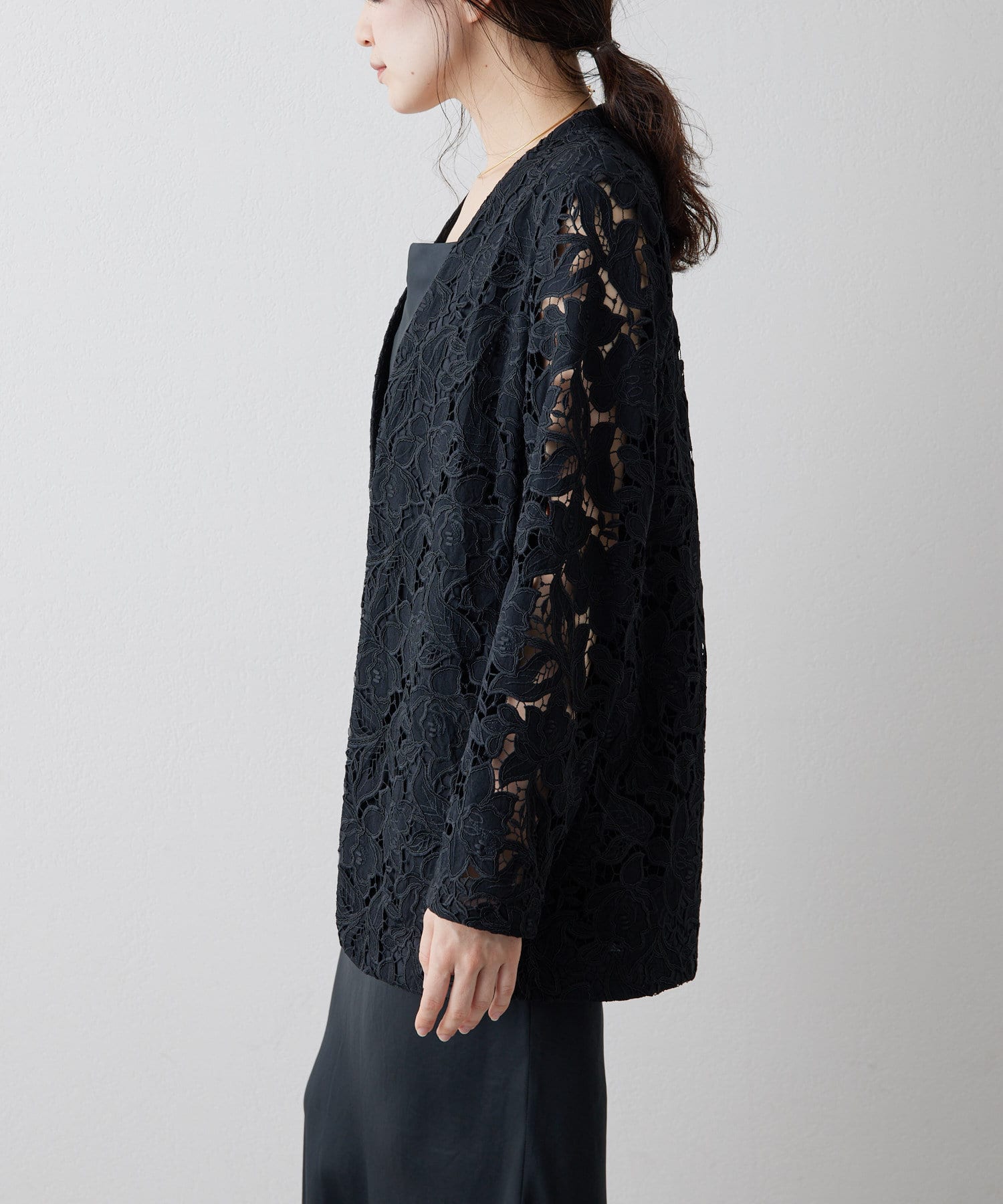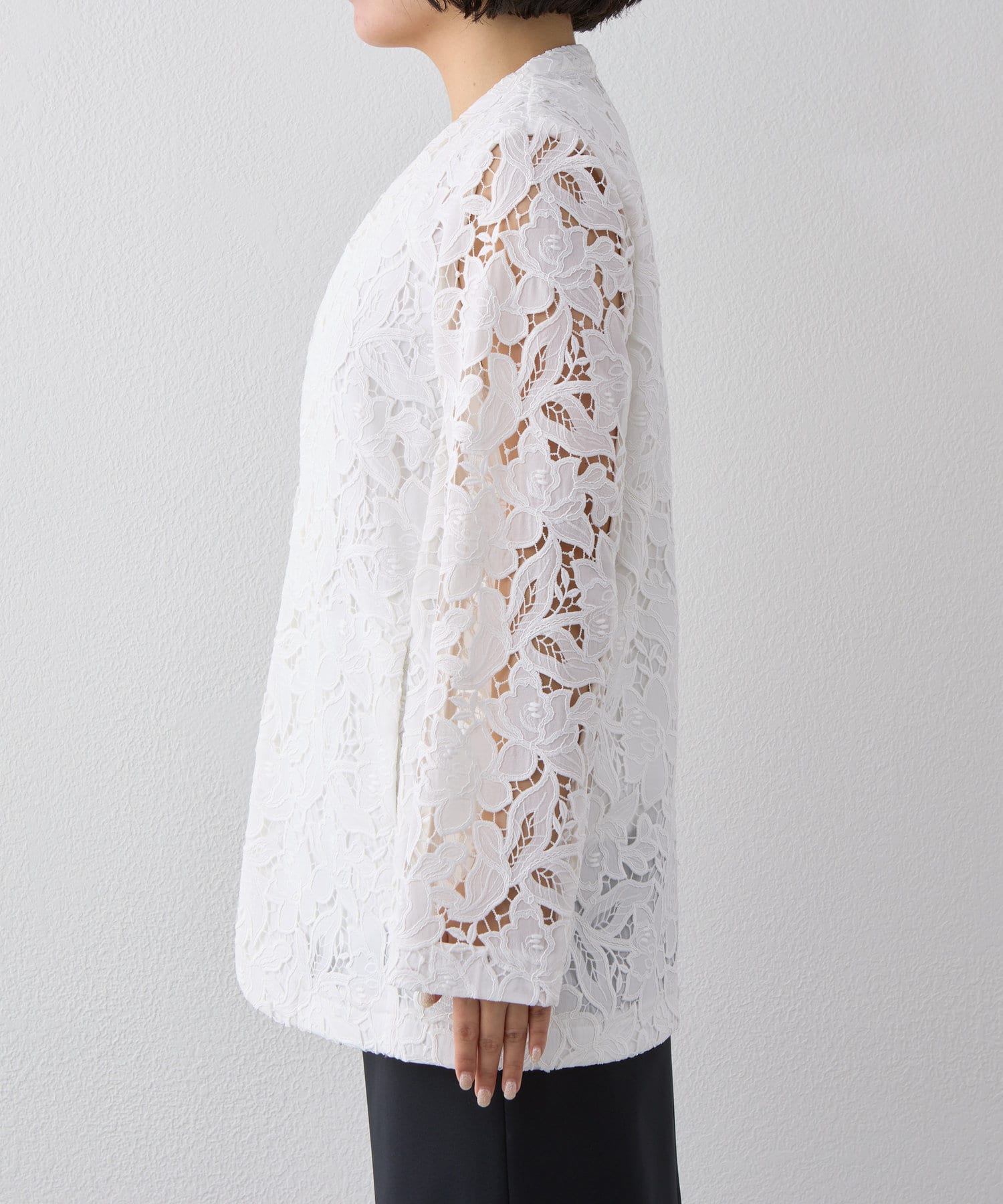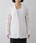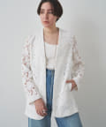 ■大柄のレース生地が目を惹くノーカラージャケット。