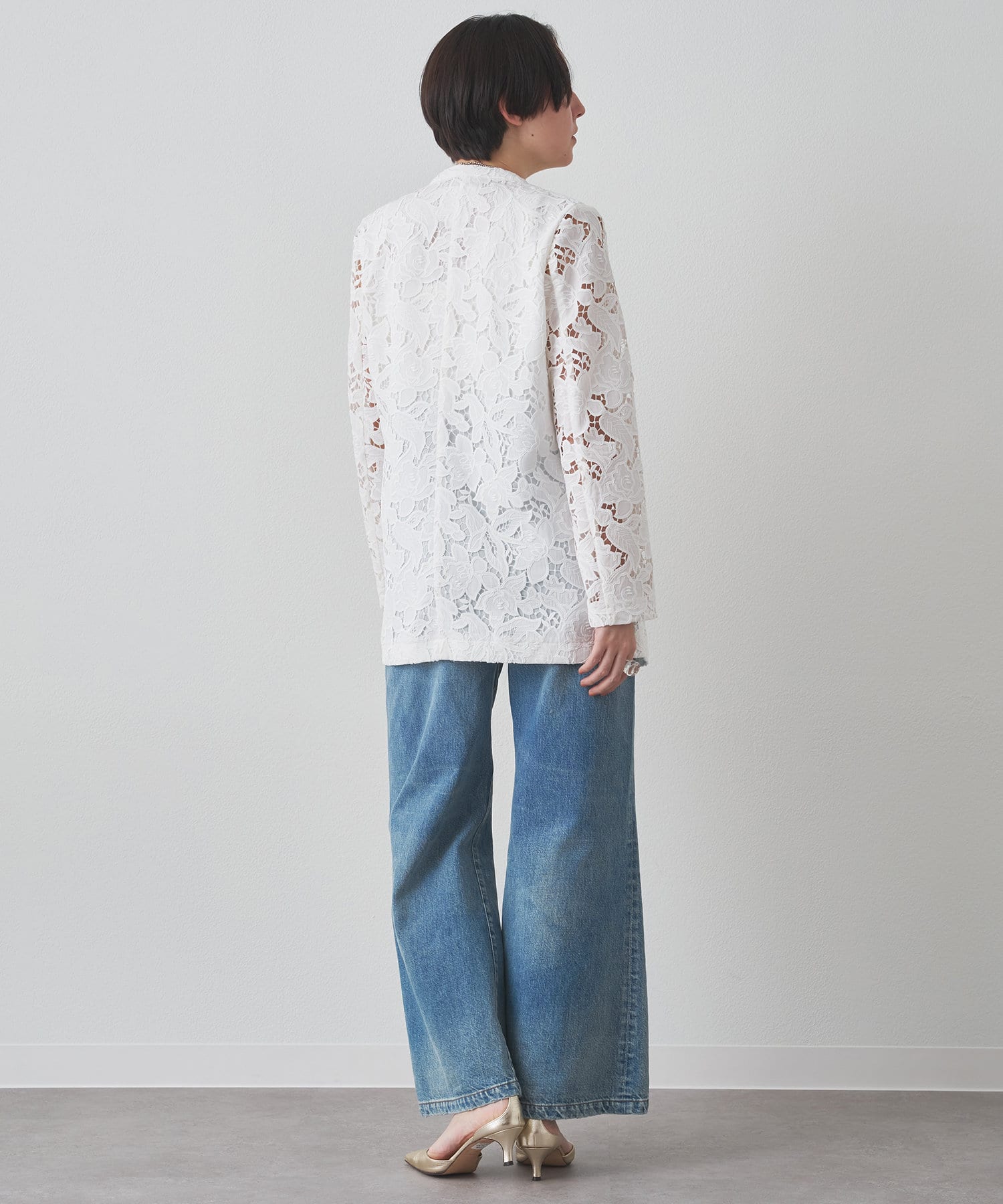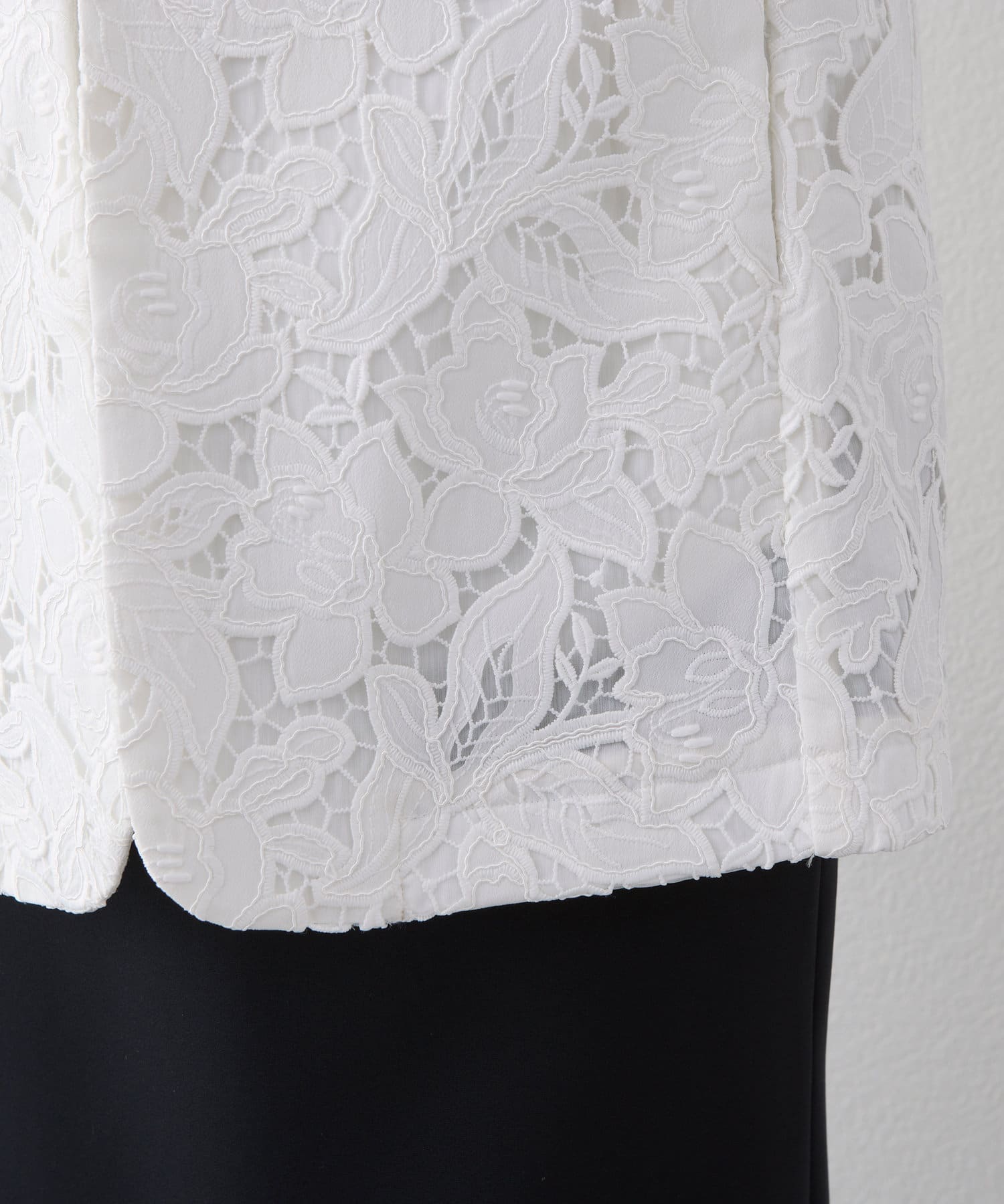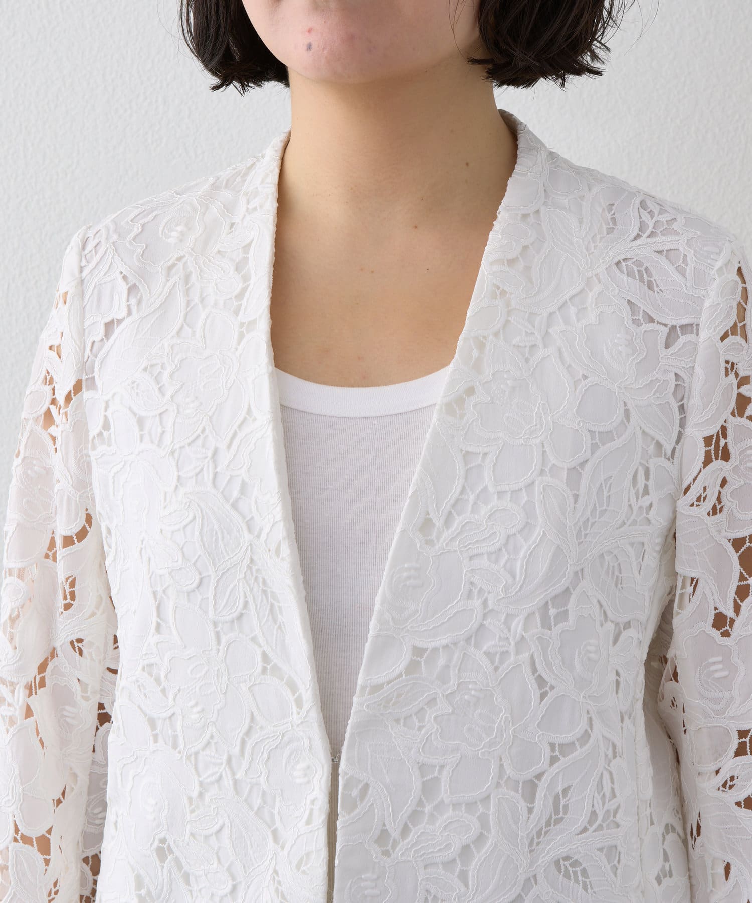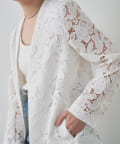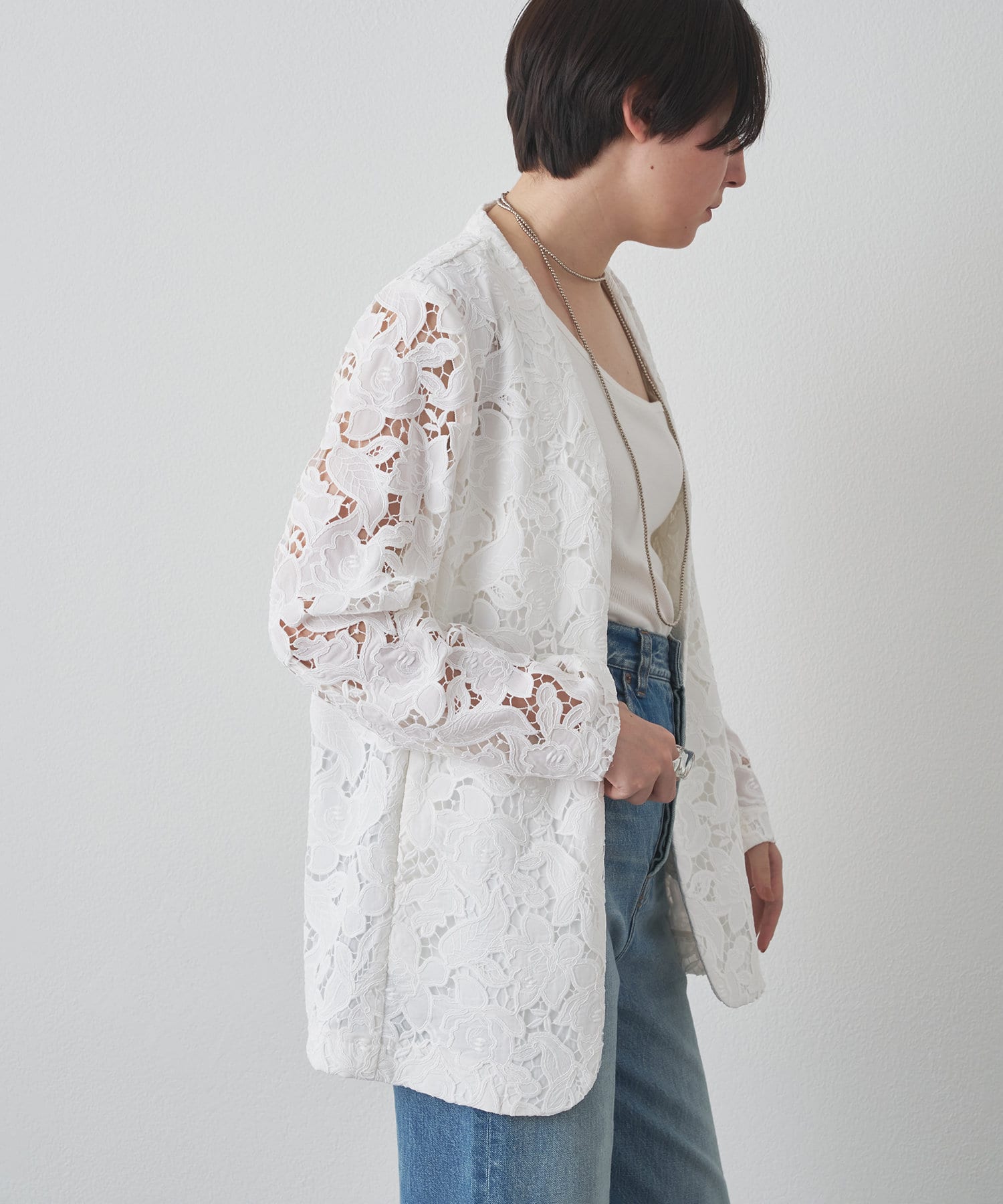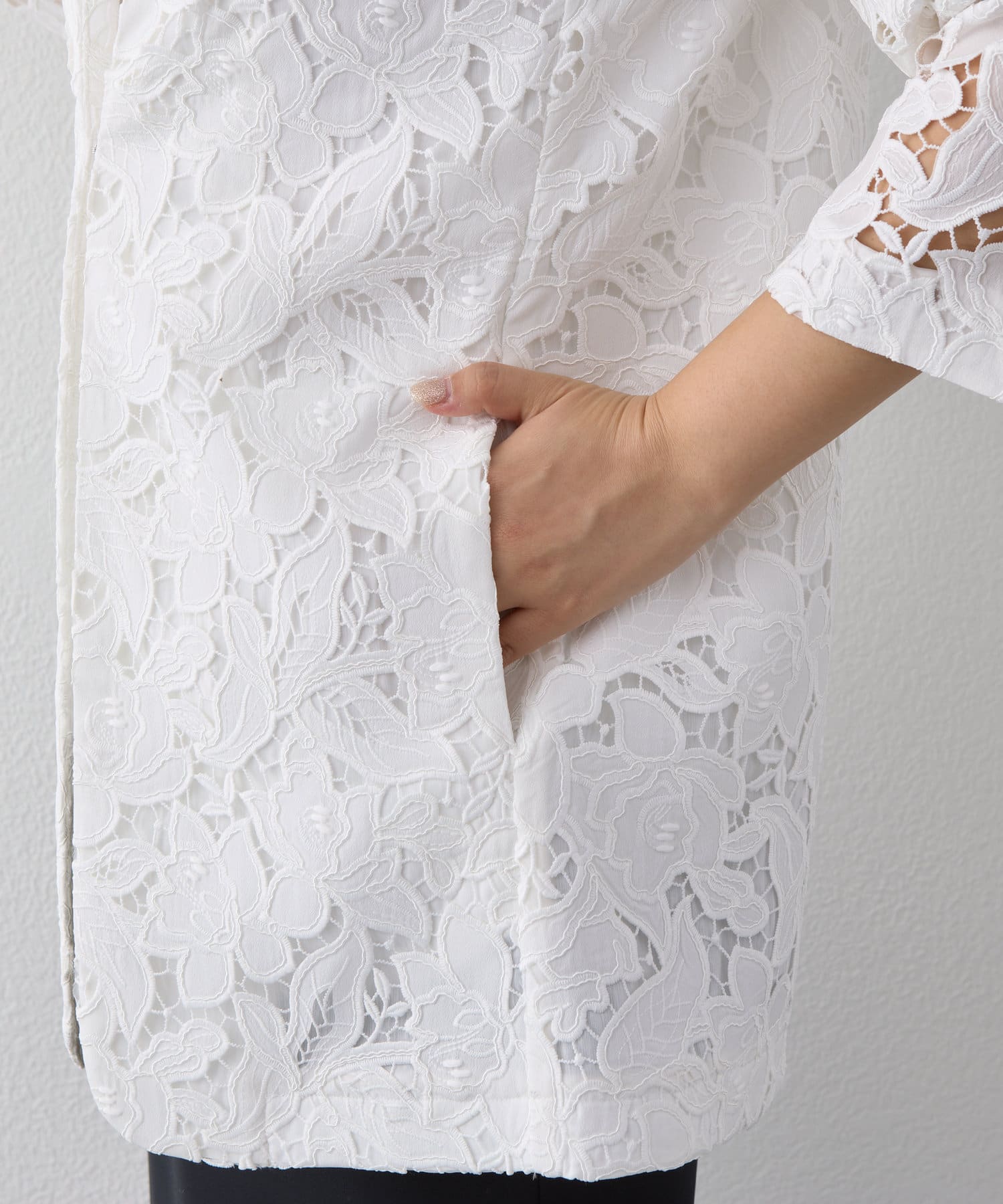 ■大柄のレース生地が目を惹くノーカラージャケット。